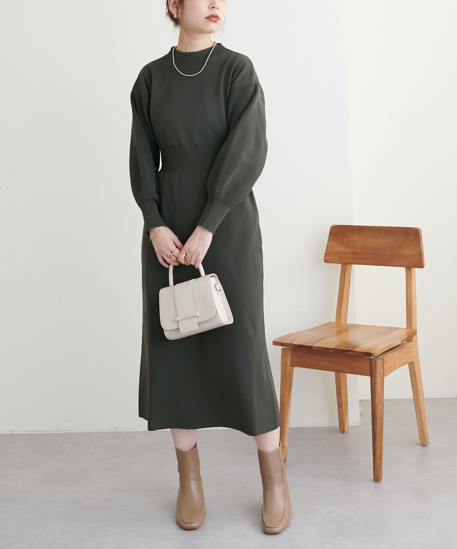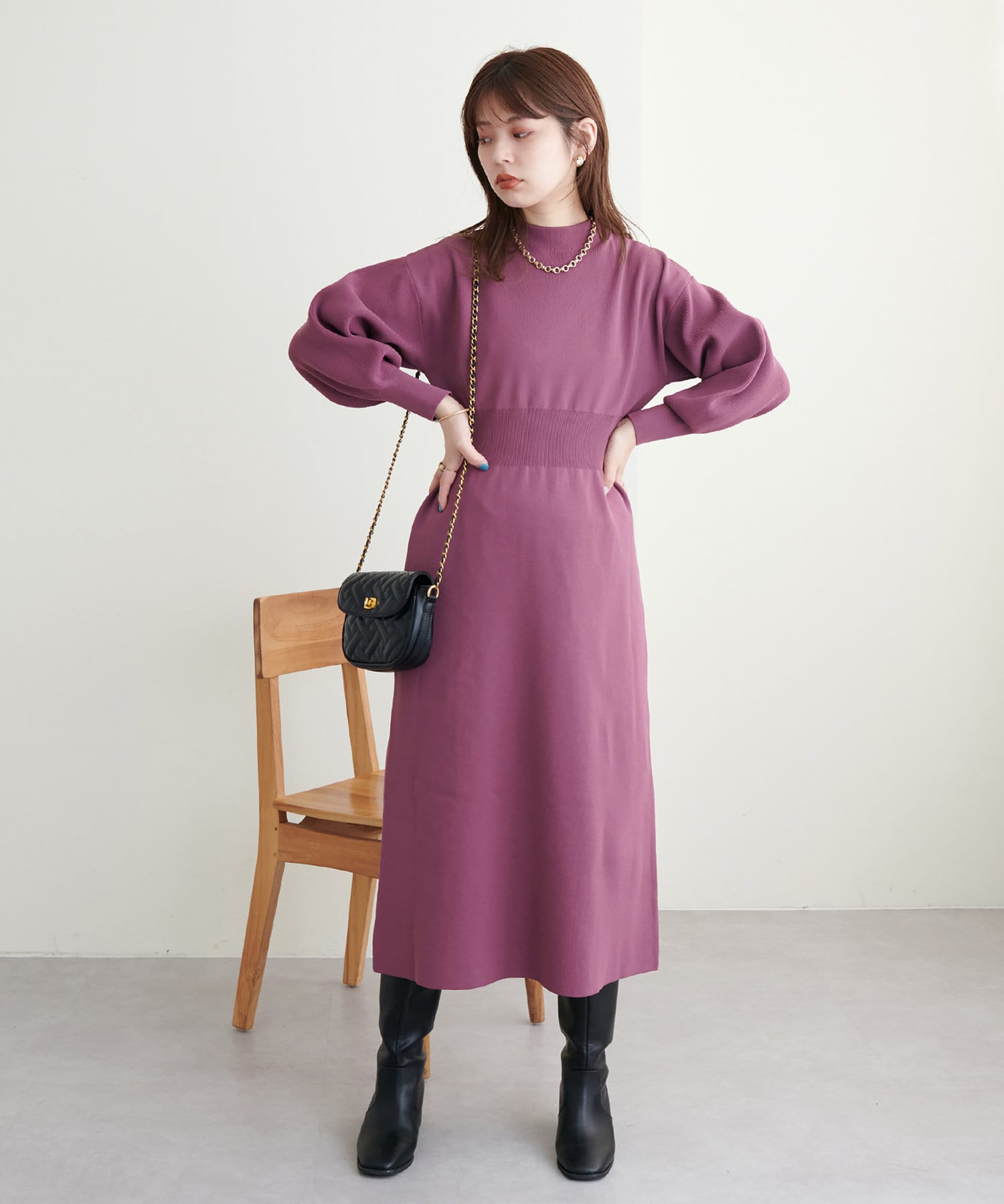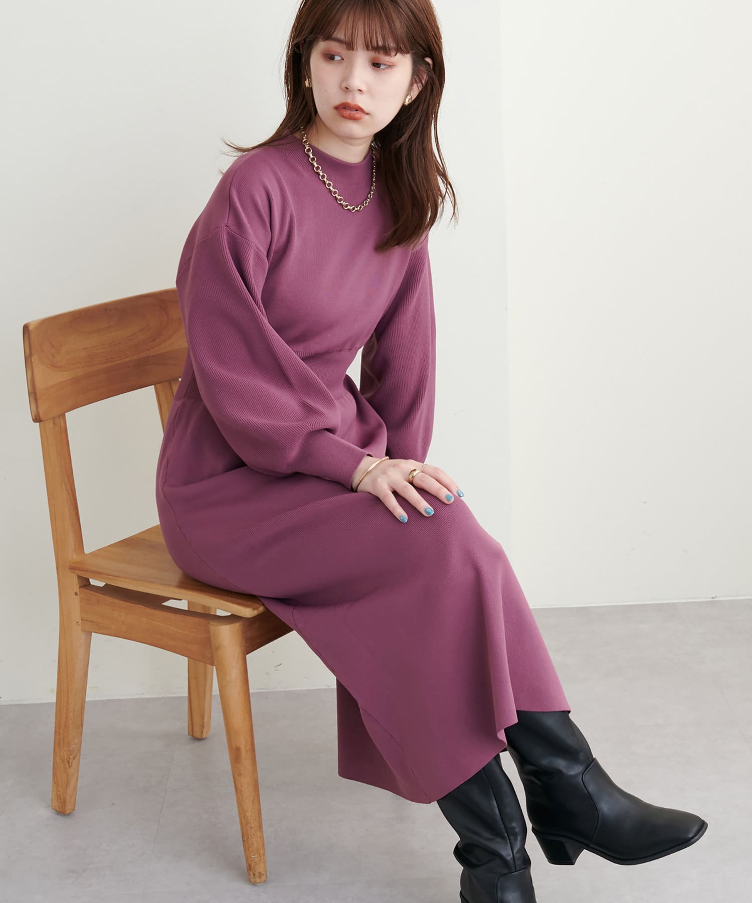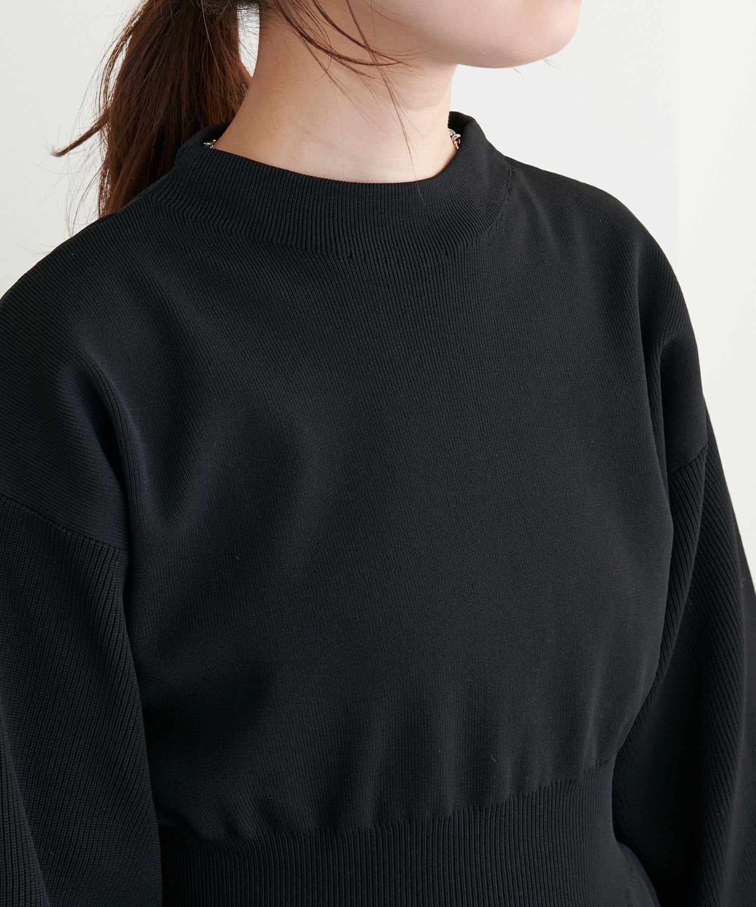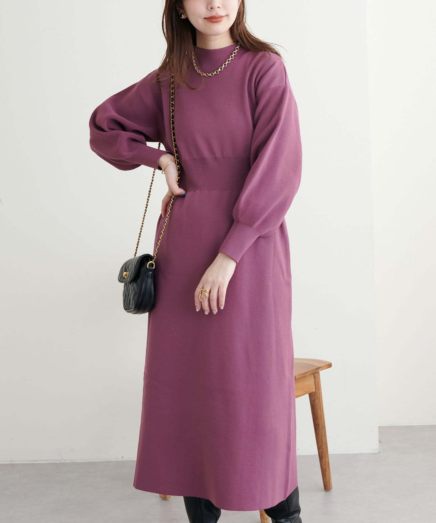 ボトルネック、ややボリュームを加えた袖、腰部分からのフレアデザインがポイントで、1枚で上品に女性らしく仕上がります。