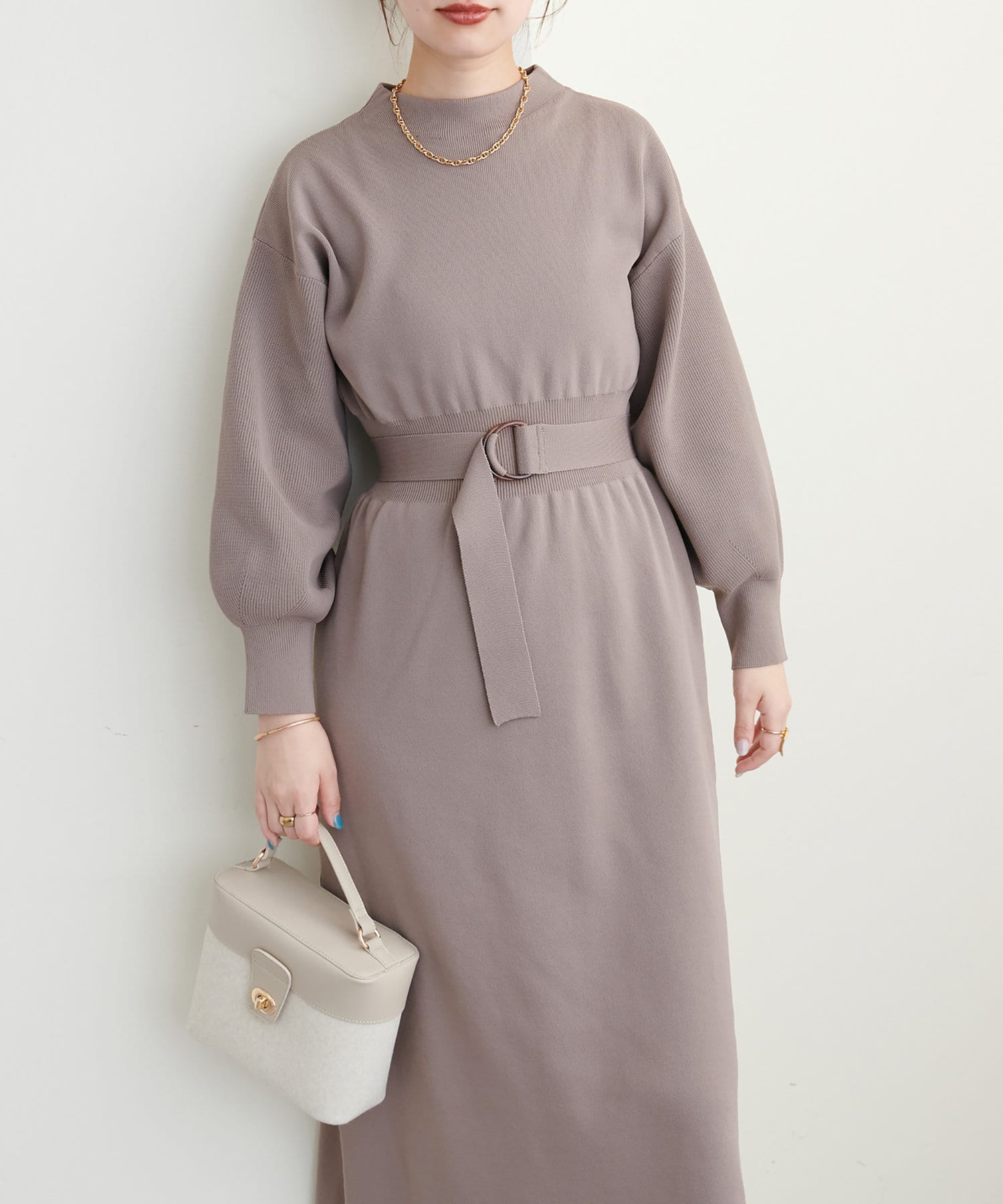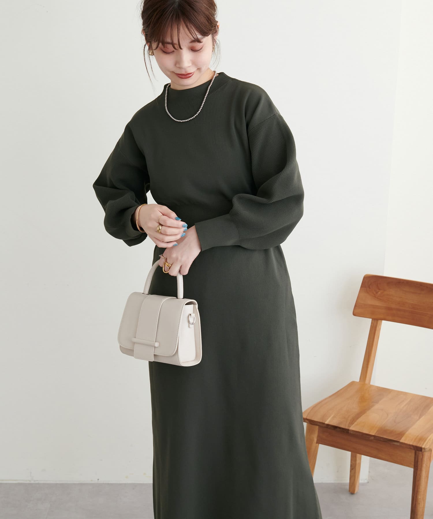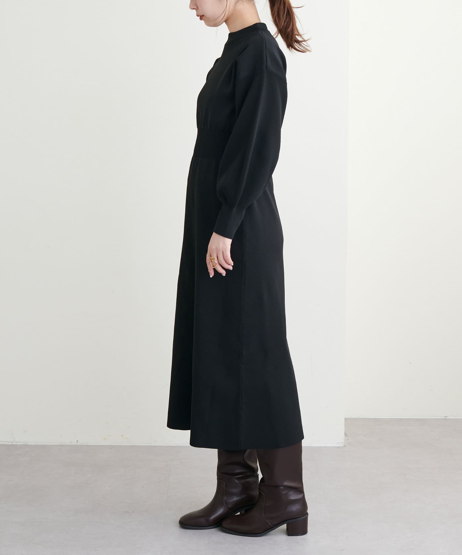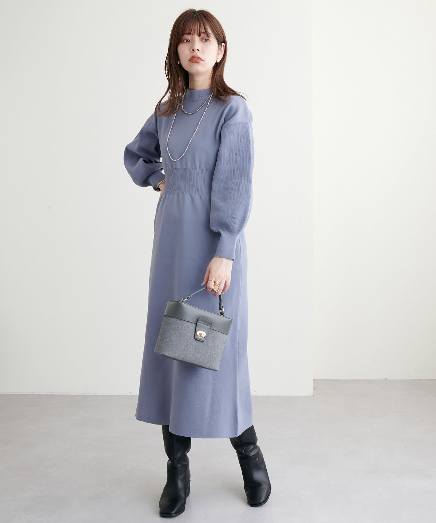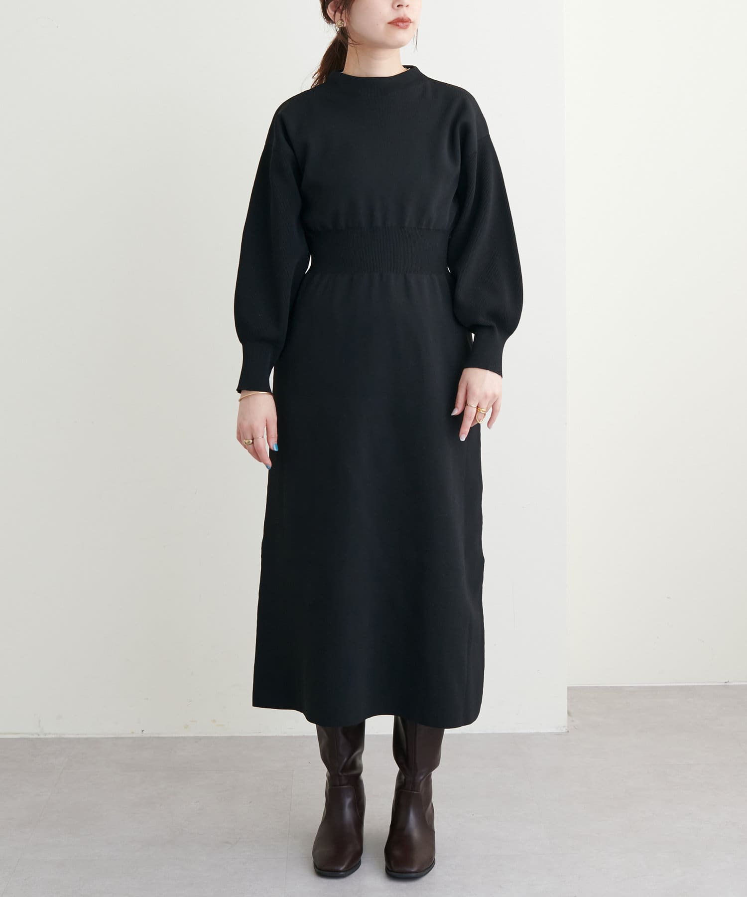 ボトルネック、ややボリュームを加えた袖、腰部分からのフレアデザインがポイントで、1枚で上品に女性らしく仕上がります。