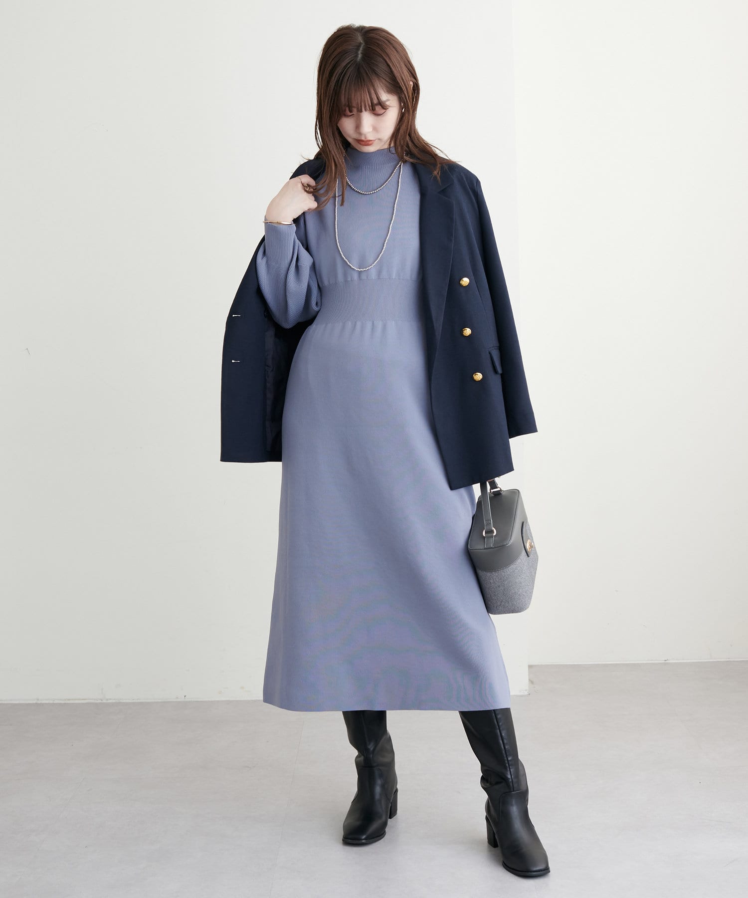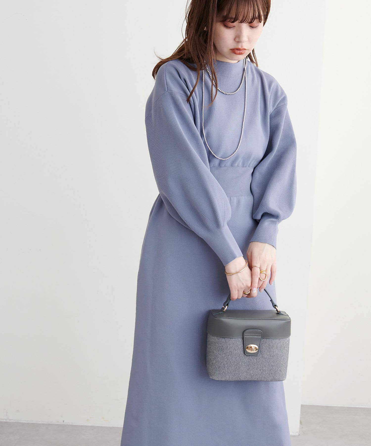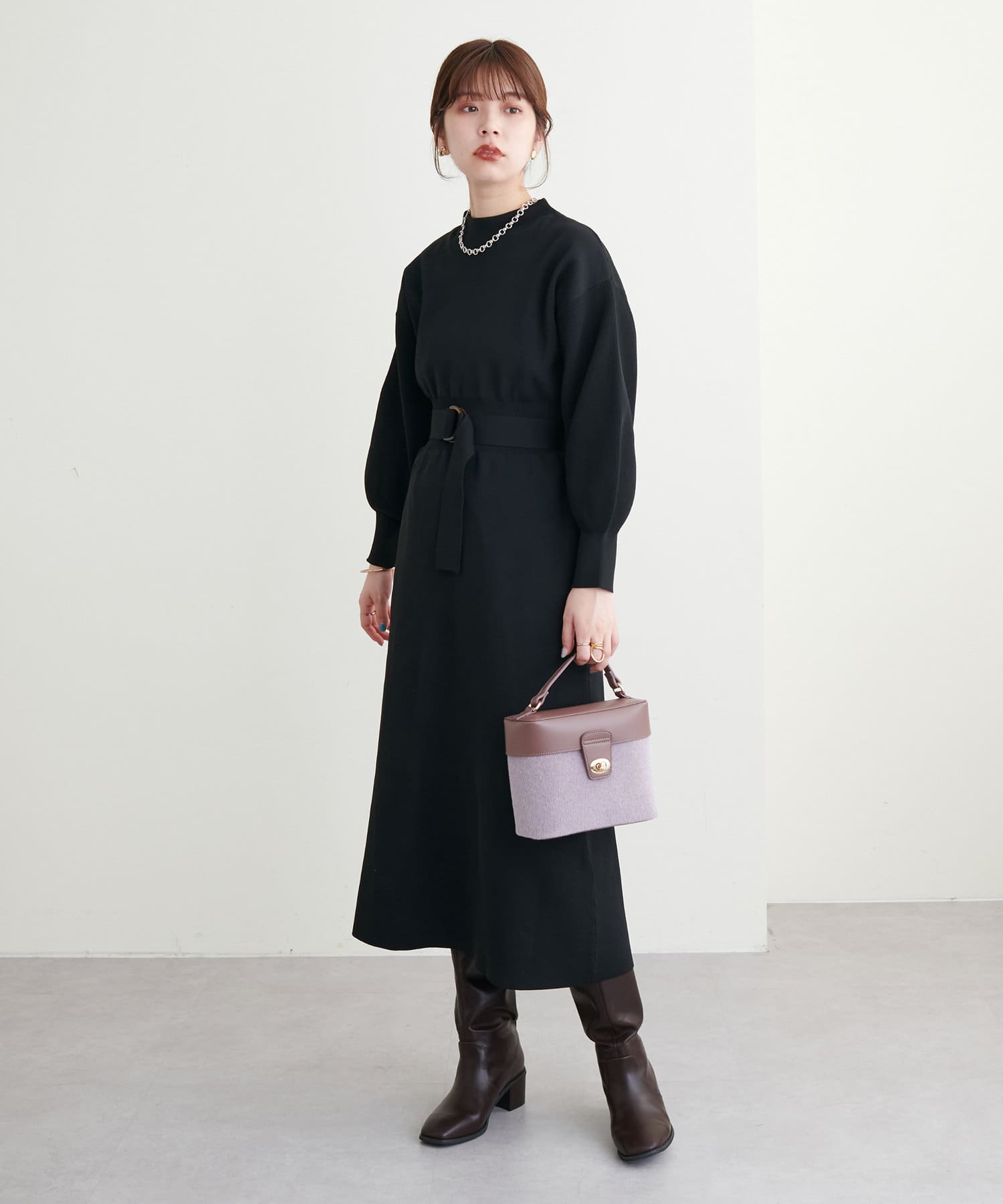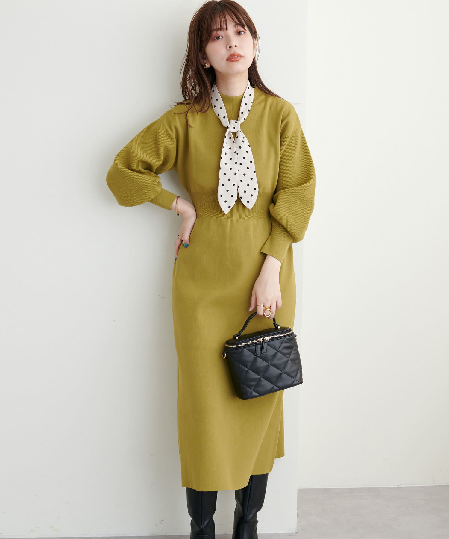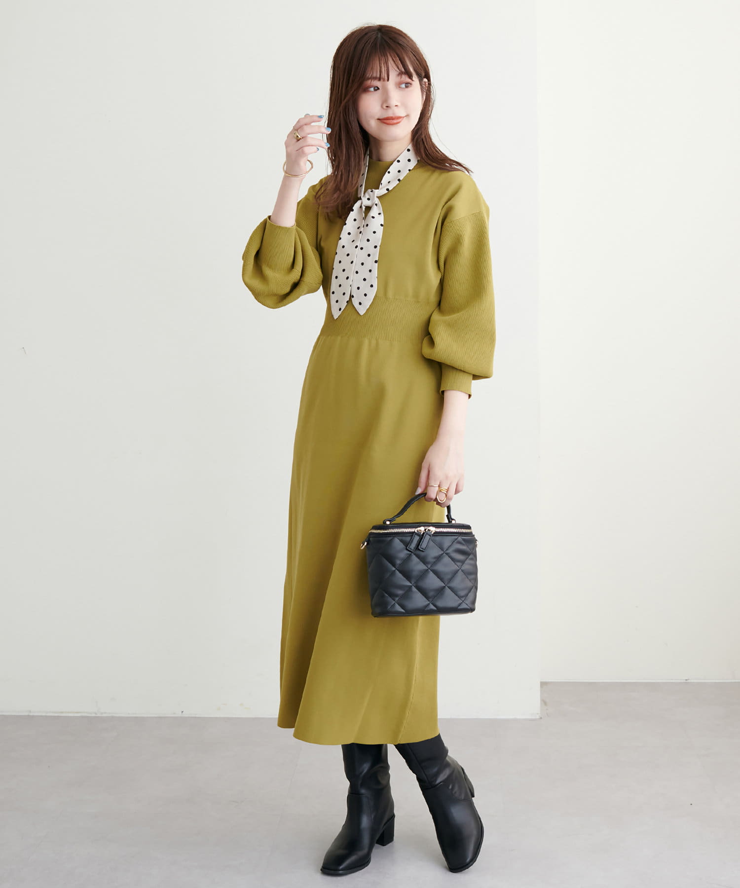 ボトルネック、ややボリュームを加えた袖、腰部分からのフレアデザインがポイントで、1枚で上品に女性らしく仕上がります。