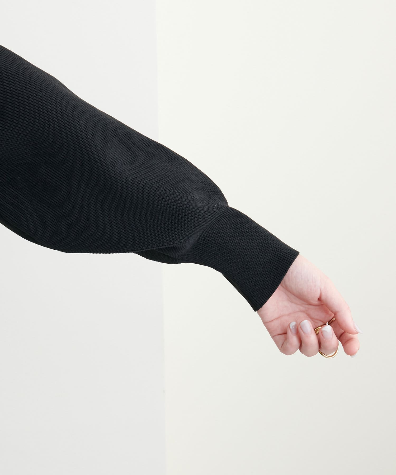 すっきりとした胴部分とローゲージのお袖の切り替えがシンプルすぎずメリハリのつくポイント。
