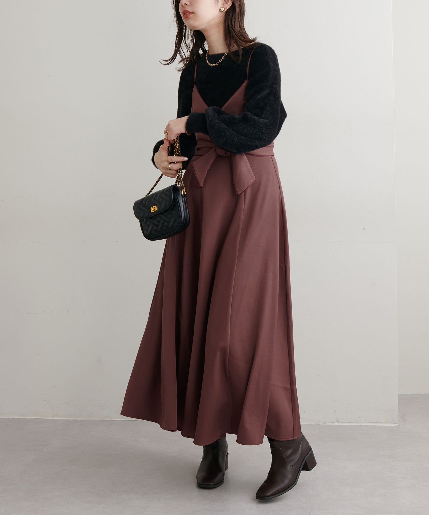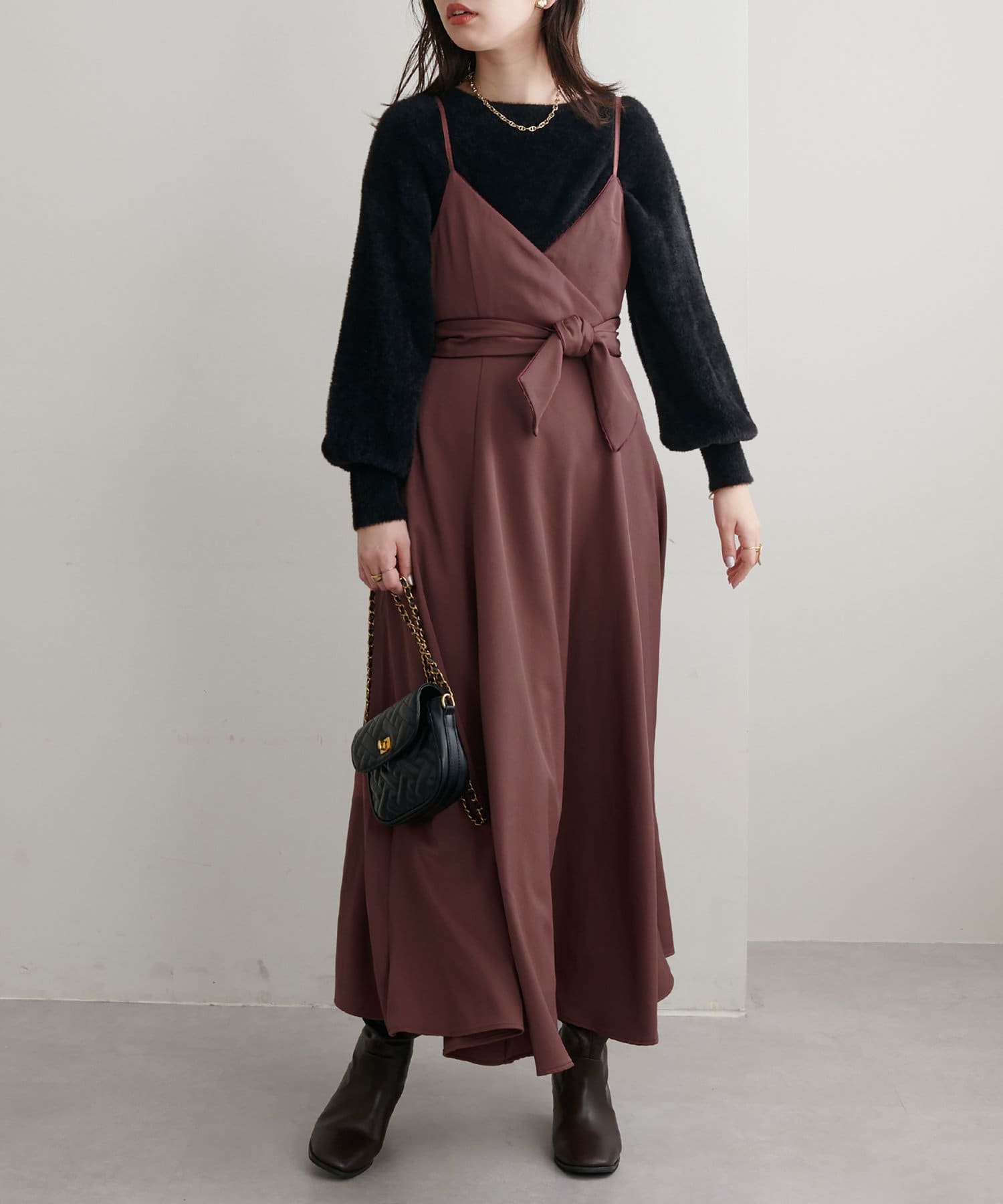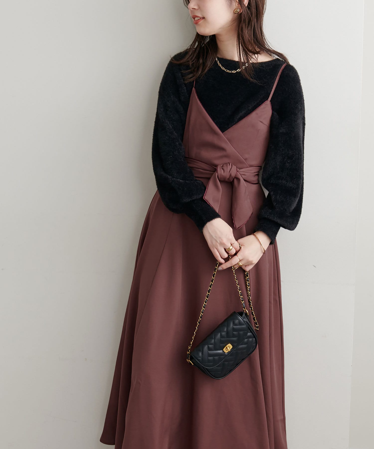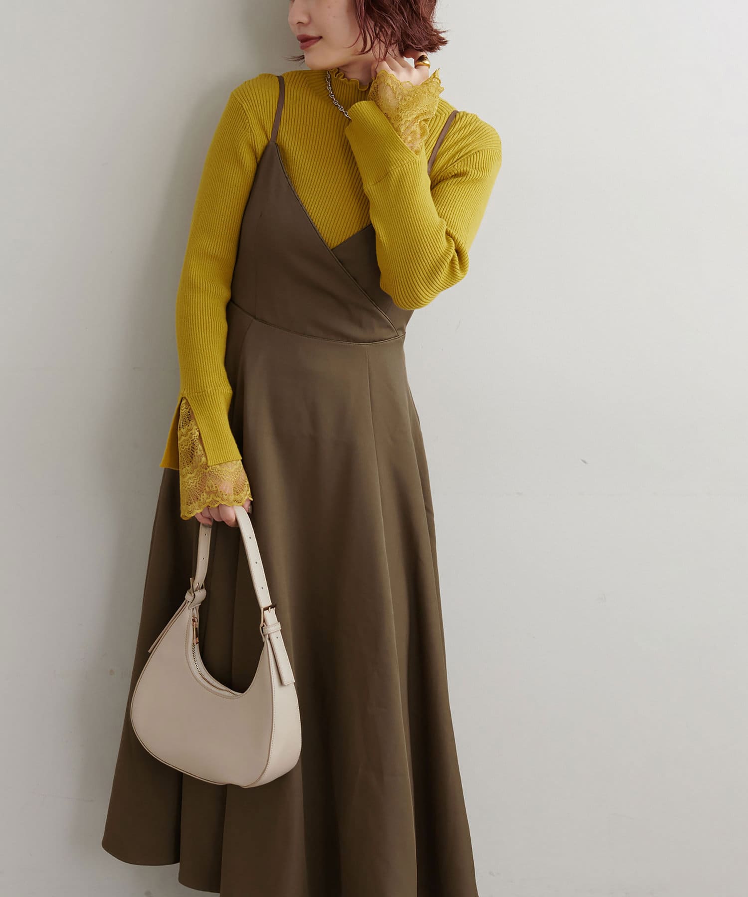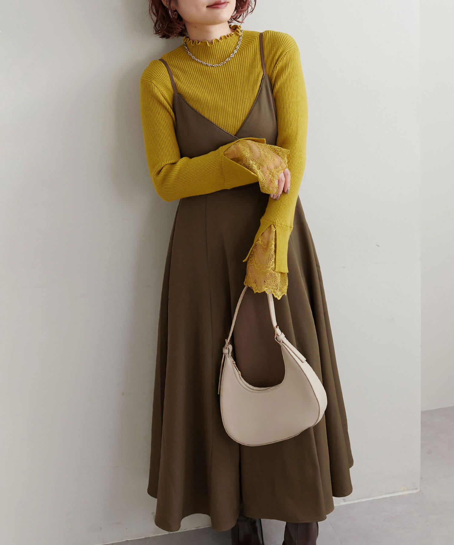 ショート丈のニットをワンピの上に着て、レイヤードスタイルでも秋冬らしく決まります。