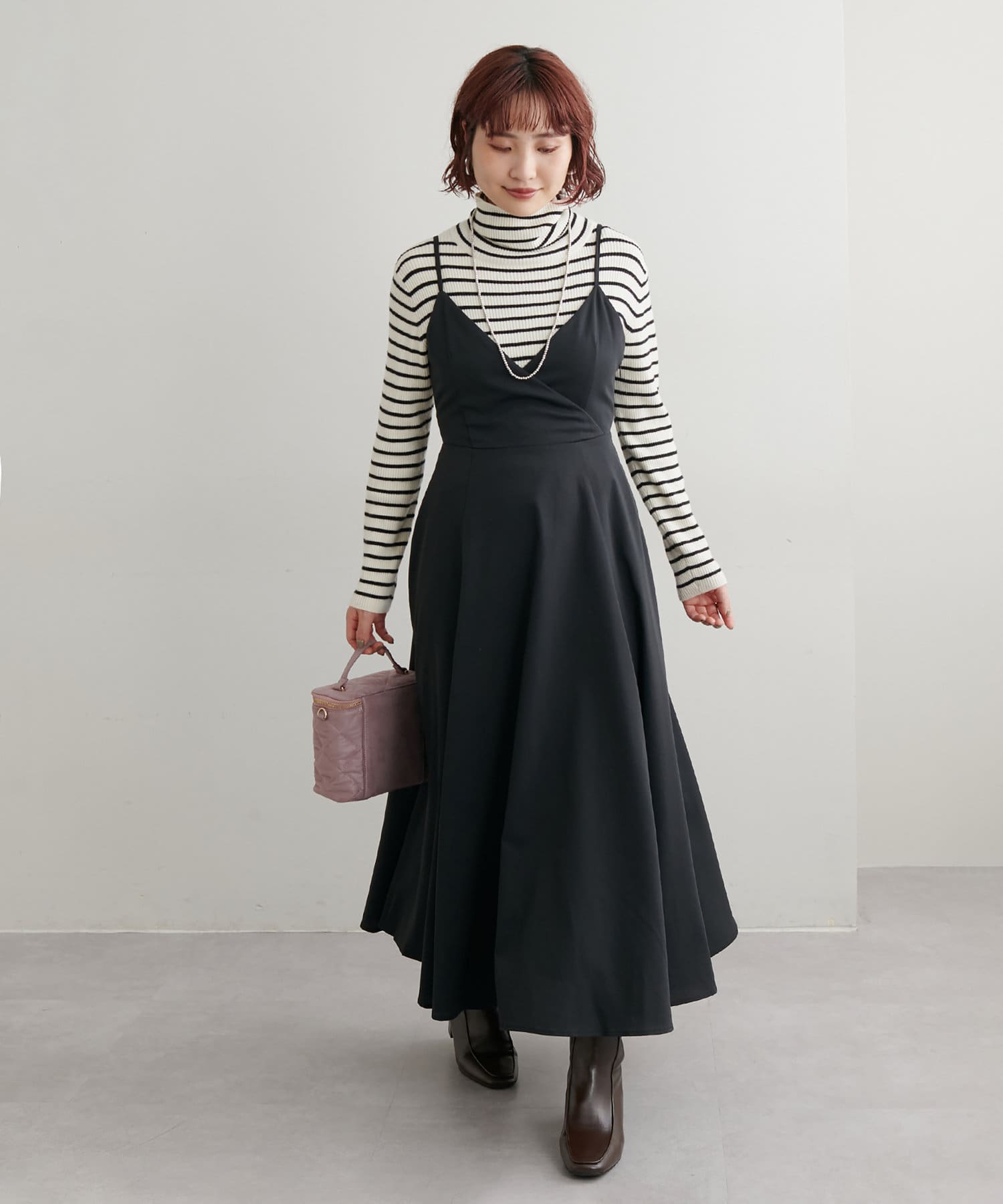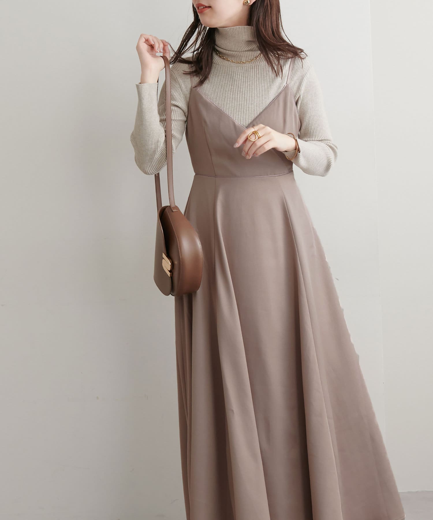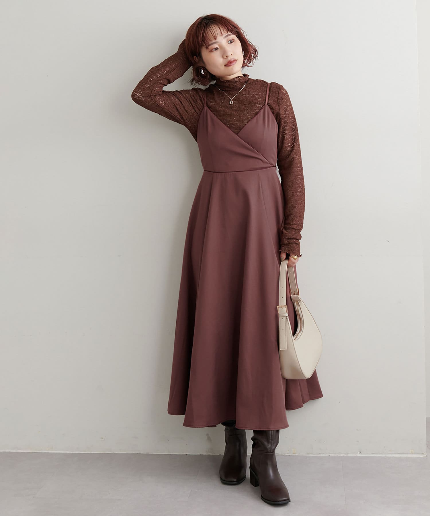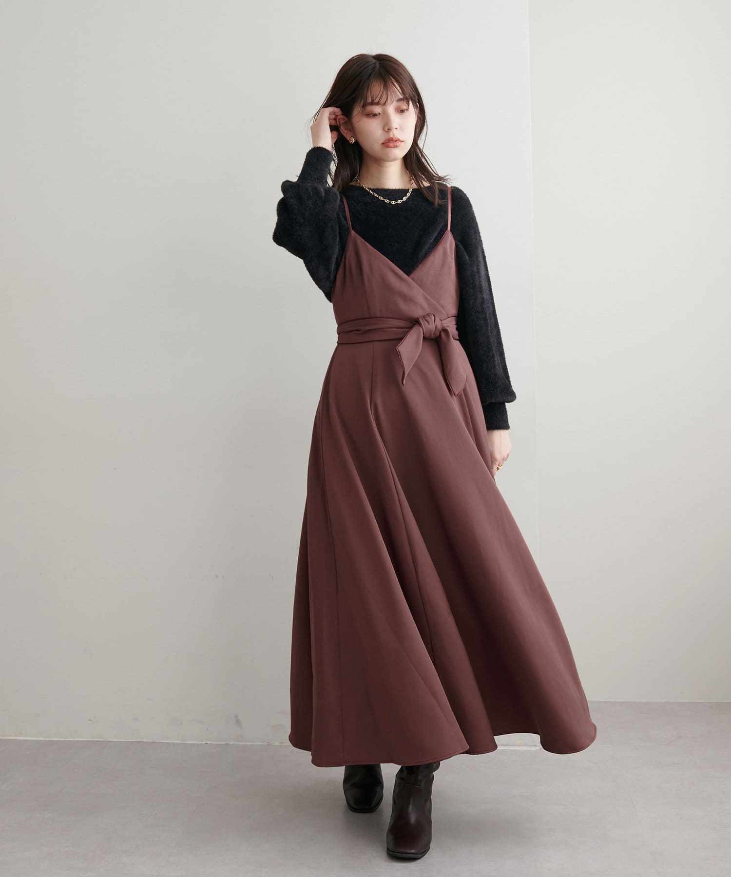 ショート丈のニットをワンピの上に着て、レイヤードスタイルでも秋冬らしく決まります。