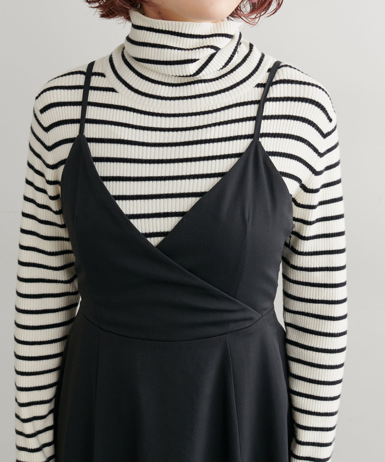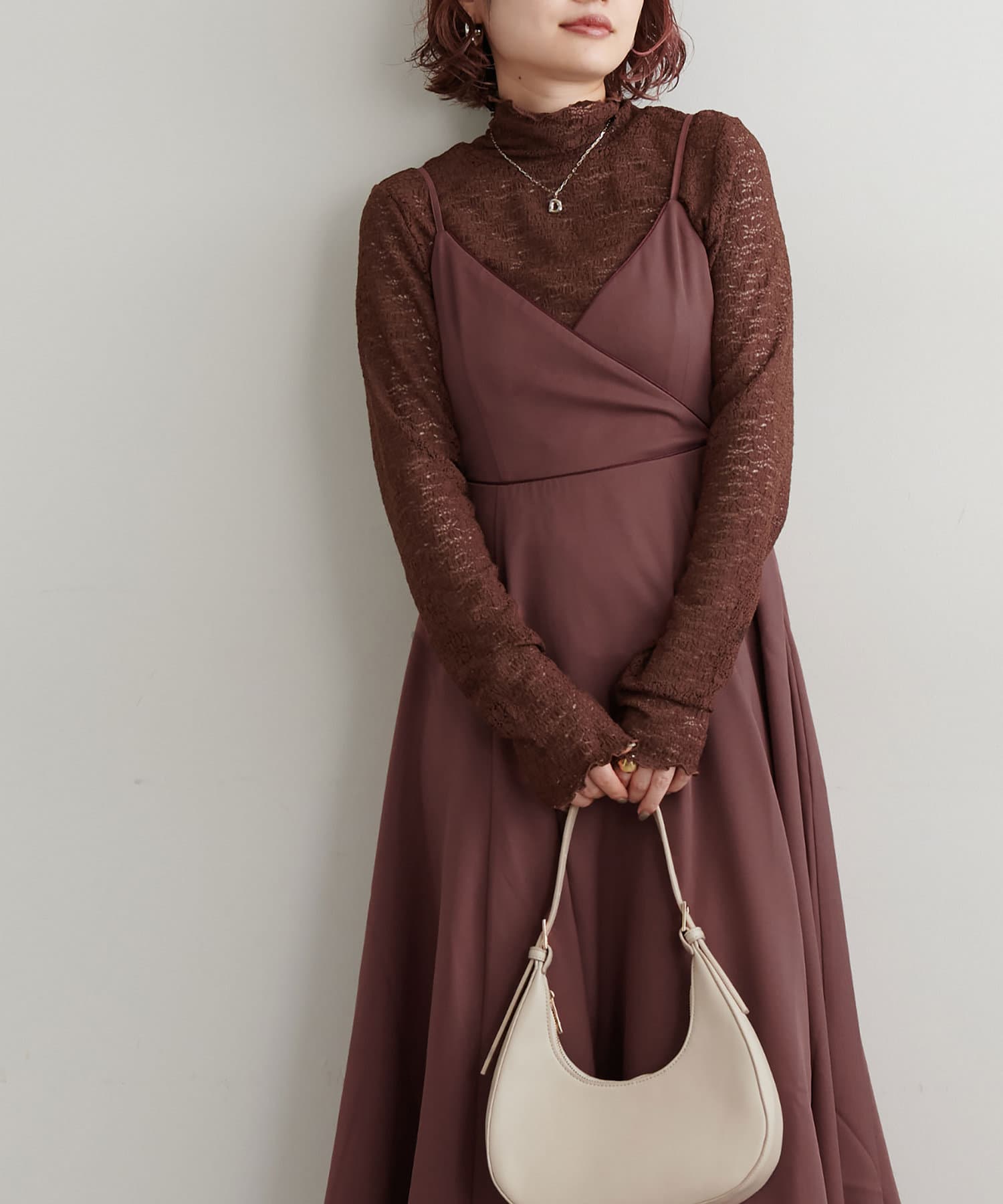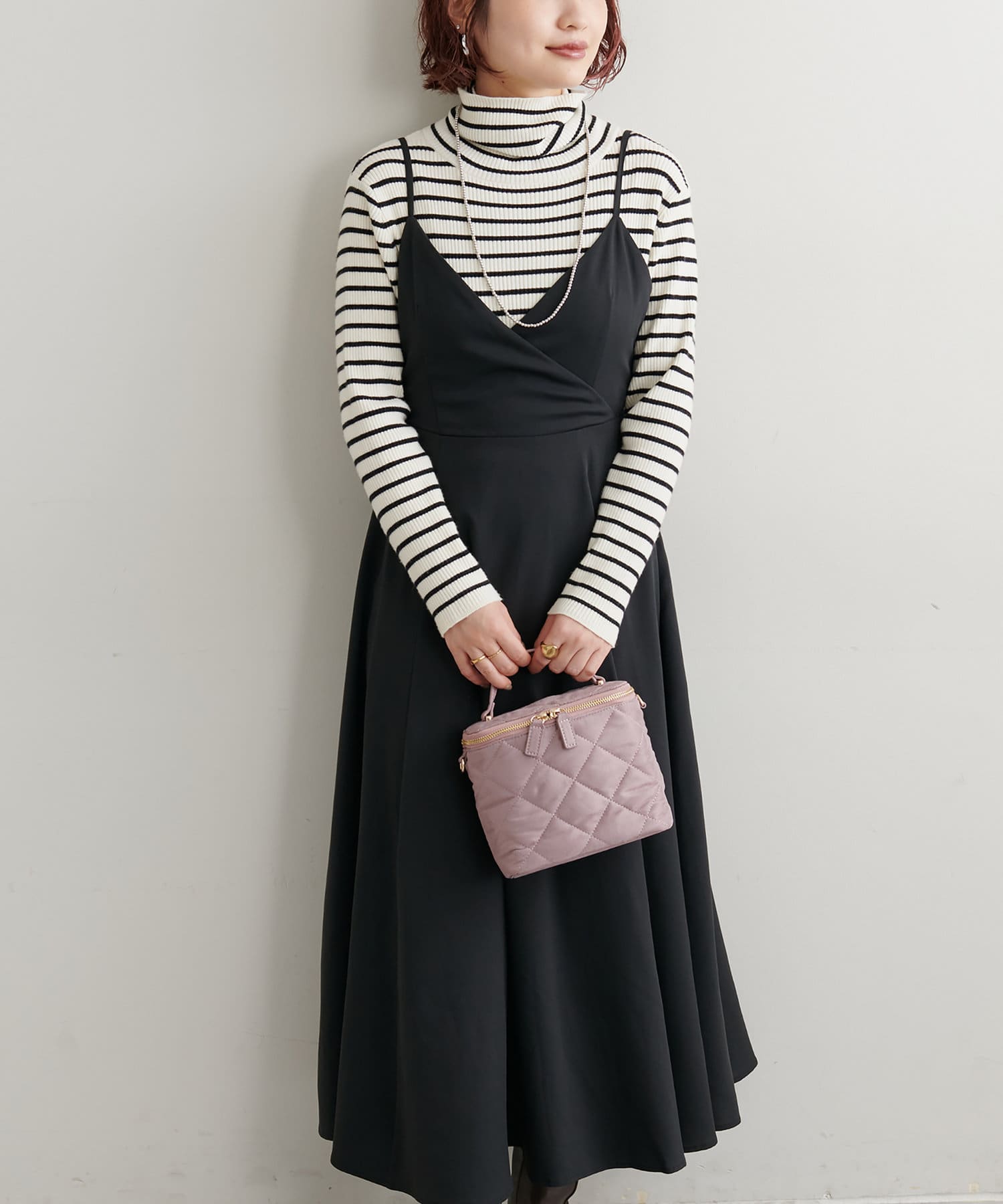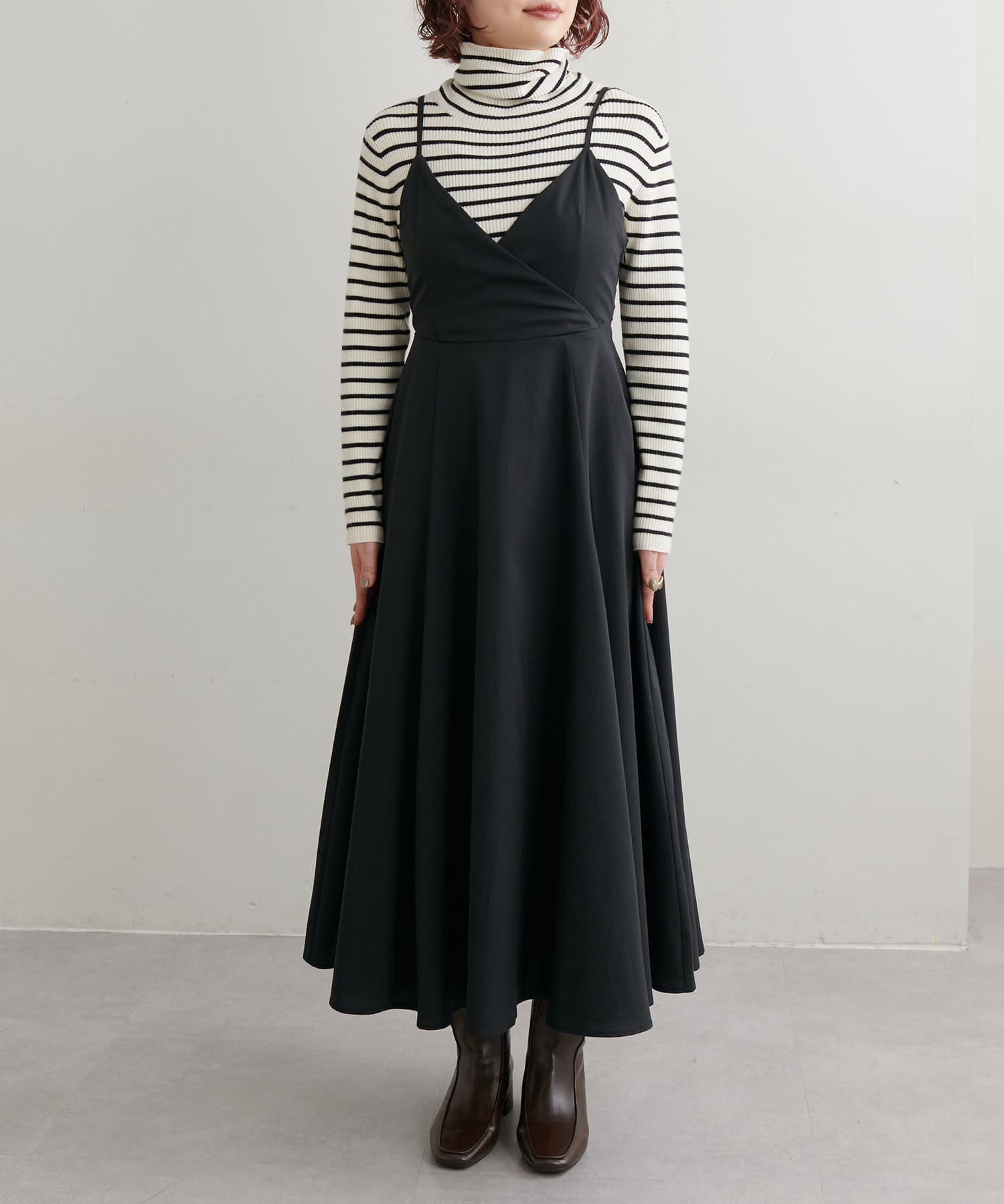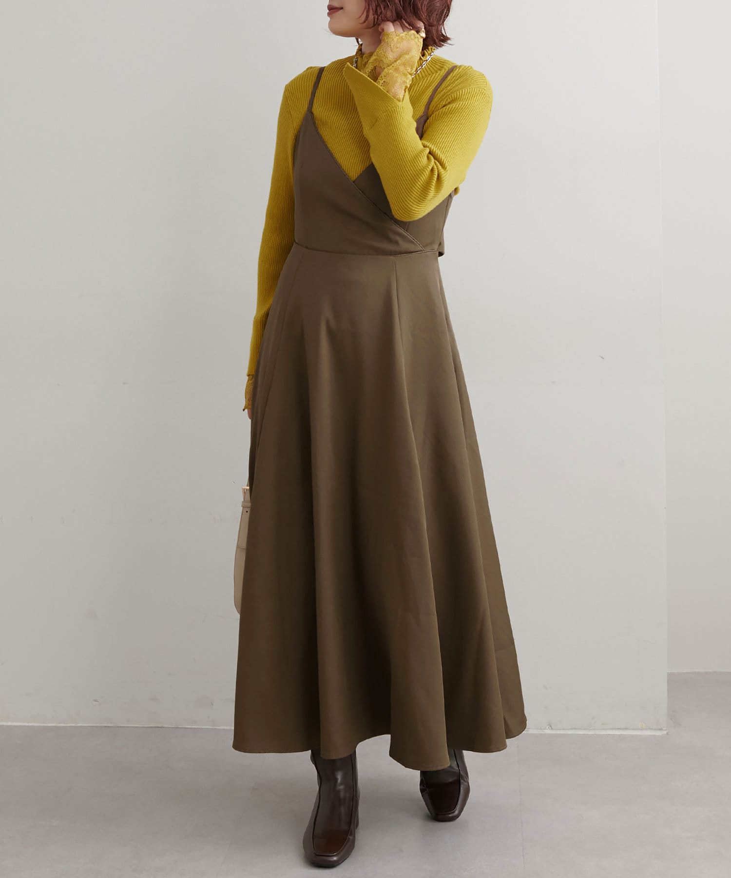 ショート丈のニットをワンピの上に着て、レイヤードスタイルでも秋冬らしく決まります。