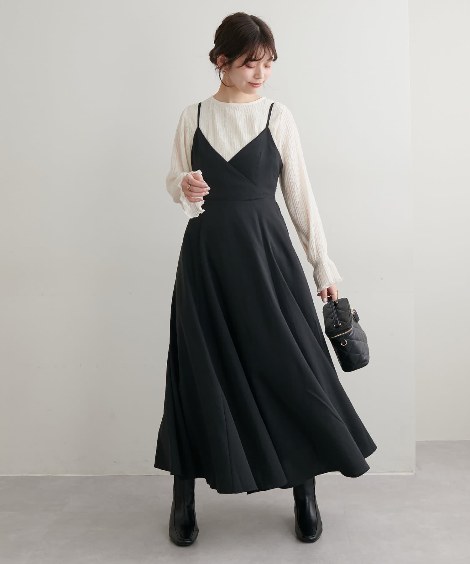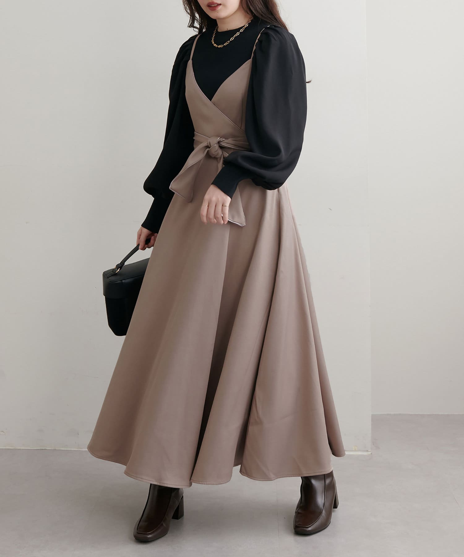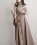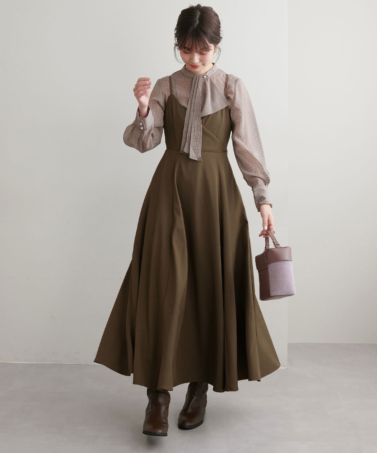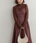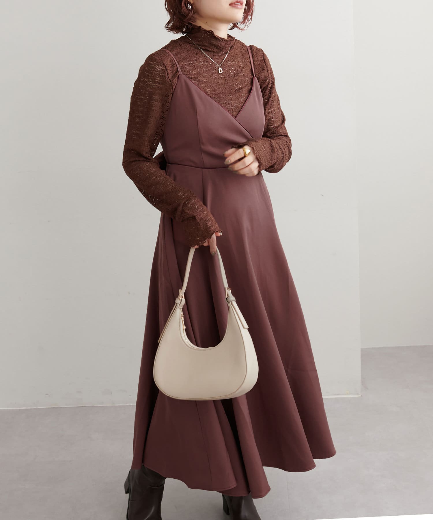 ショート丈のニットをワンピの上に着て、レイヤードスタイルでも秋冬らしく決まります。