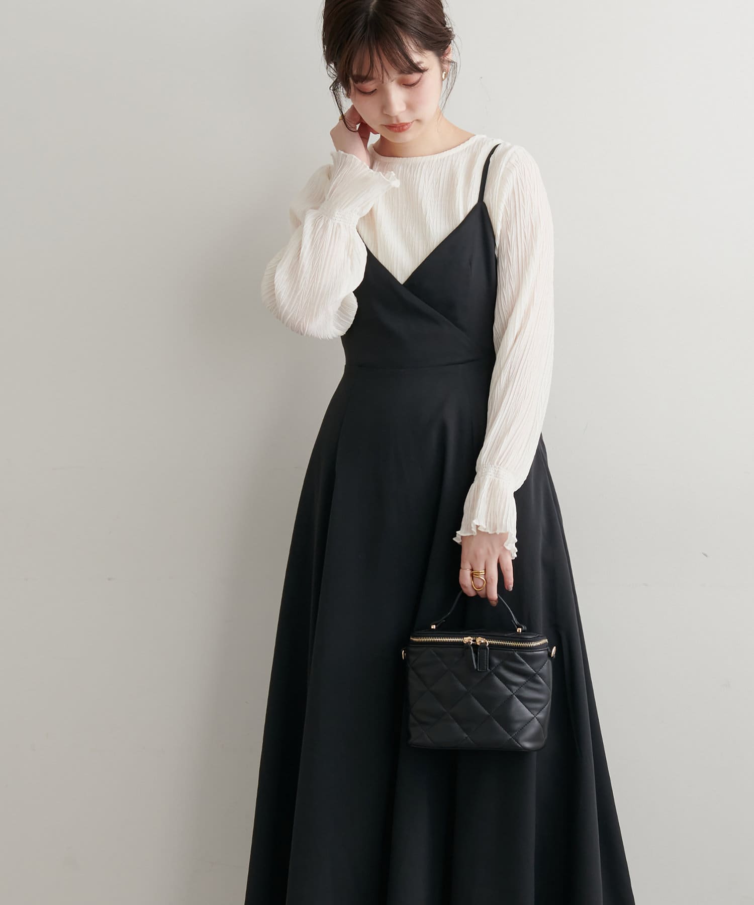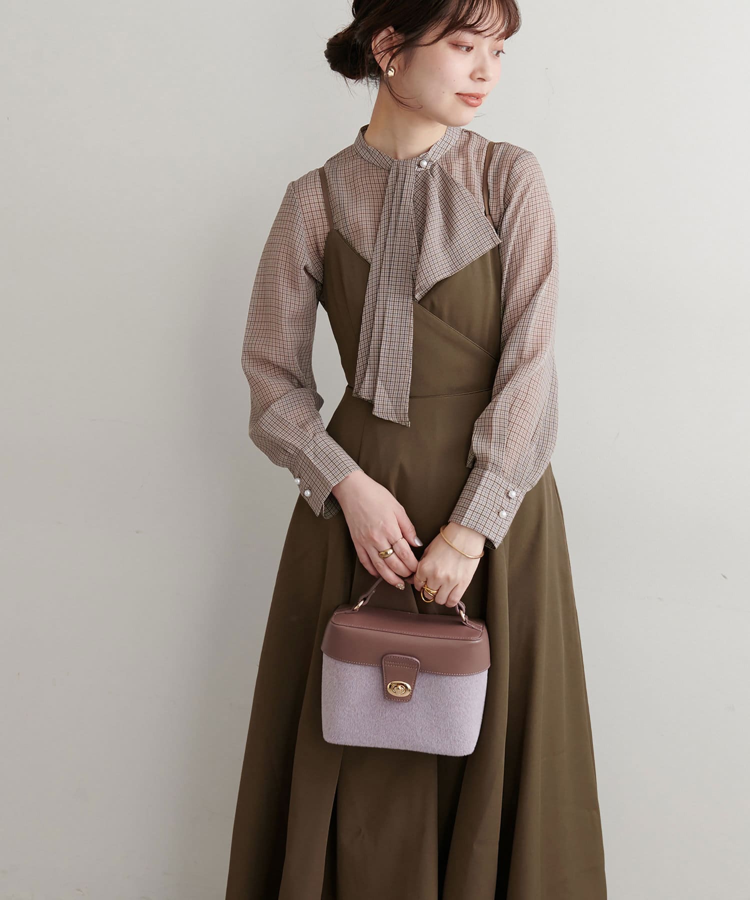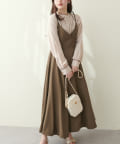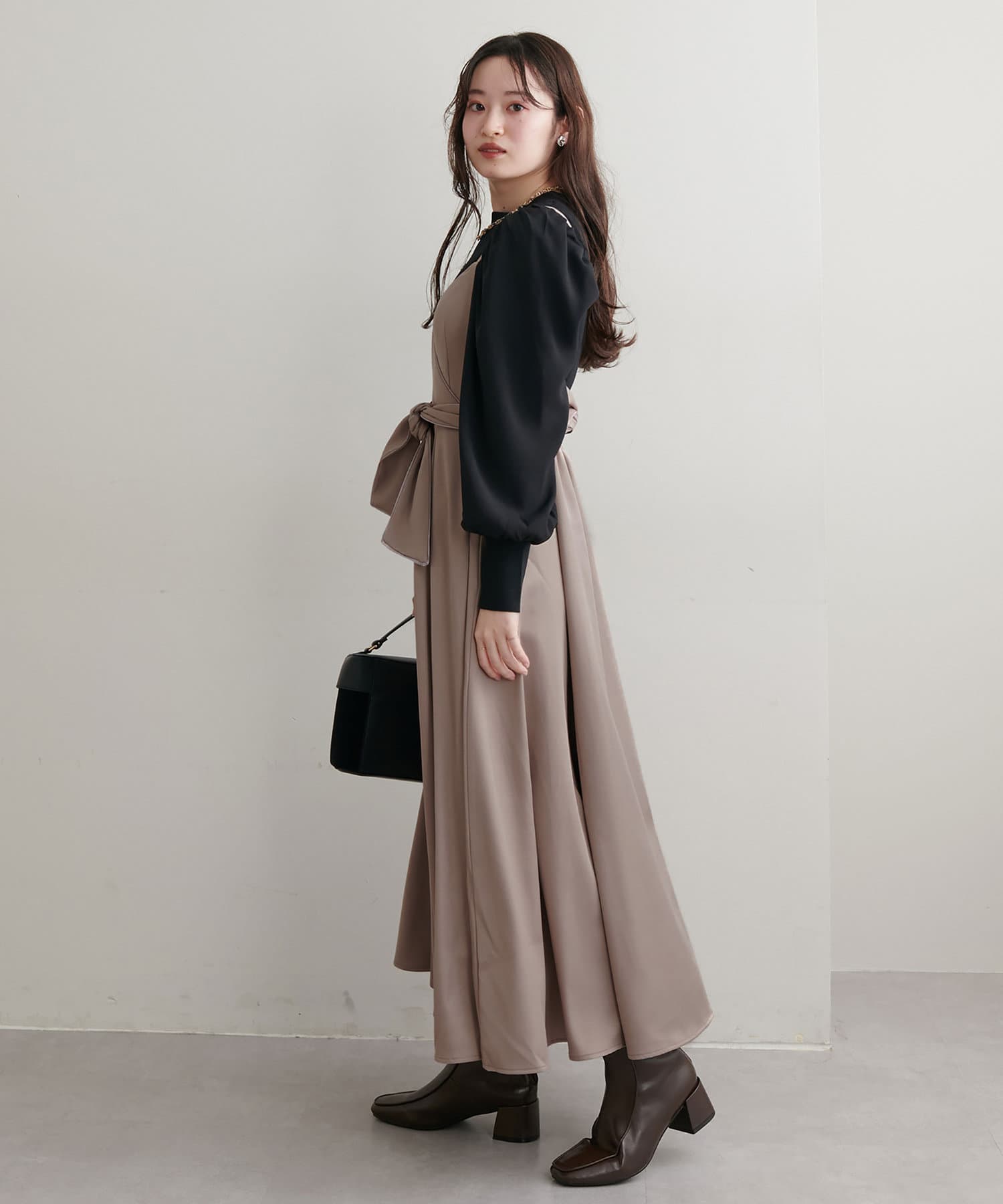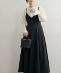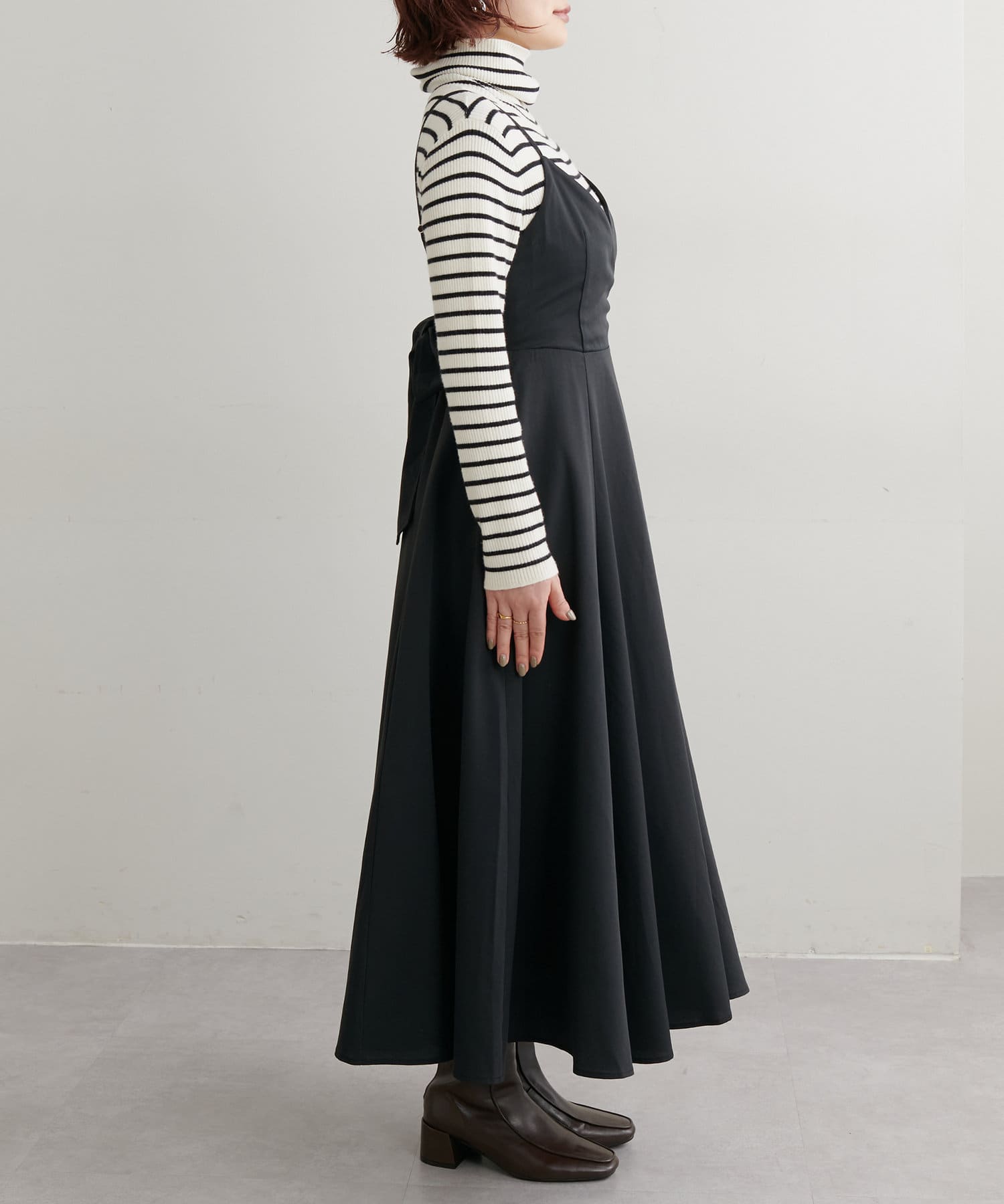 ショート丈のニットをワンピの上に着て、レイヤードスタイルでも秋冬らしく決まります。