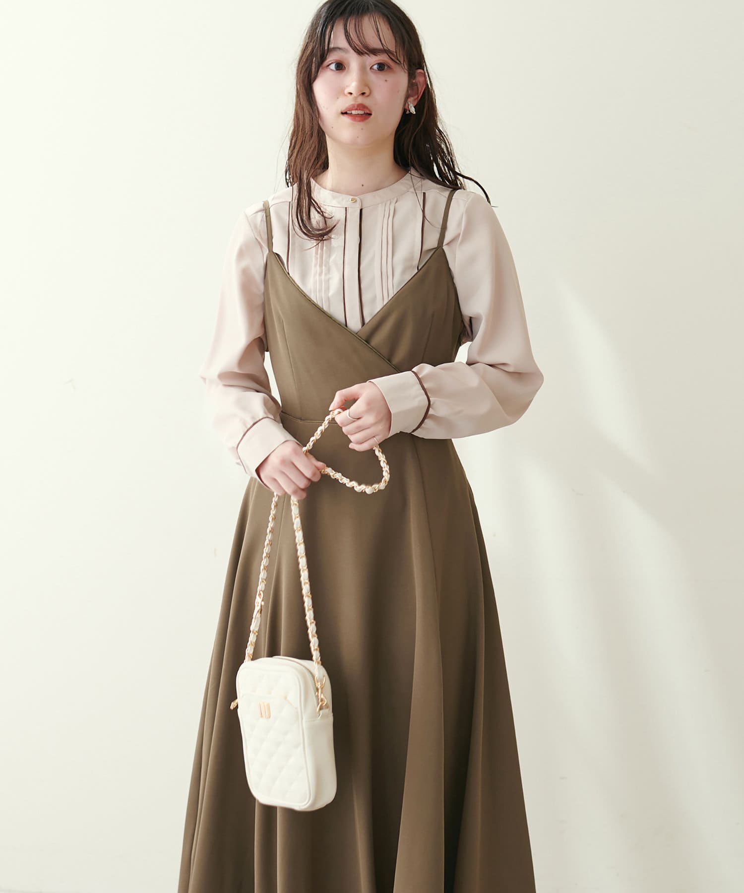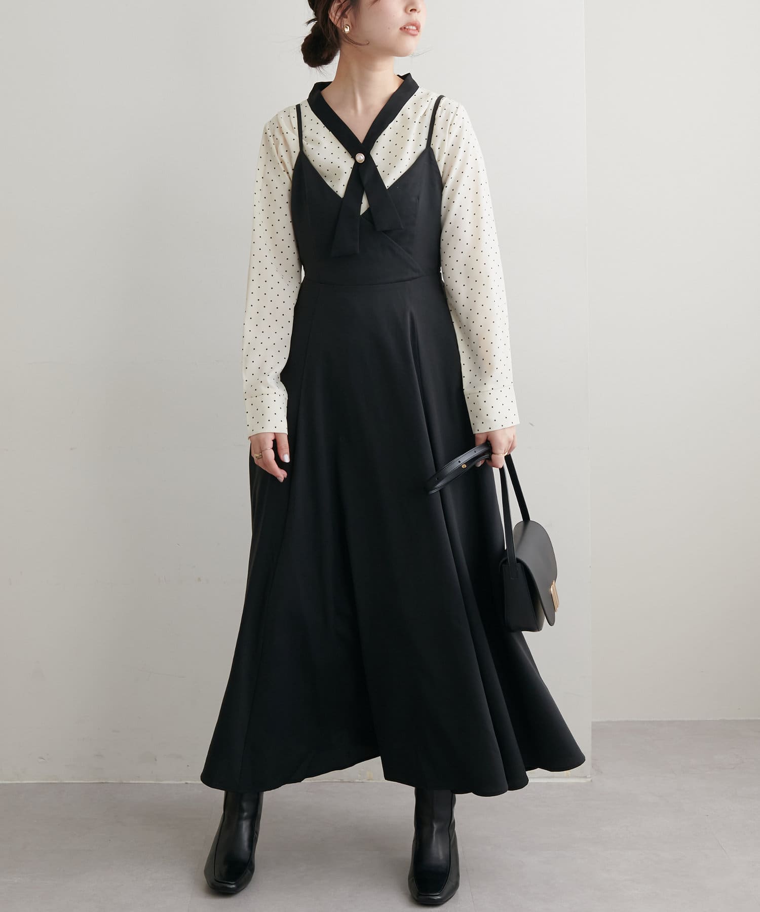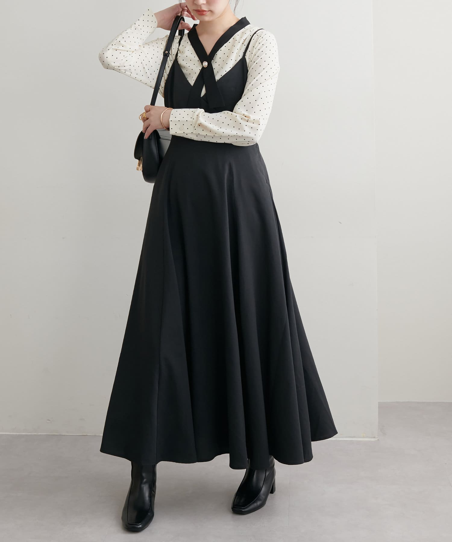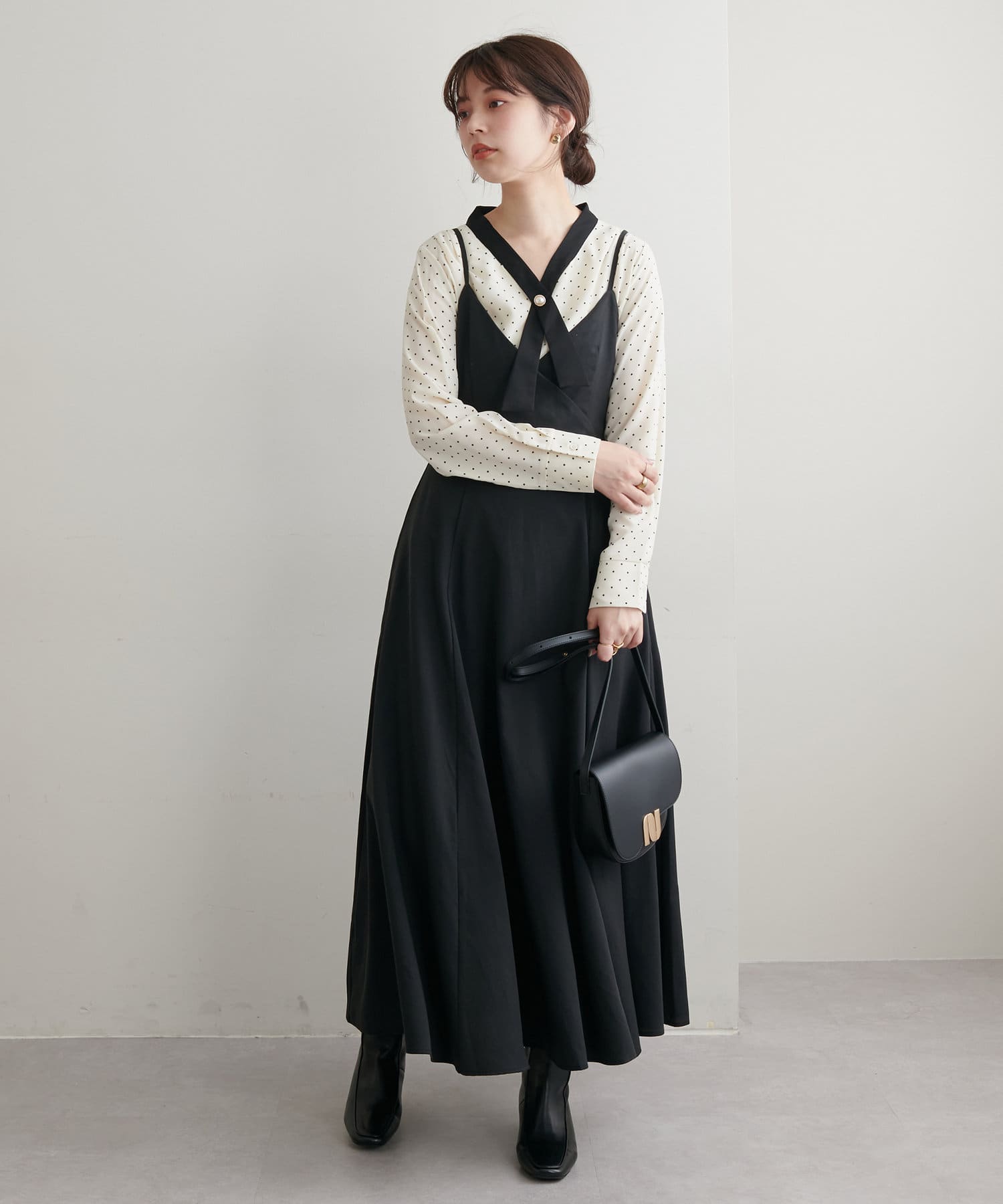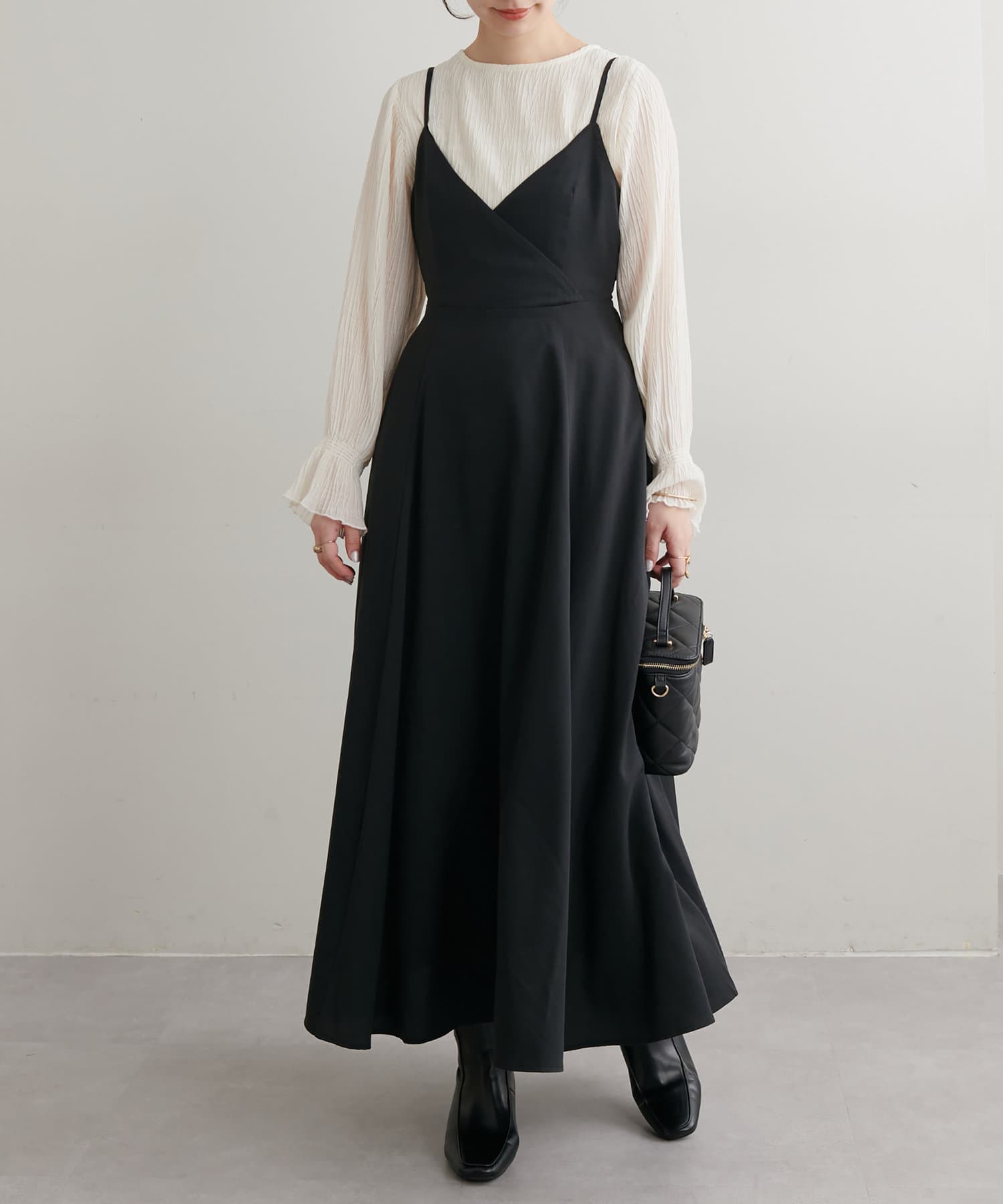 ショート丈のニットをワンピの上に着て、レイヤードスタイルでも秋冬らしく決まります。