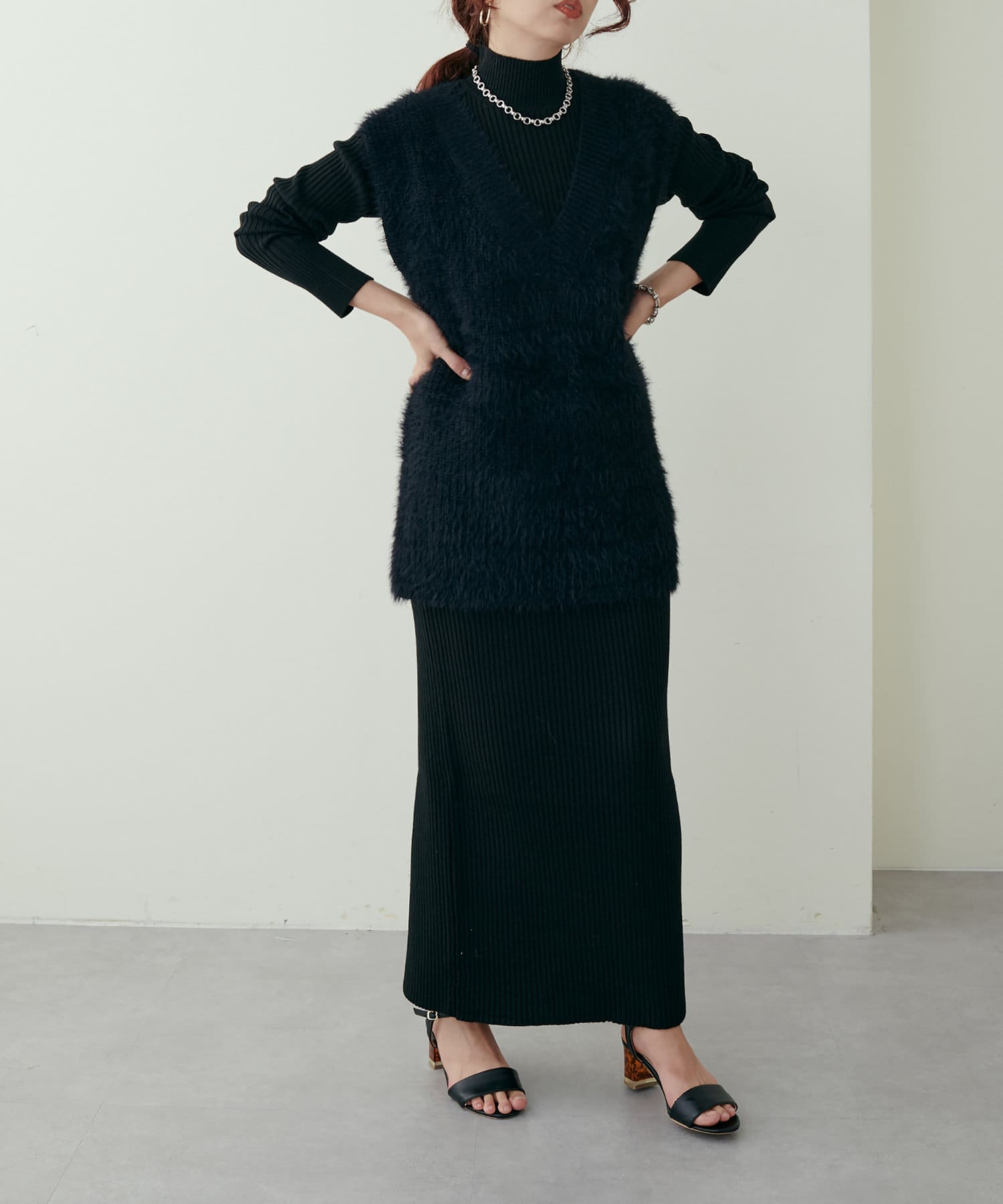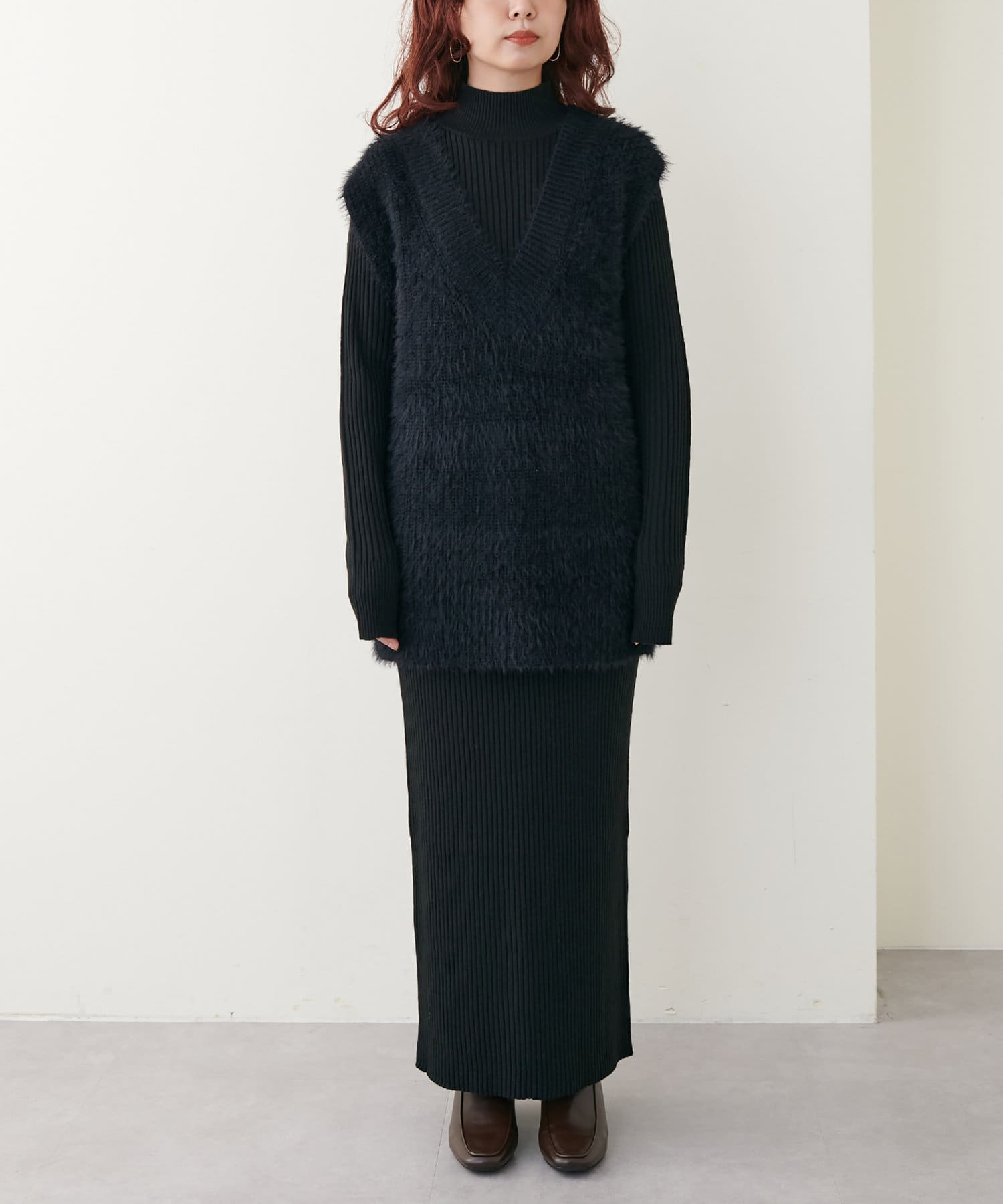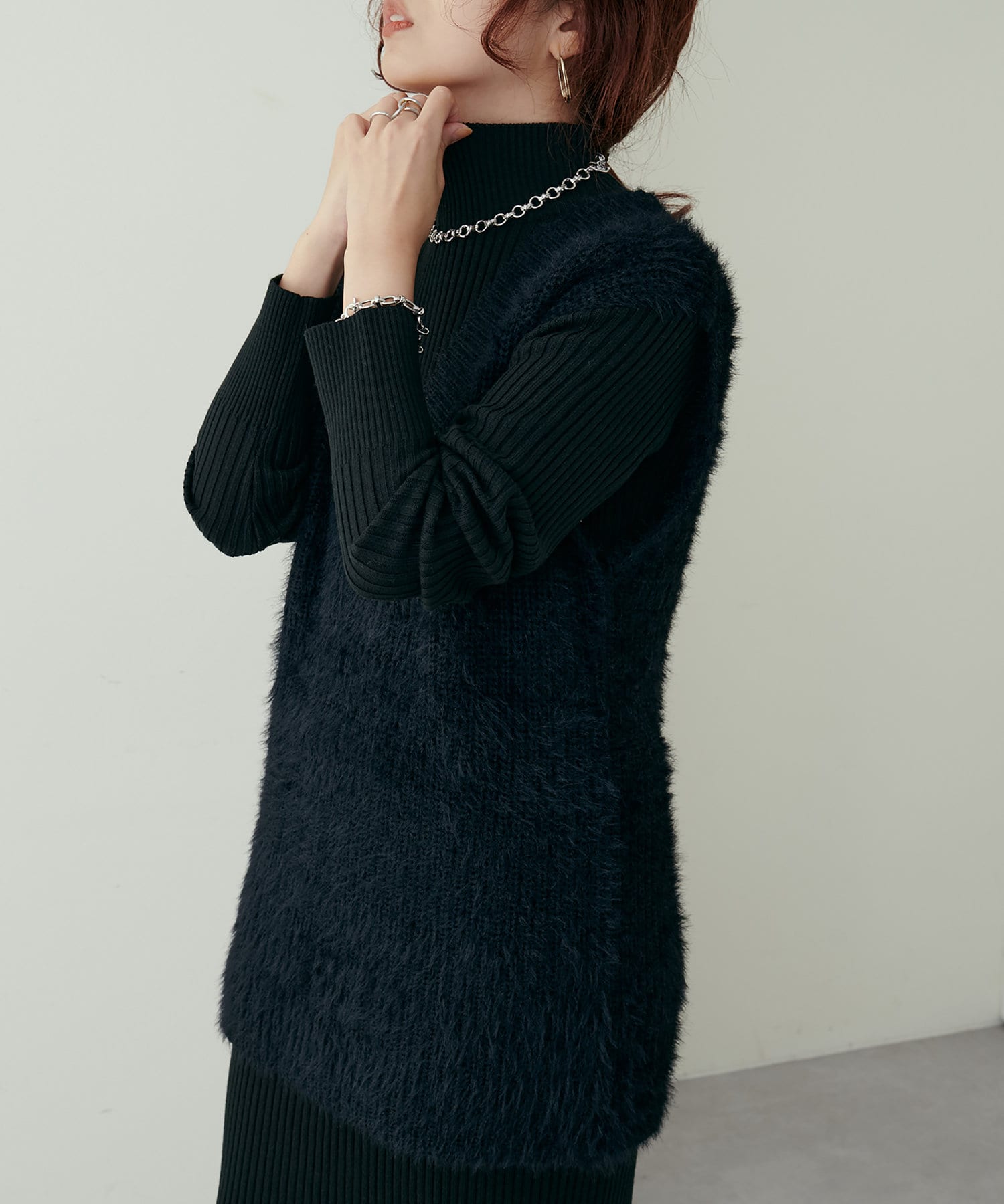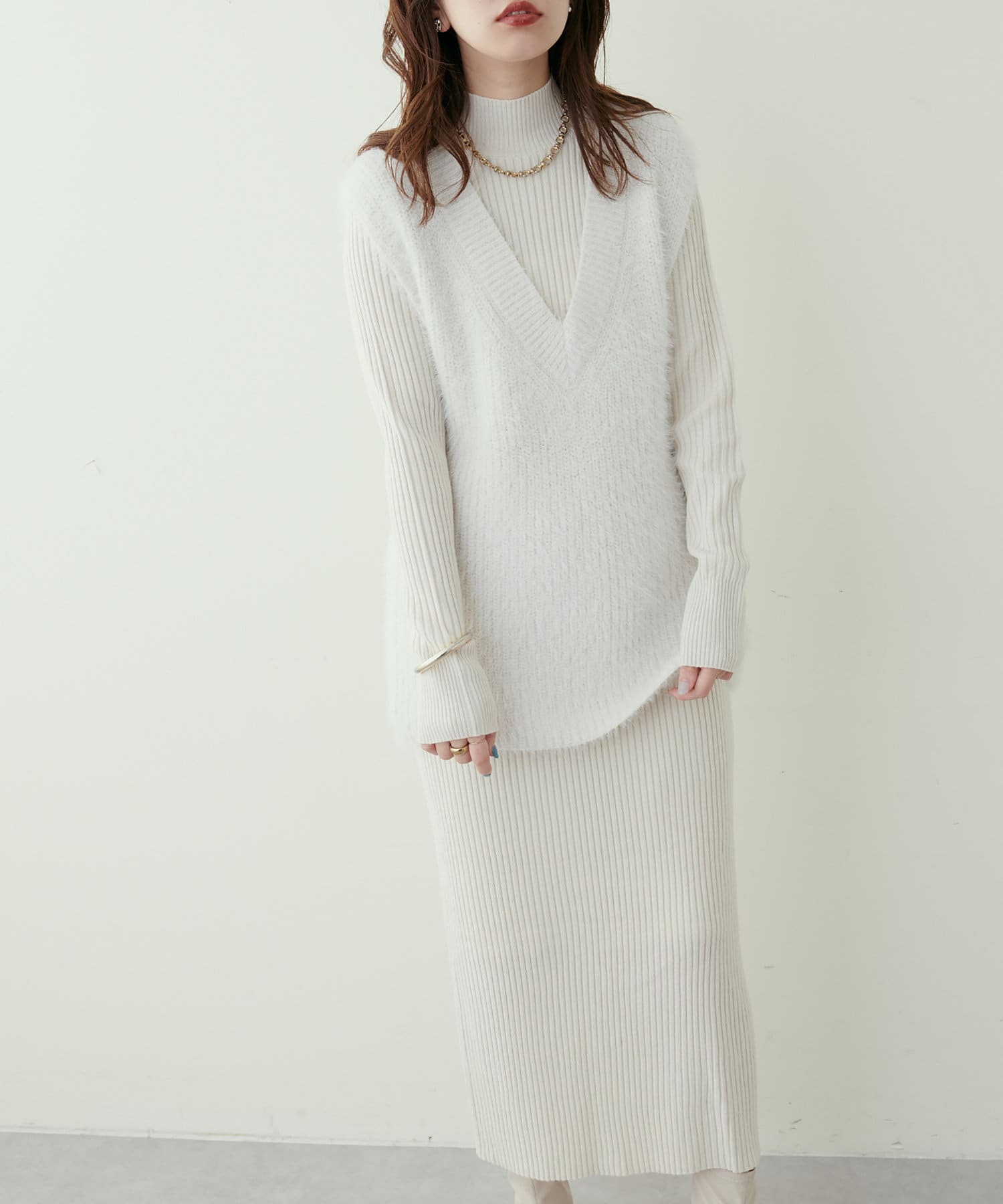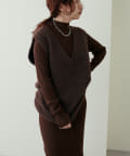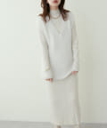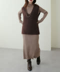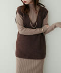 シンプルなリブのニットワンピースに同色のベストがセットになったアイテム。
