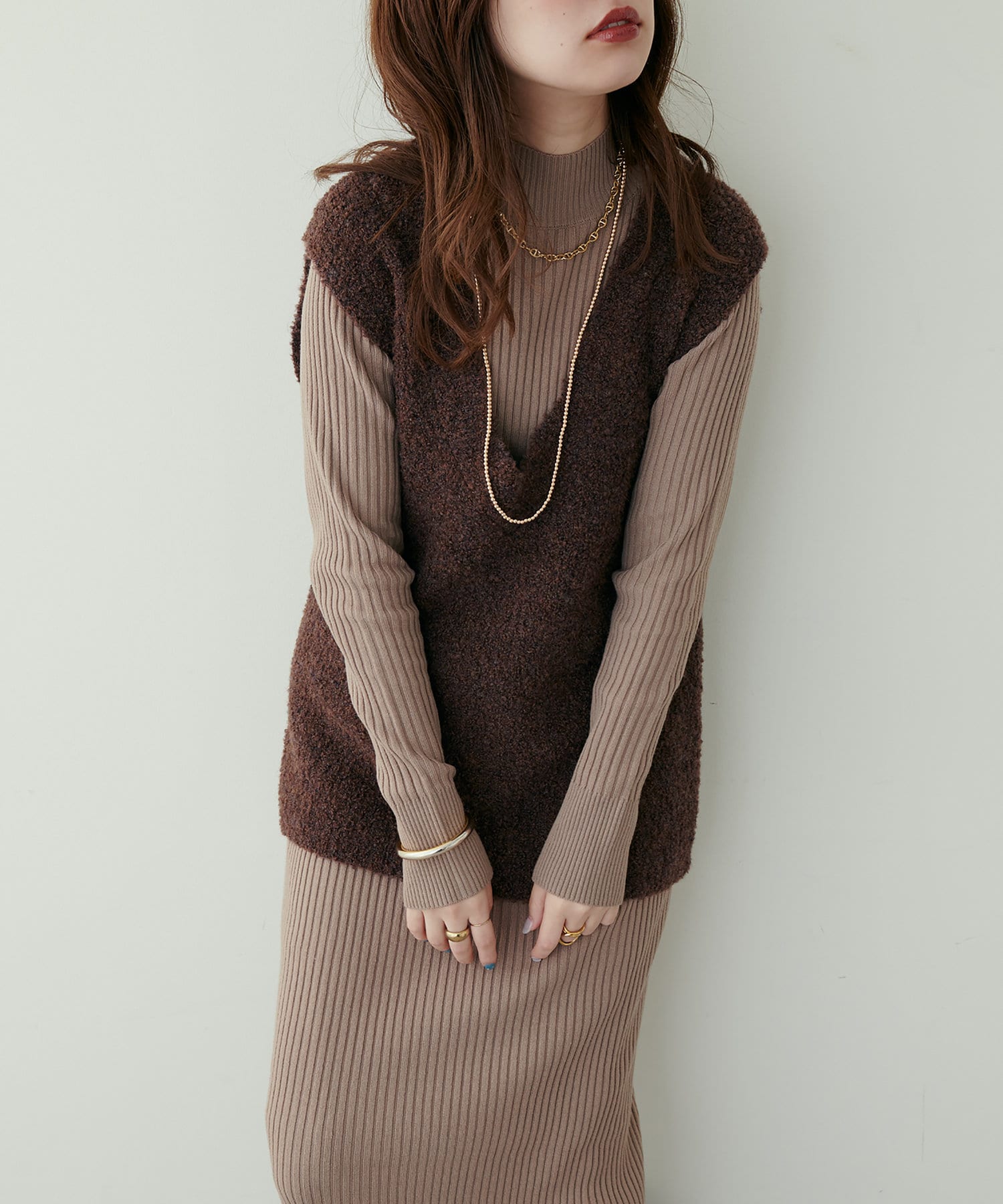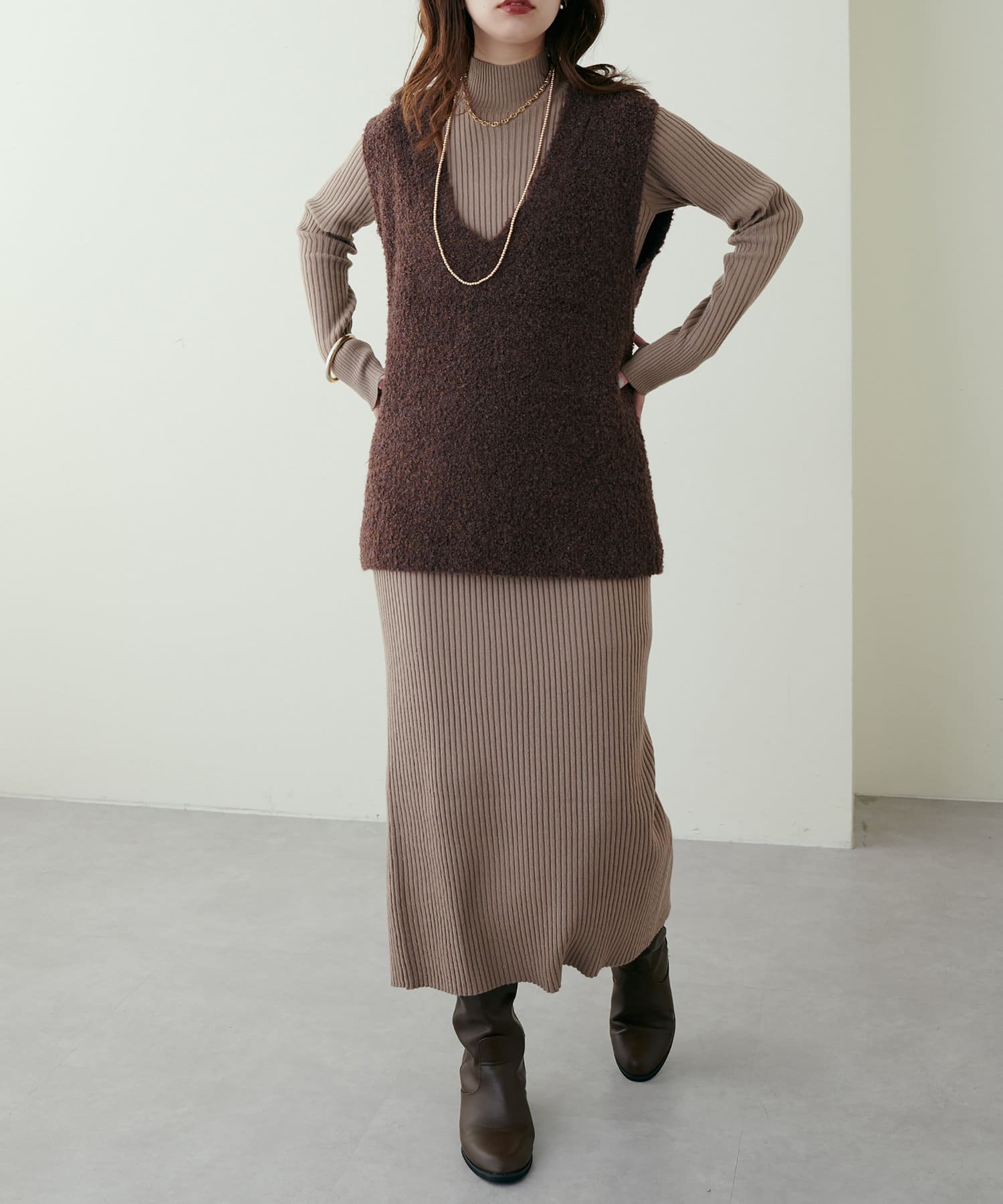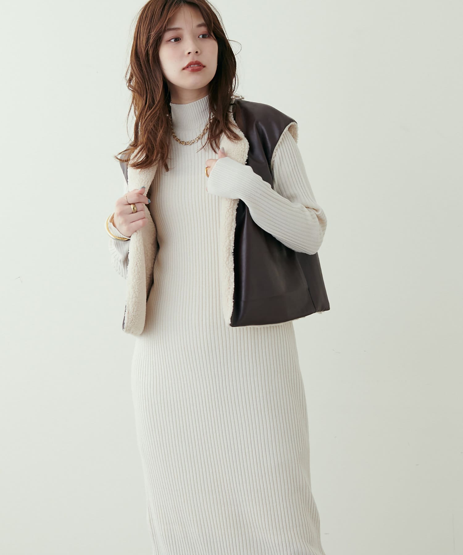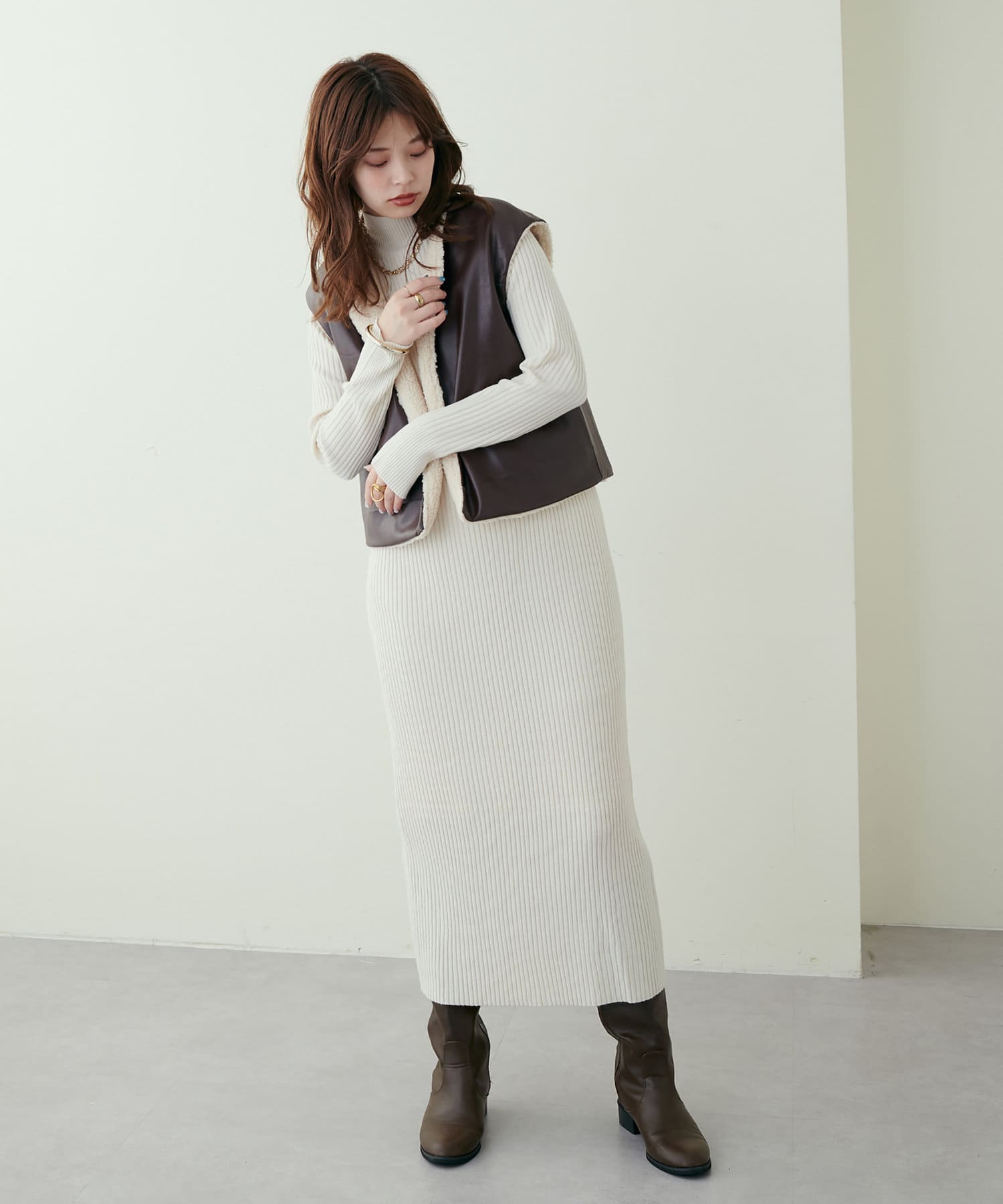 リブニットワンピにベスト(0322070360)を重ねたり、