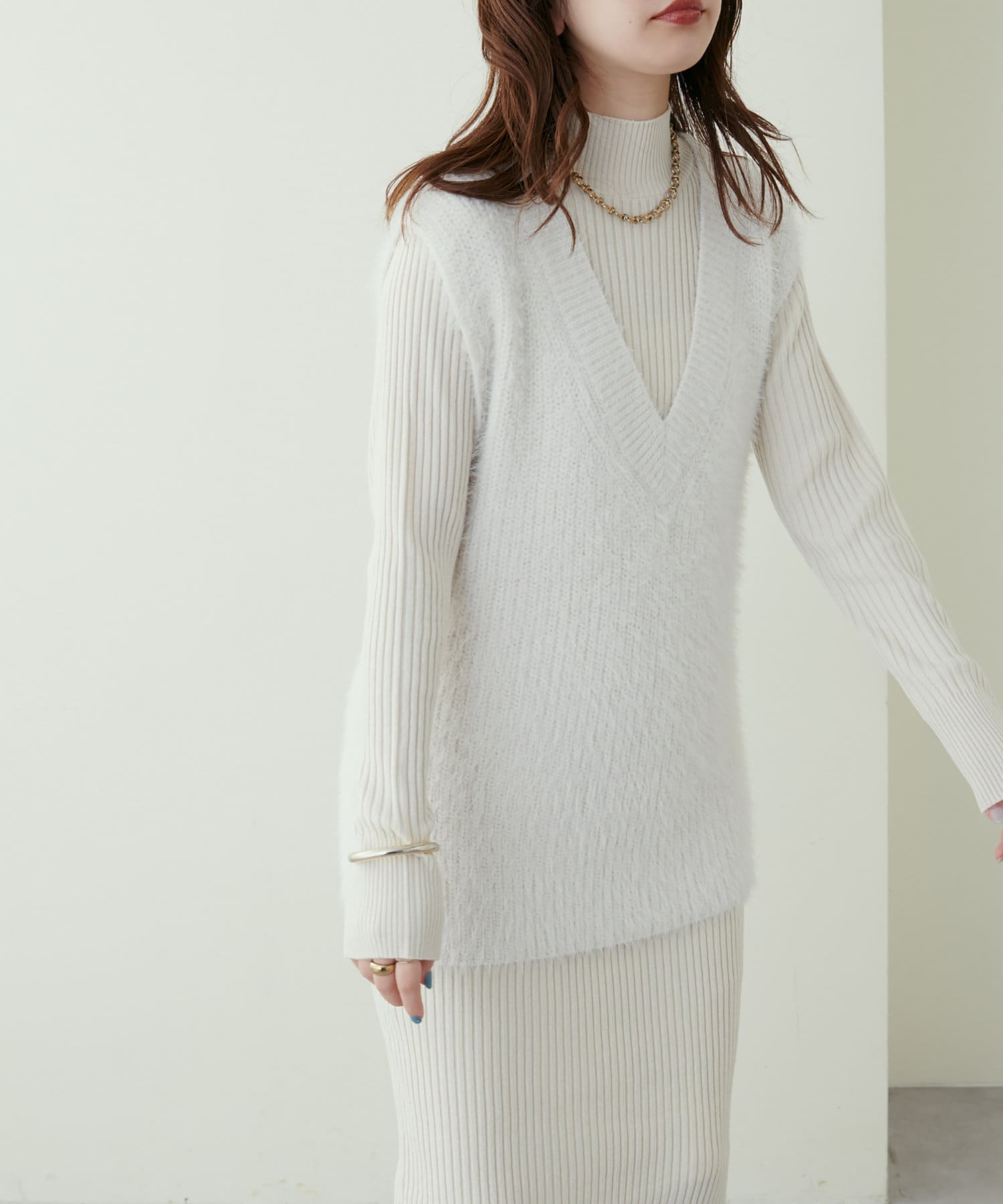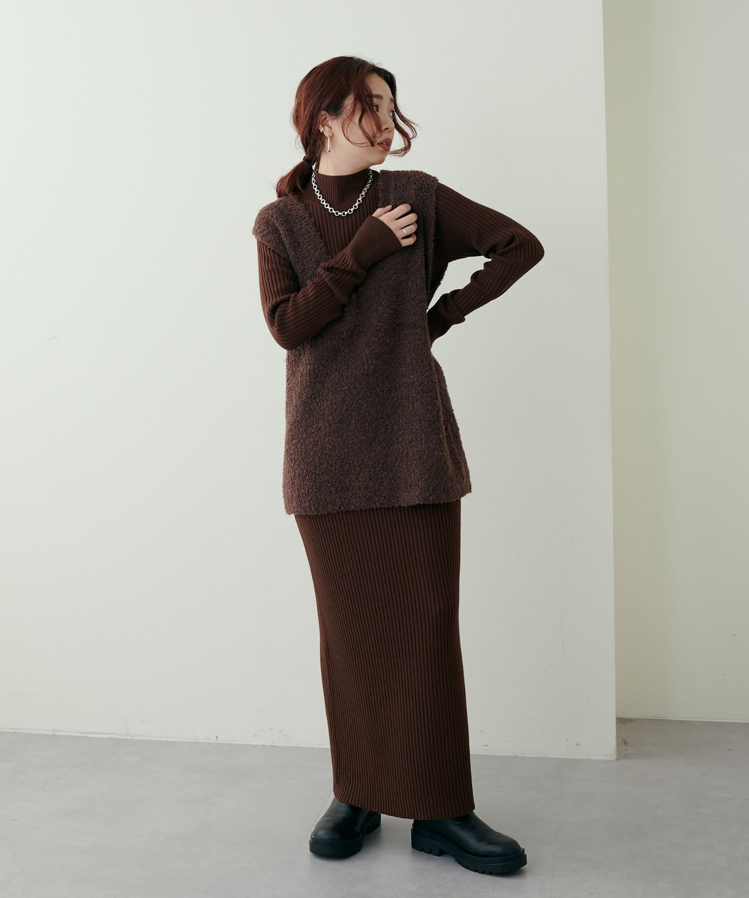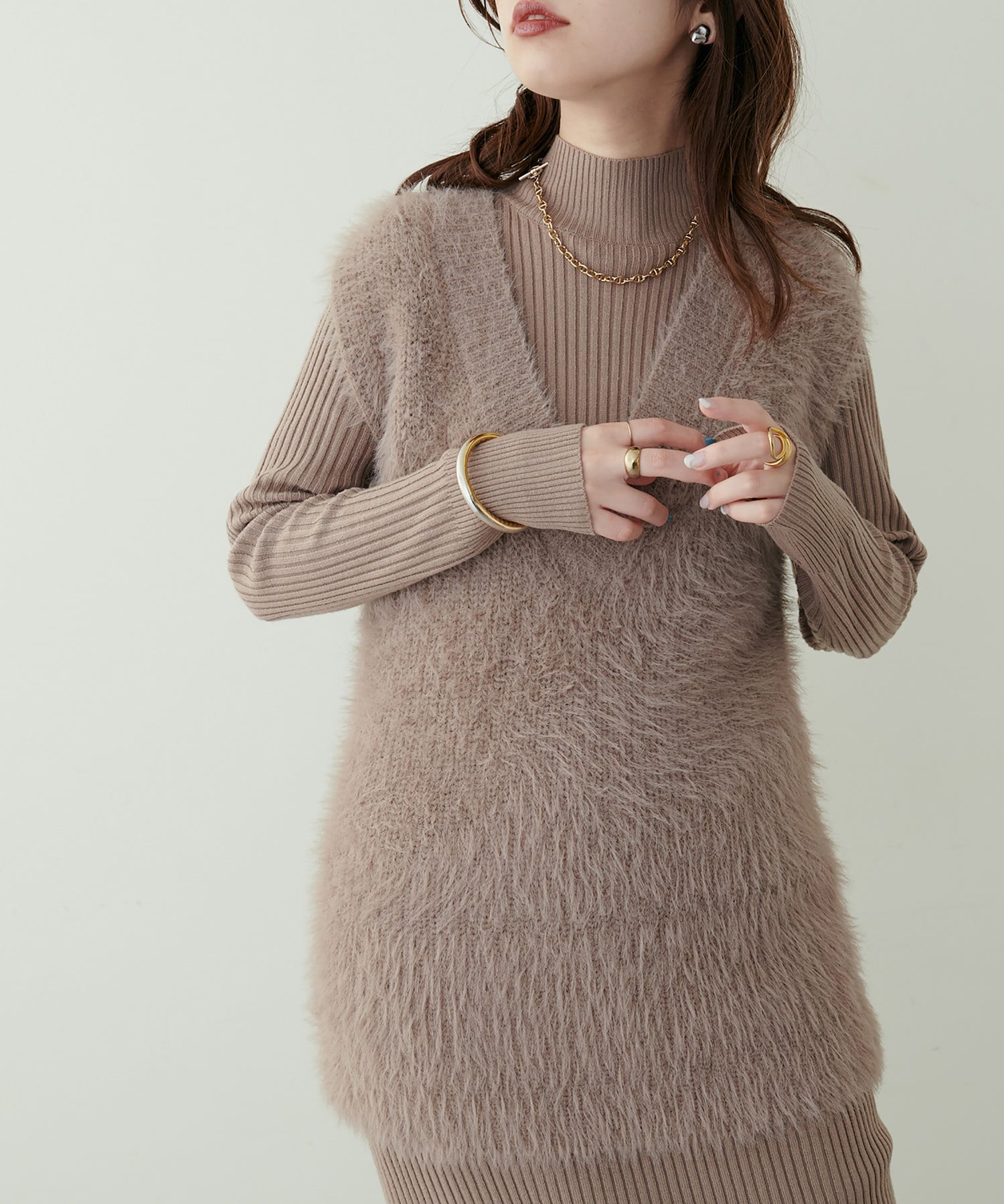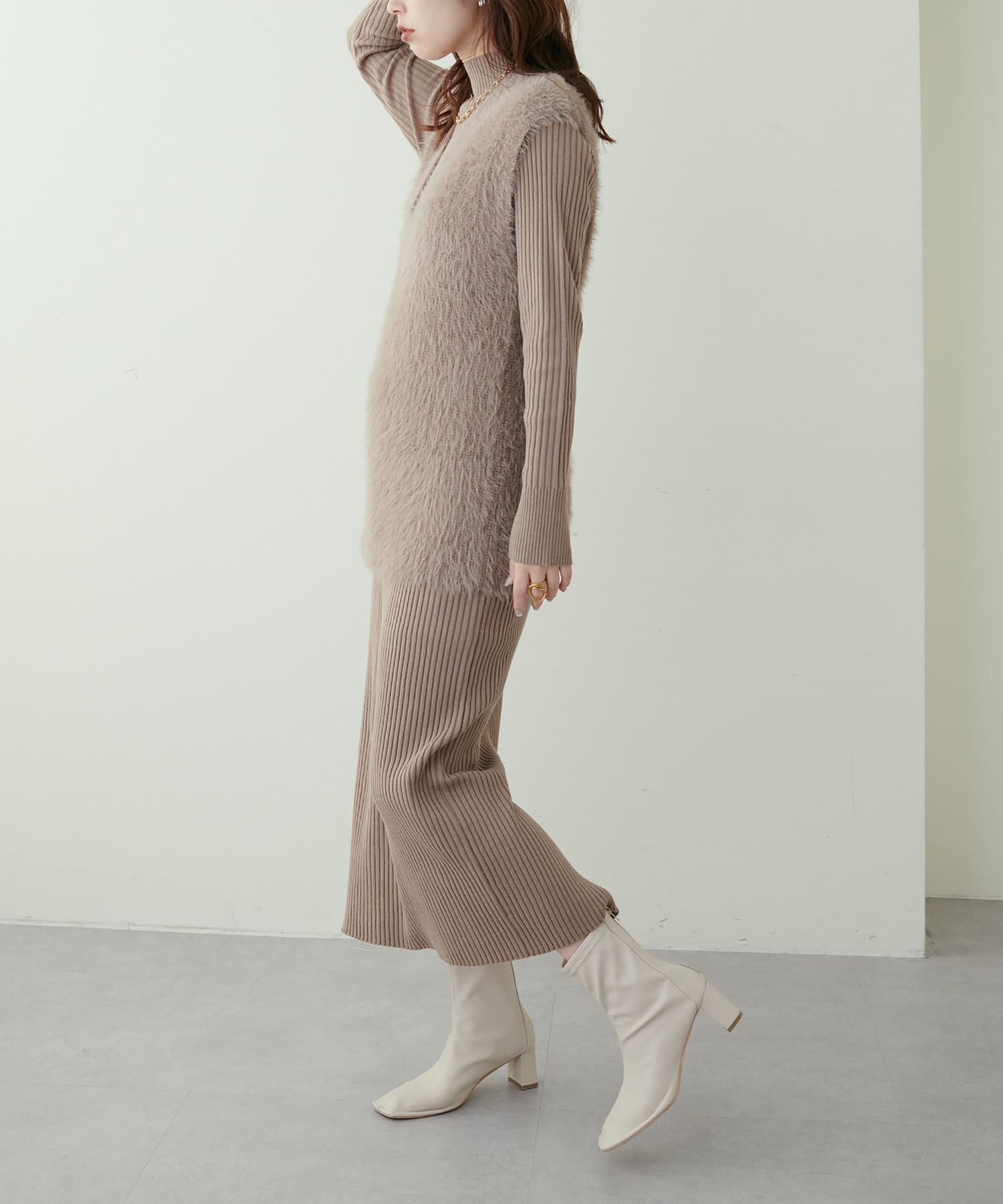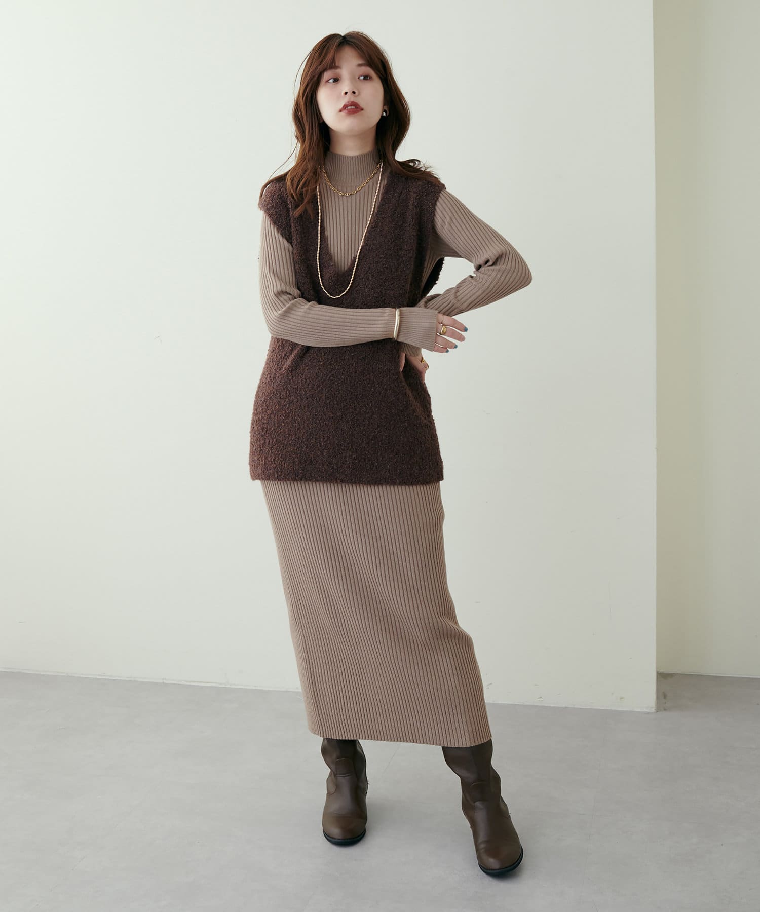 リブニットワンピにベスト(0322070360)を重ねたり、