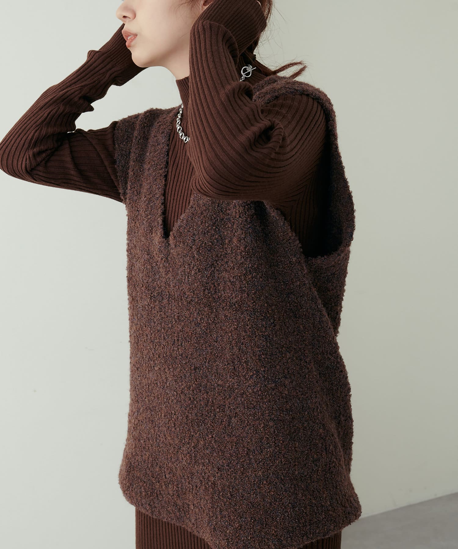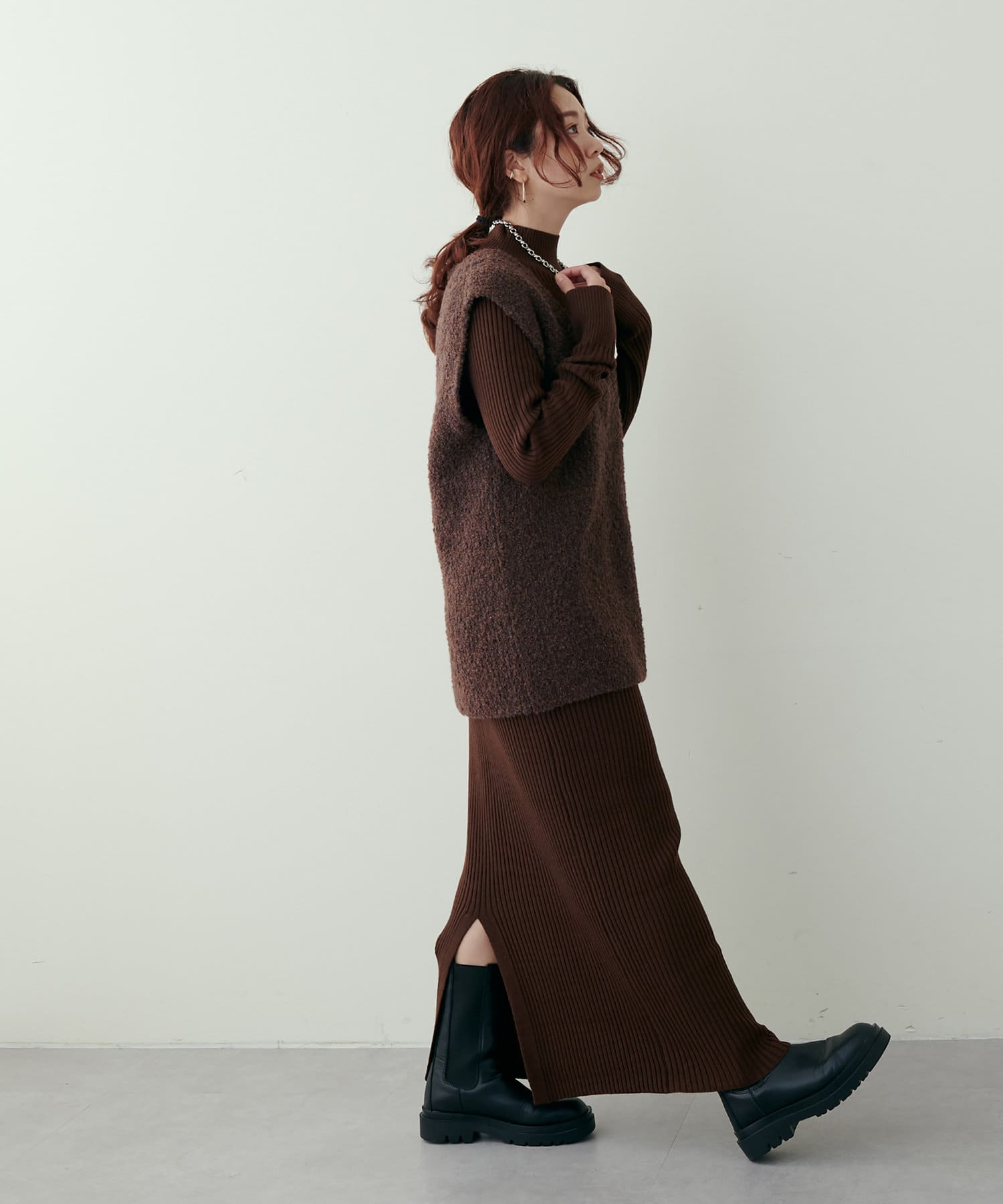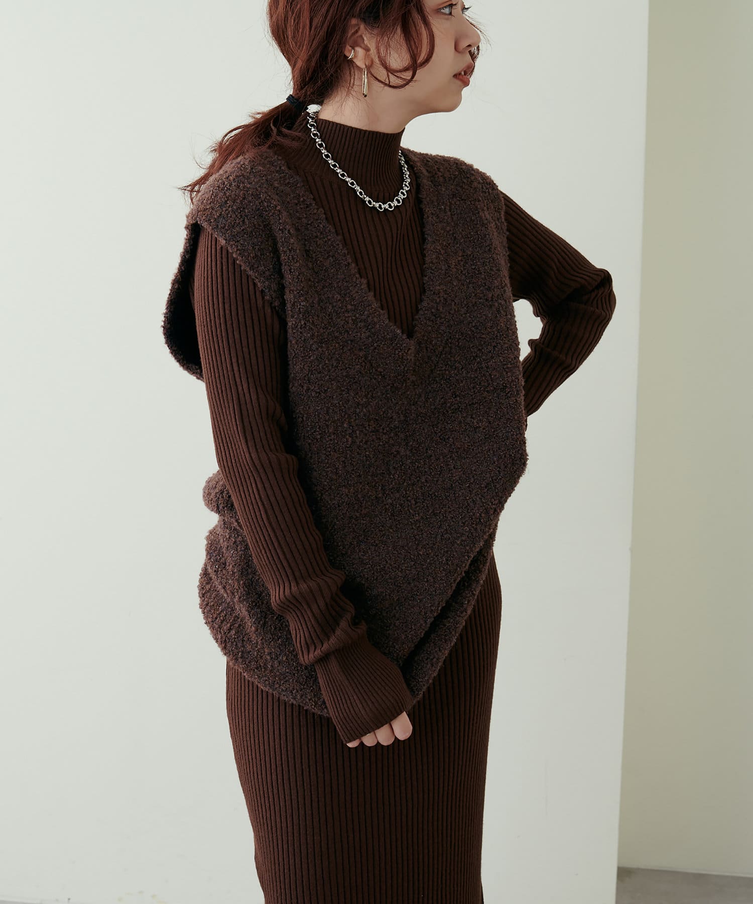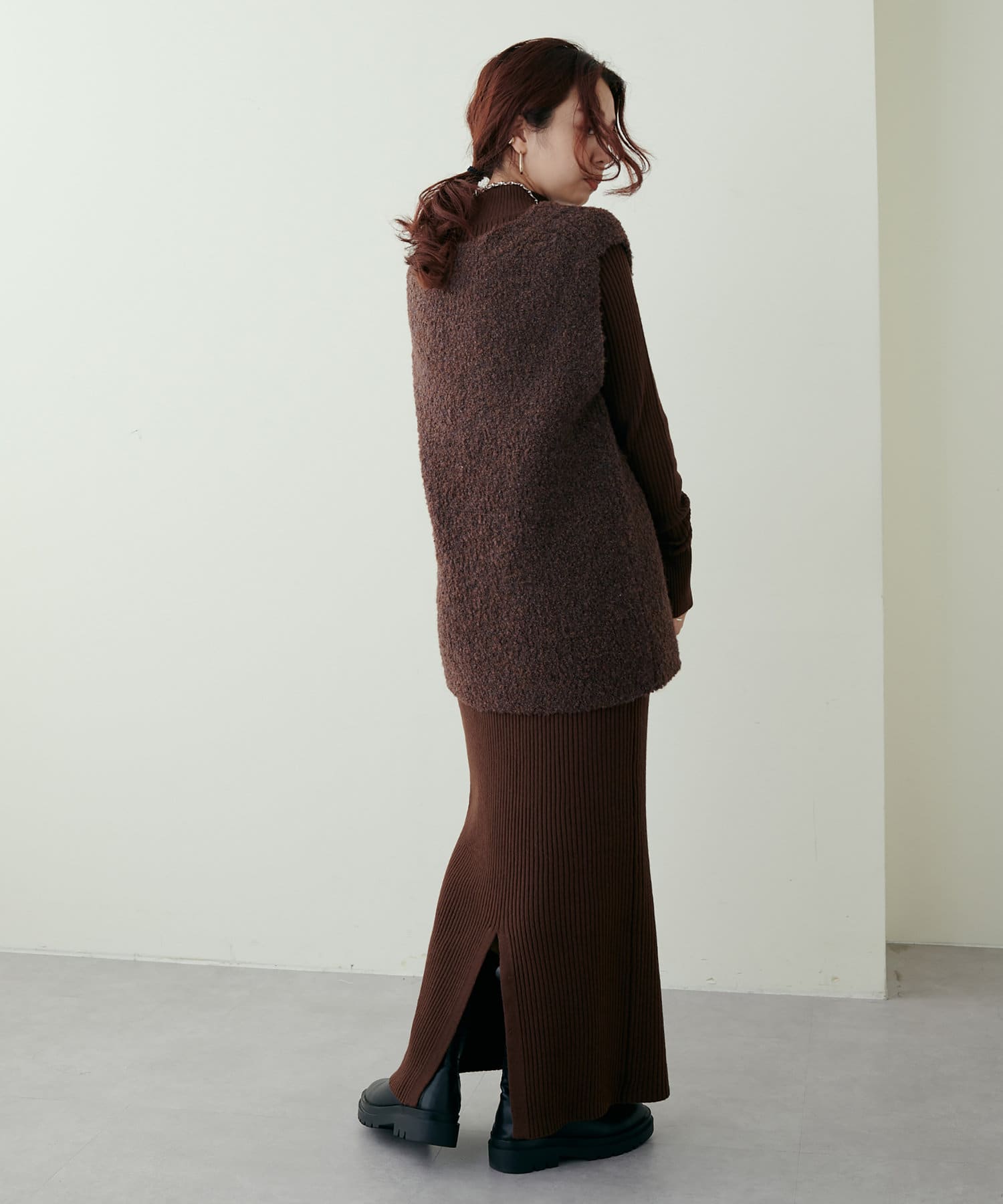 リブニットワンピにベスト(0322070360)を重ねたり、