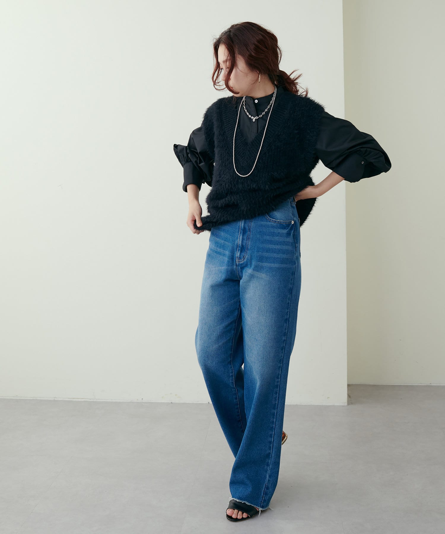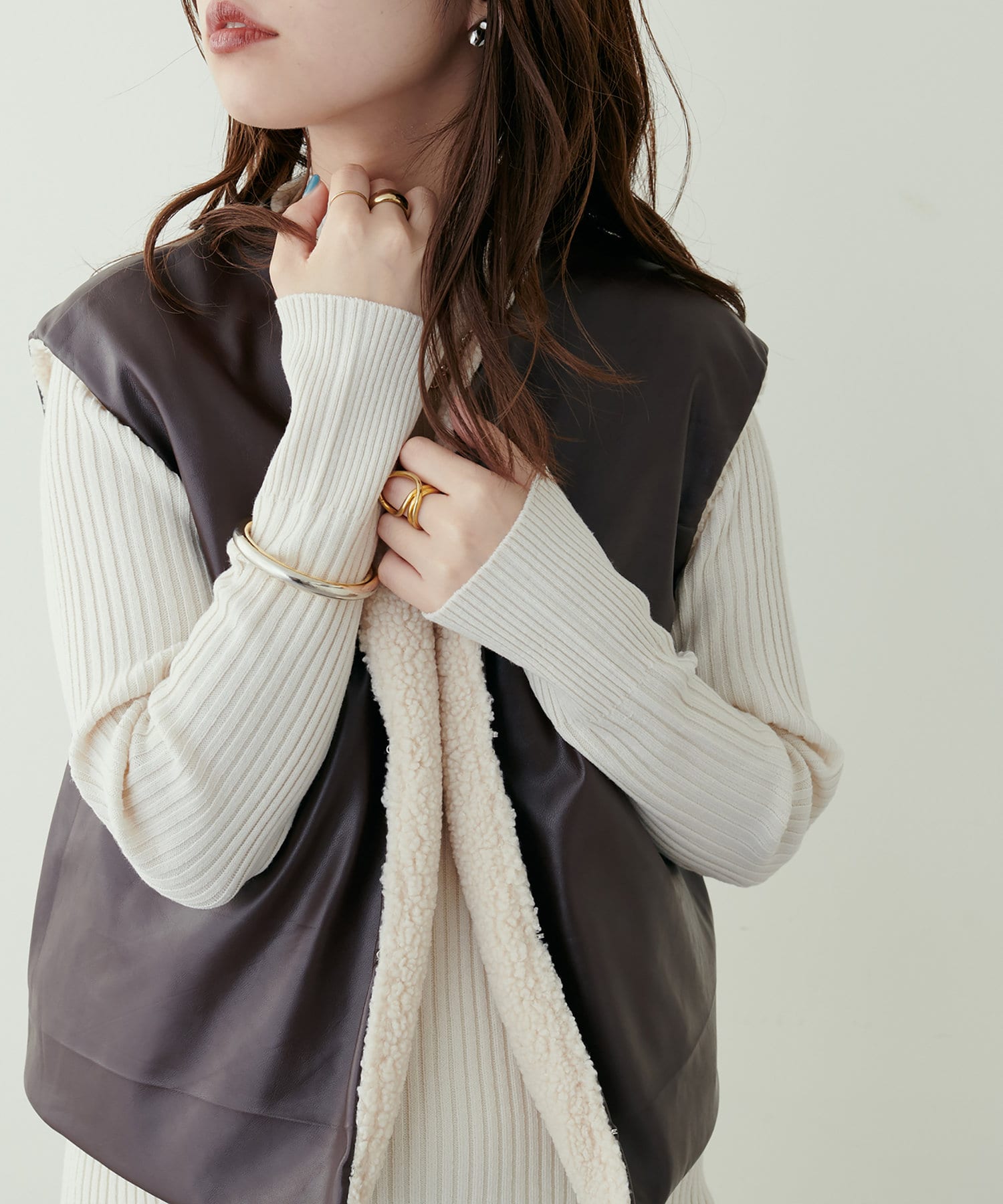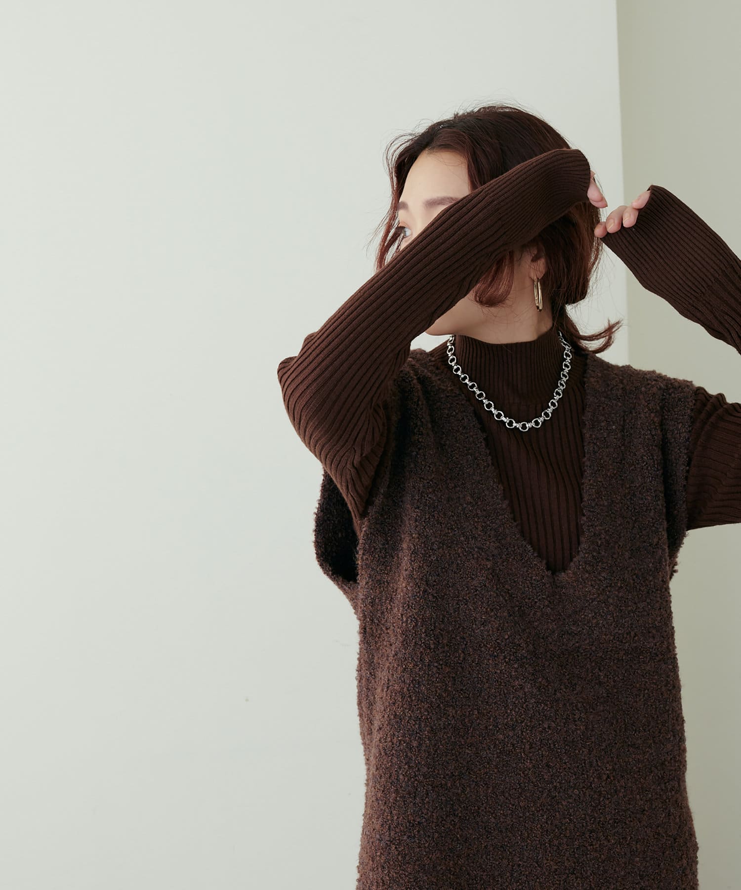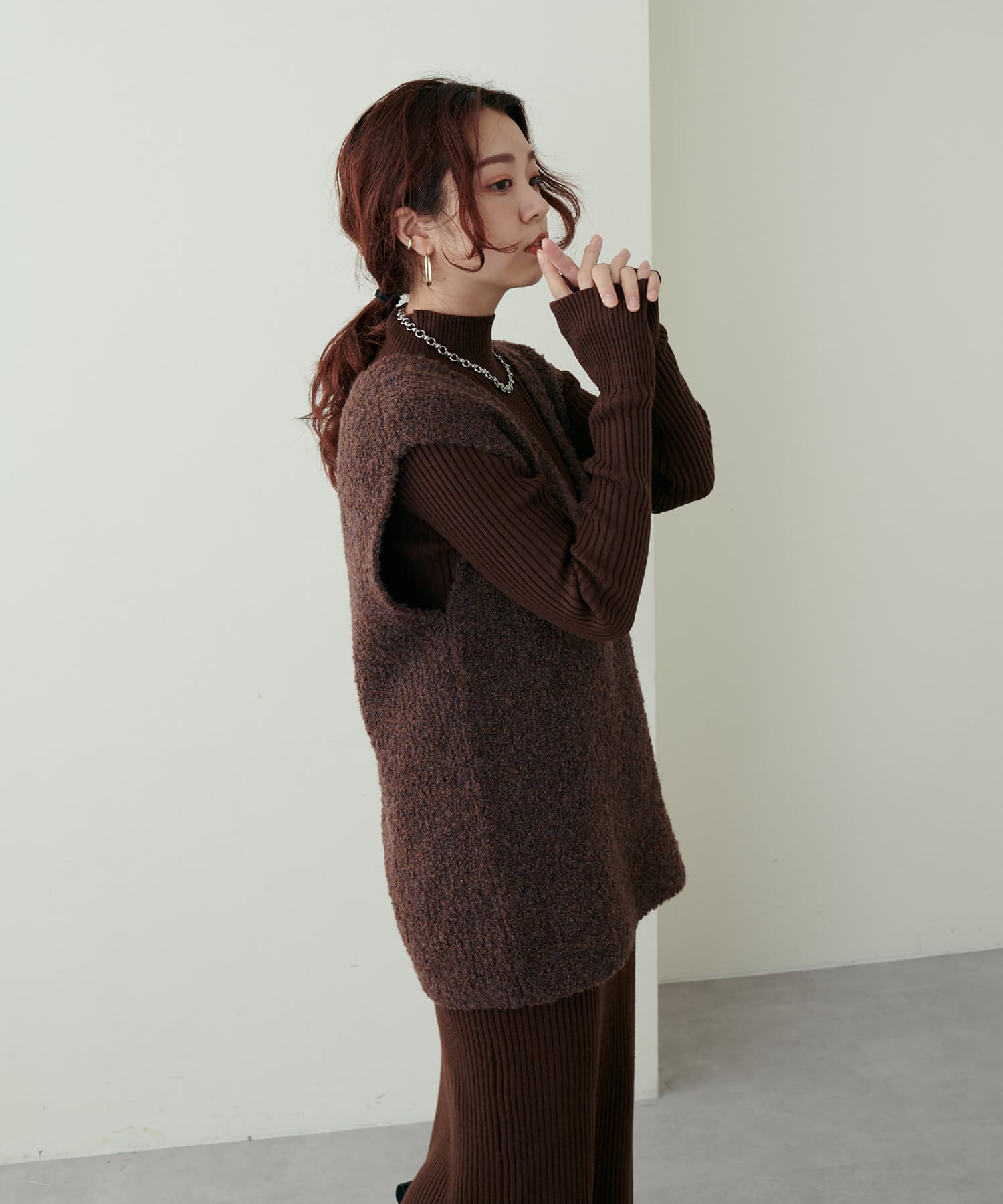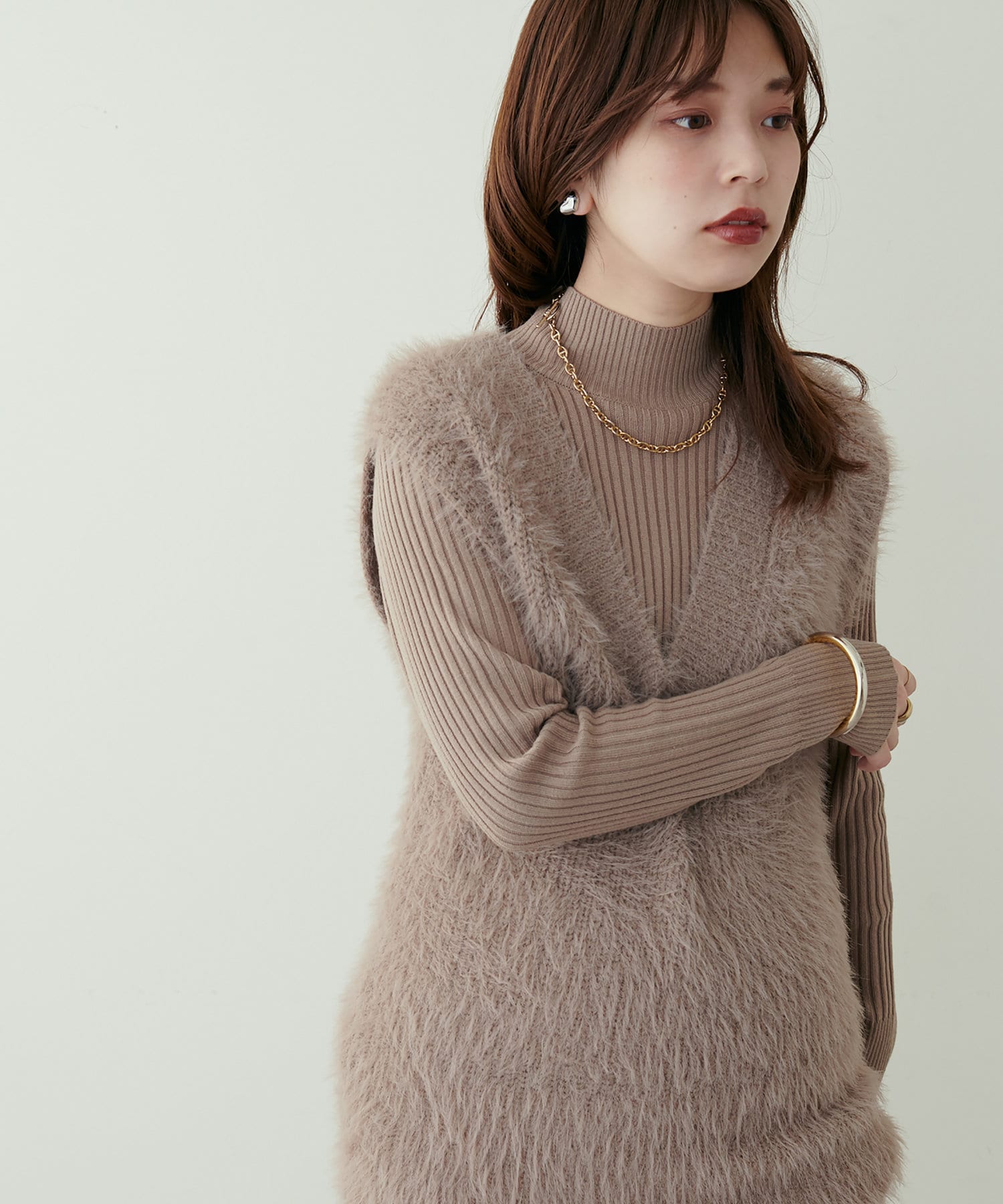 リブニットワンピにベスト(0322070360)を重ねたり、
