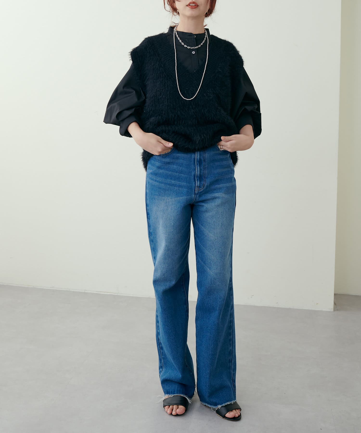 お尻が隠れる丈感と、広めのアームホールがお手持ちのアイテムともレイヤードしやすい1点です。