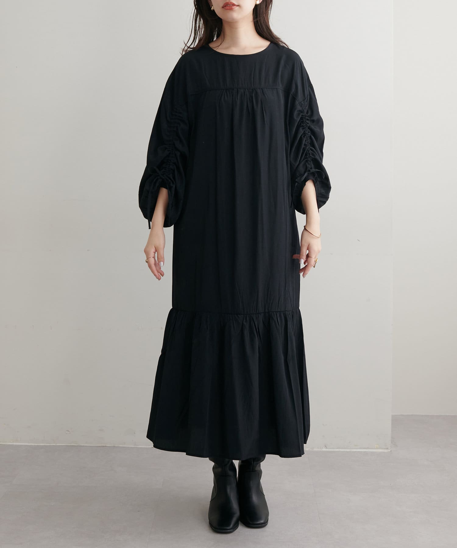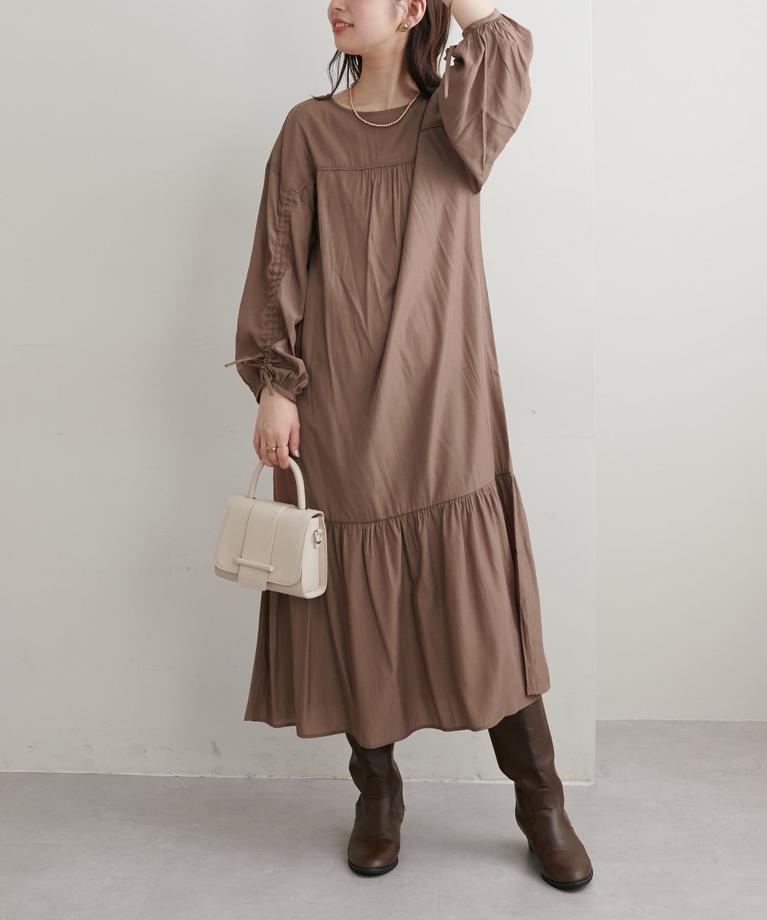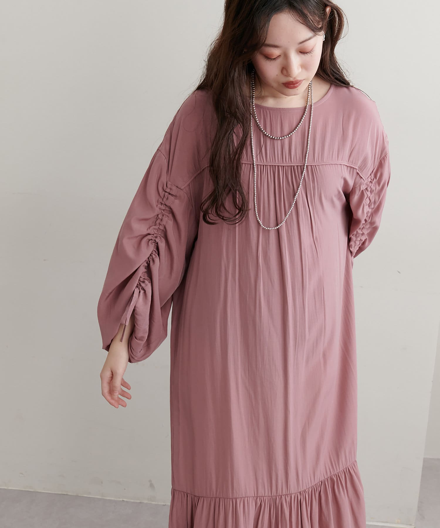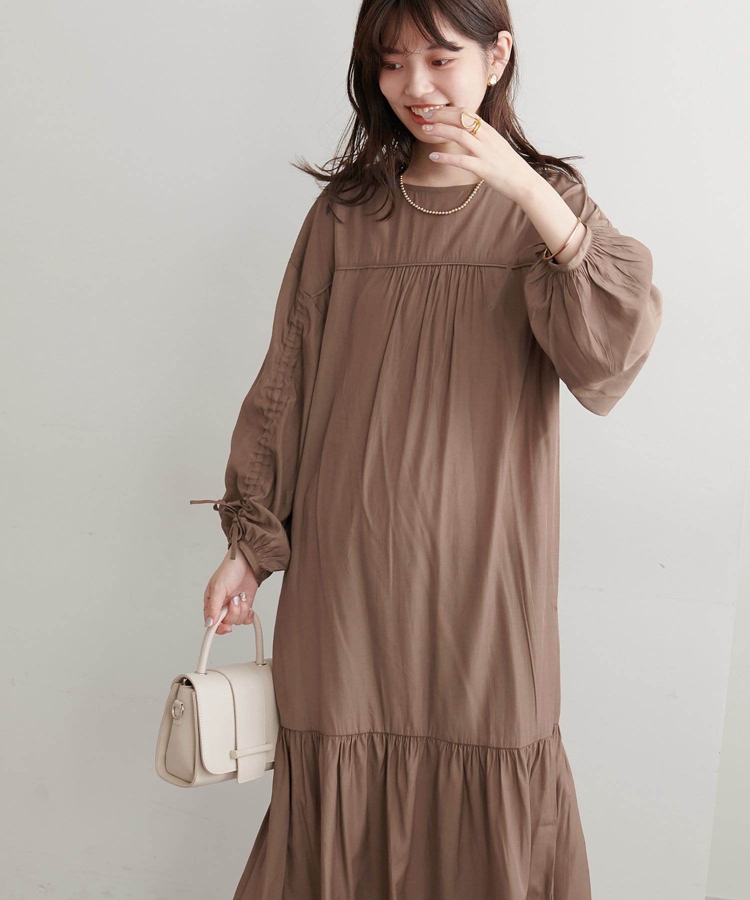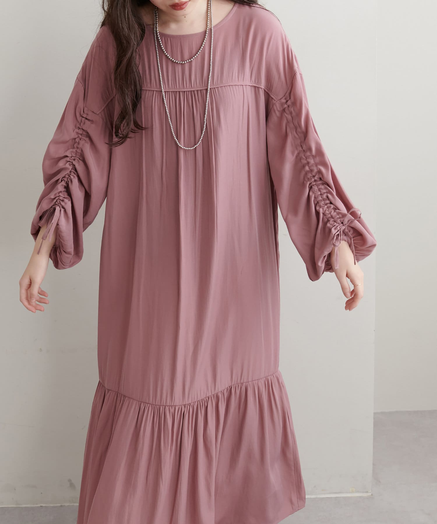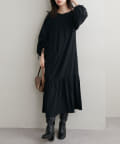 ゆったりした優しいシルエットでドロストスリーブが目を惹くワンピース