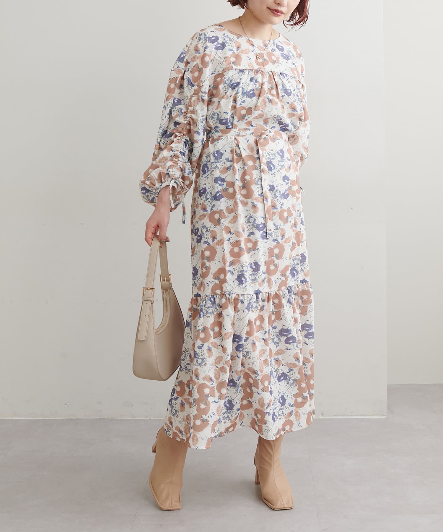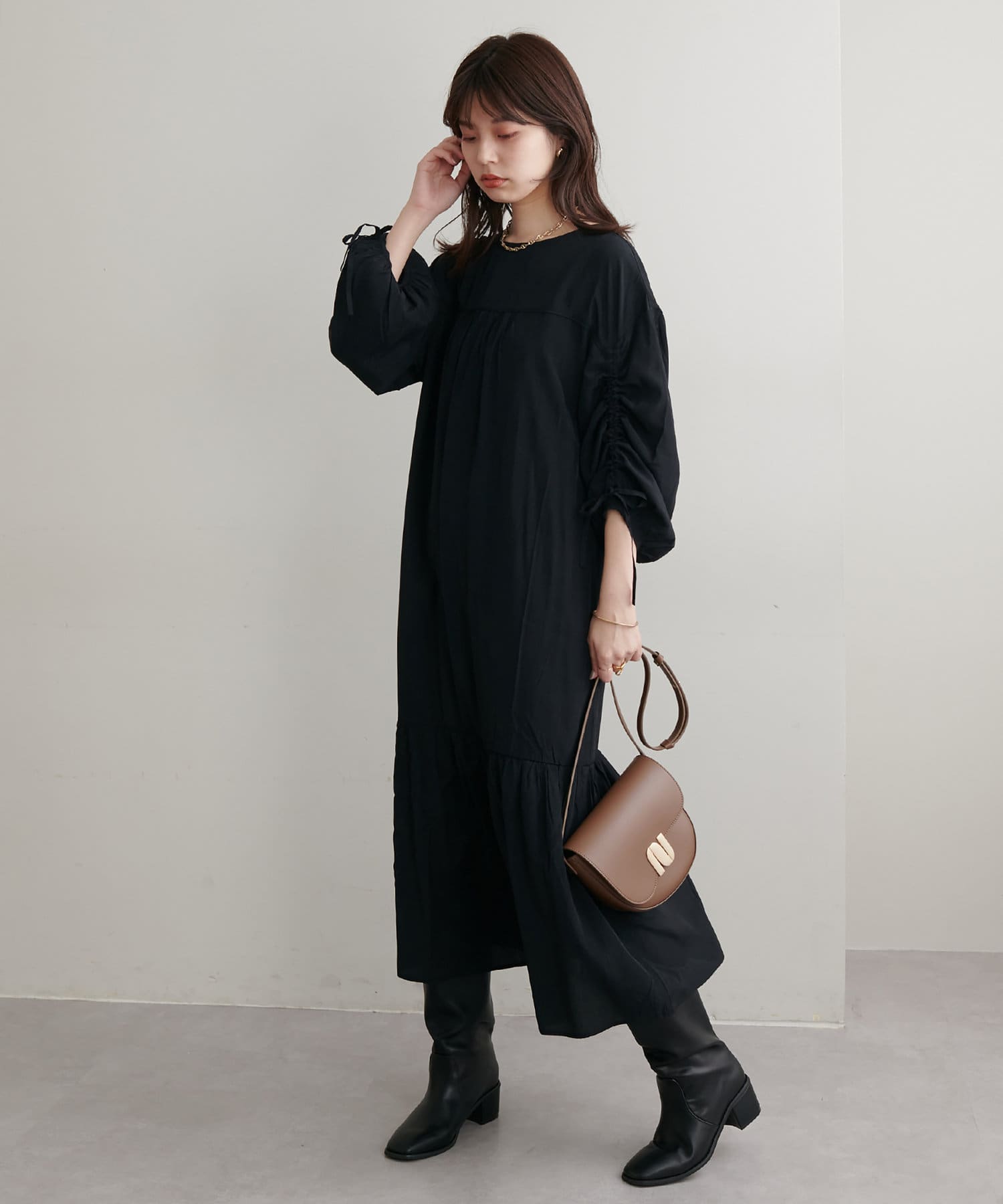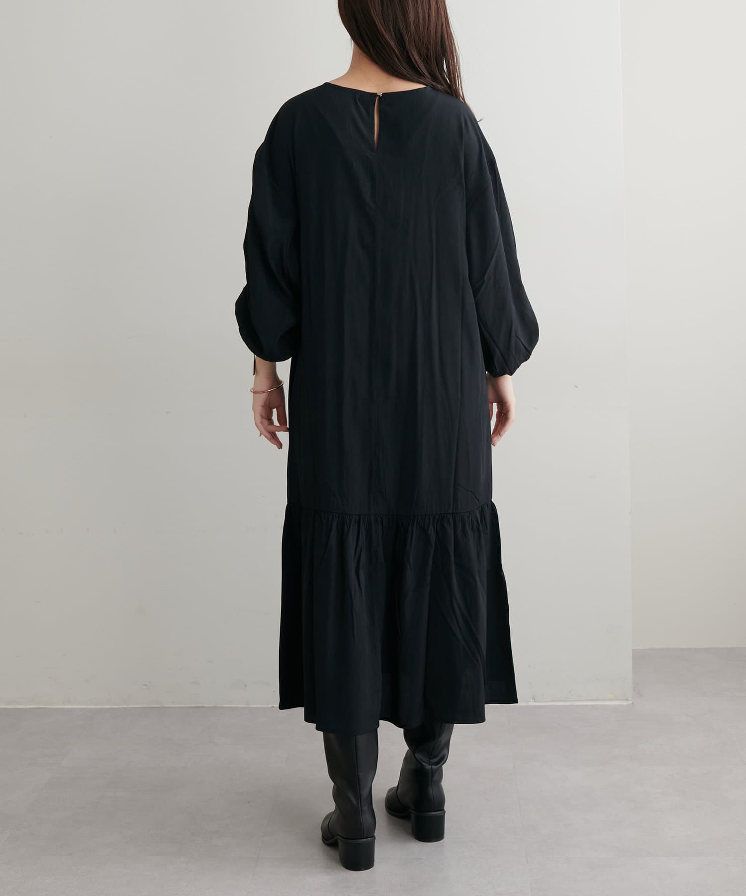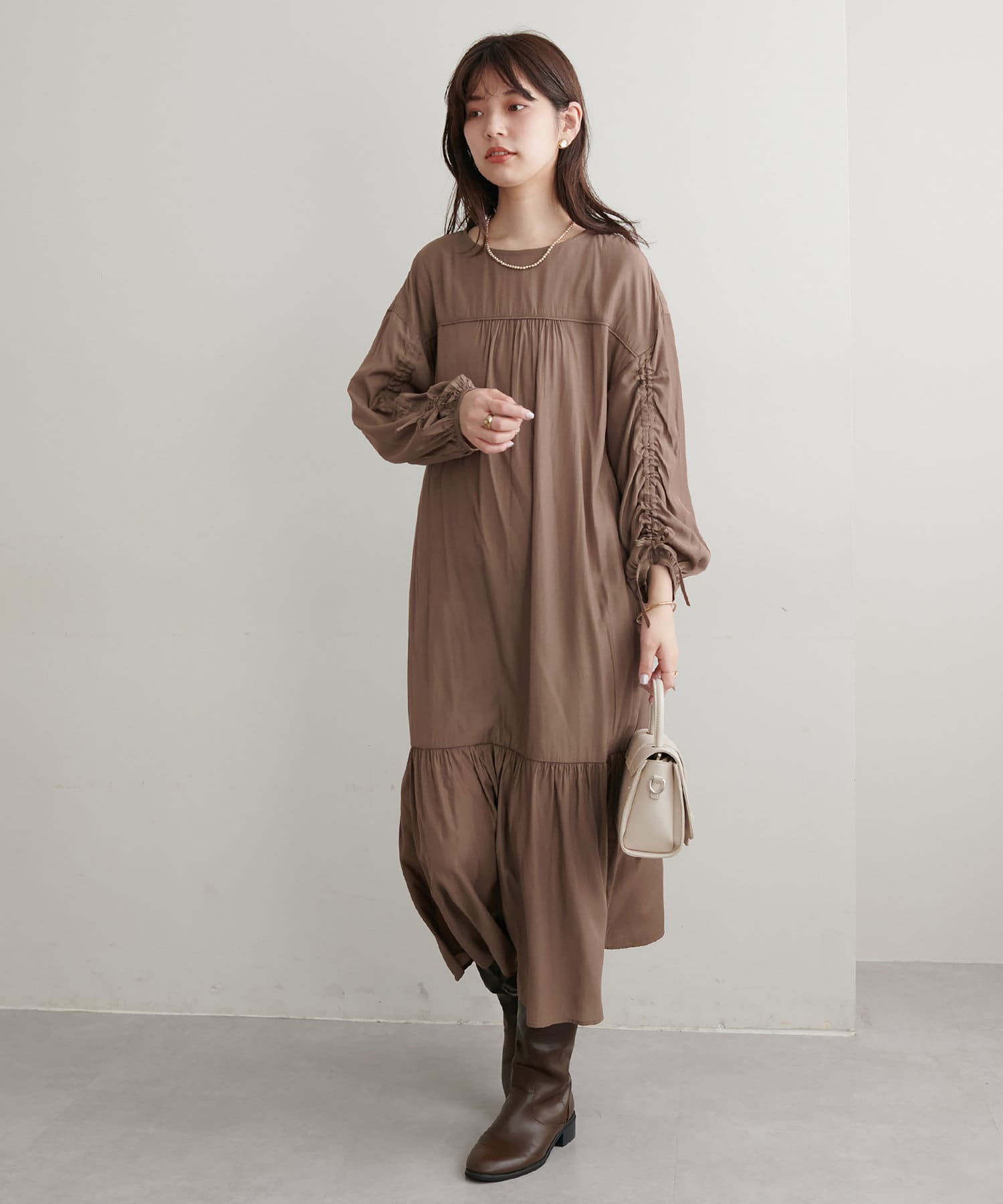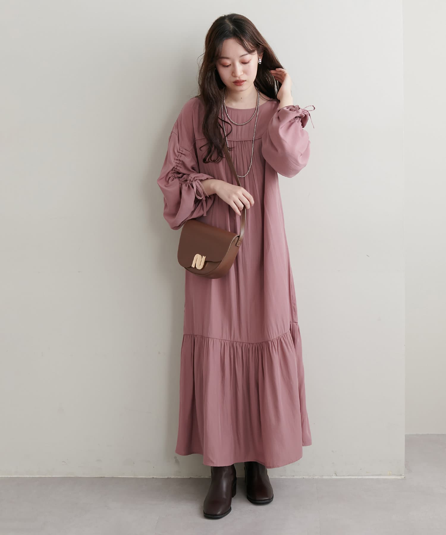 ゆったりした優しいシルエットでドロストスリーブが目を惹くワンピース