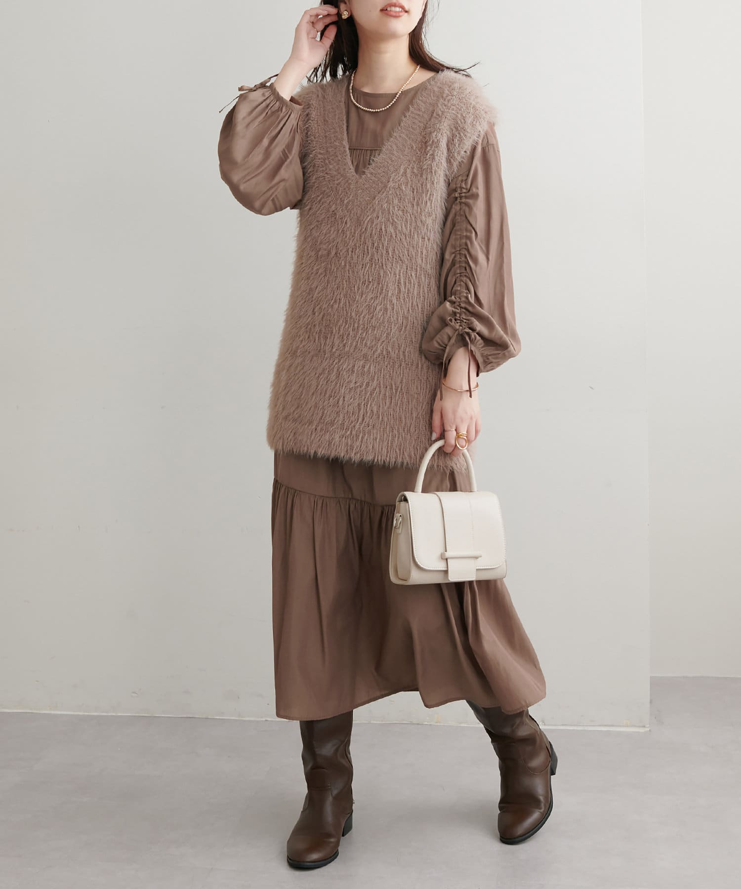 ファーなどボリュームのあるベストを合わせて頂きますとトレンドライクコーデに仕上がります。