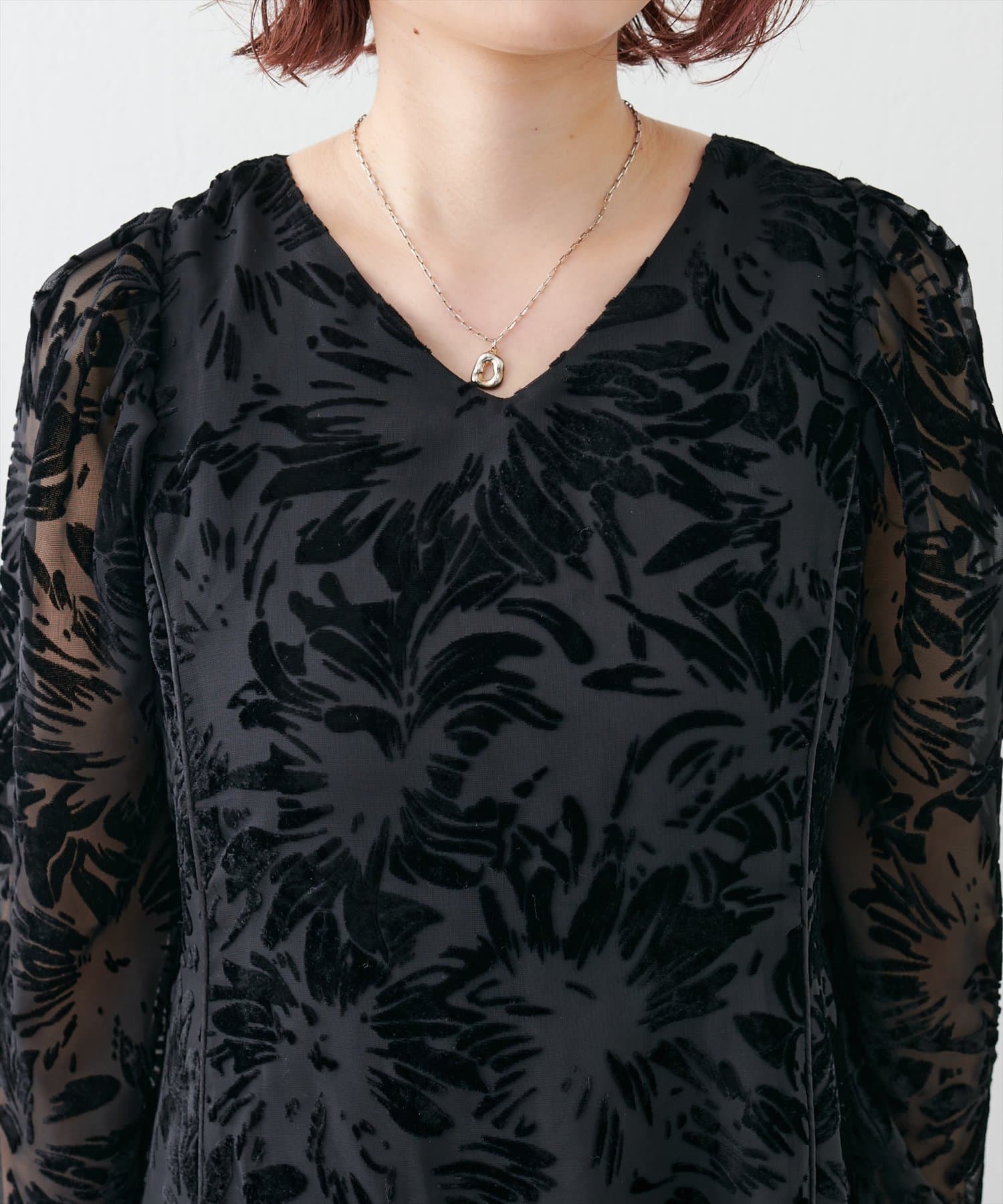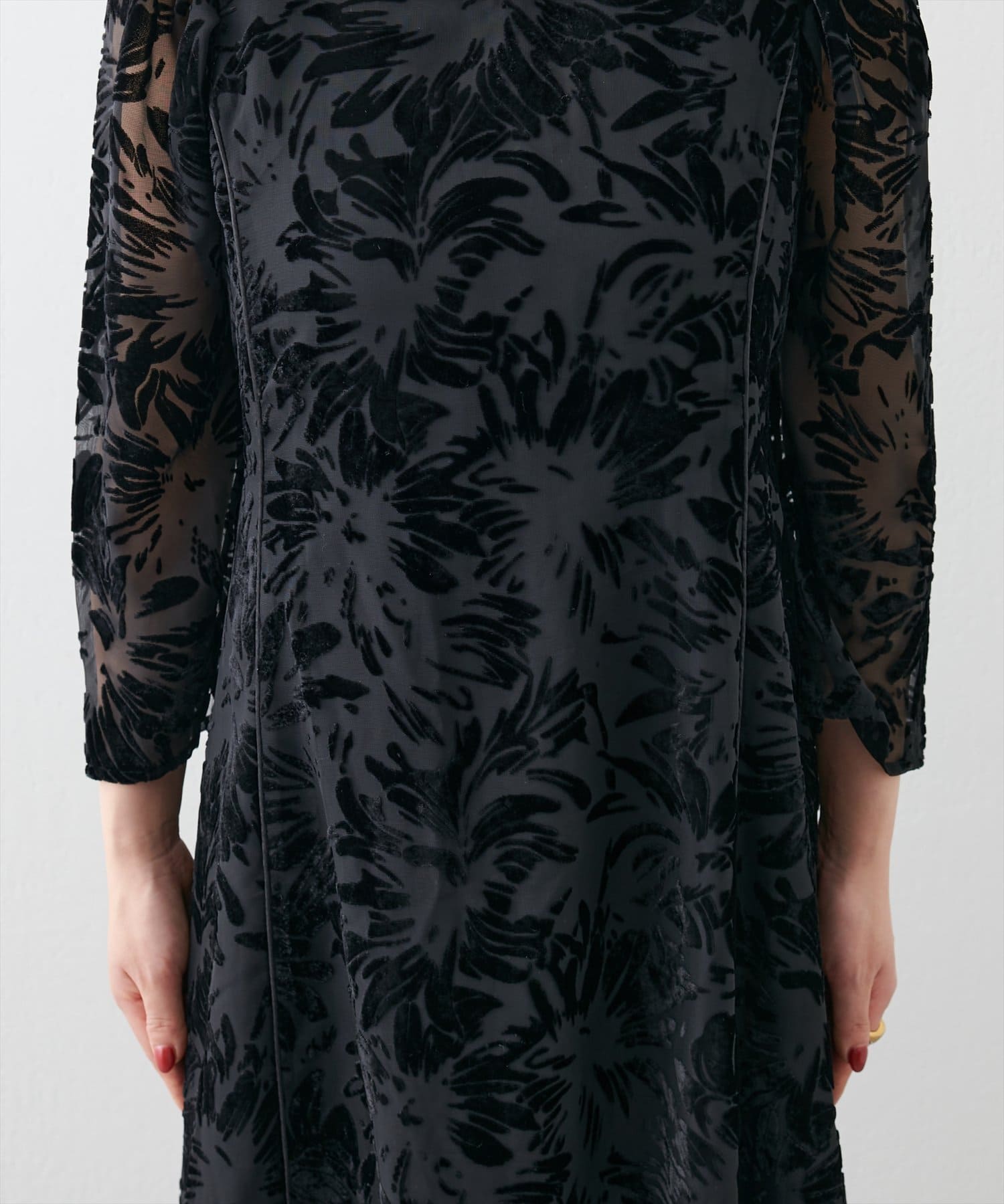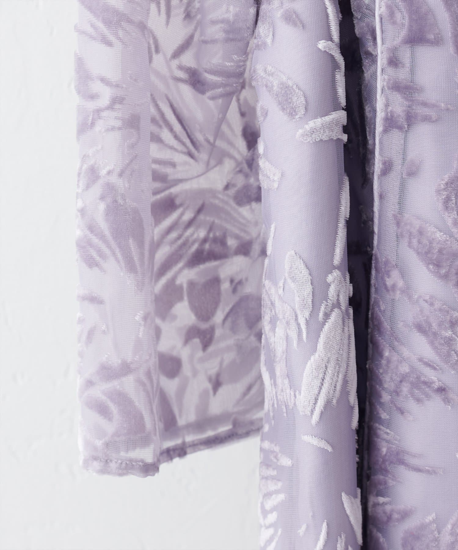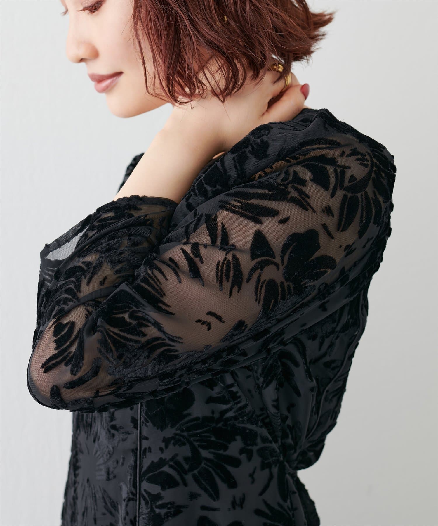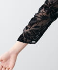 ベロアの花柄が重厚感ありつつも透け感で重くなりすぎない印象に。