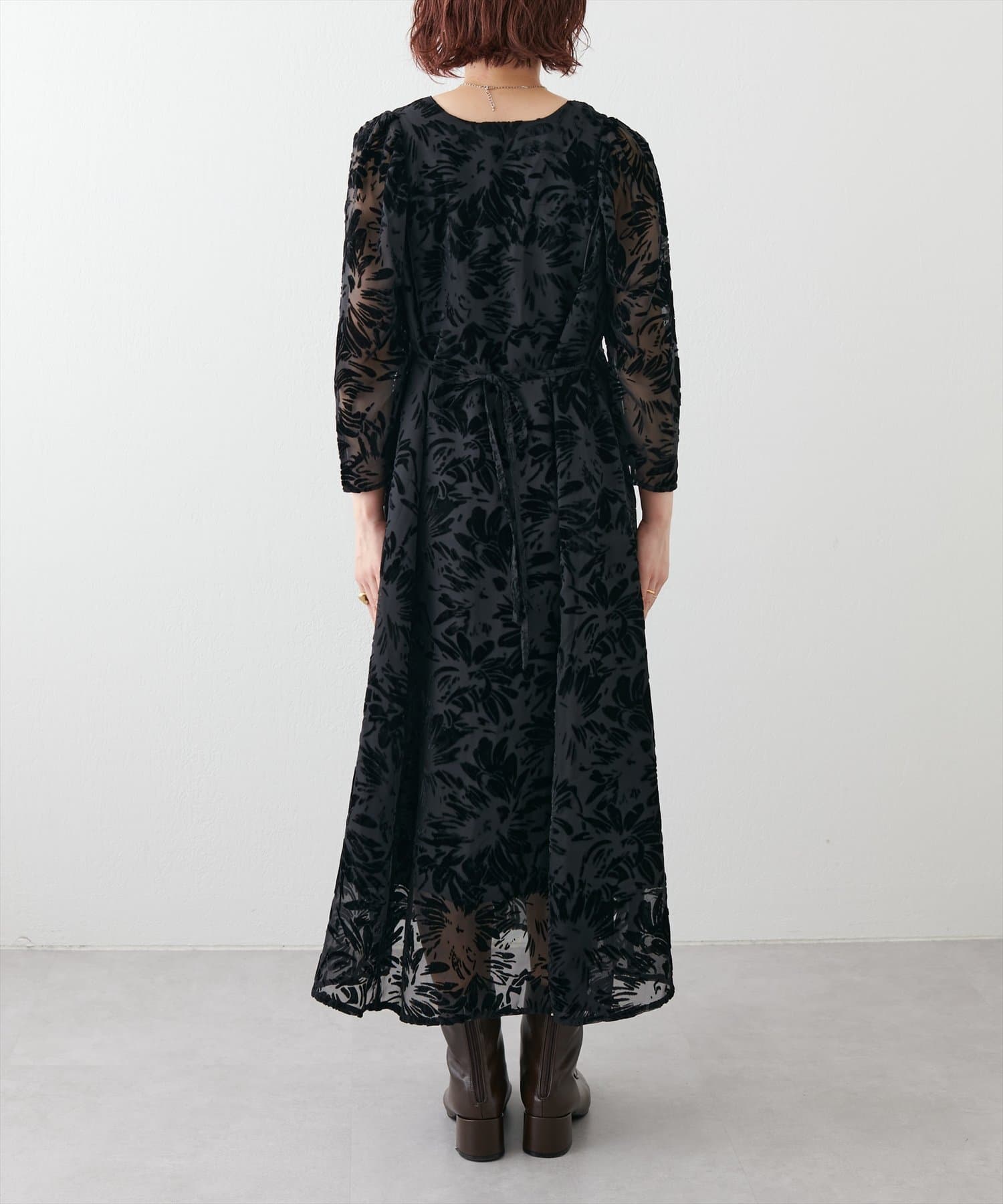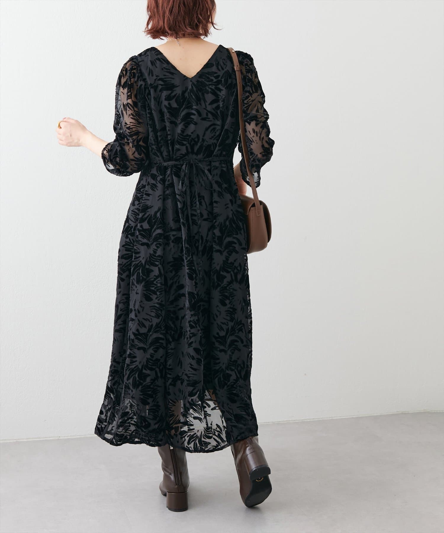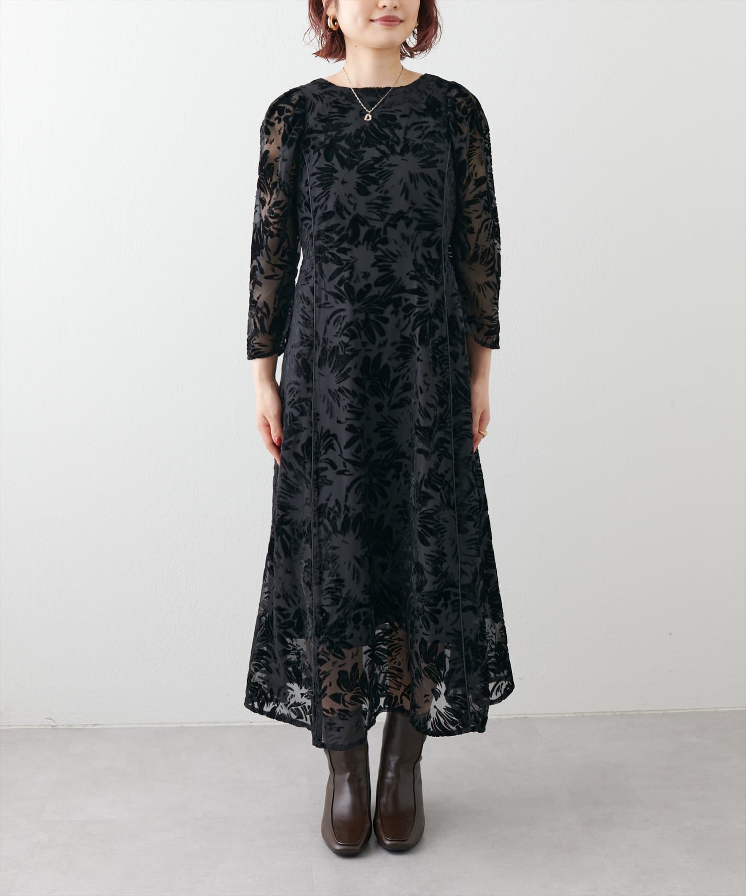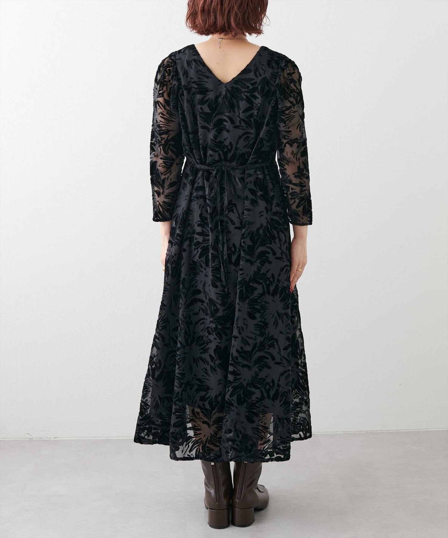 ベロアの花柄が重厚感ありつつも透け感で重くなりすぎない印象に。