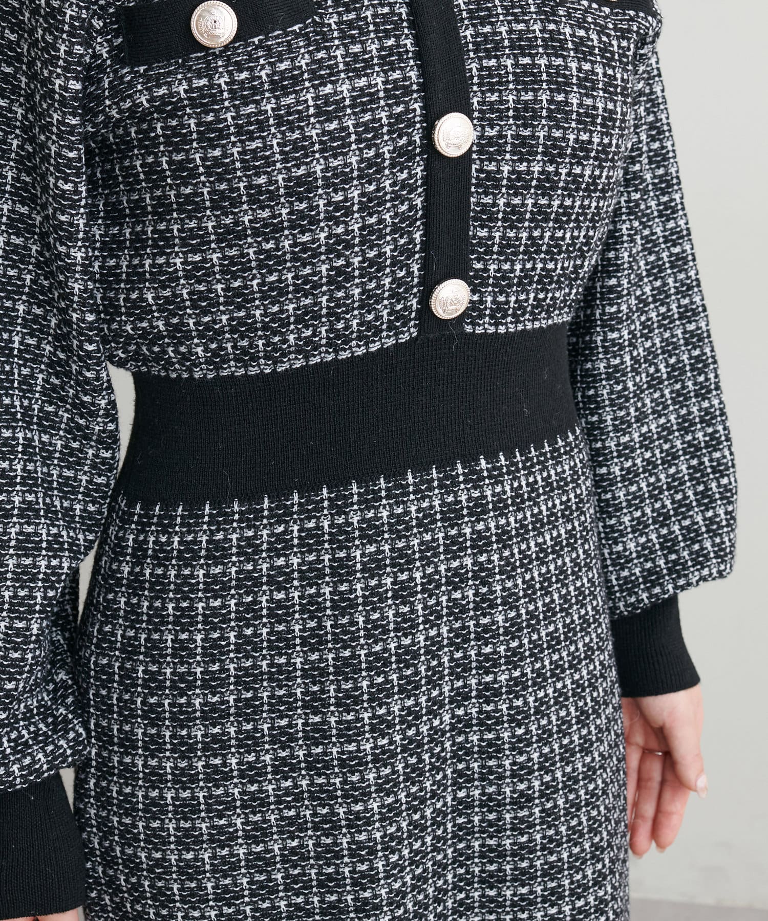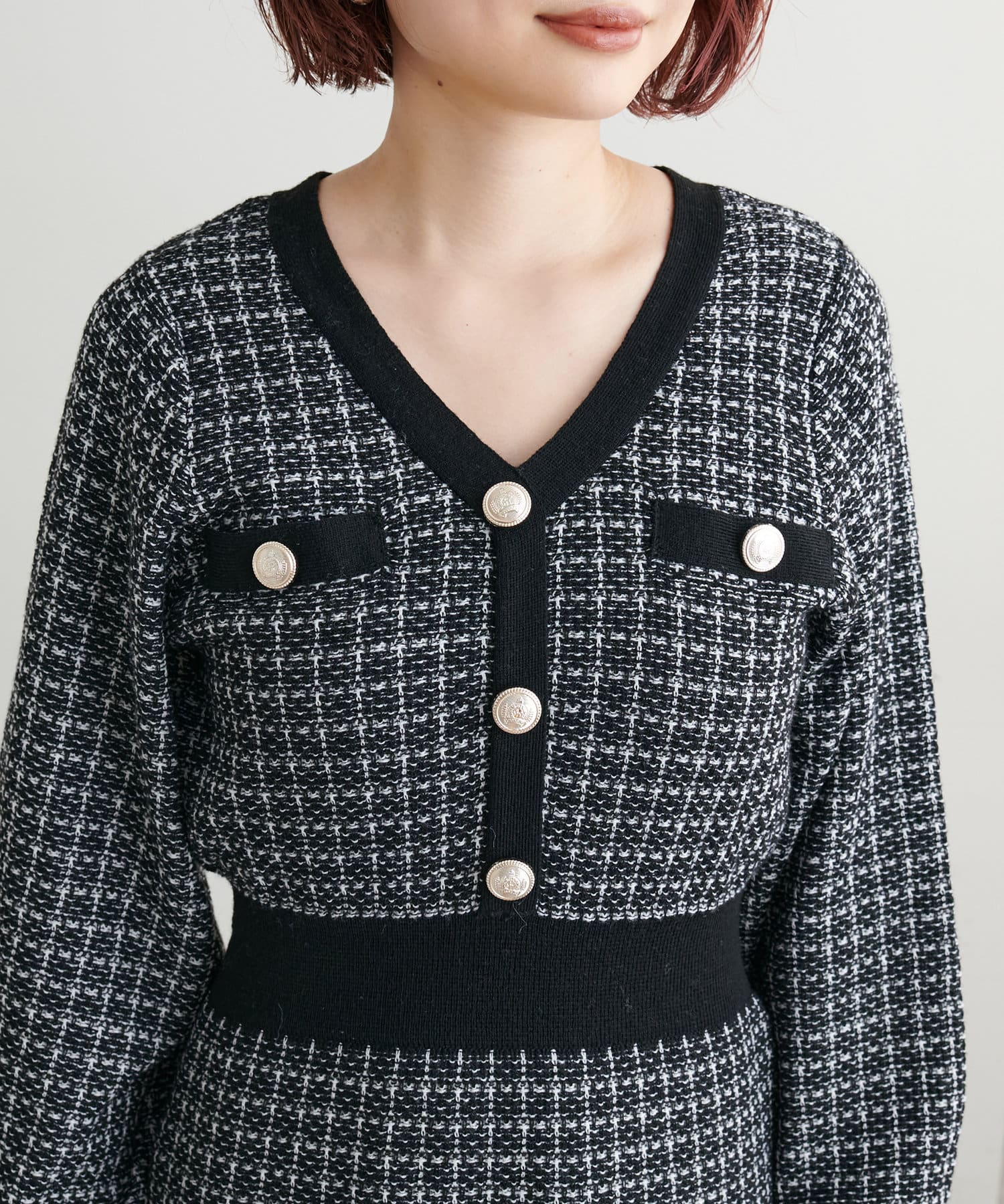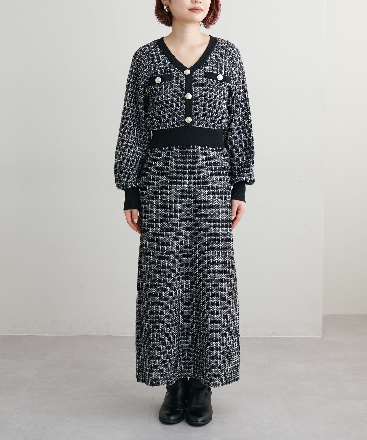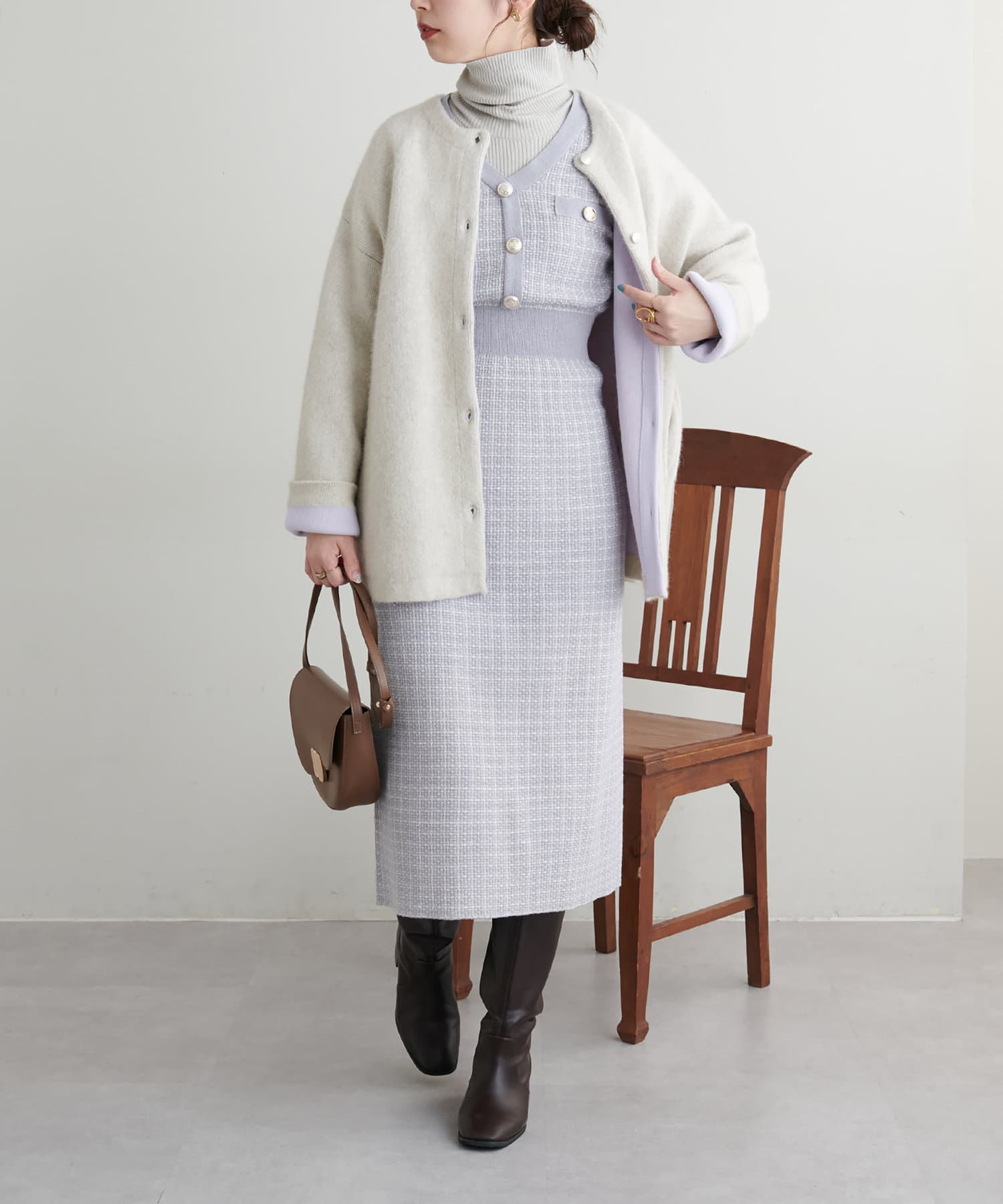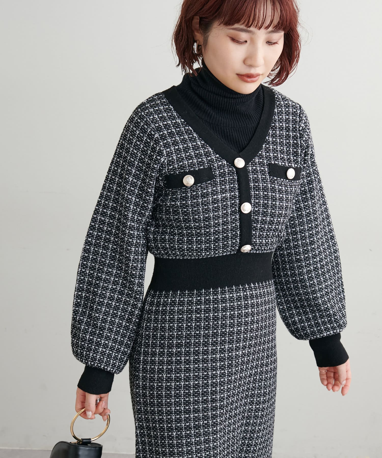 ニットワンピースではあるものの、全体的にツイードデザインとなっている為、ボディラインはやや拾いにくいです。