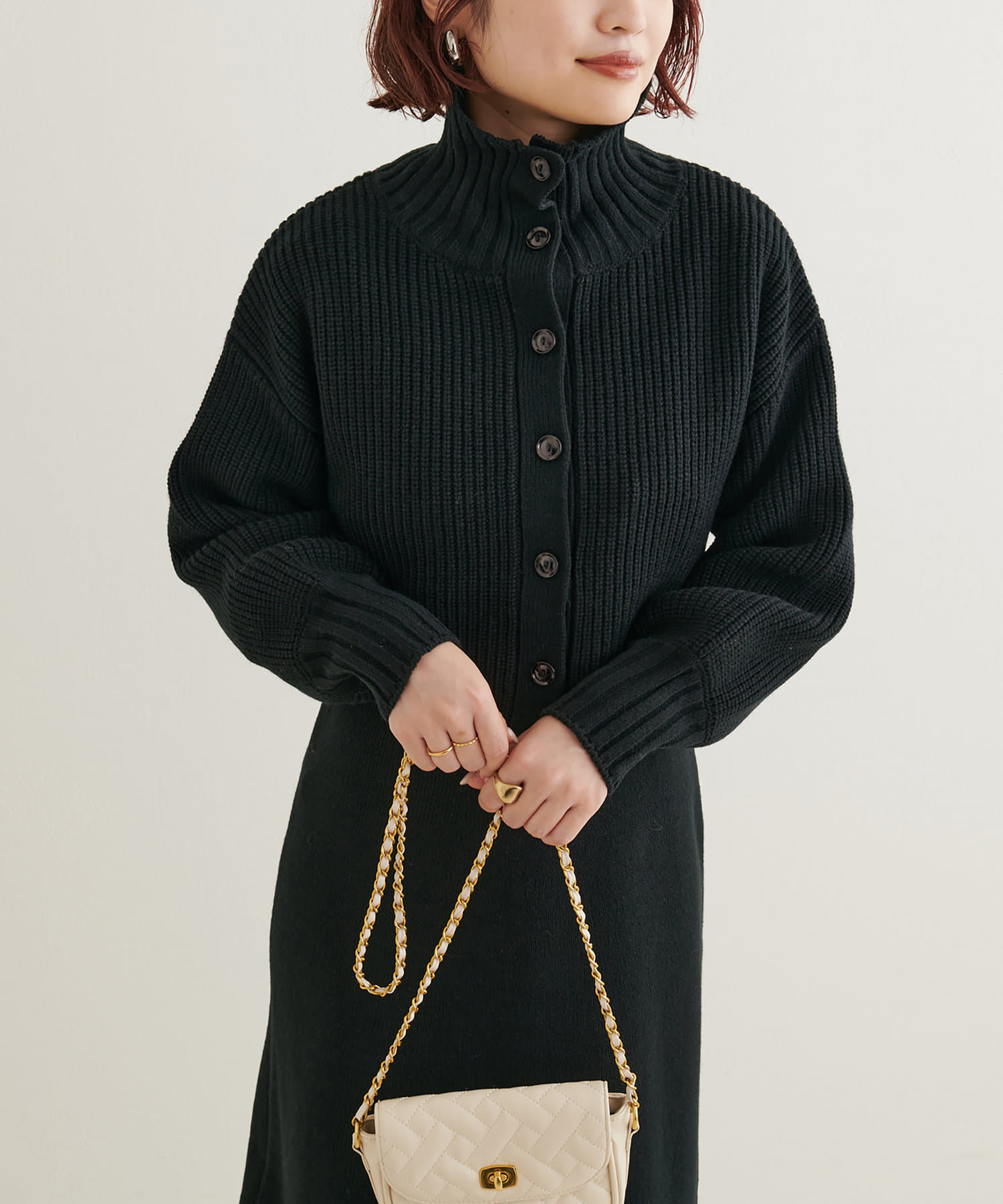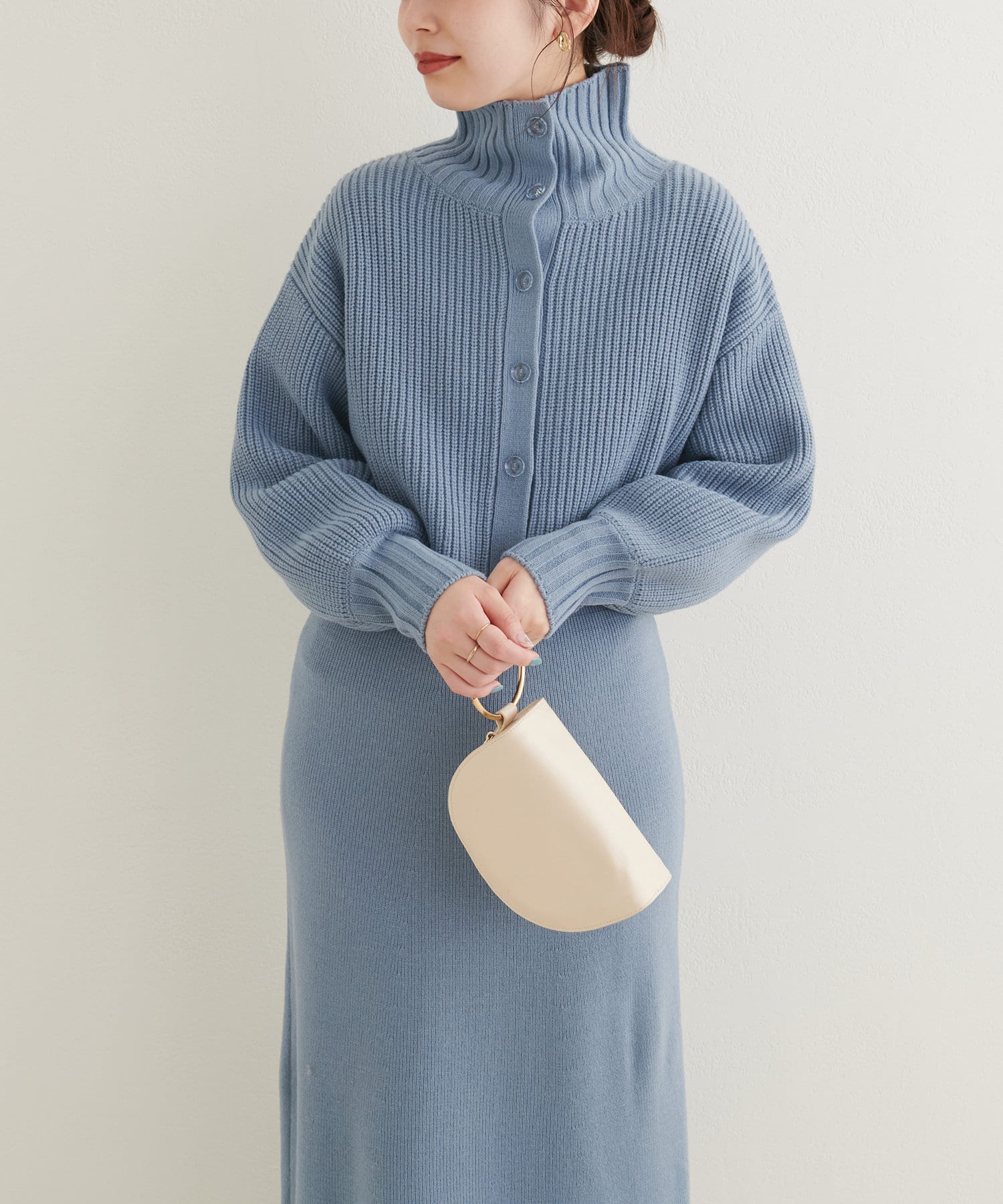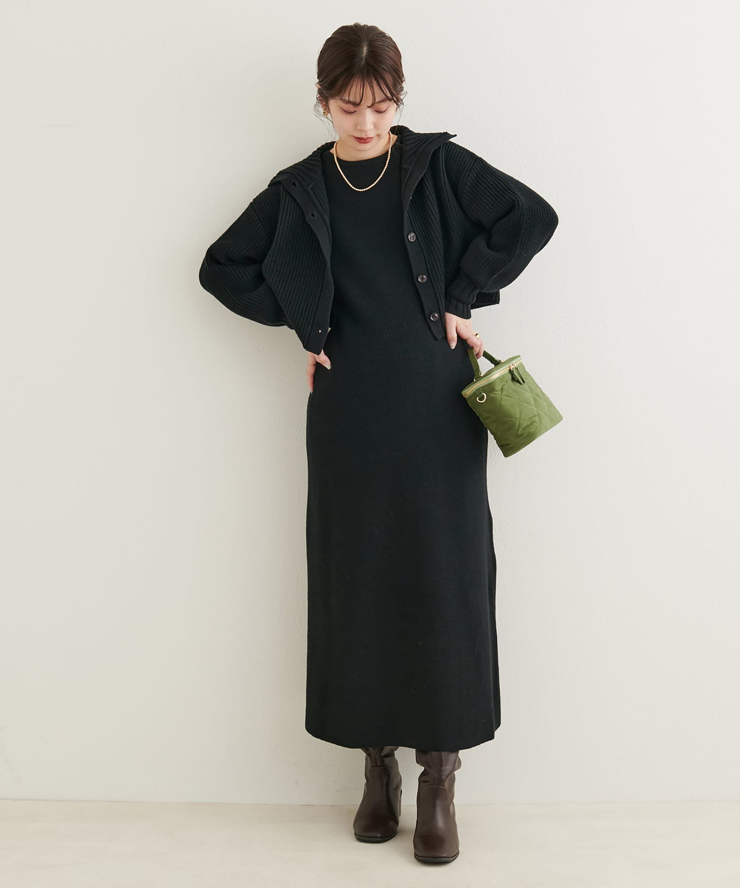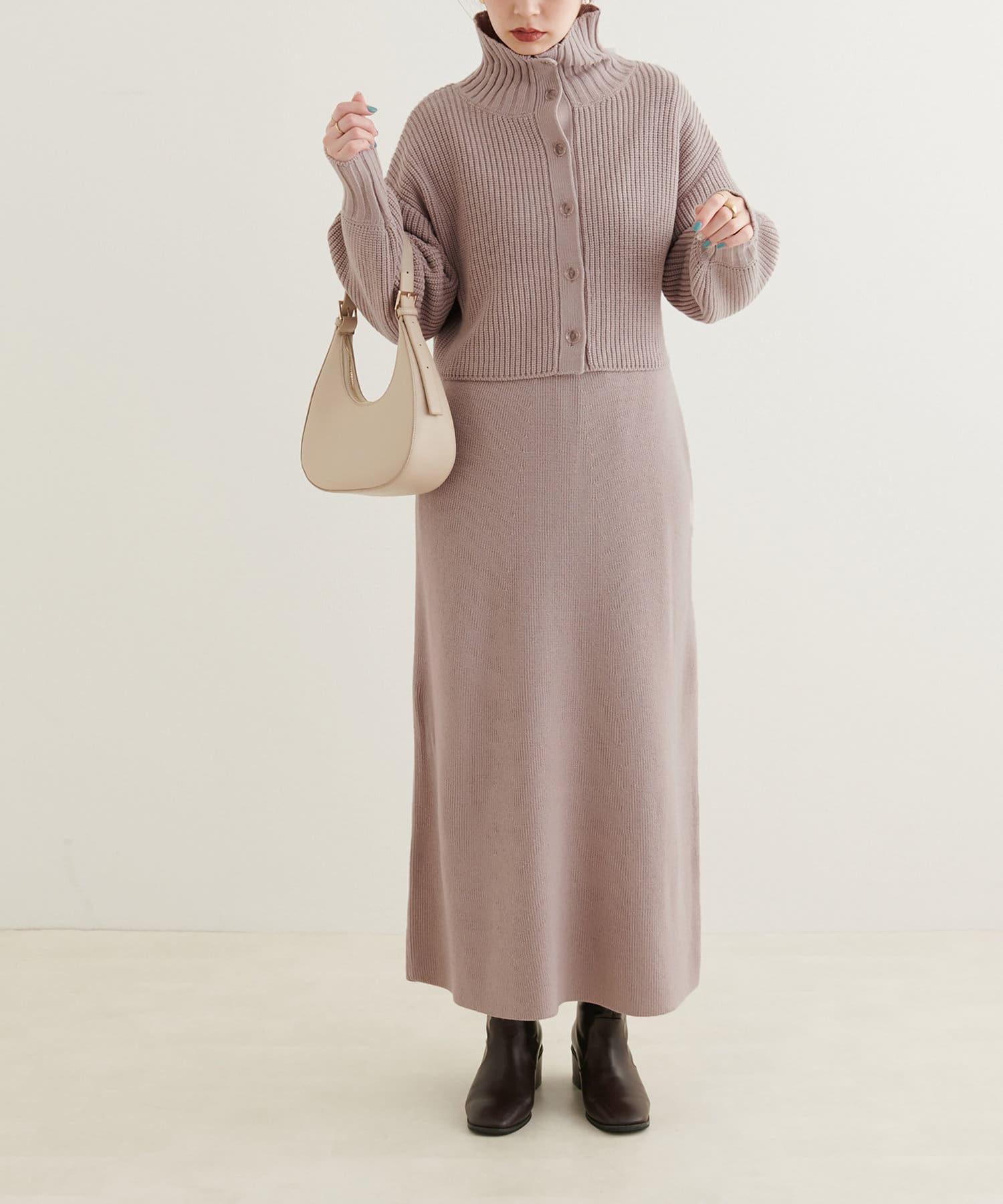 ニットワンピースを1枚で着用していただいても◎またカーデをすべて閉めていただきプチハイのプルオーバーとして着ていただいても◎