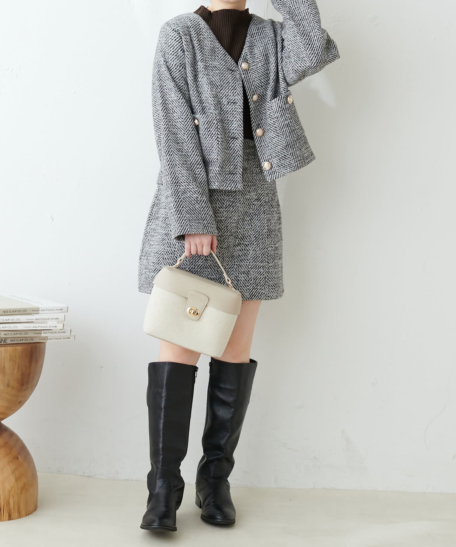 同素材の品番:0331070030 ツイードジャケットと合わせたセットアップコーデはもちろん、