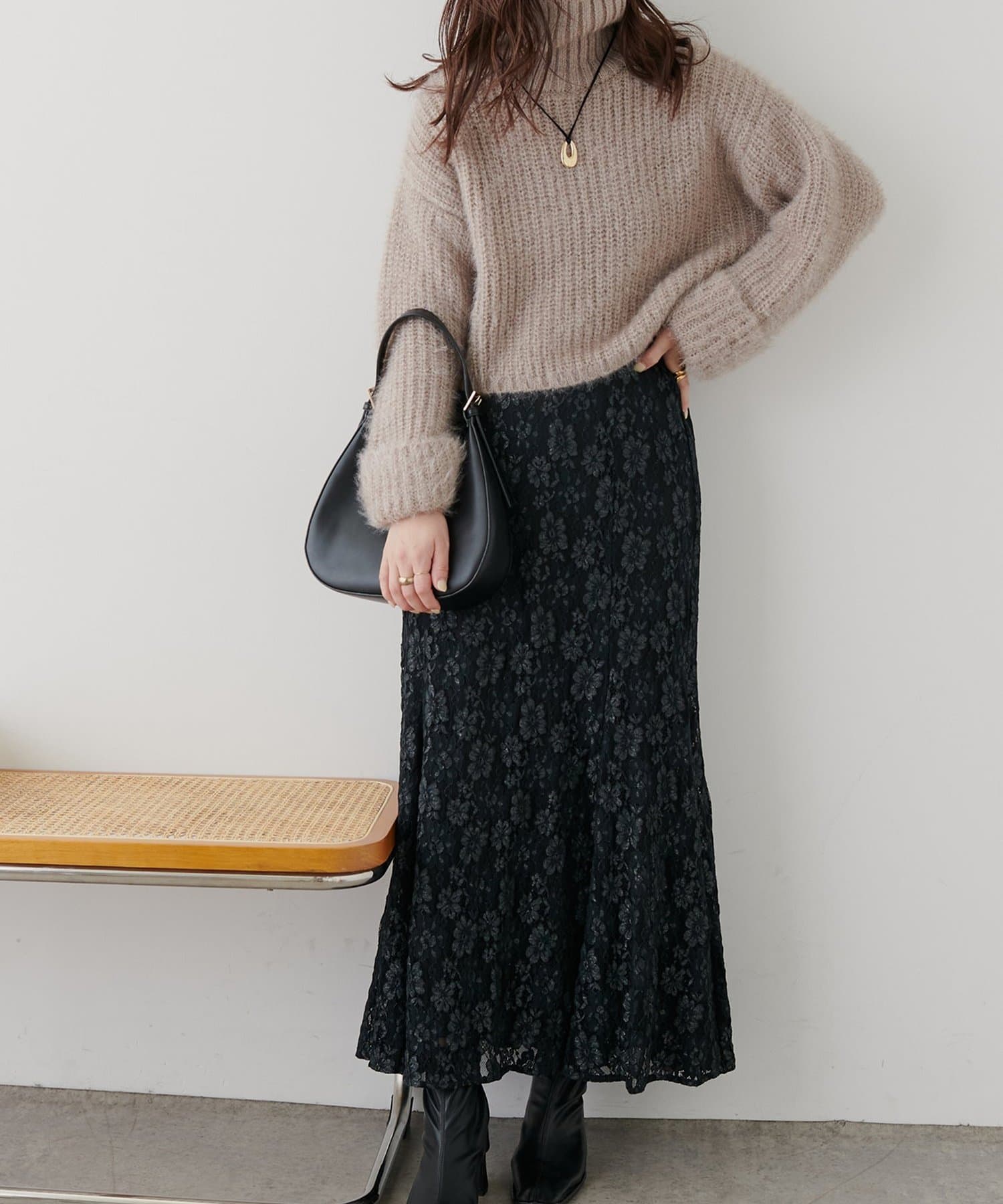 秋冬はゆるっとしたニットをウエストアウトで合わせても、女性らしい柔らかな印象になります◎