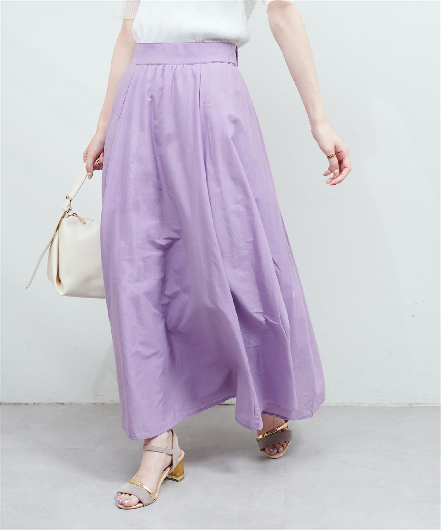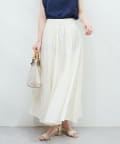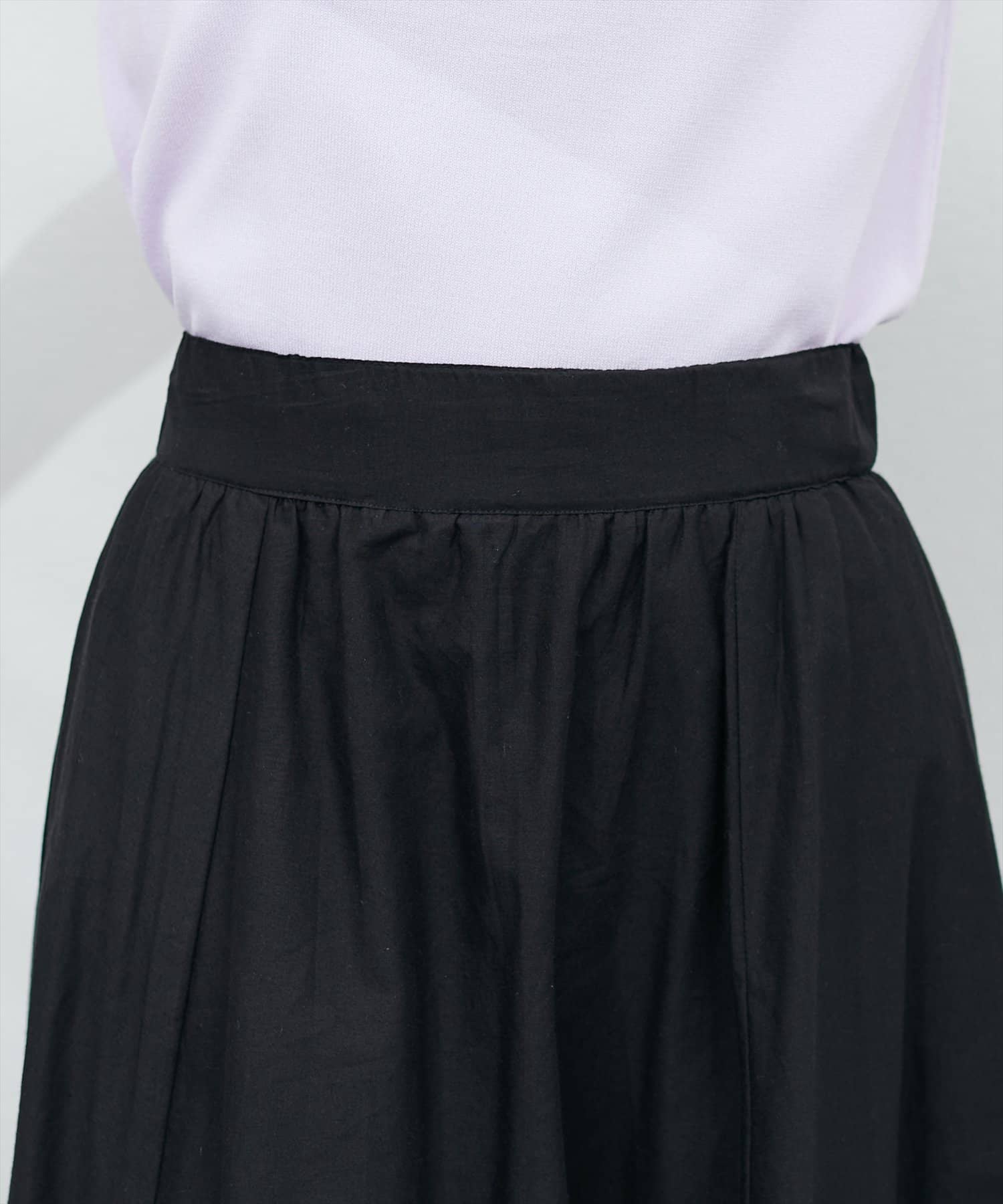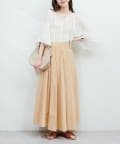 ウエストにギャザーが施されているので、トップスをインして頂くと上品ですっきりとしたスタイリングに。