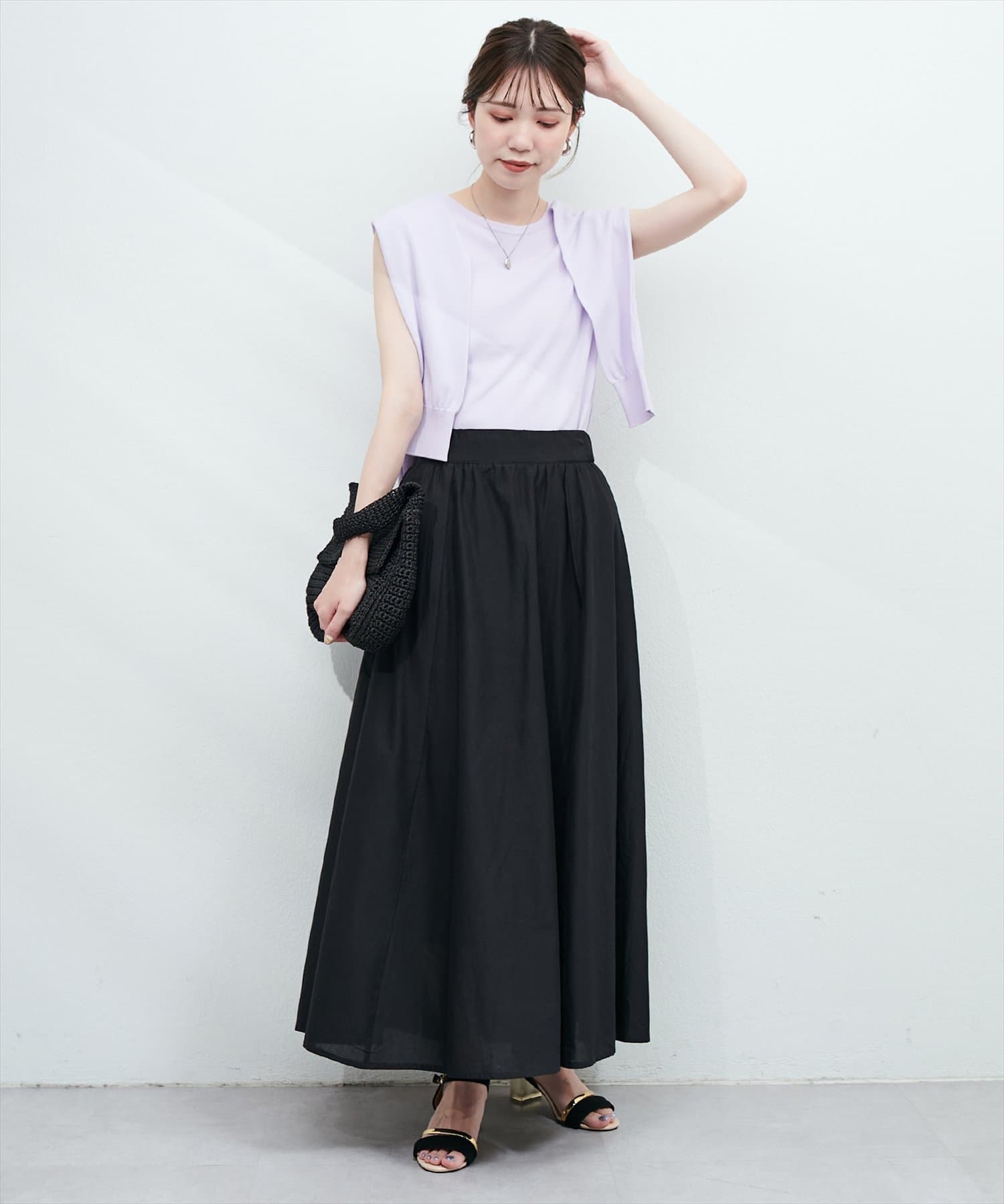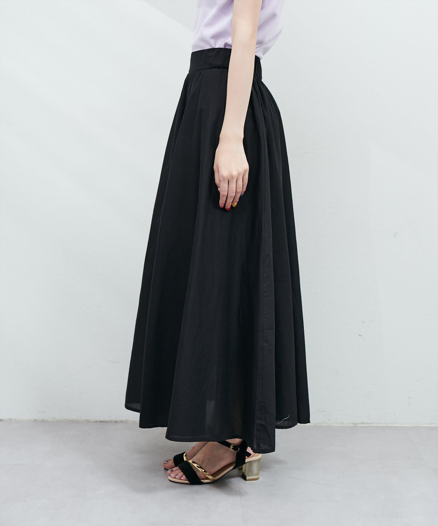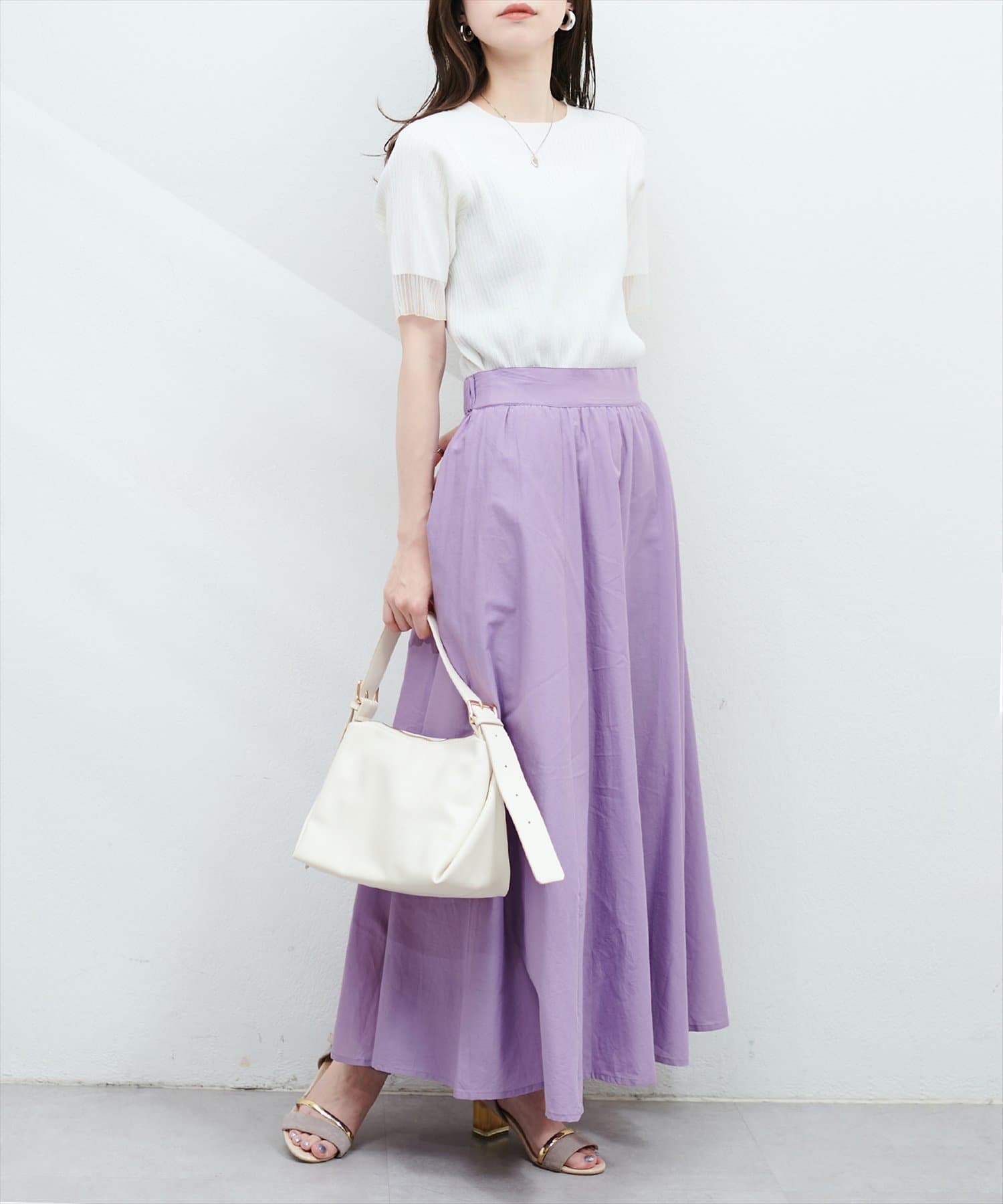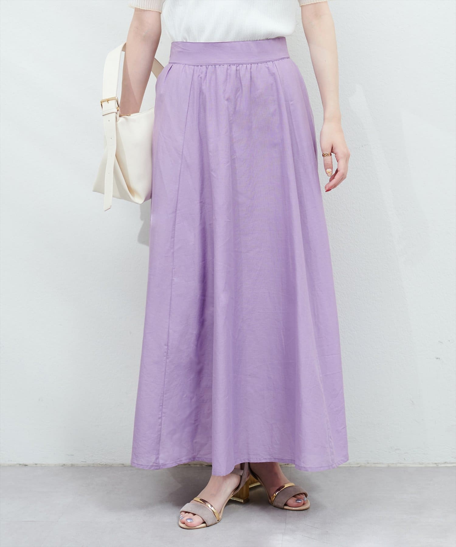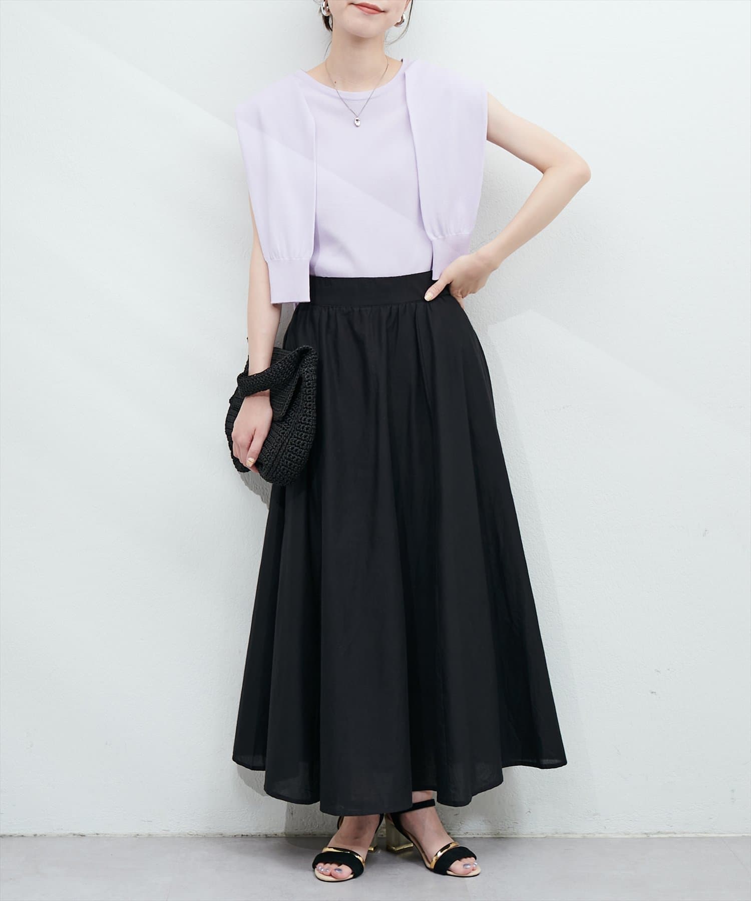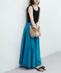 お腹周りがすっきりしているので、トップスとのバランスがとりやすいスカートです。