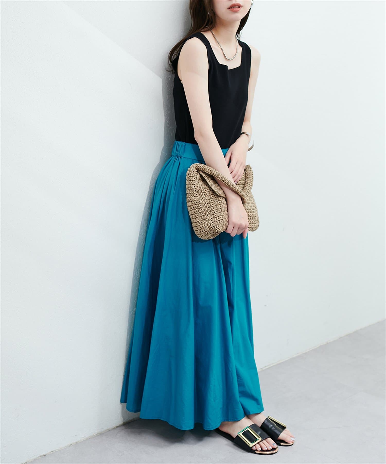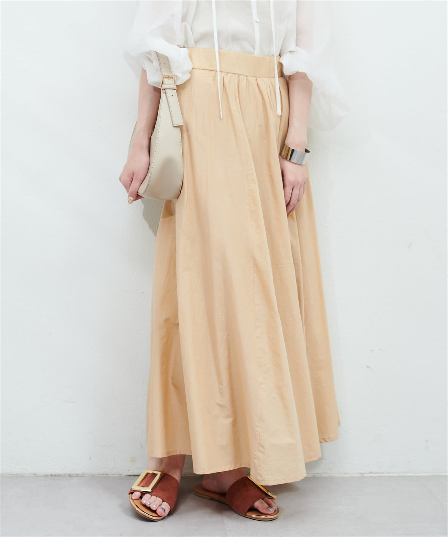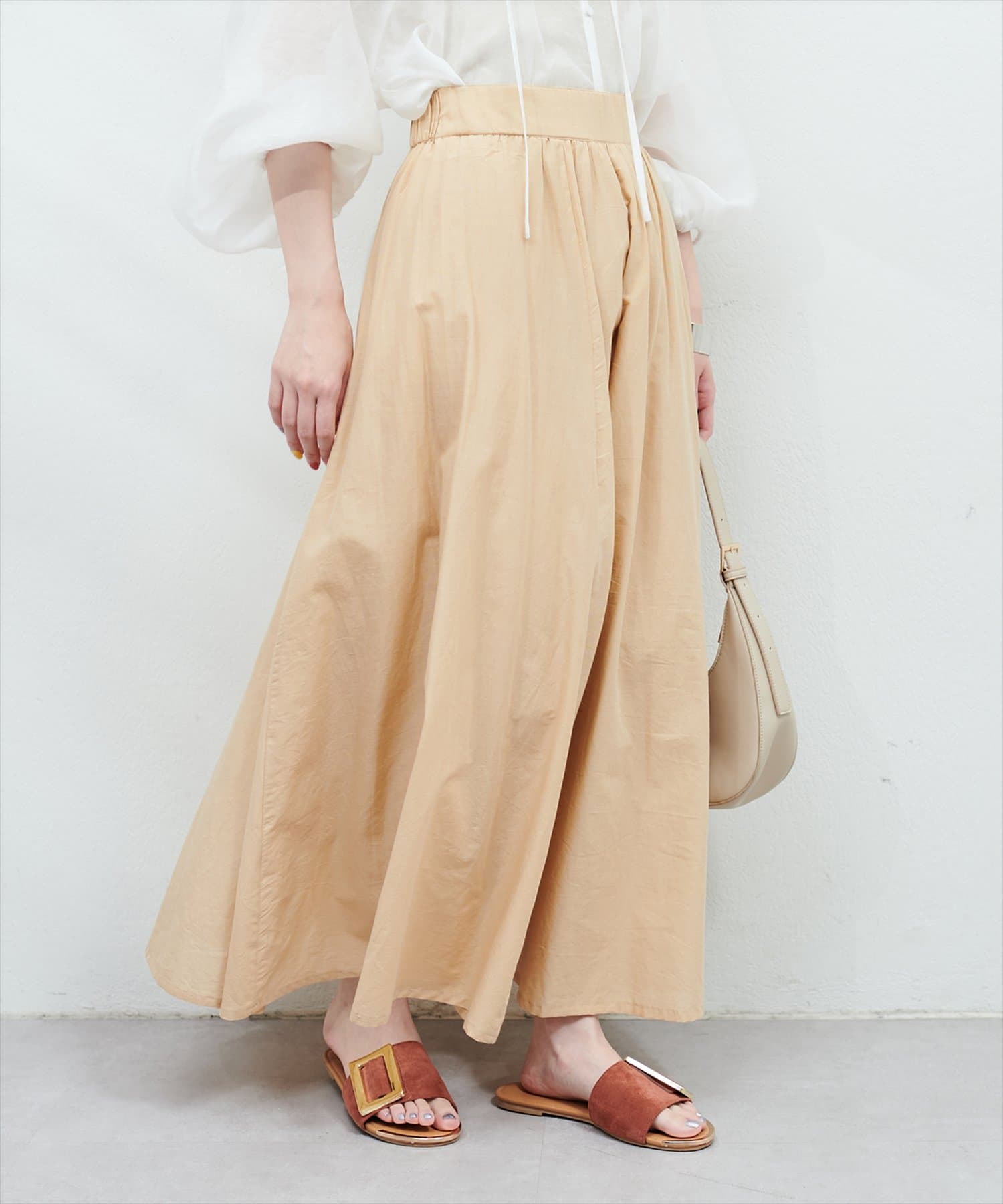 ウエストにはギャザーが施されており、トップスインのスタイリングも映える1枚。