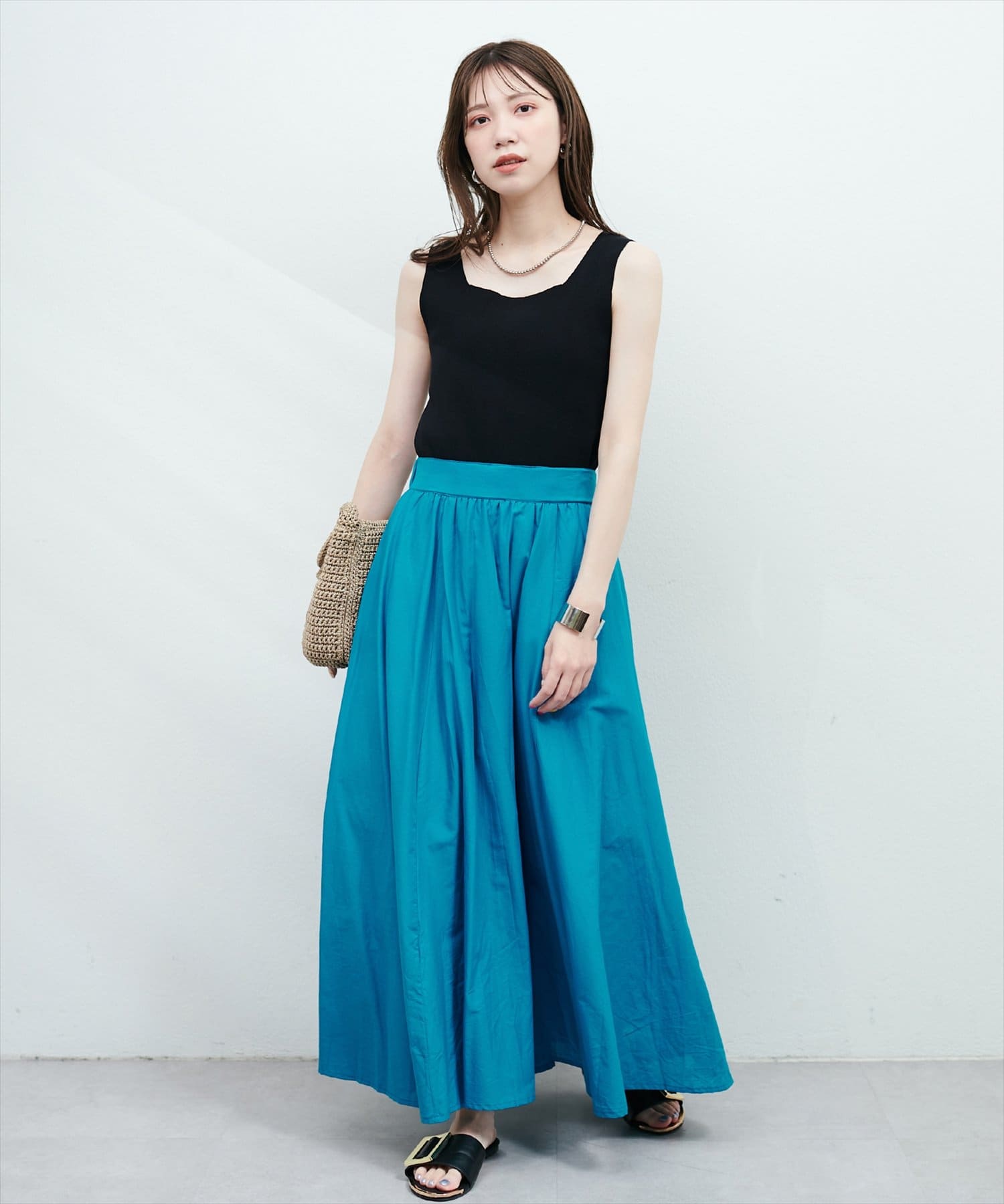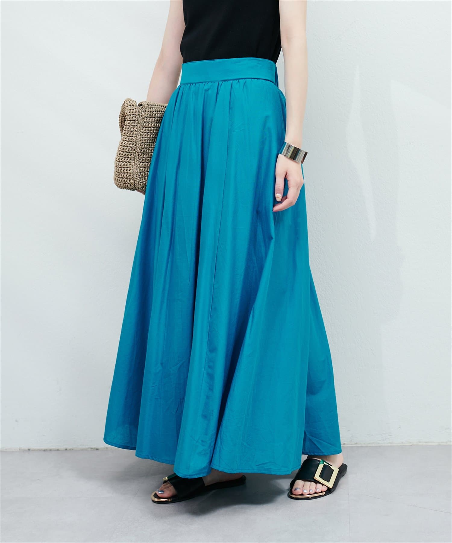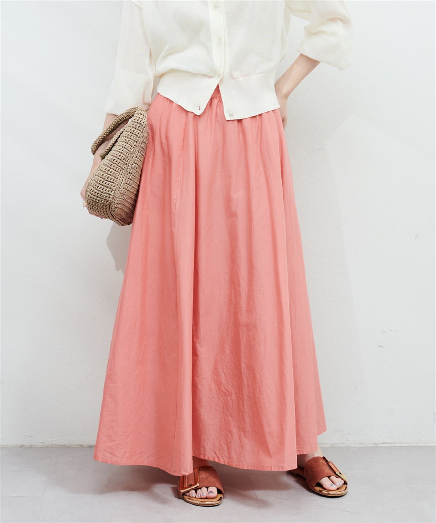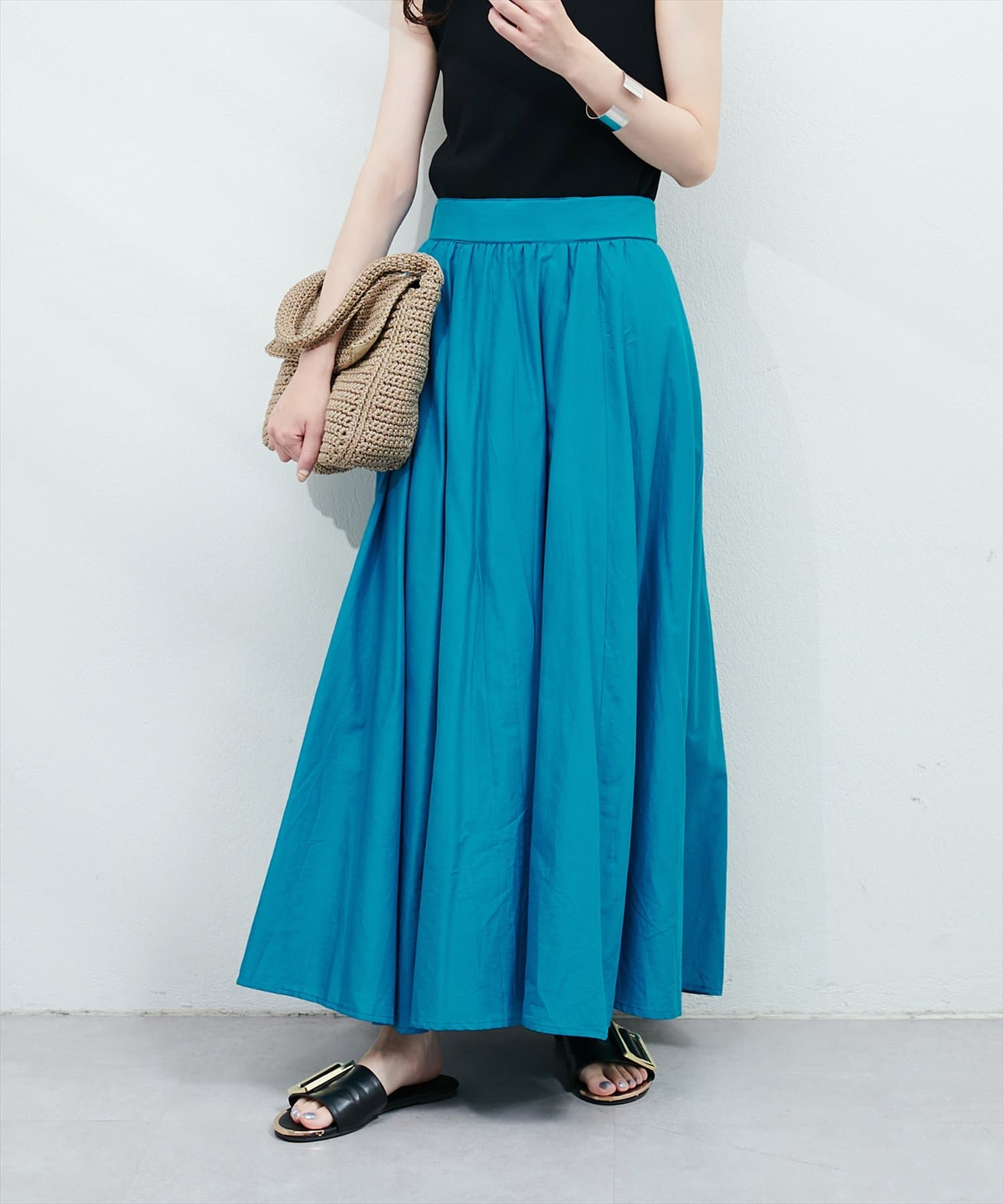 ウエストにはギャザーが施されており、トップスインのスタイリングも映える1枚。
