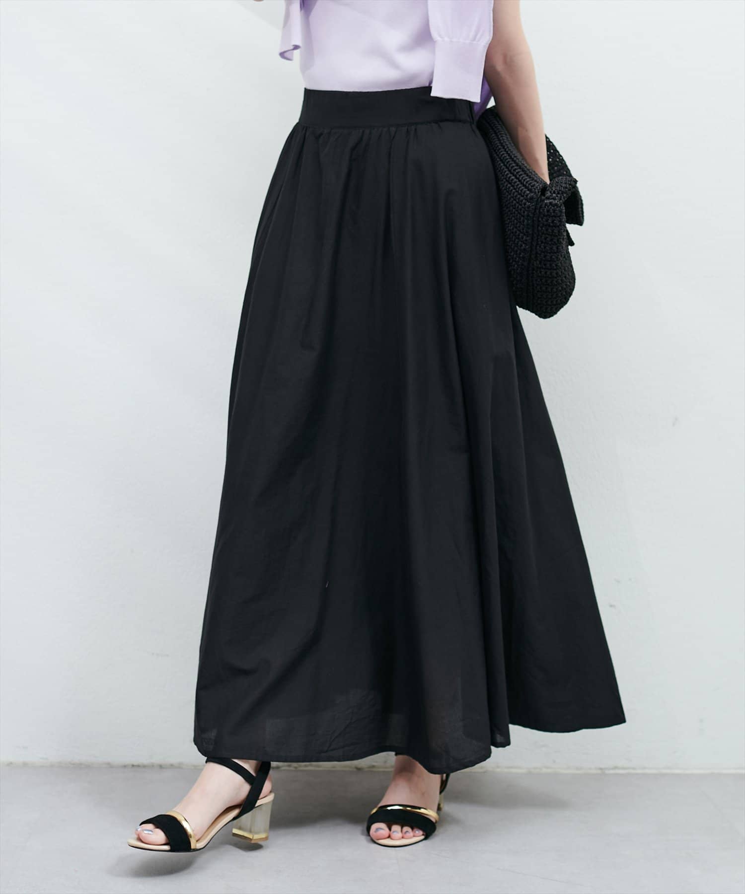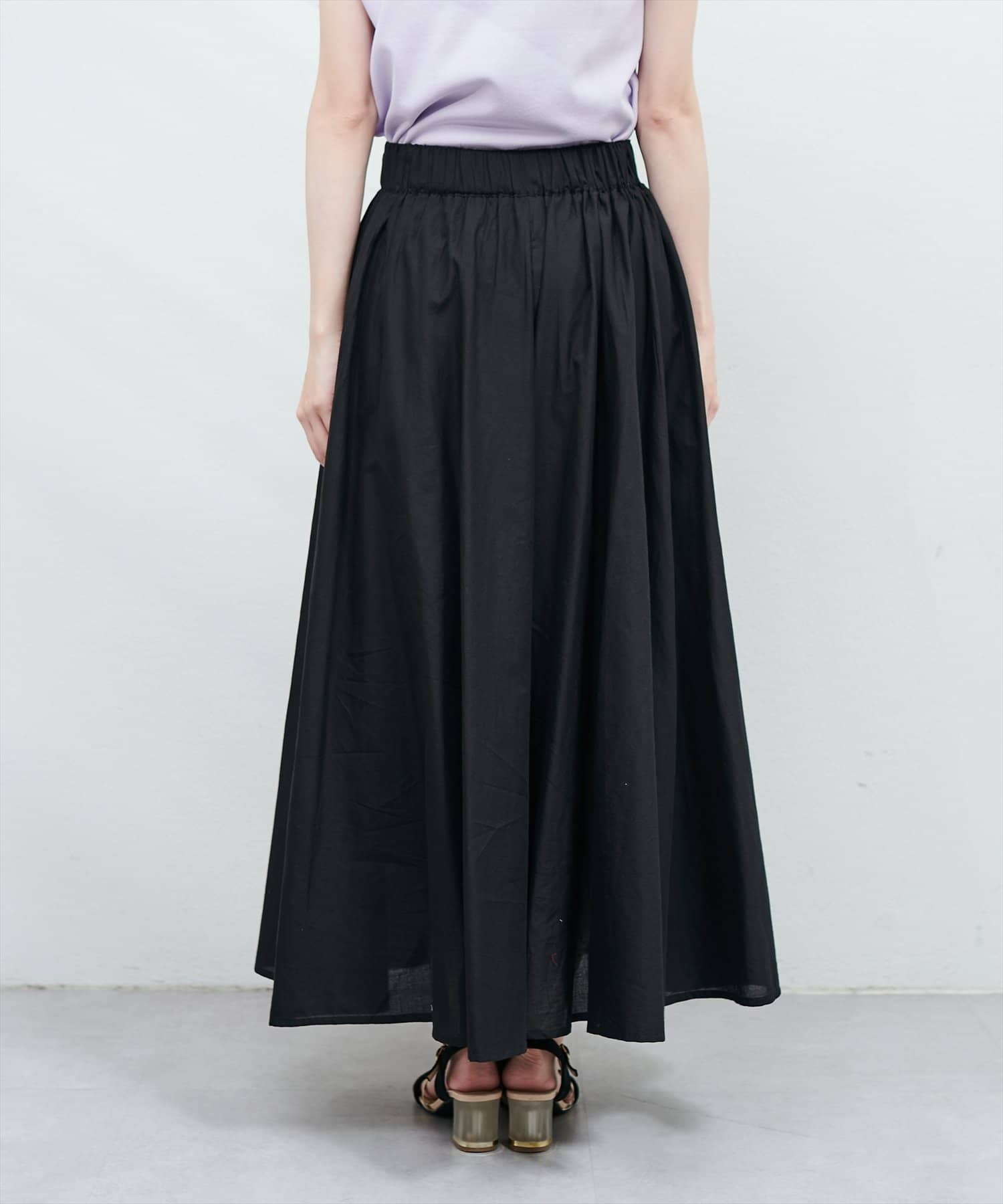 後ろゴム仕様のウエストで、きれい見えしながらもリラックス感のある穿き心地が魅力です。