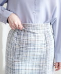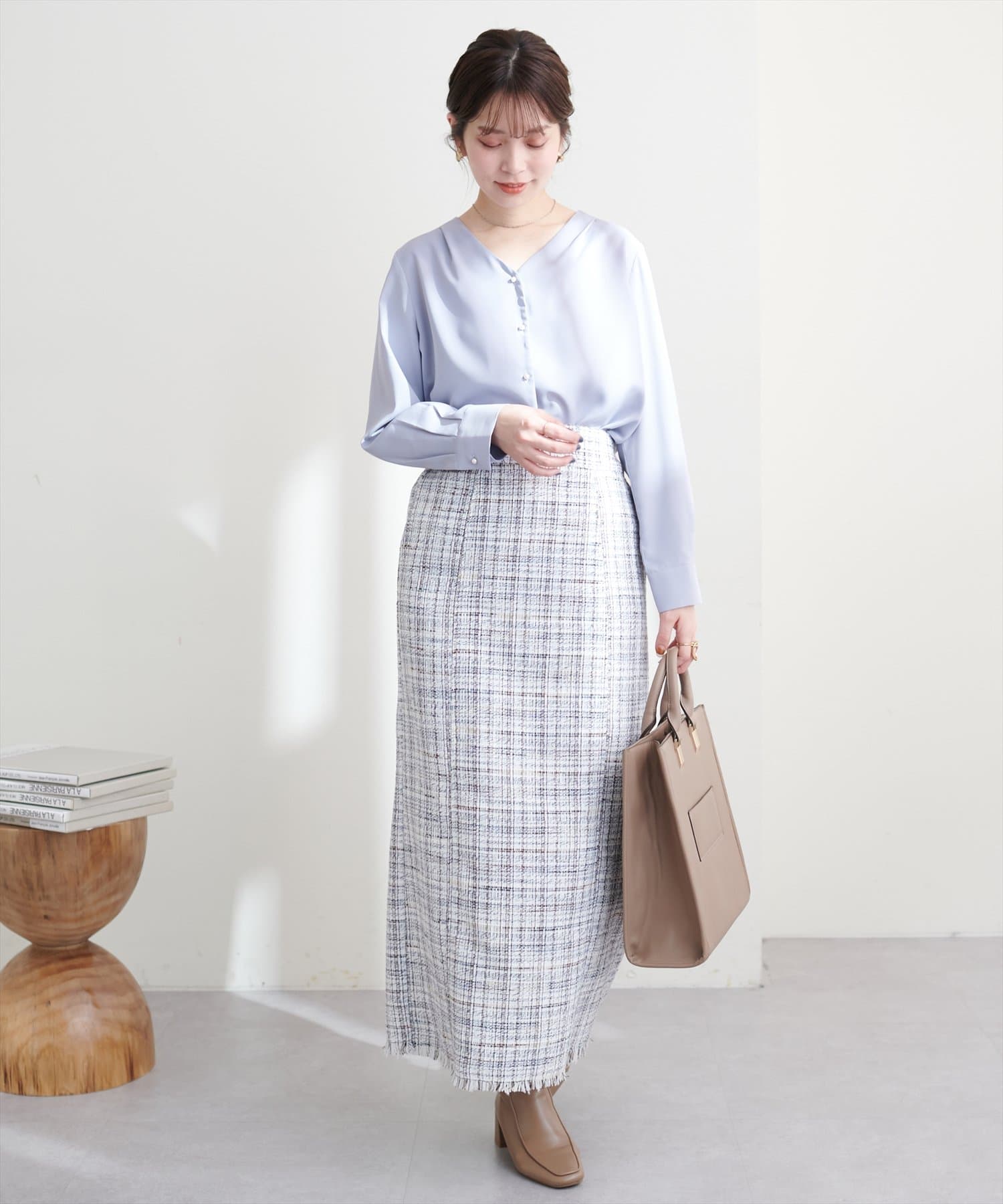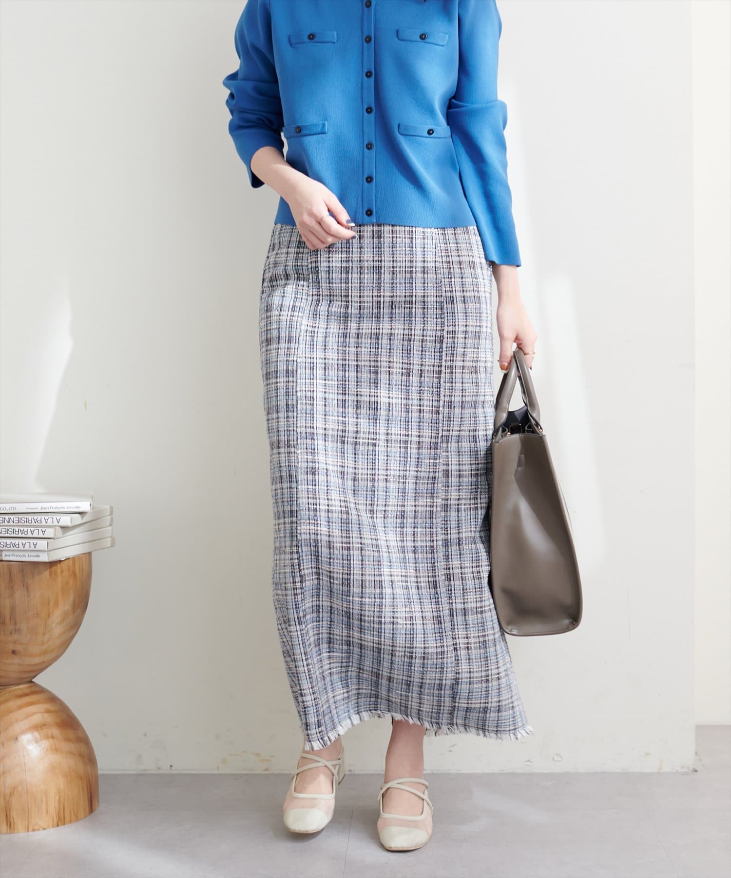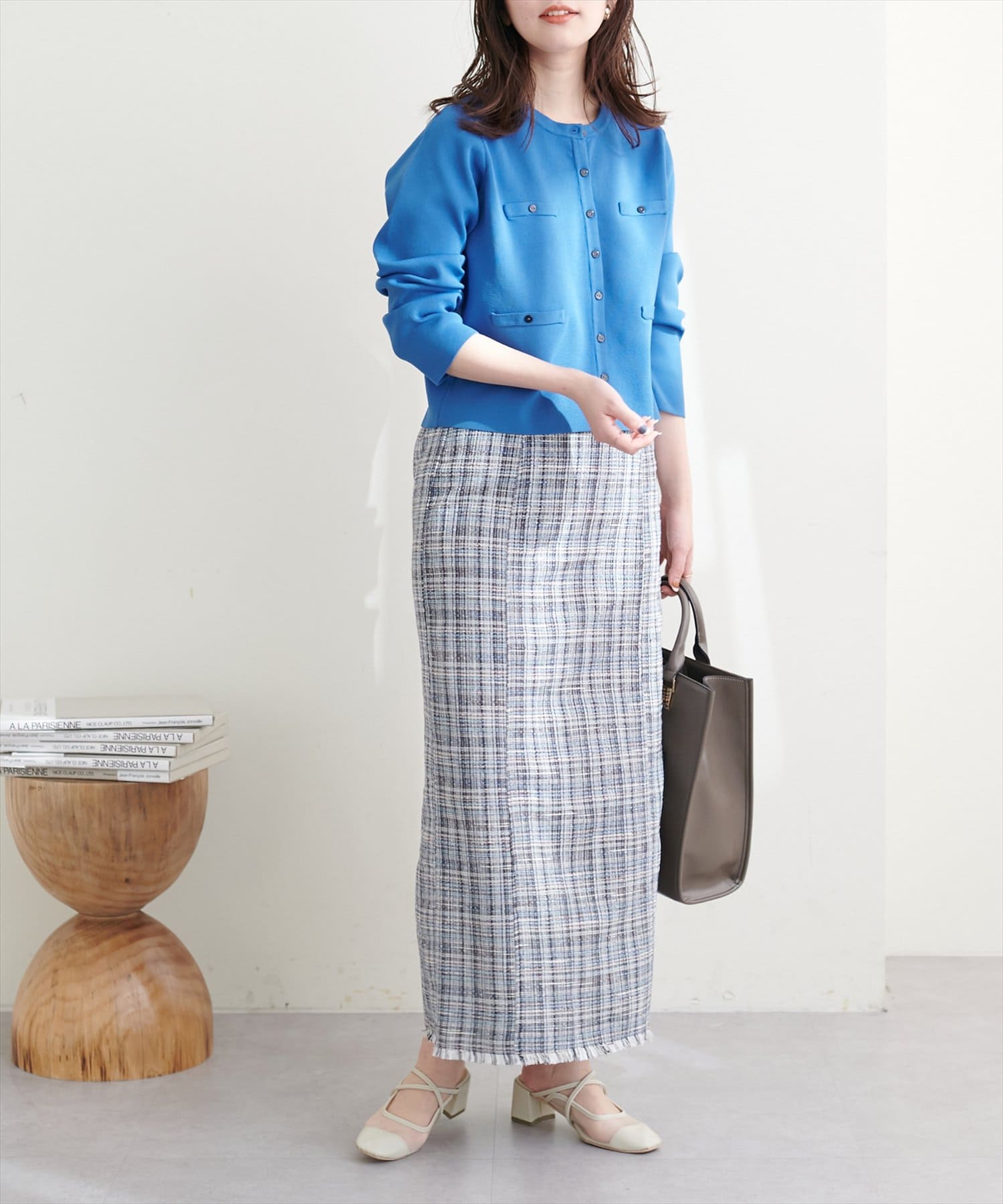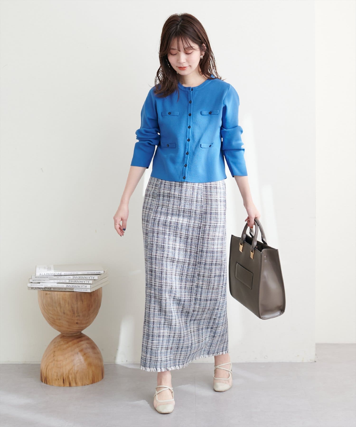 ツイード素材はやわらかく楽に着れるアイテム。青色ベースでのツイードなので、甘めスタイルではないお仕事コーデとしても