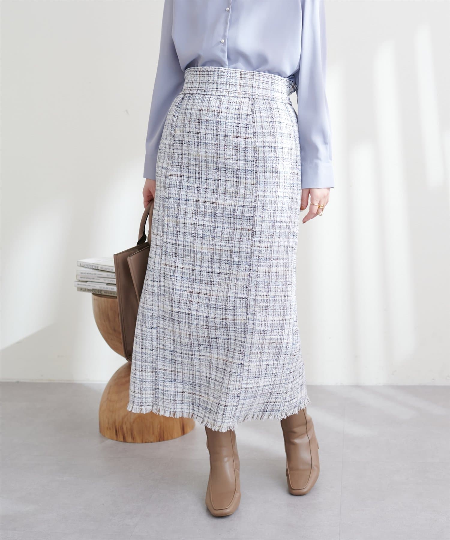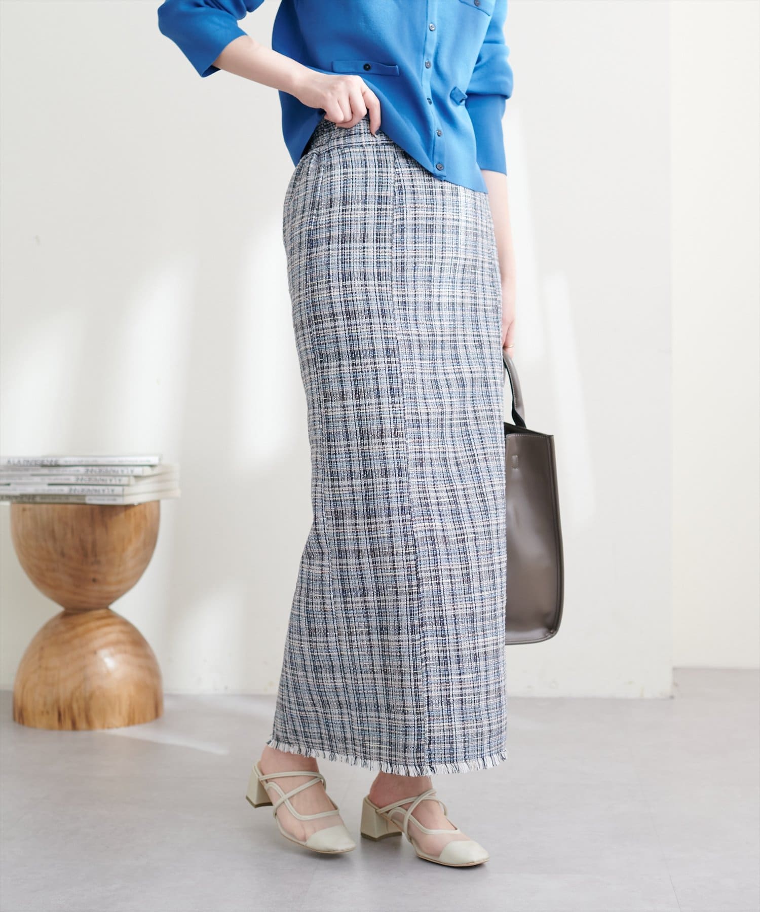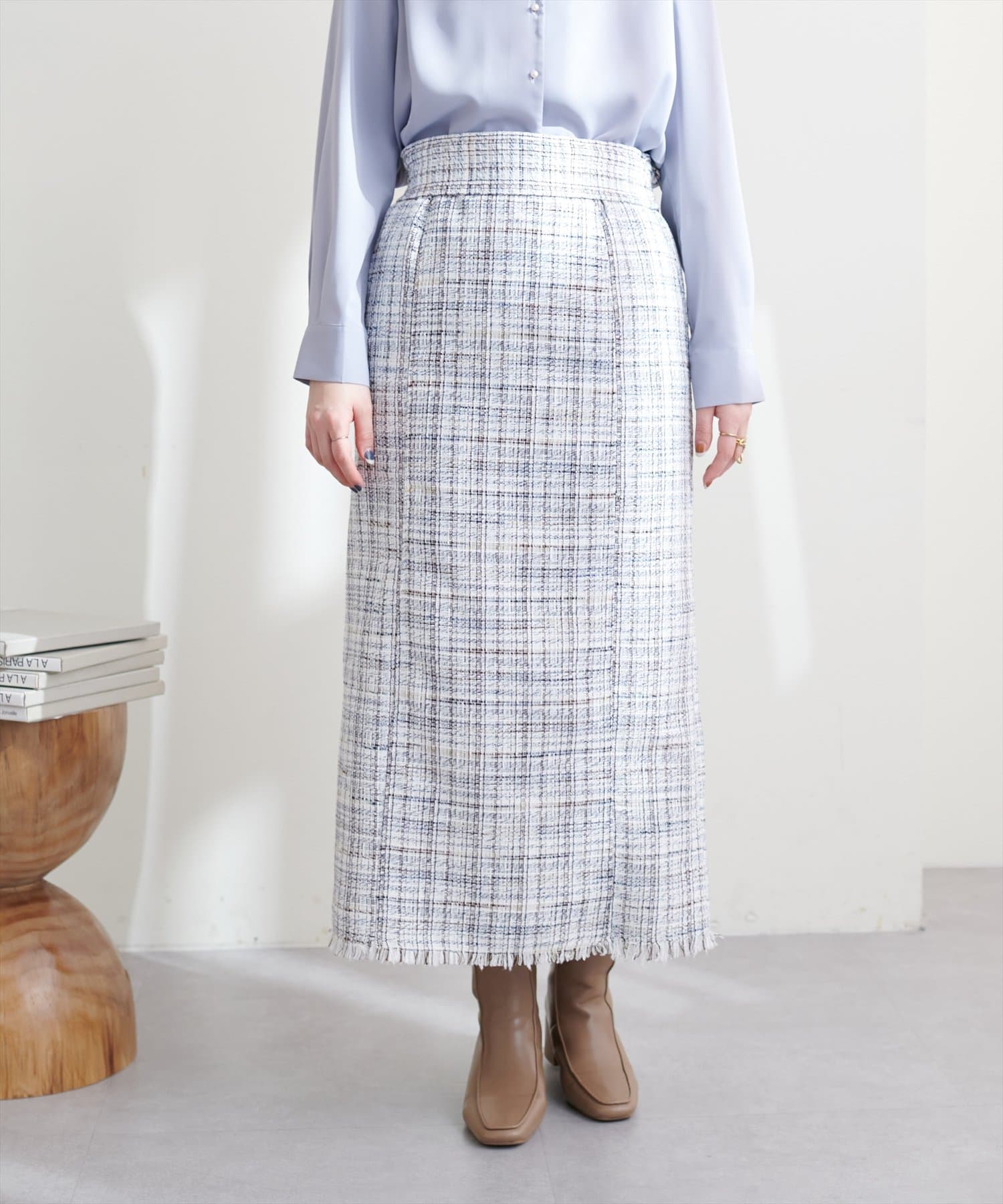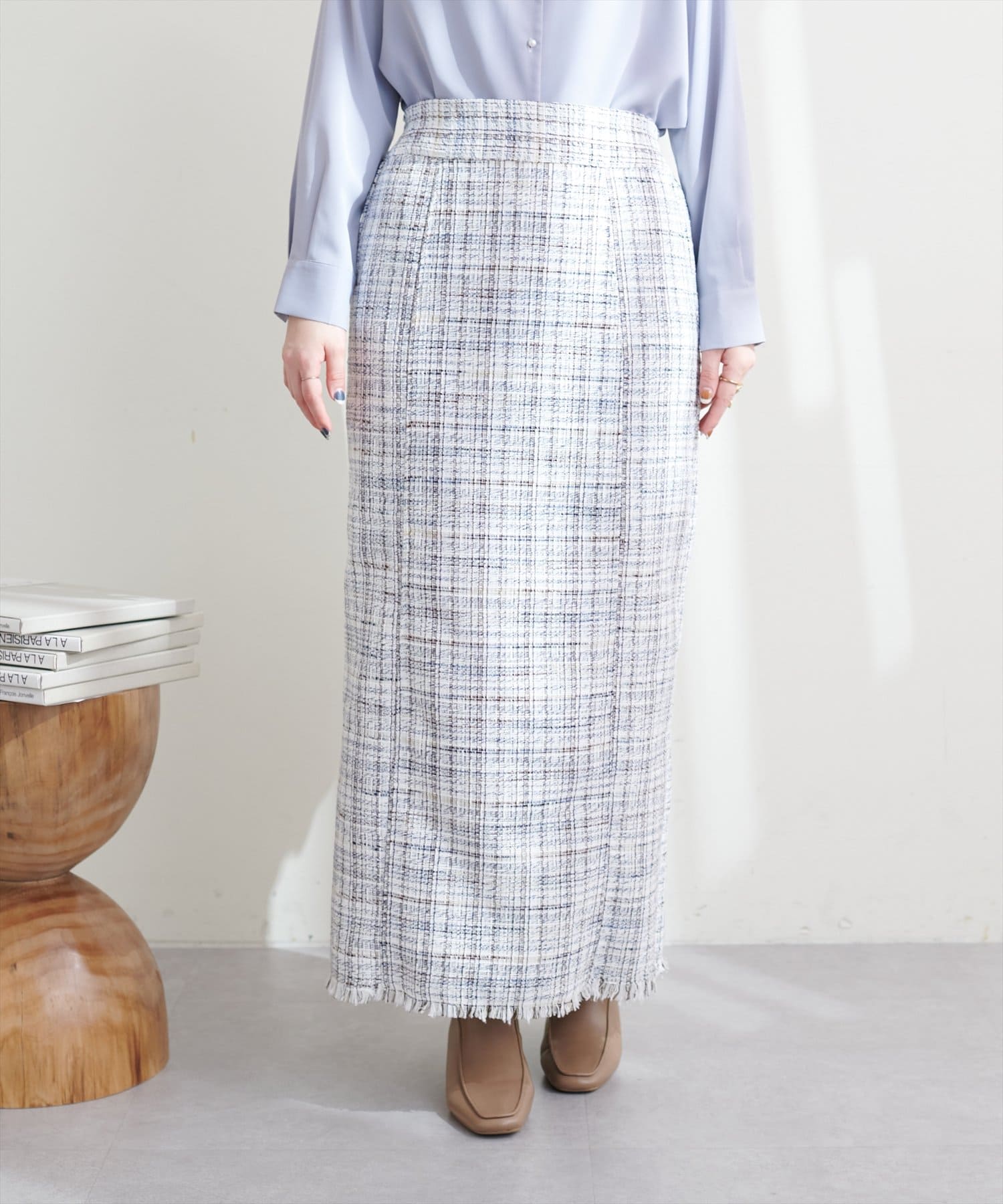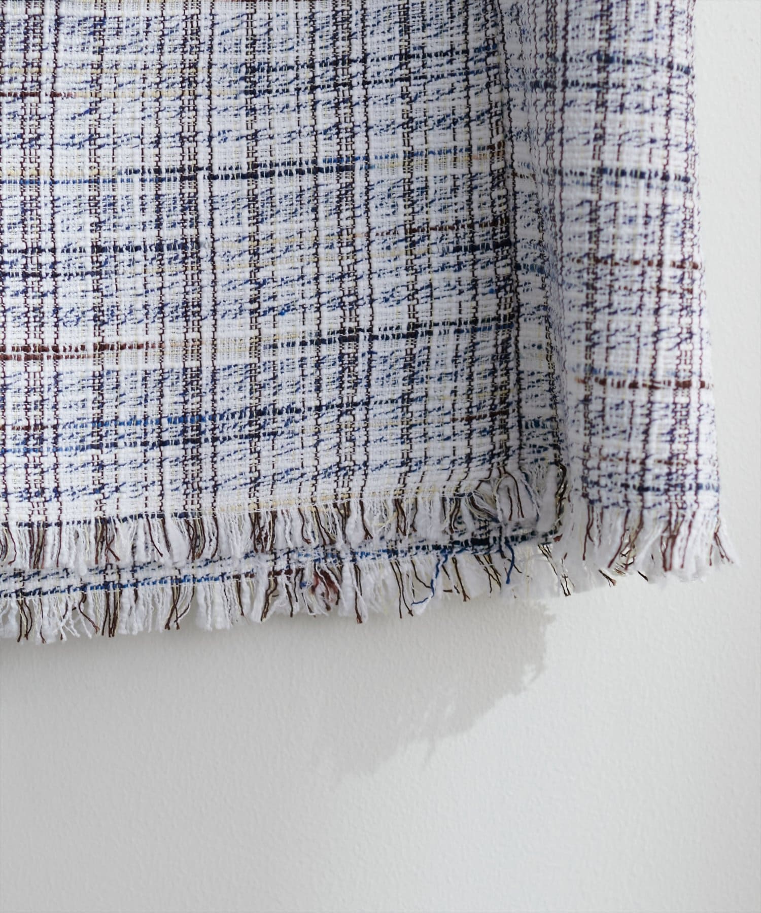 ツイード素材はやわらかく楽に着れるアイテム。青色ベースでのツイードなので、甘めスタイルではないお仕事コーデとしても