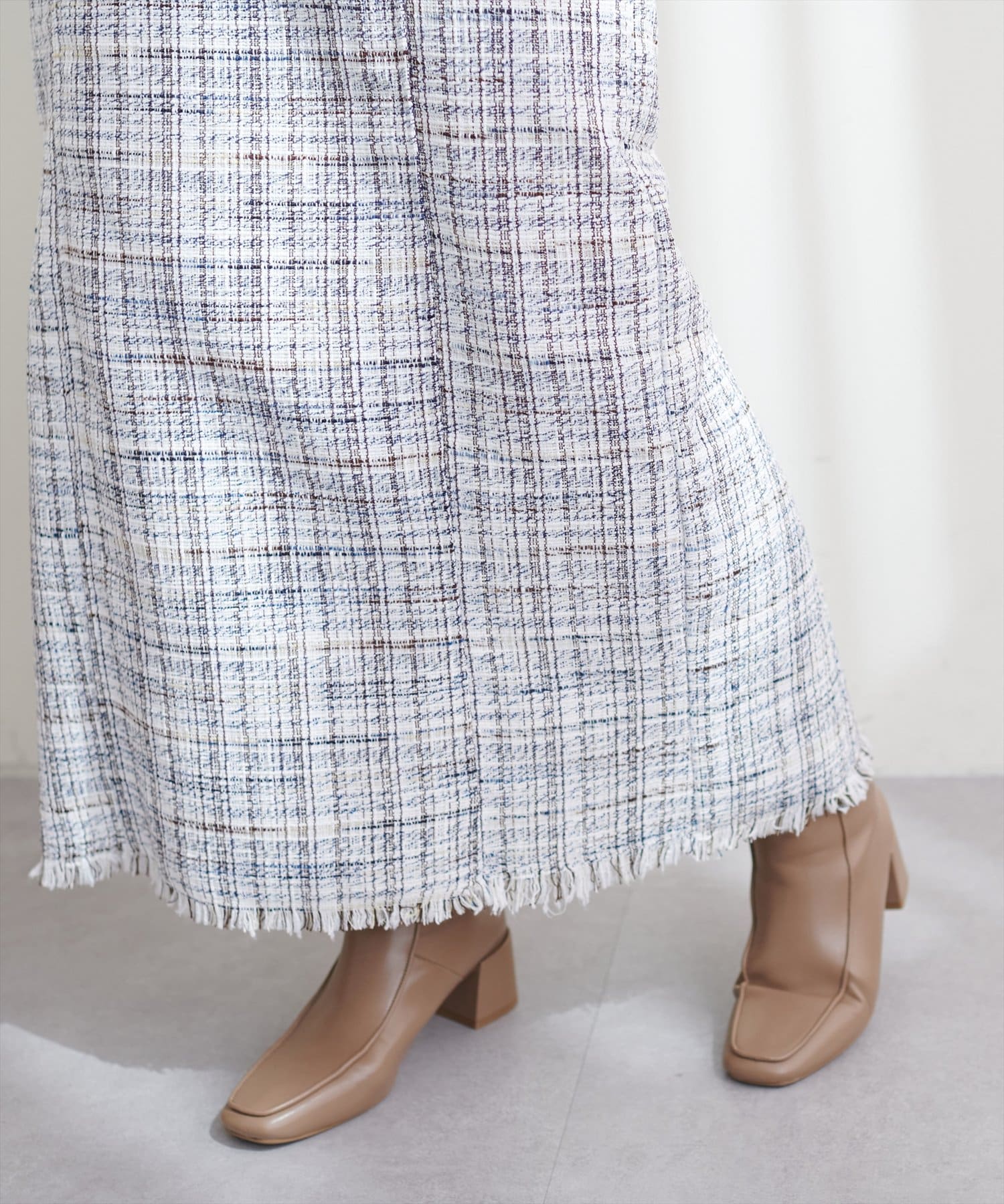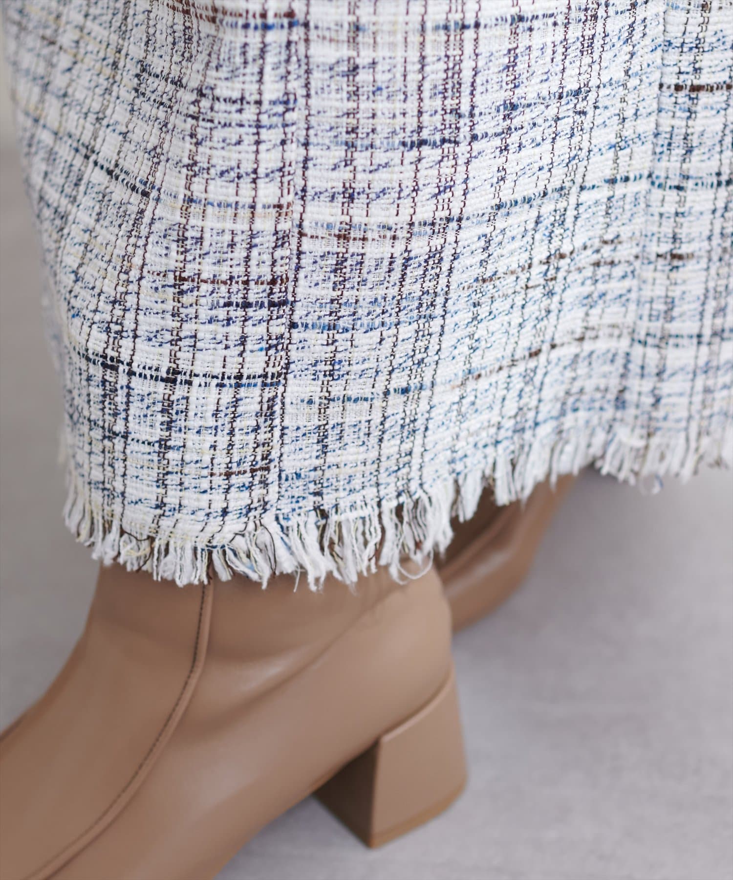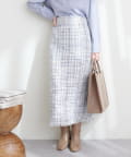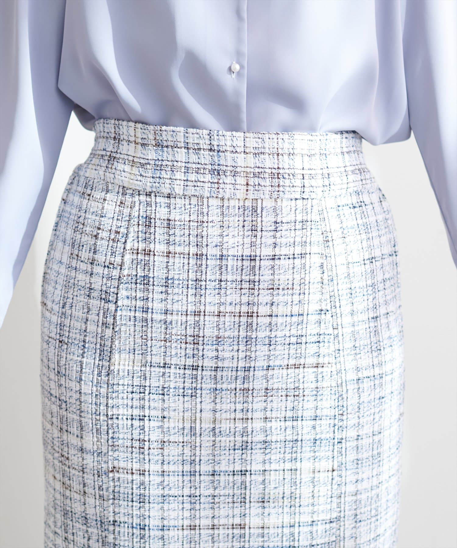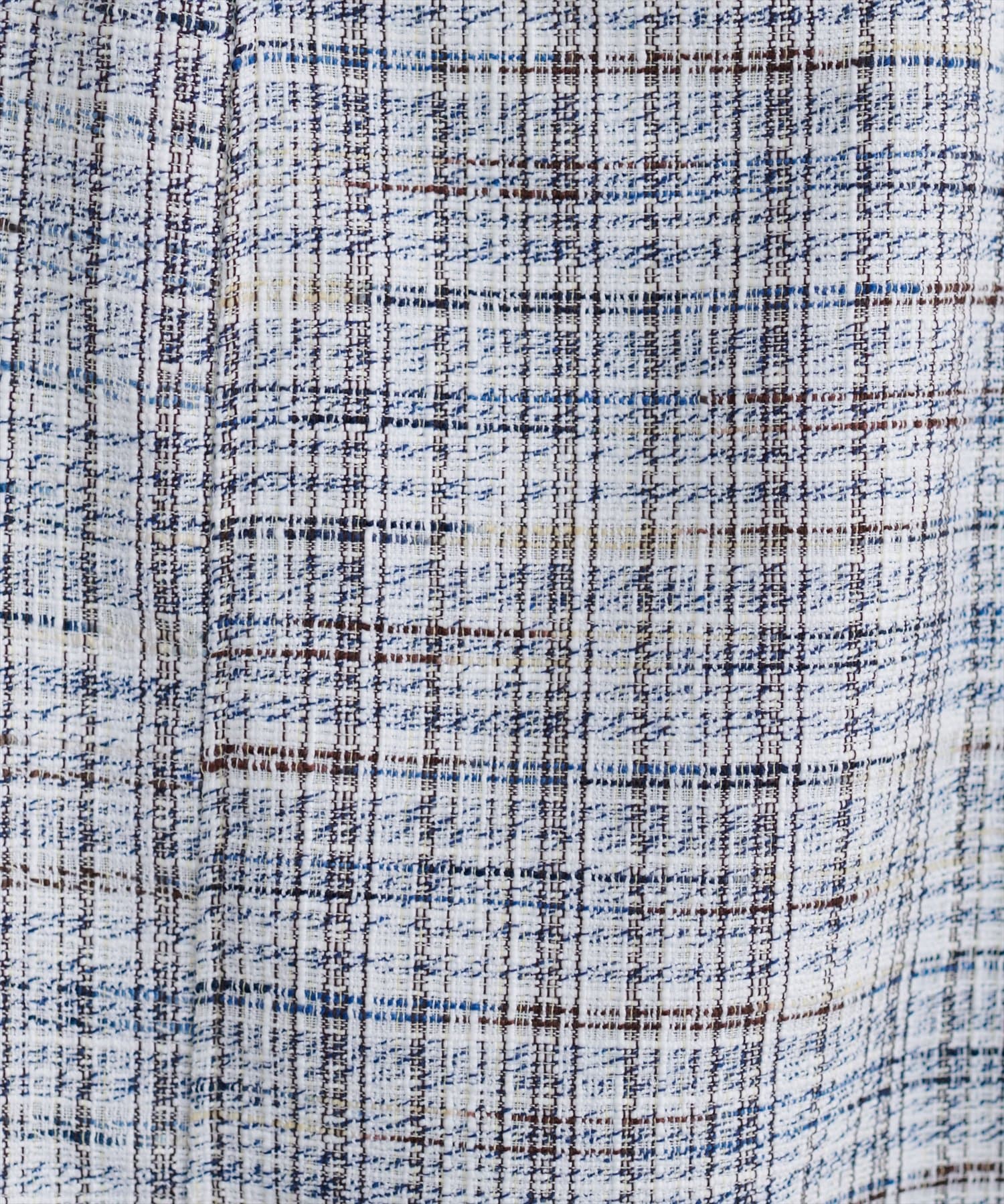 ツイード素材はやわらかく楽に着れるアイテム。青色ベースでのツイードなので、甘めスタイルではないお仕事コーデとしても