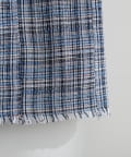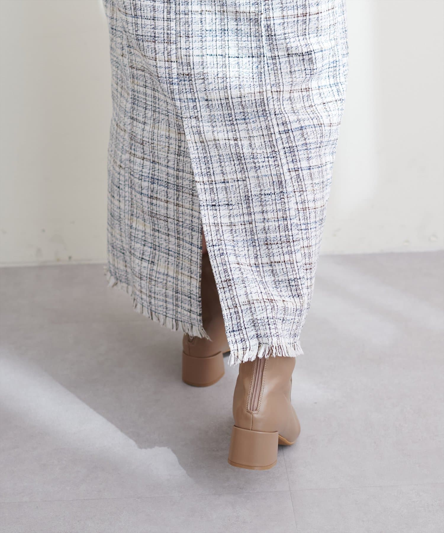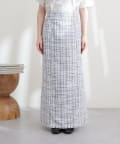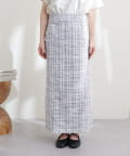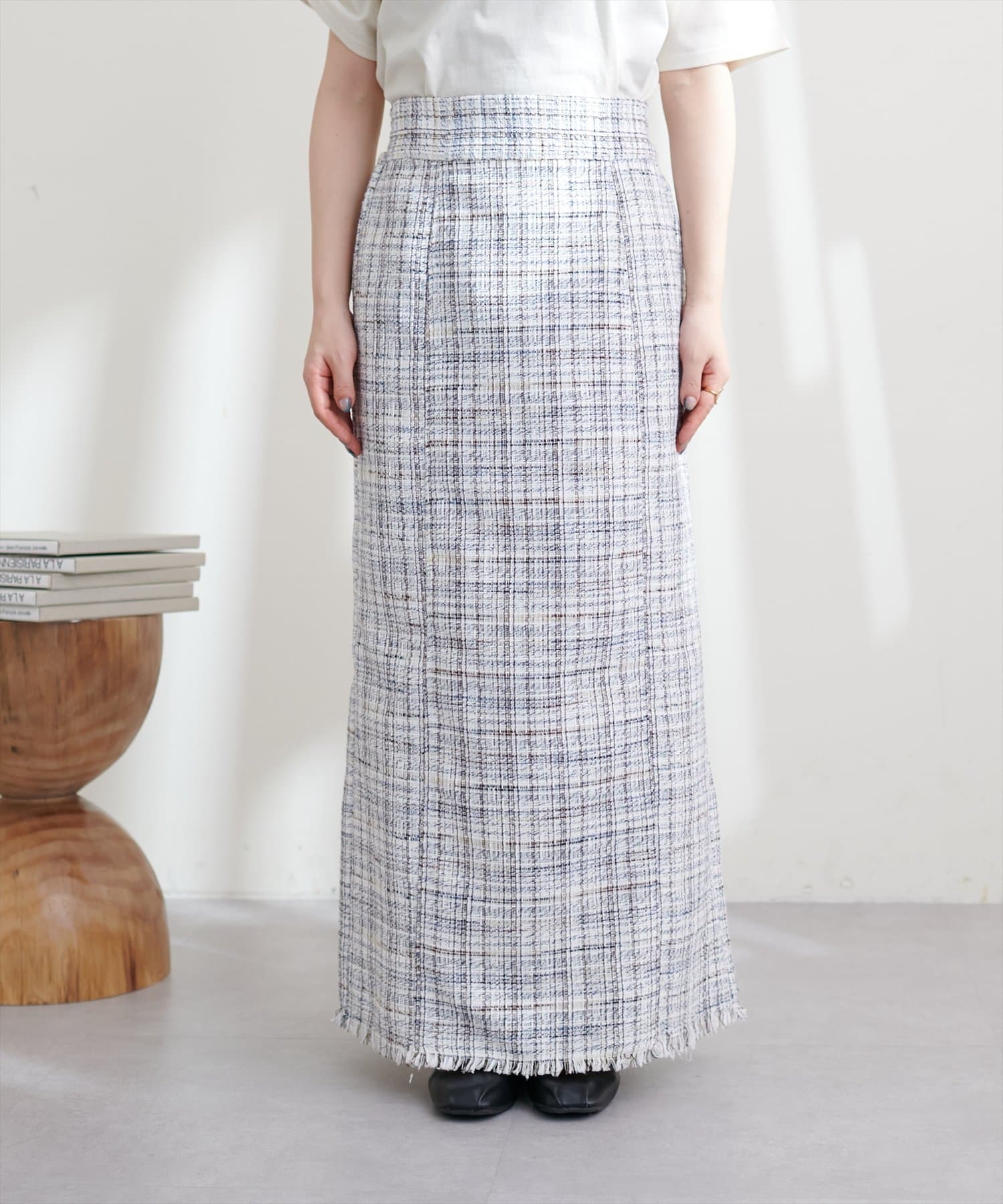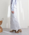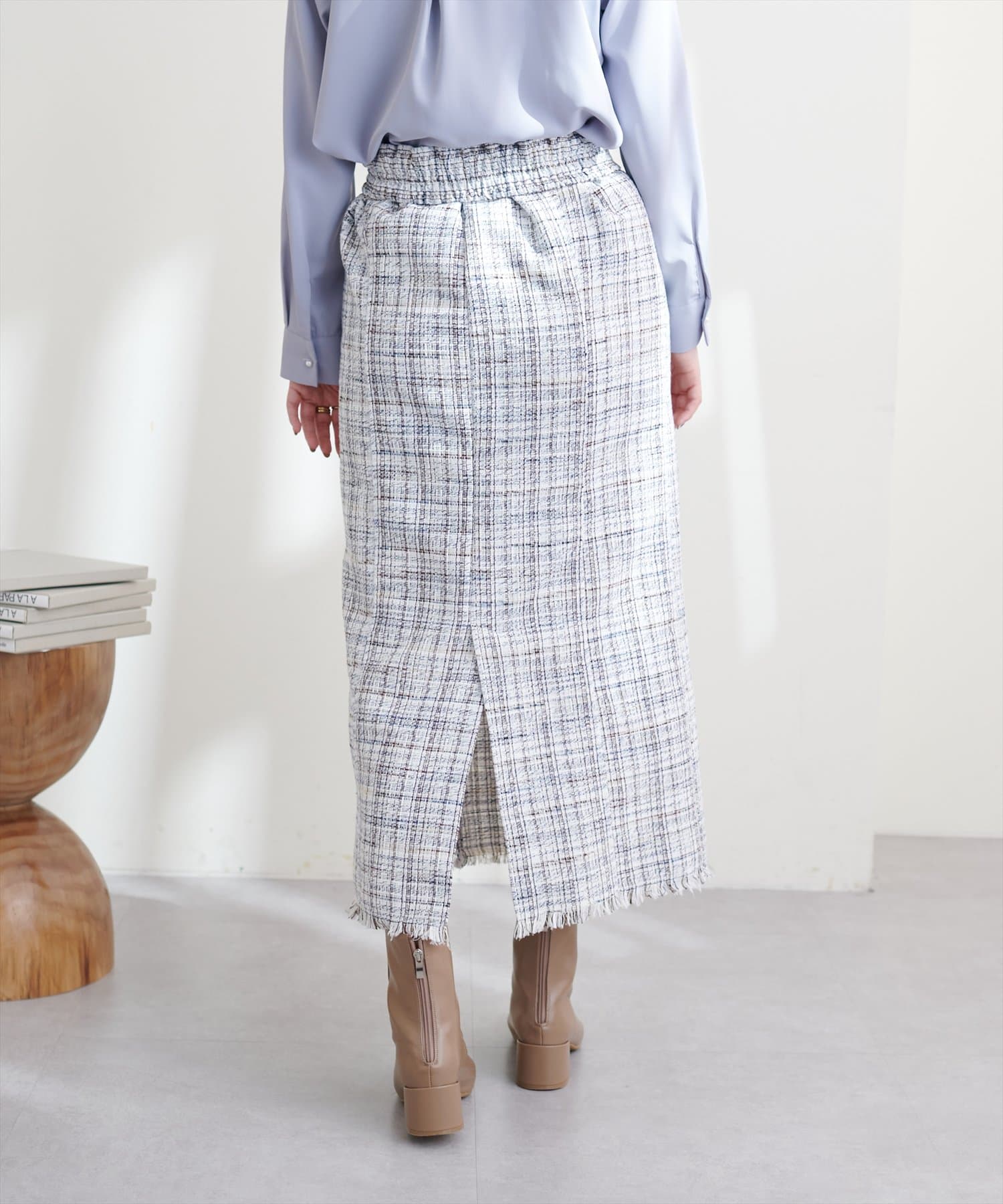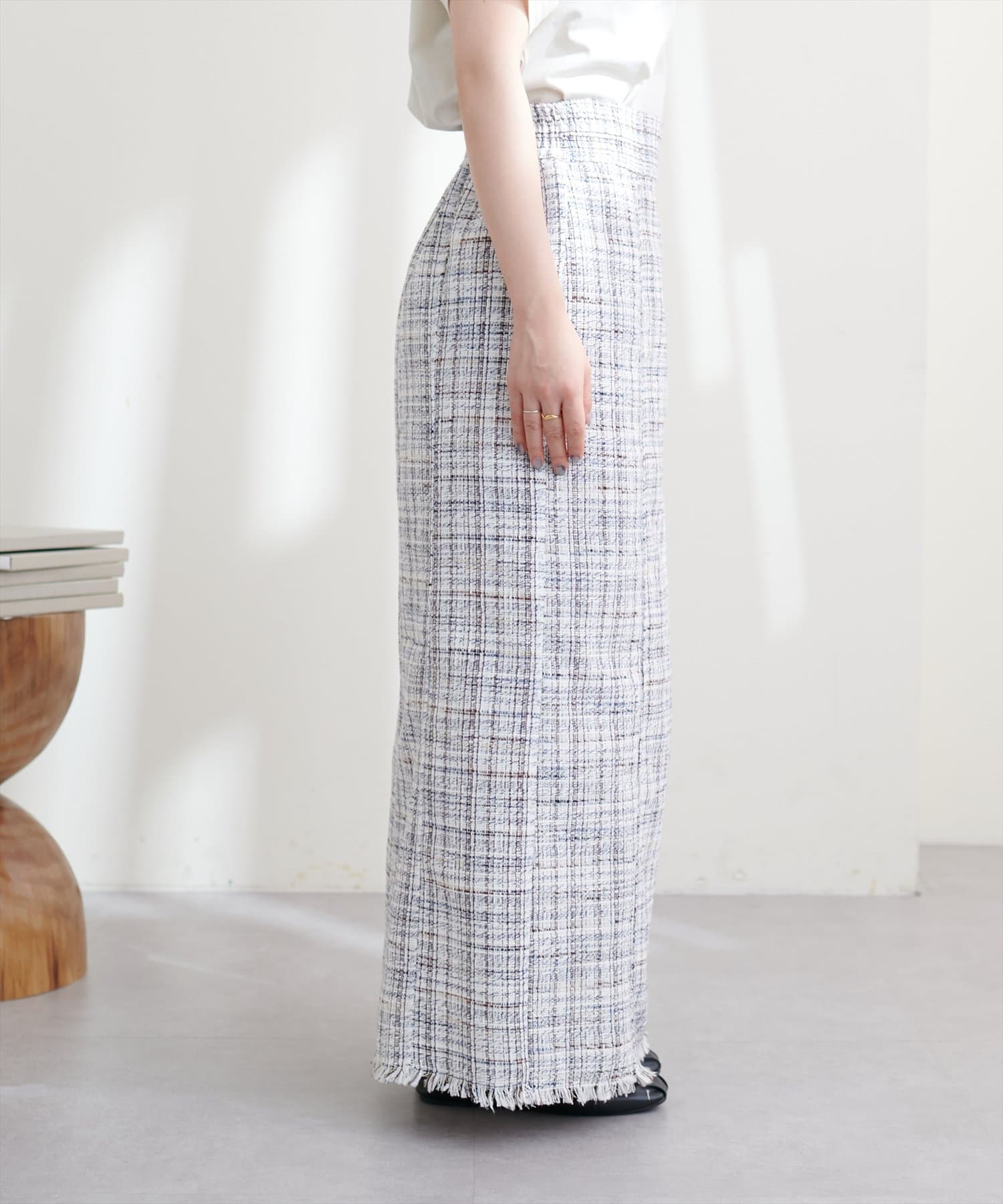 ツイード素材はやわらかく楽に着れるアイテム。青色ベースでのツイードなので、甘めスタイルではないお仕事コーデとしても