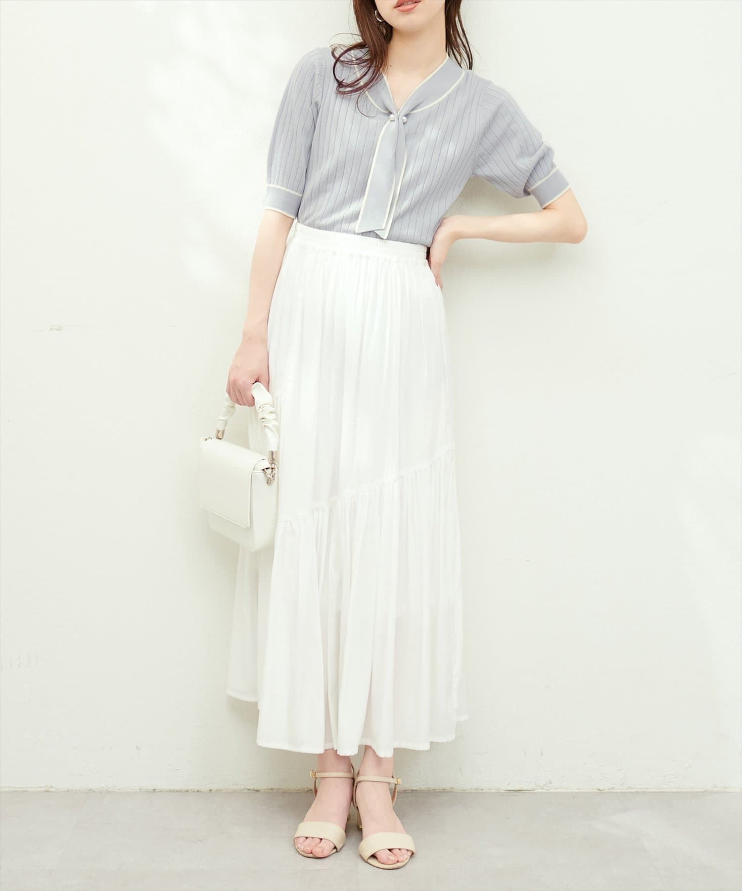 アシンメトリーに切り替えられたフリルデザインが、動くたびにフェミニンなアクセントをプラスしてくれます。