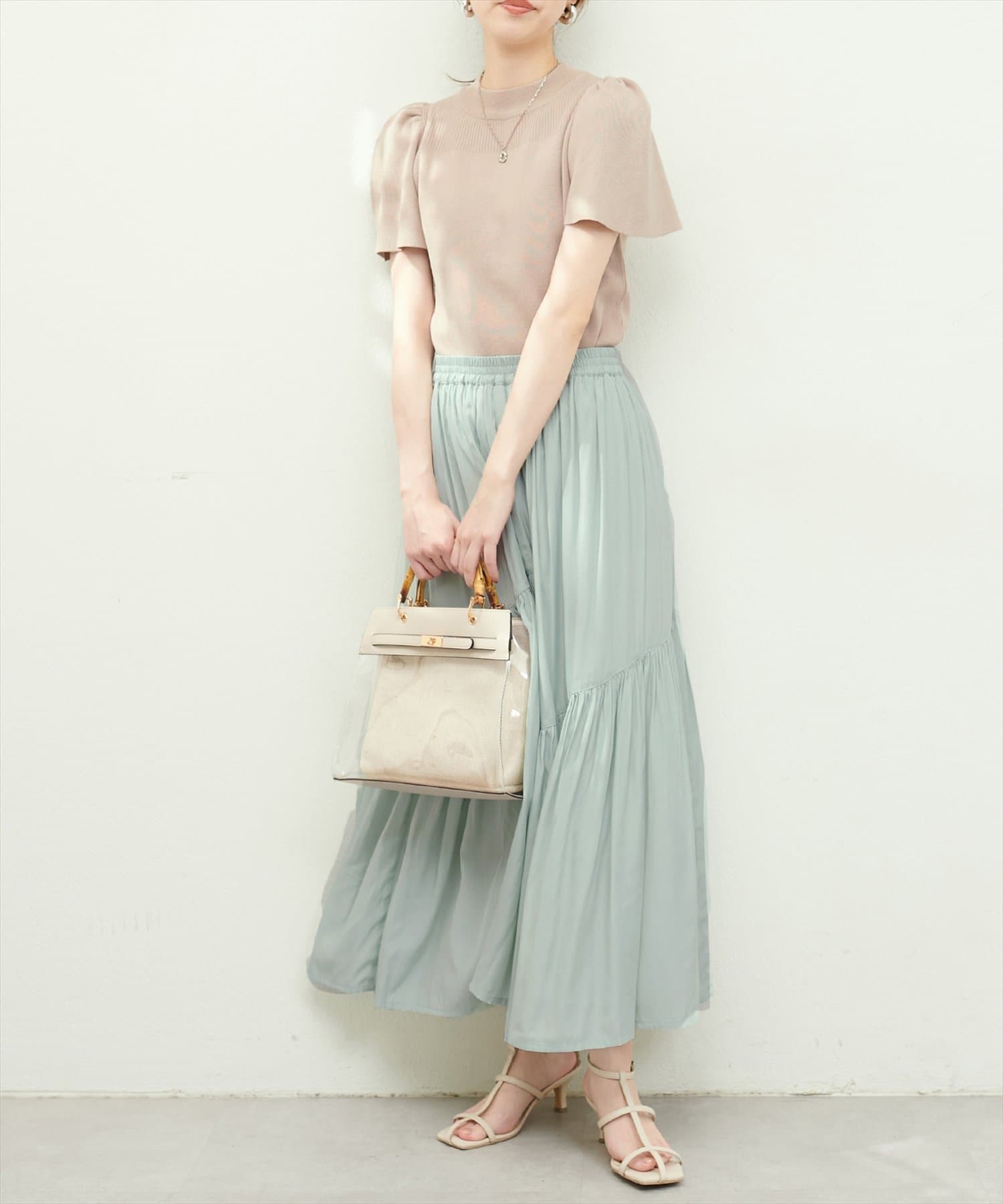 程よくフィット感のあるリブニットやシンプルなTシャツ、袖にディティールのあるコットン素材のブラウスやレーストップスとは特に相性抜群◎