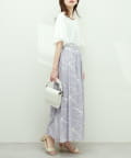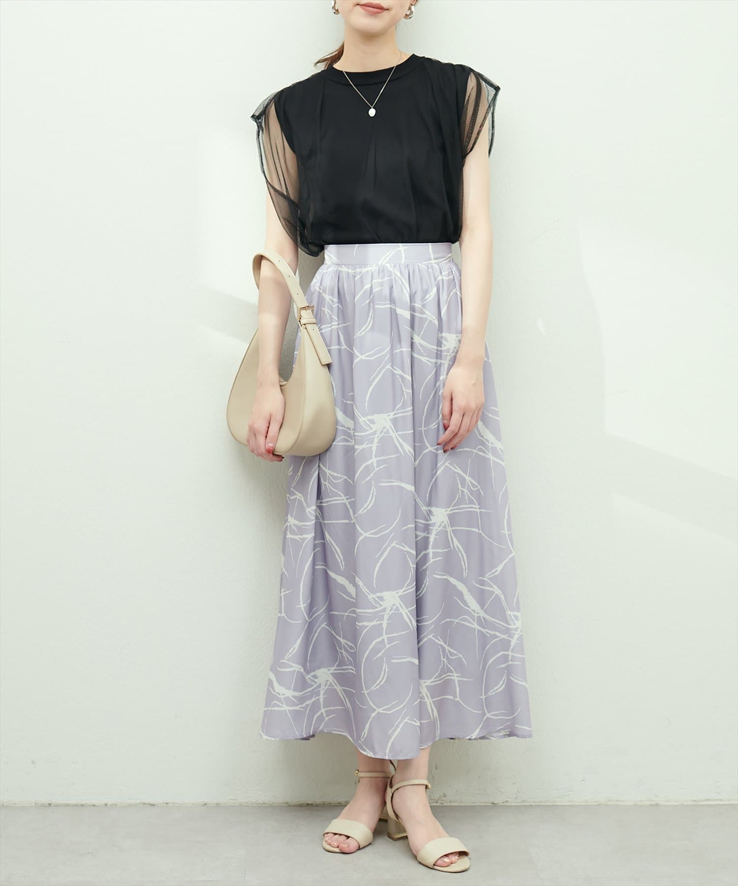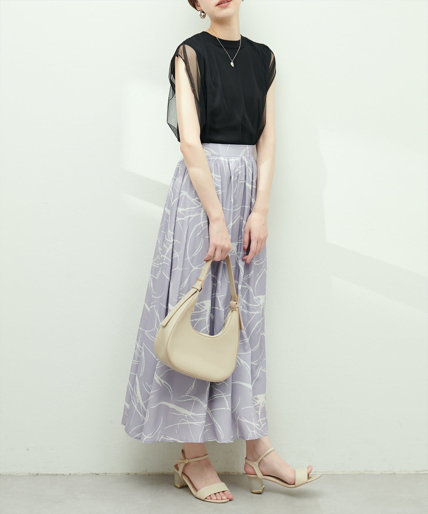ウエストにギャザーが施されているので、トップスをインして頂くと上品ですっきりとしたスタイリングに。