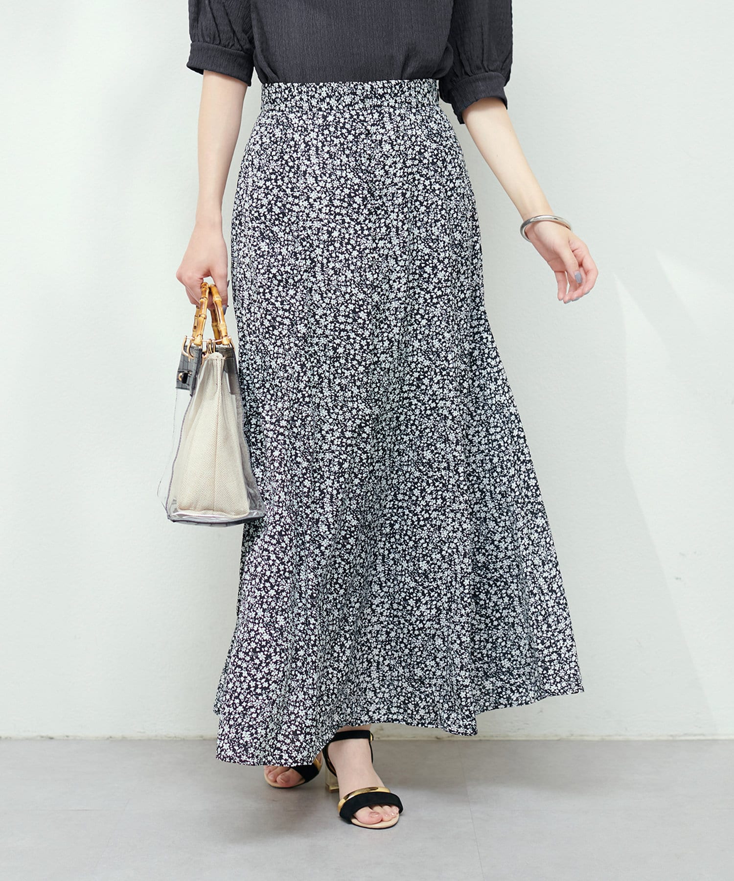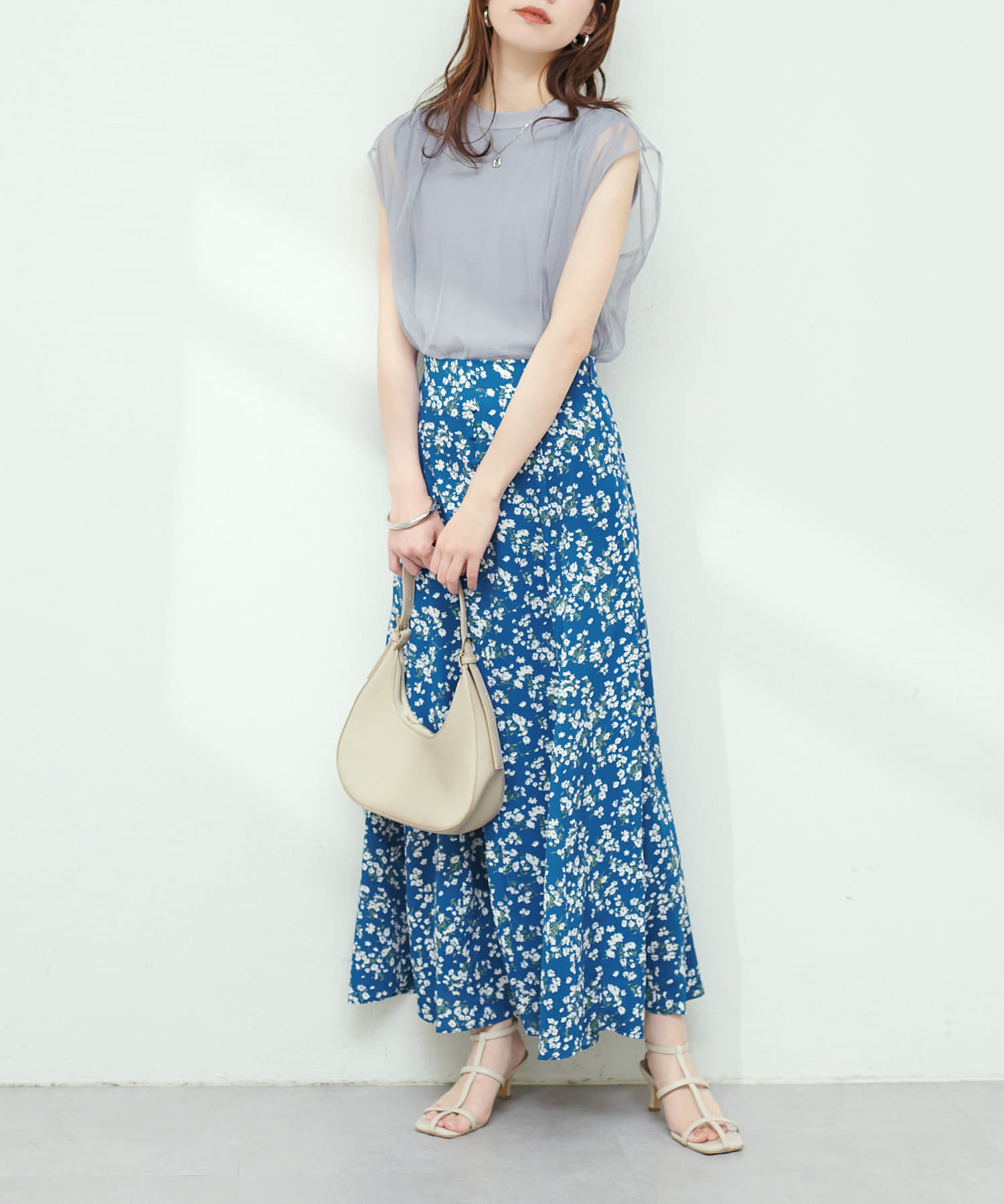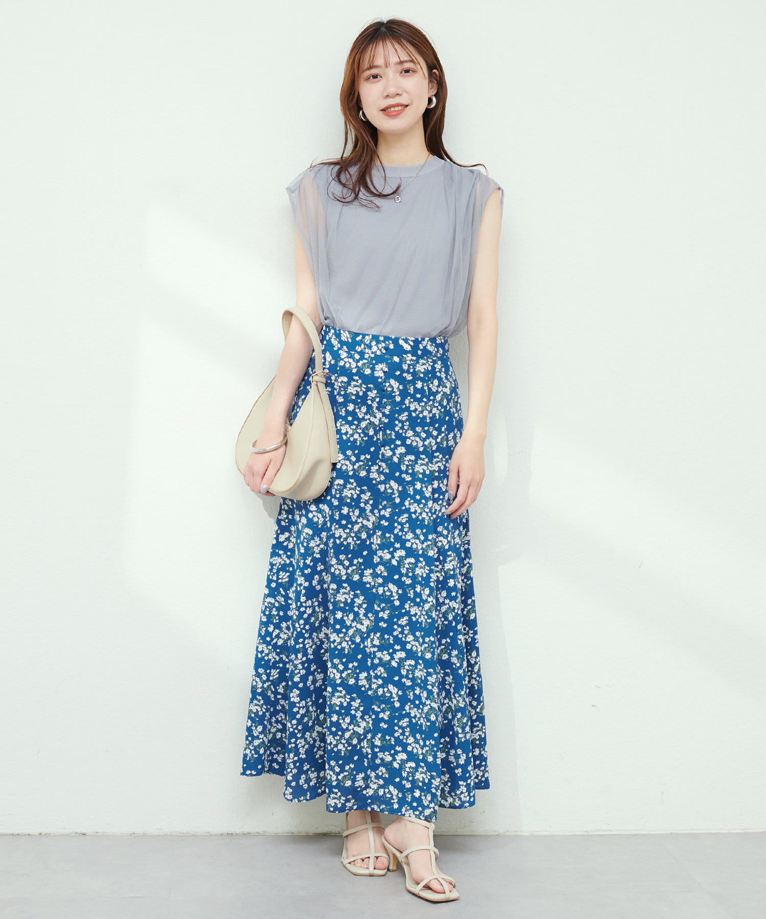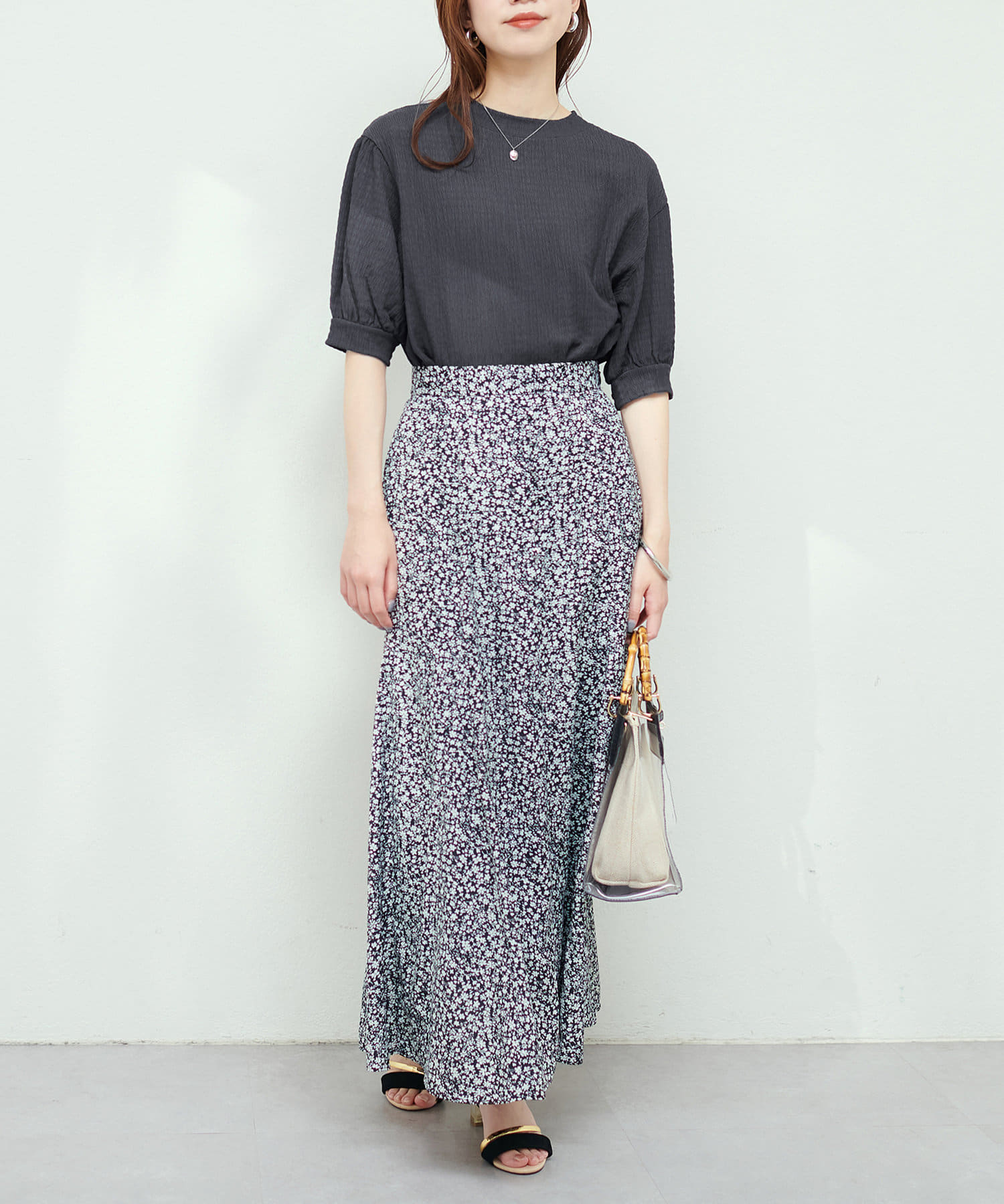 シンプルなトップスをウエストインして、スカートのデザインが引き立つコーデに仕上げたり、