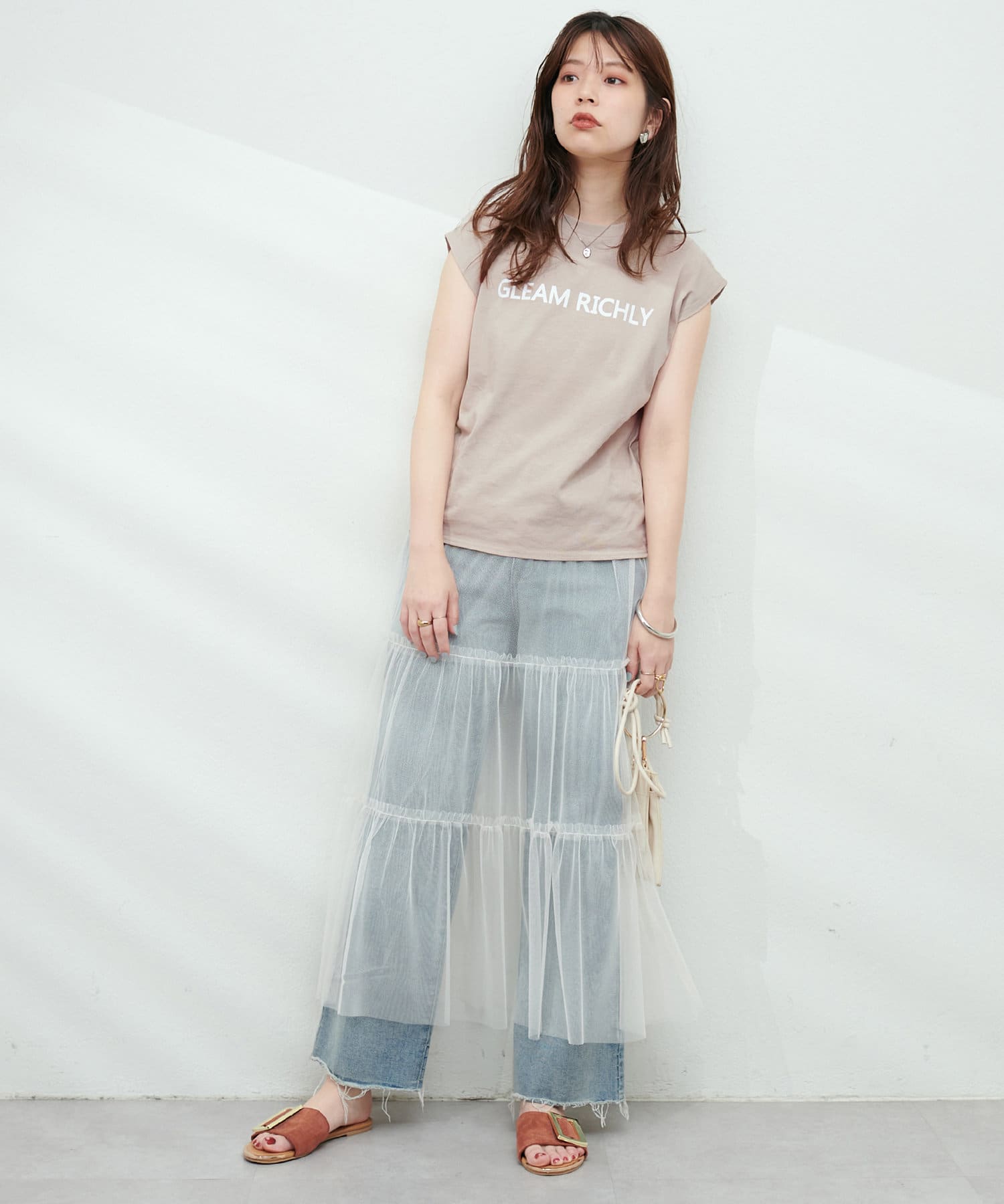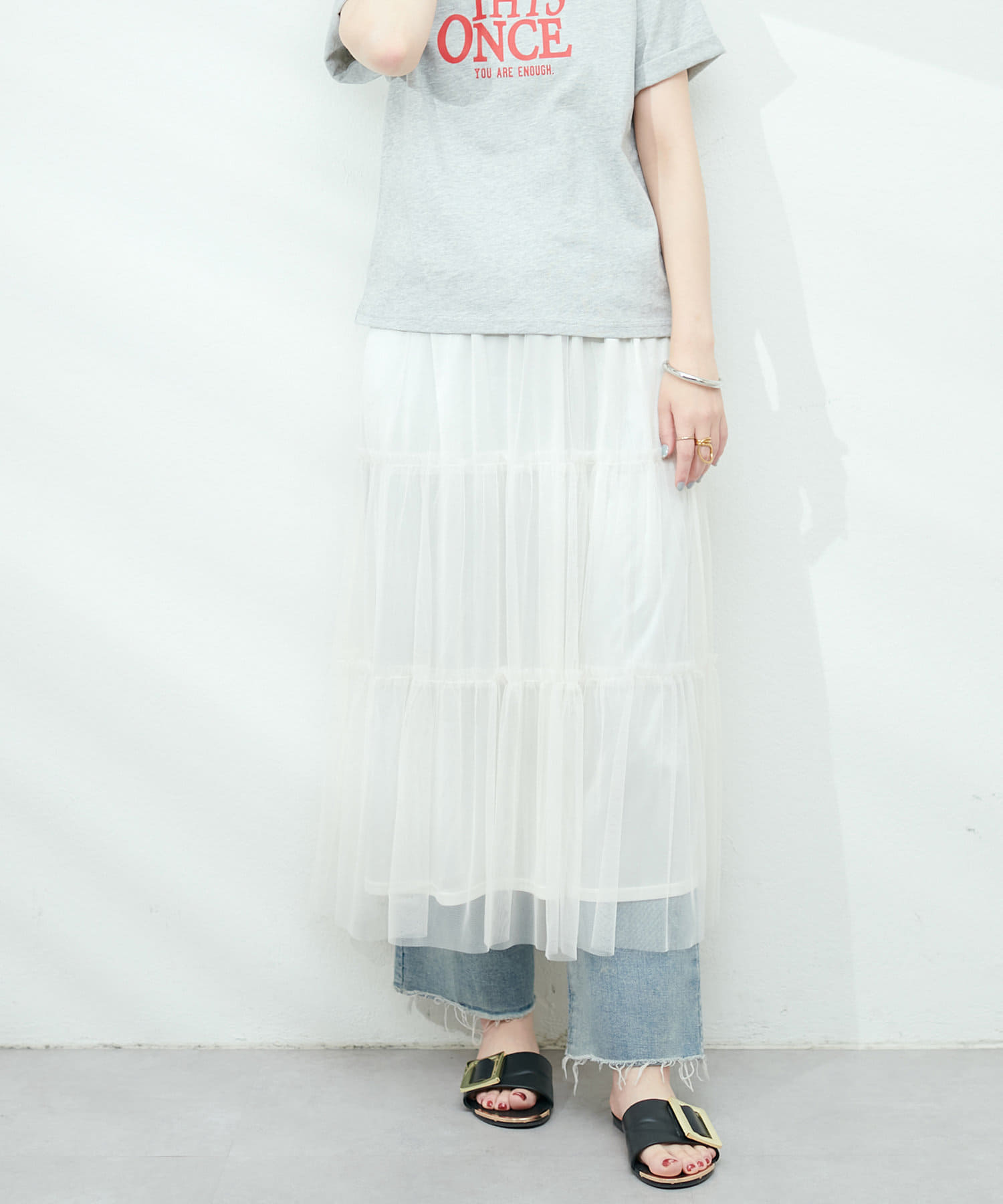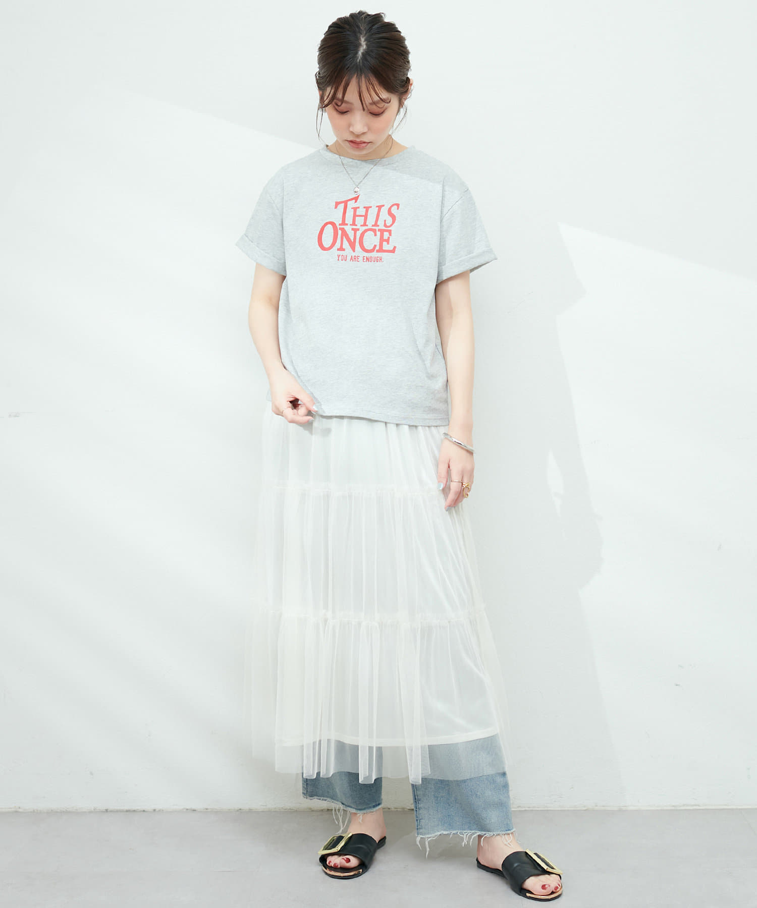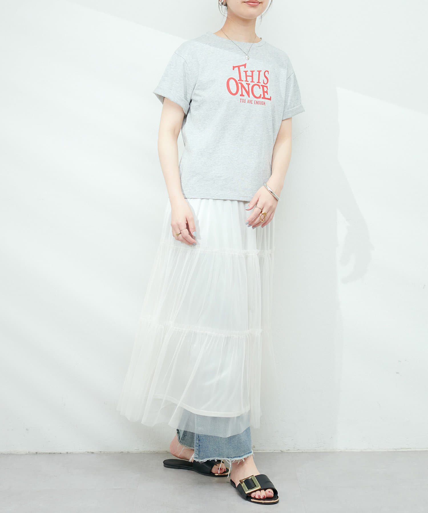 チュールで甘めの印象なので、Tシャツやデニム、スニーカーと合わせてカジュアルダウンさせたり、