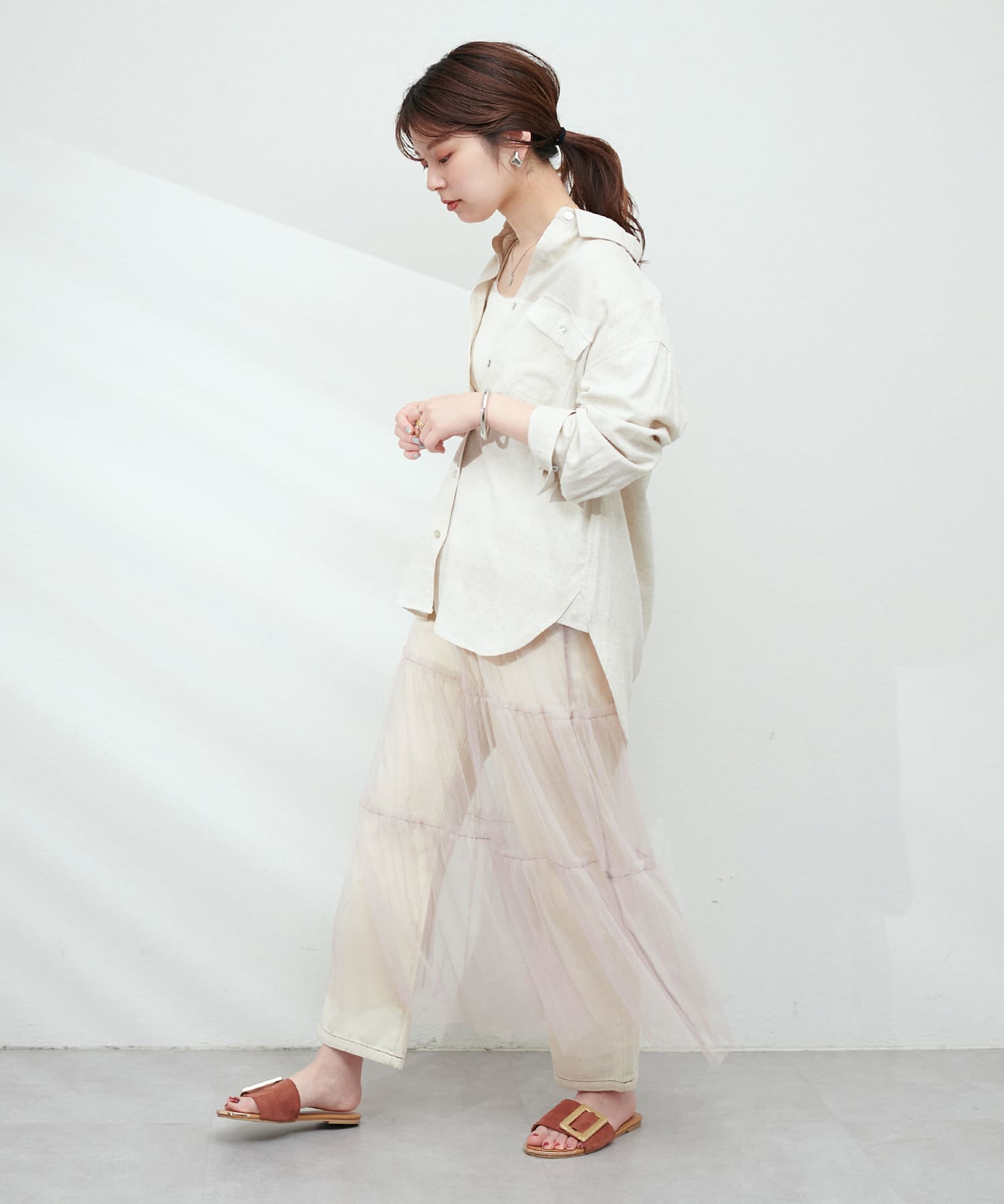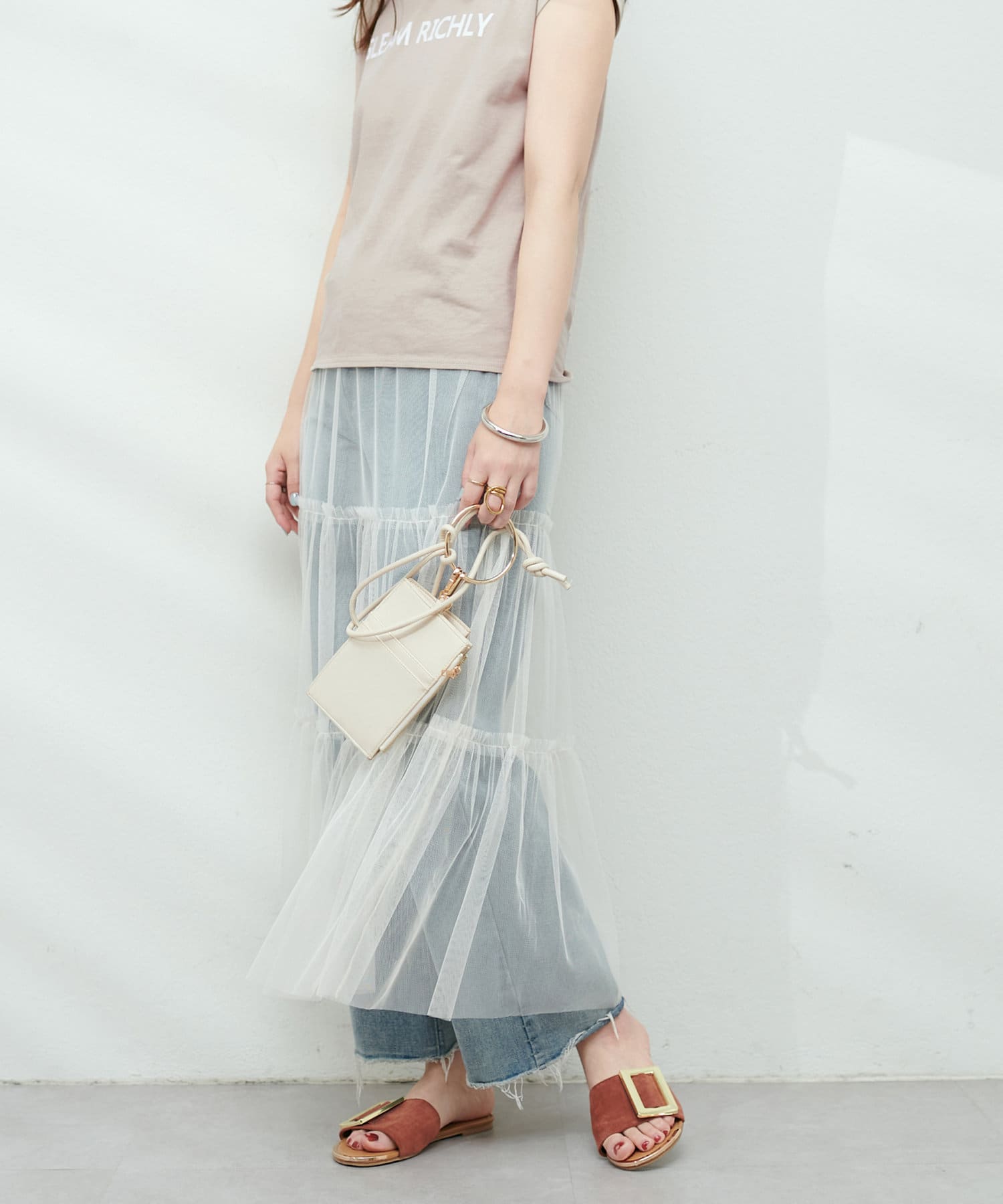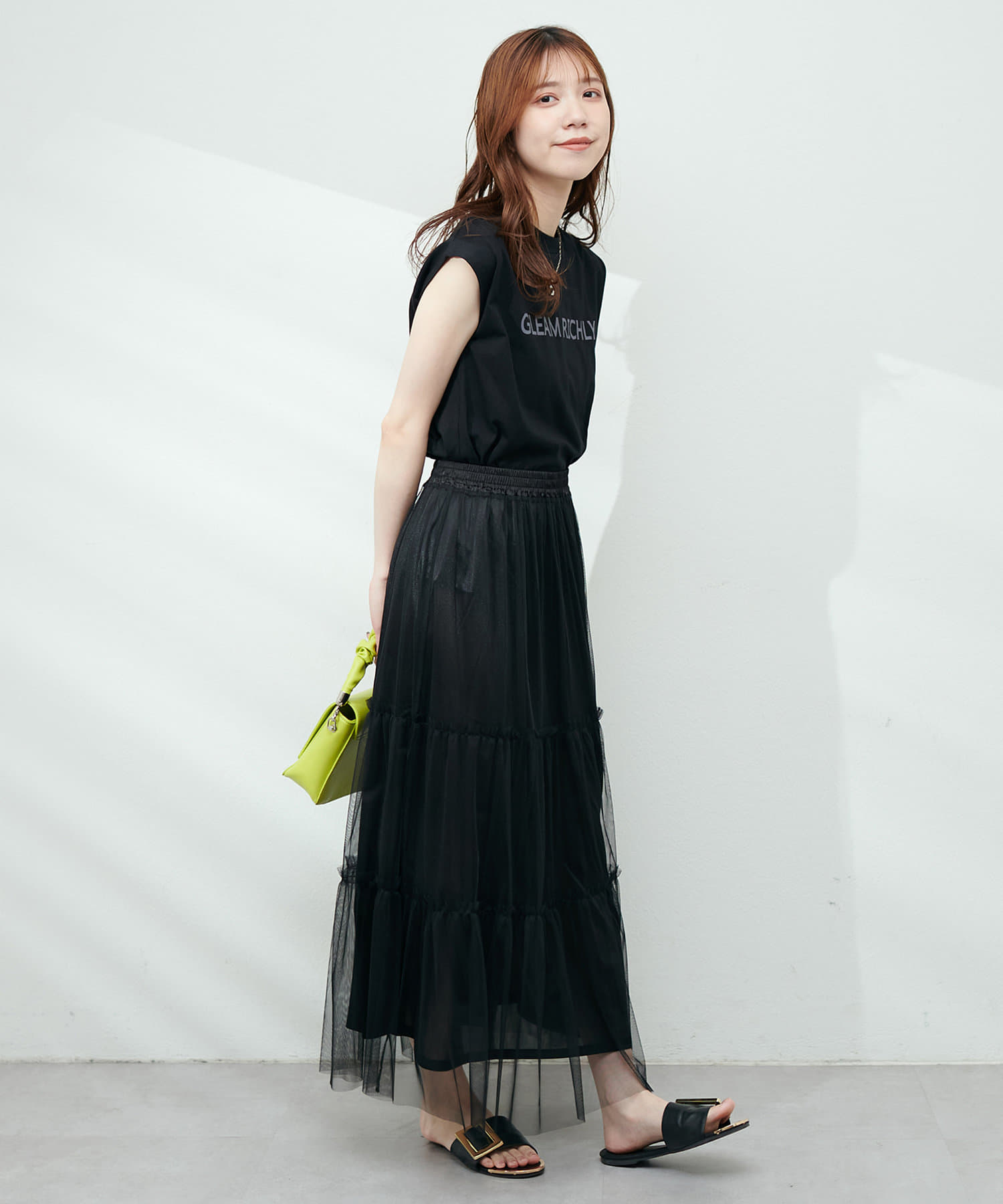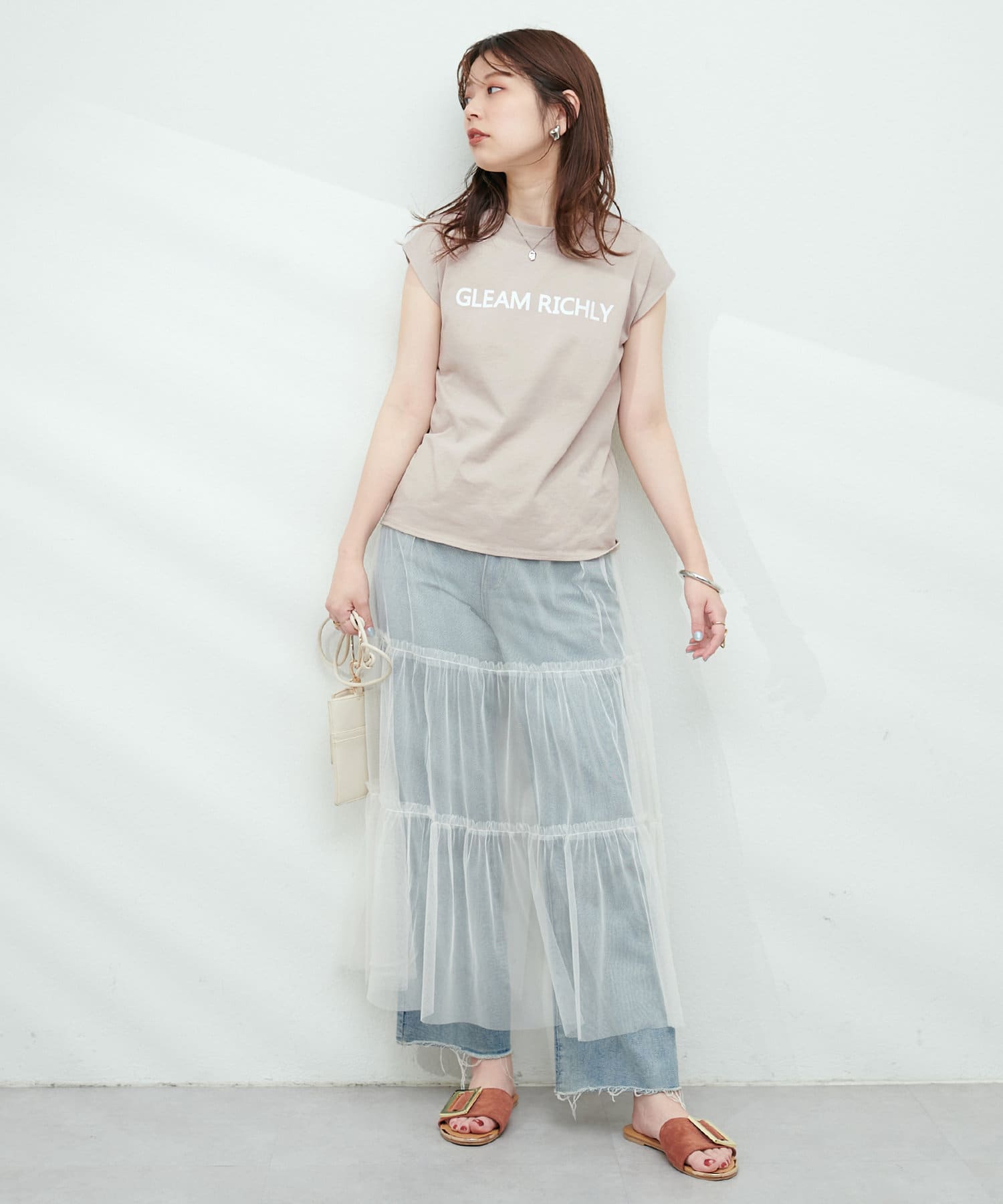 チュールで甘めの印象なので、Tシャツやデニム、スニーカーと合わせてカジュアルダウンさせたり、