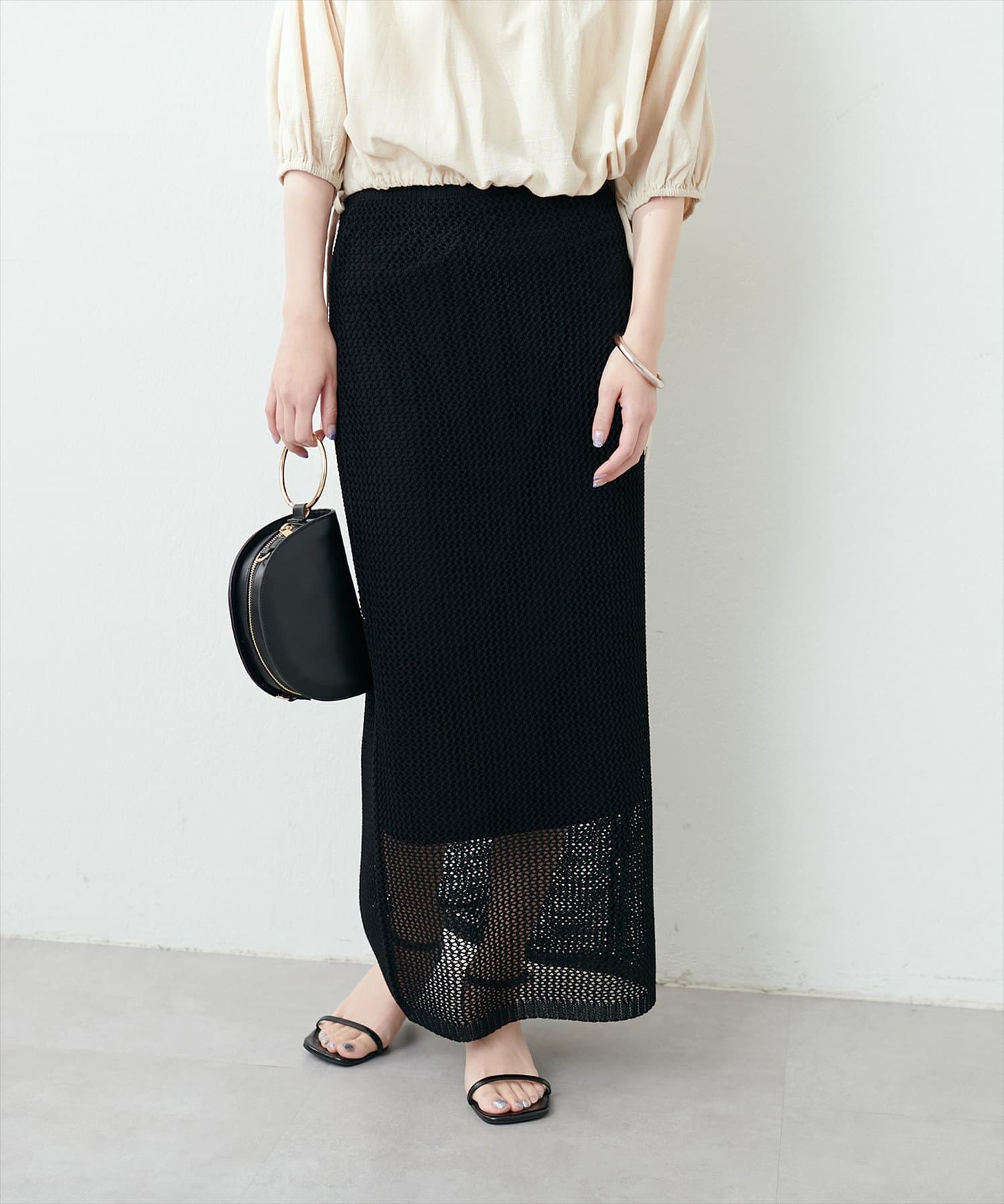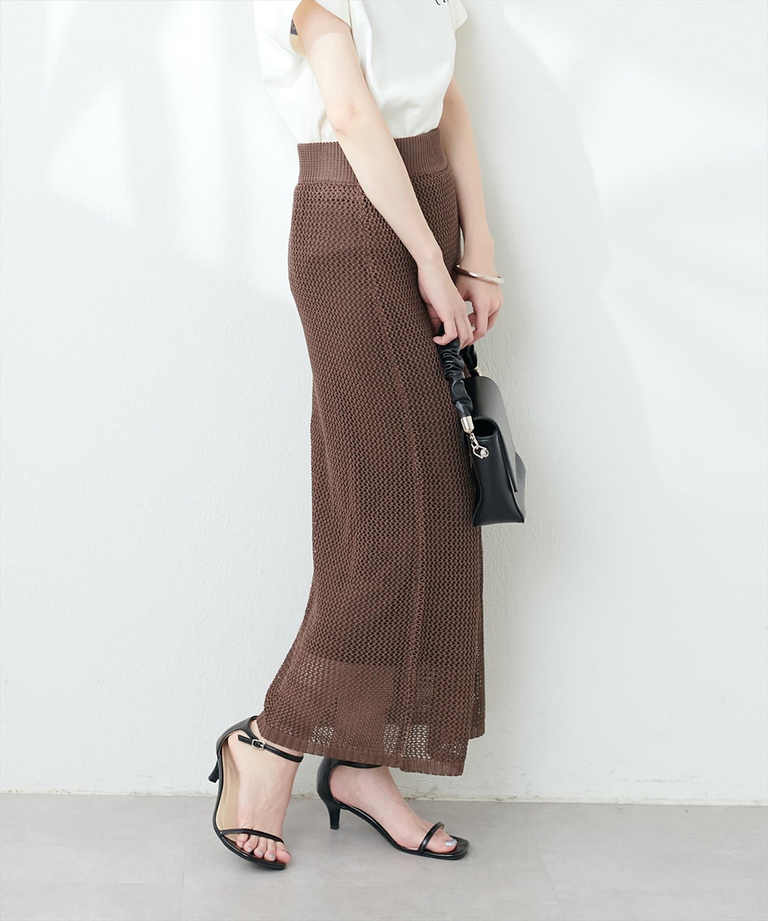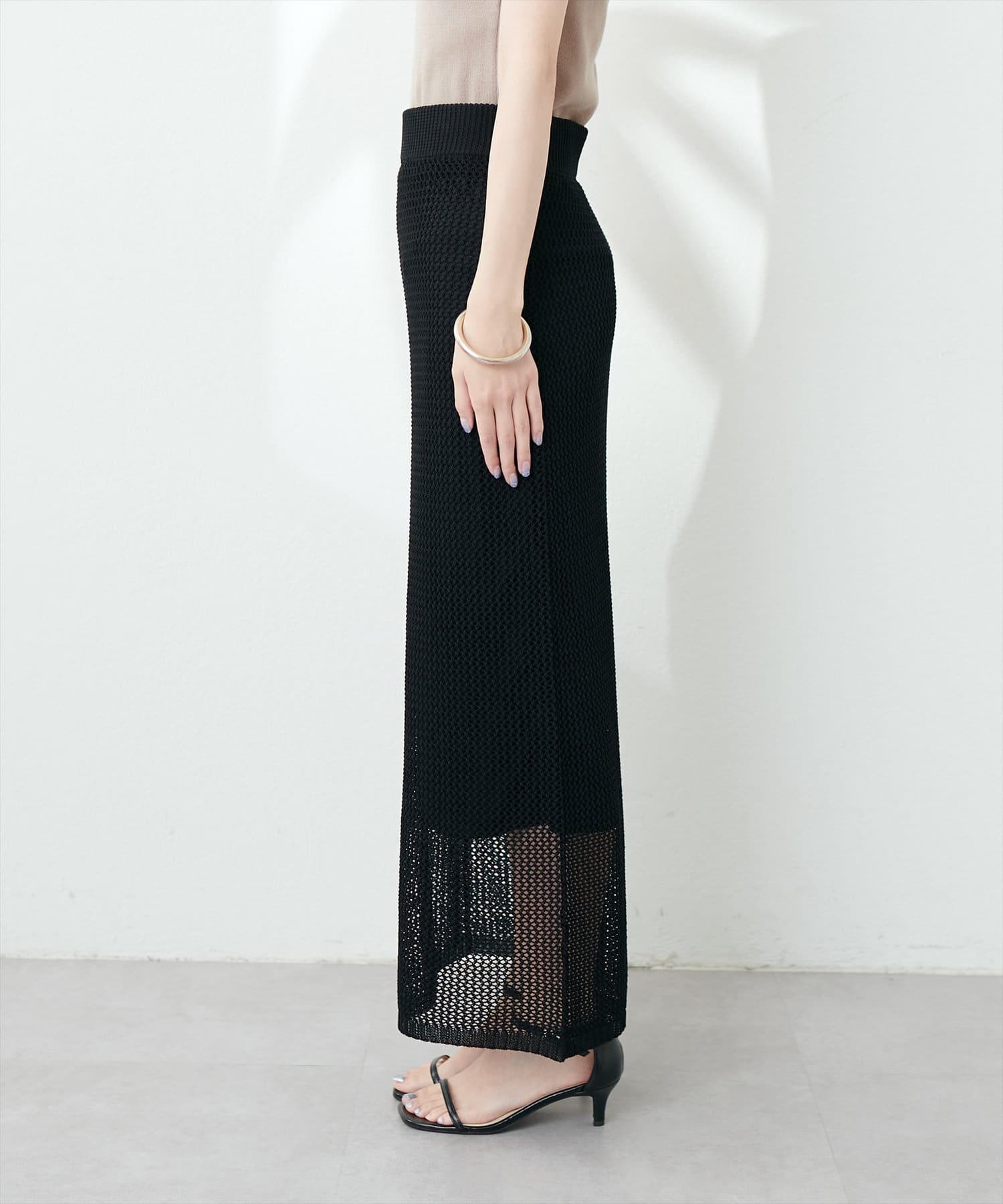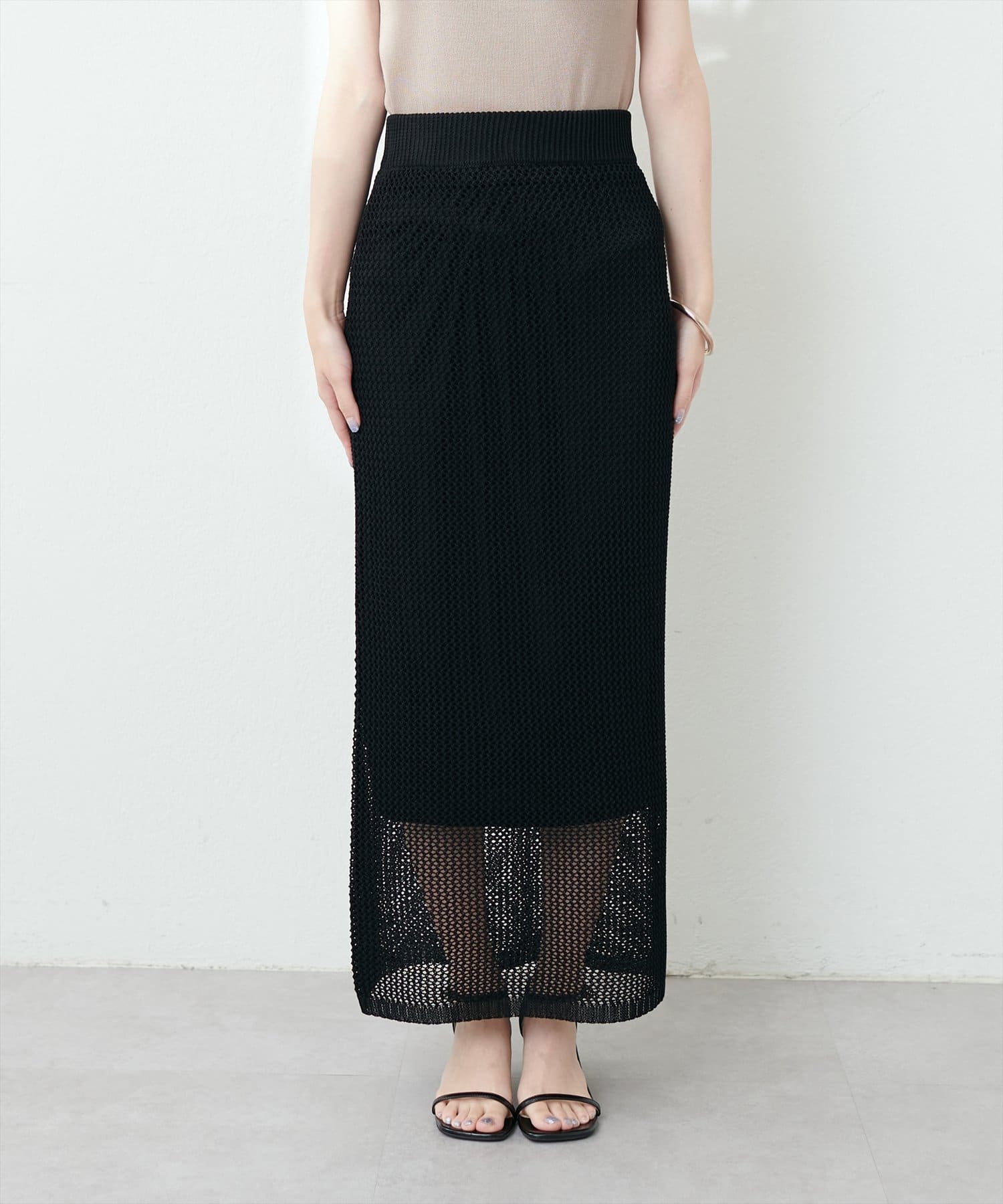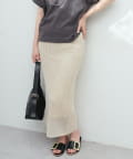 モードな印象と女性らしいナチュラルな抜け感が手に入るメッシュ編みニットスカート。