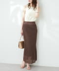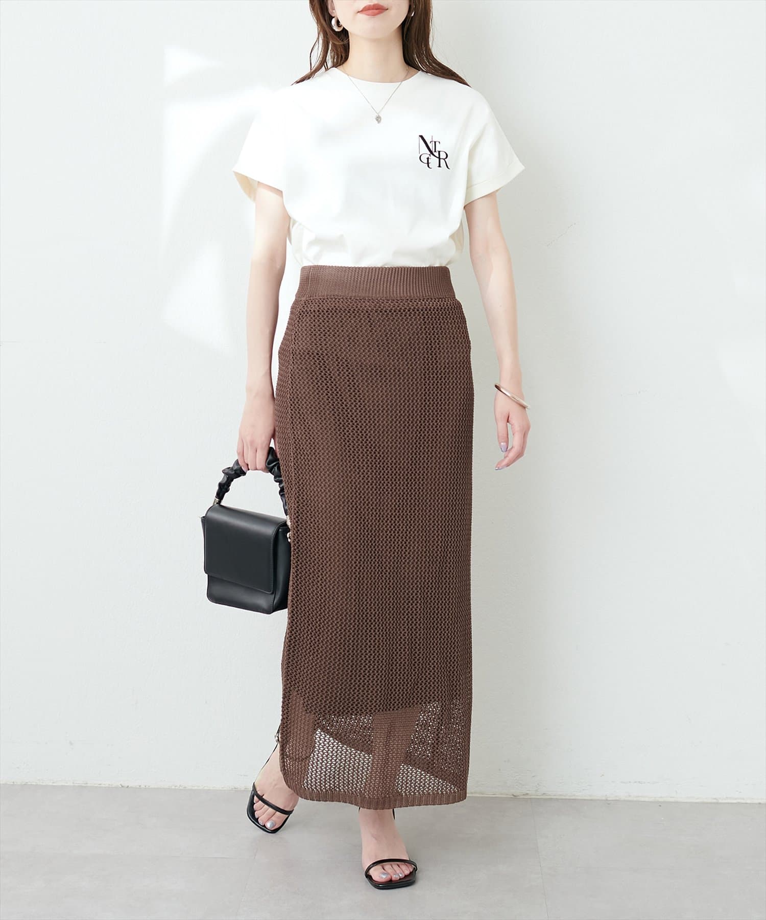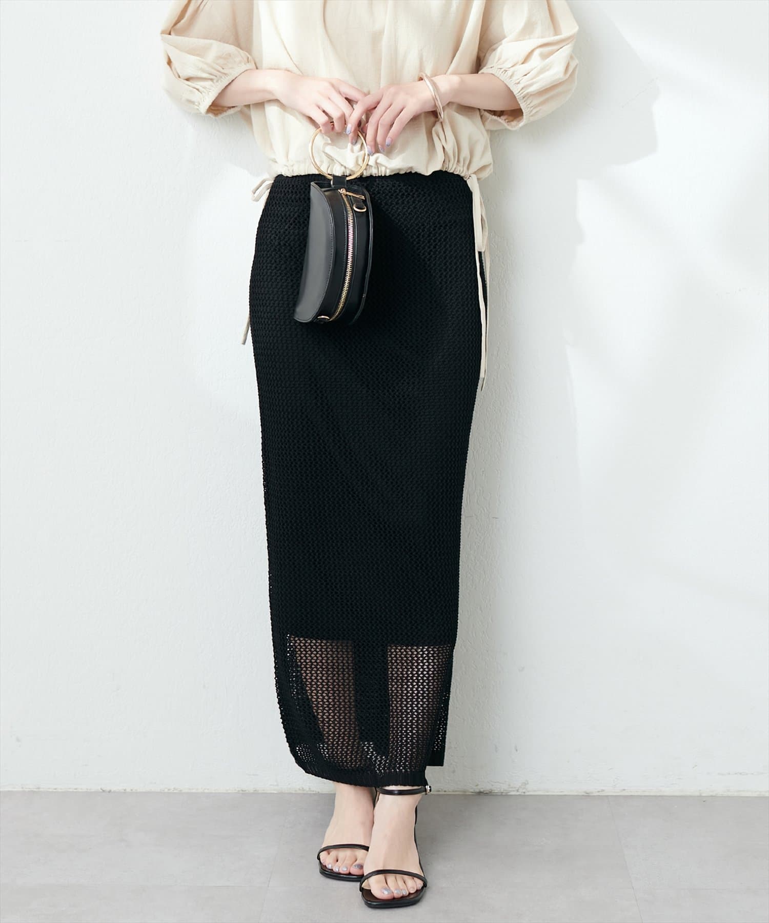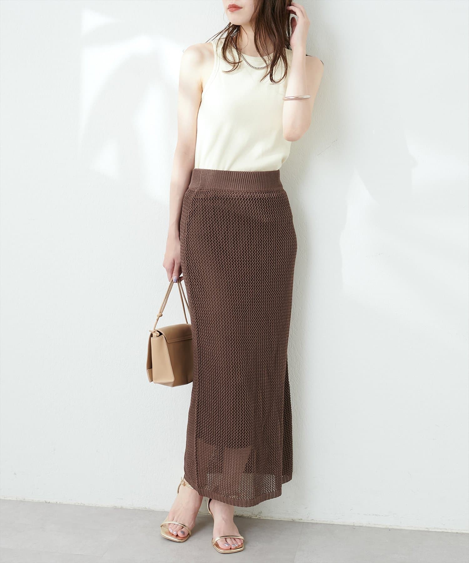 モードな印象と女性らしいナチュラルな抜け感が手に入るメッシュ編みニットスカート。