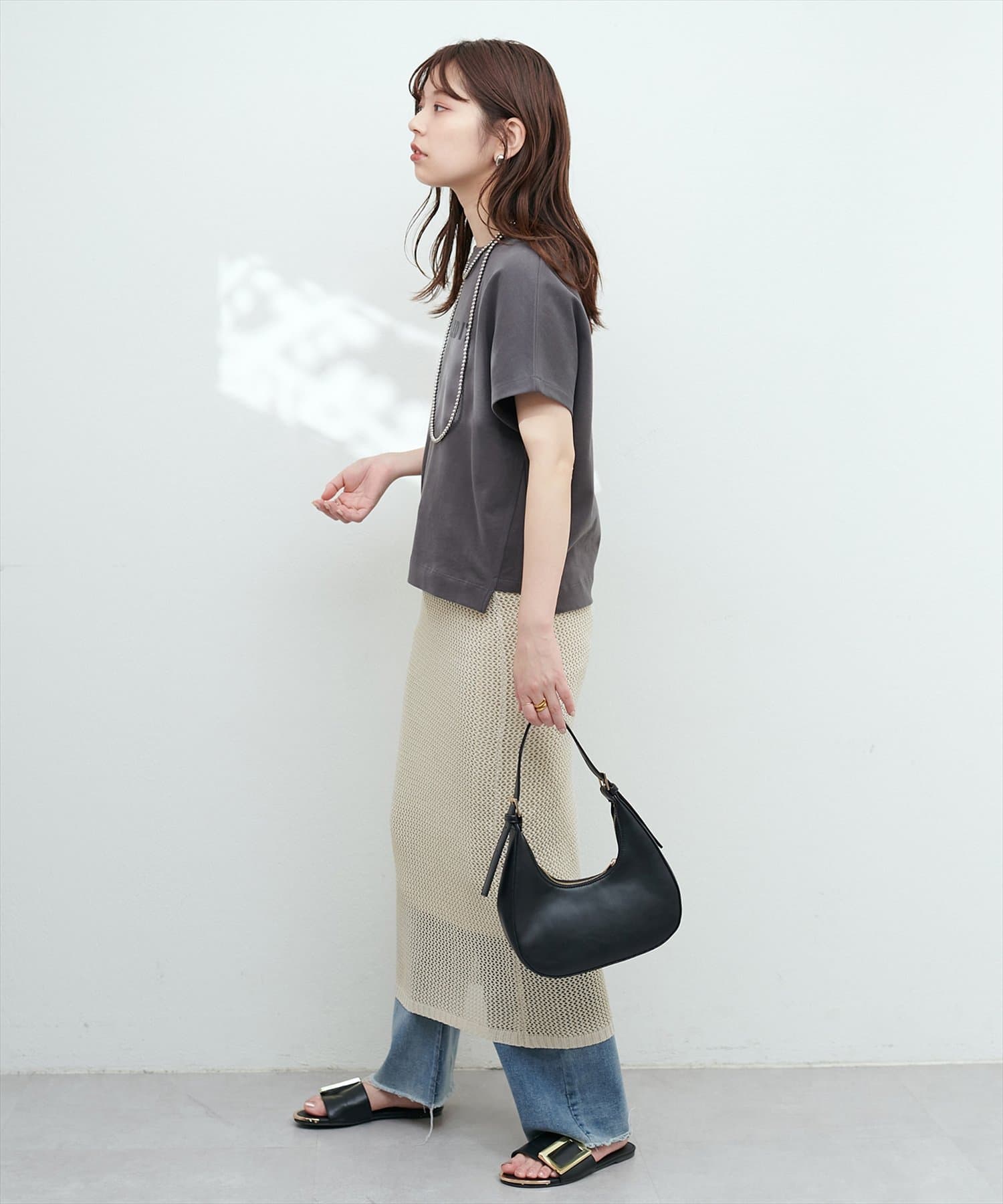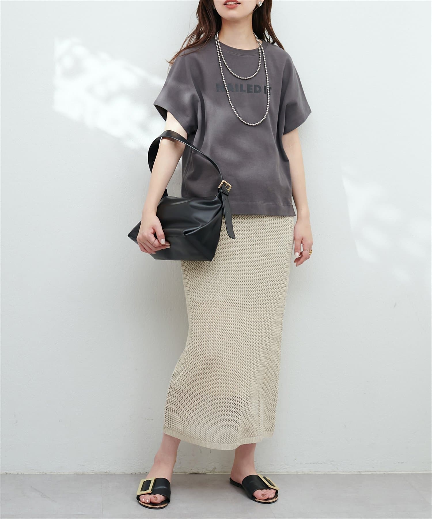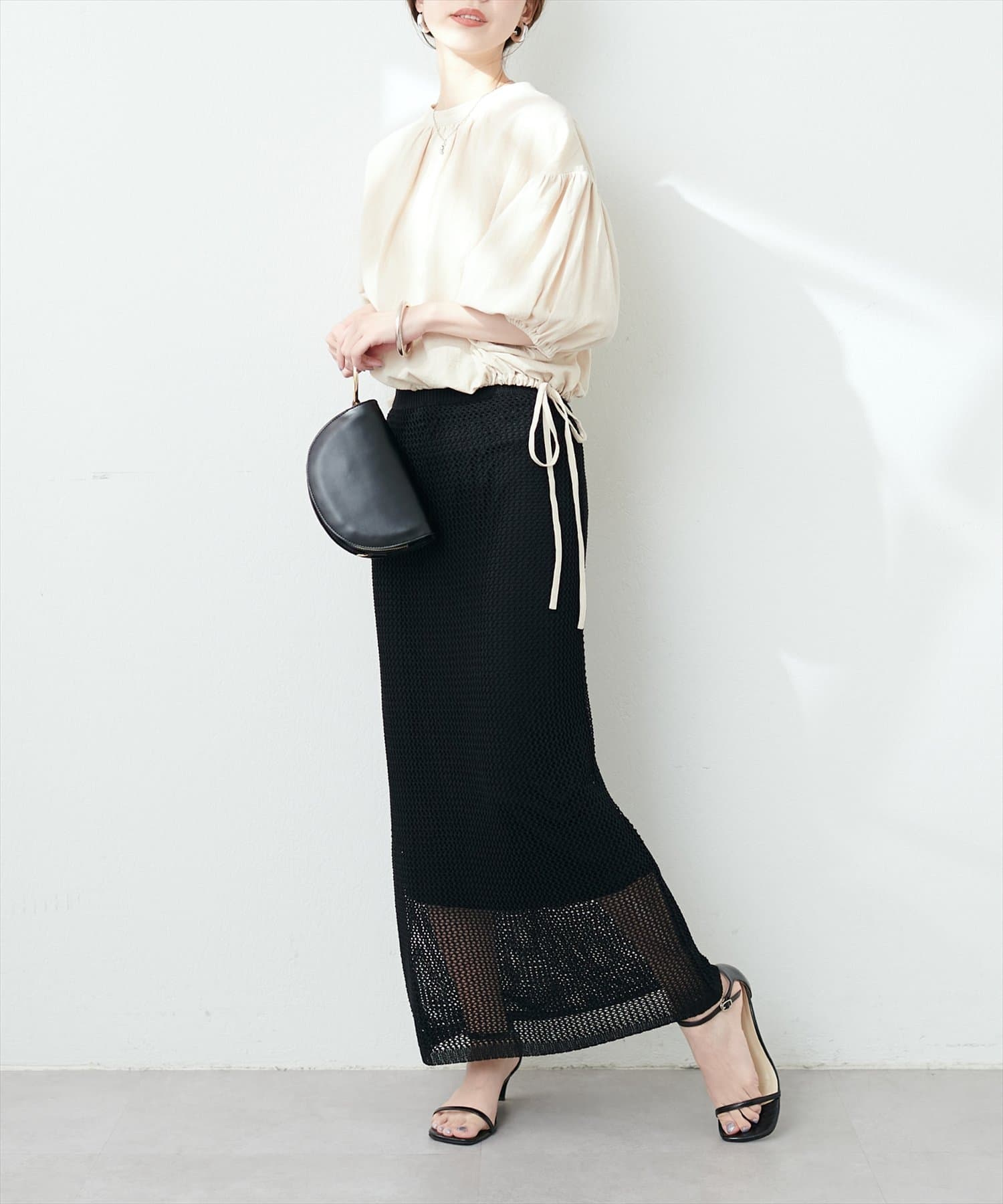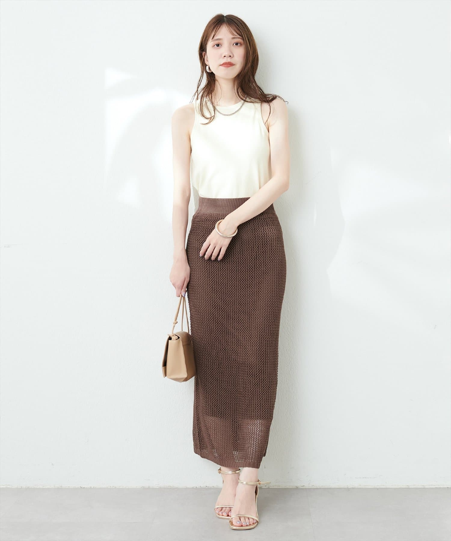 モードな印象と女性らしいナチュラルな抜け感が手に入るメッシュ編みニットスカート。