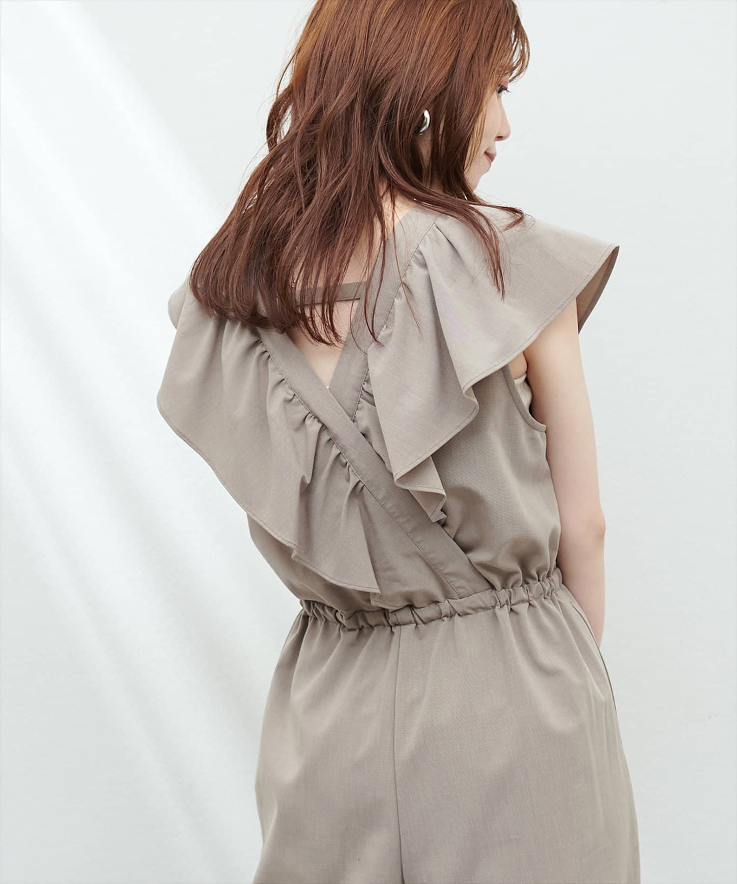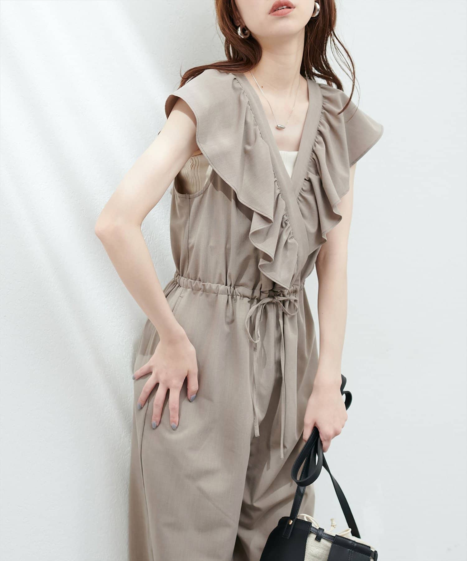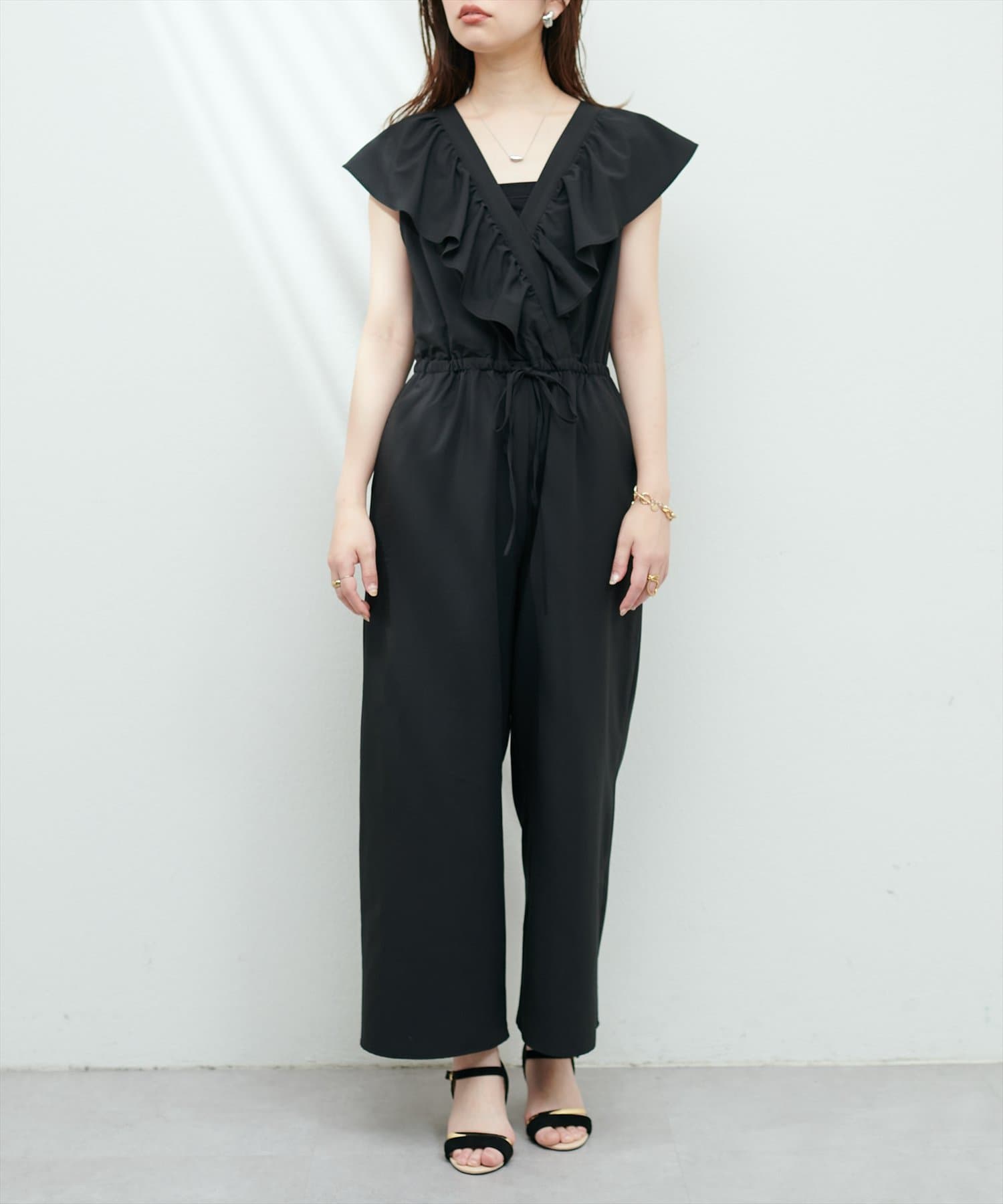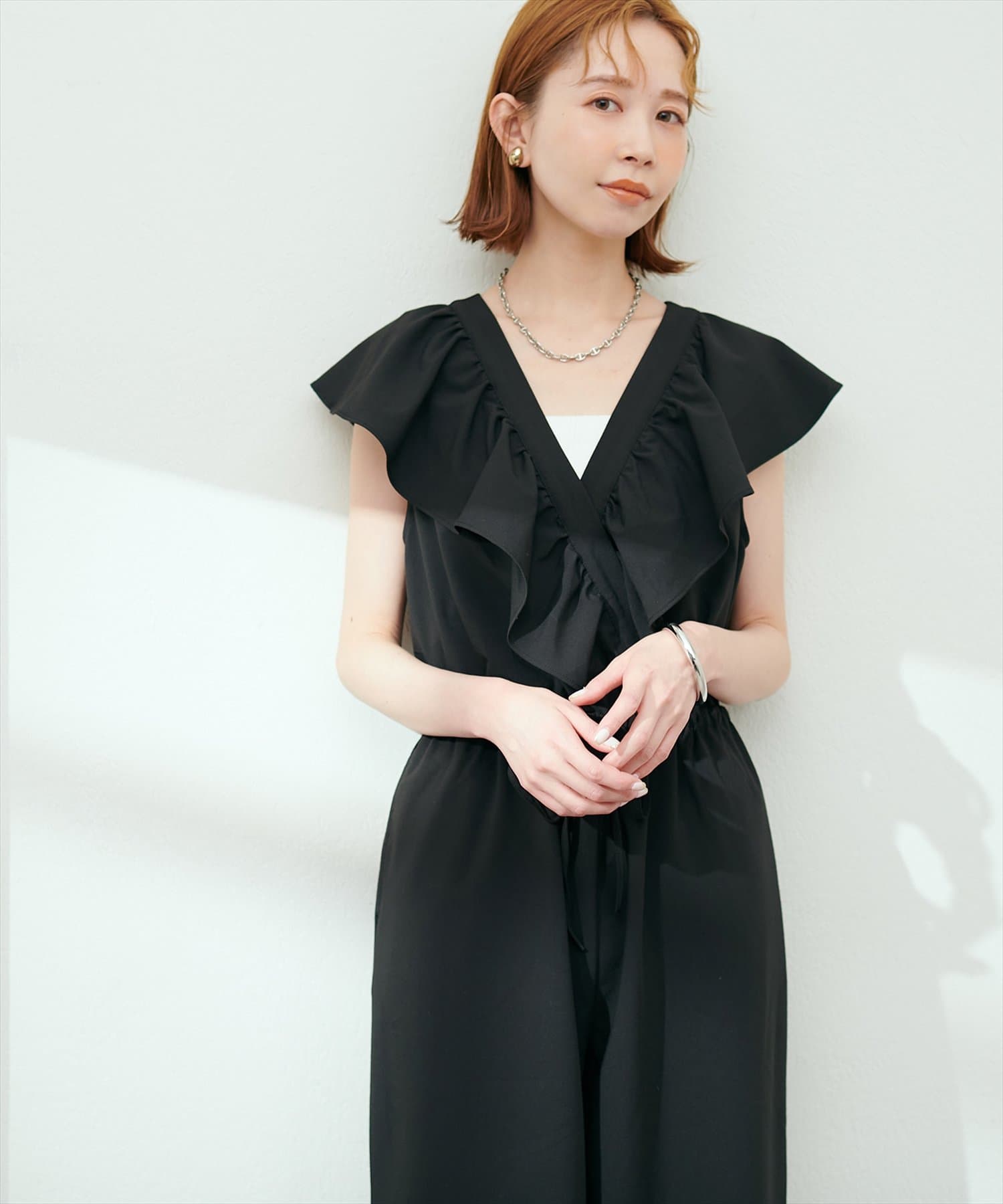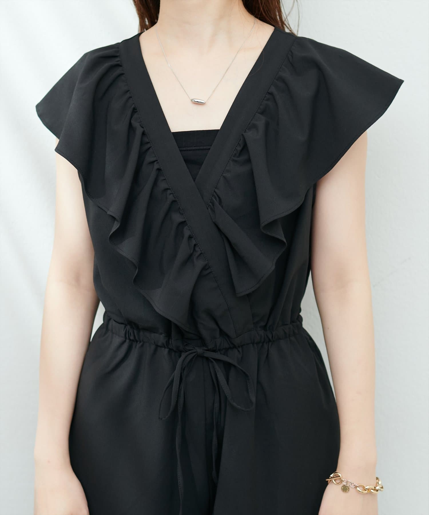 カシュクールデザインに大胆なフリルを施したフェミニンなサロペット。