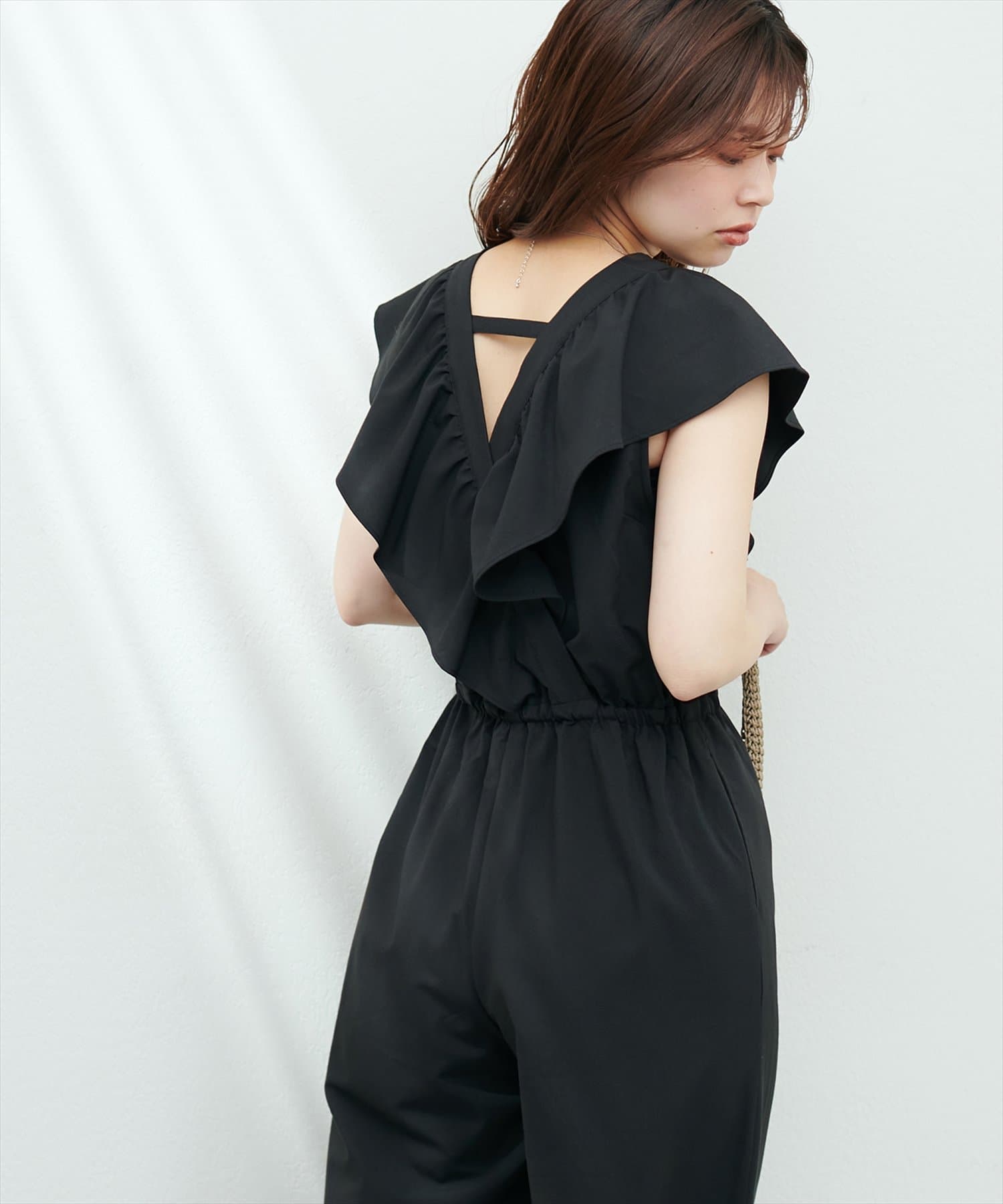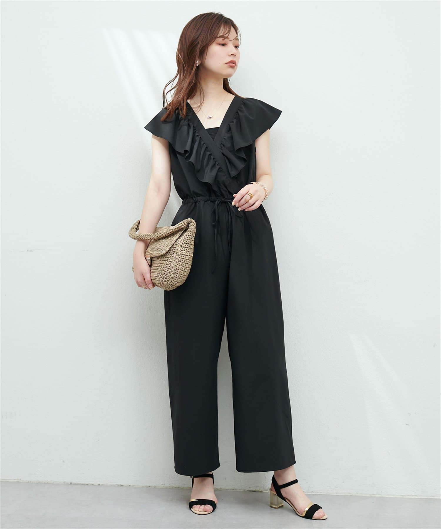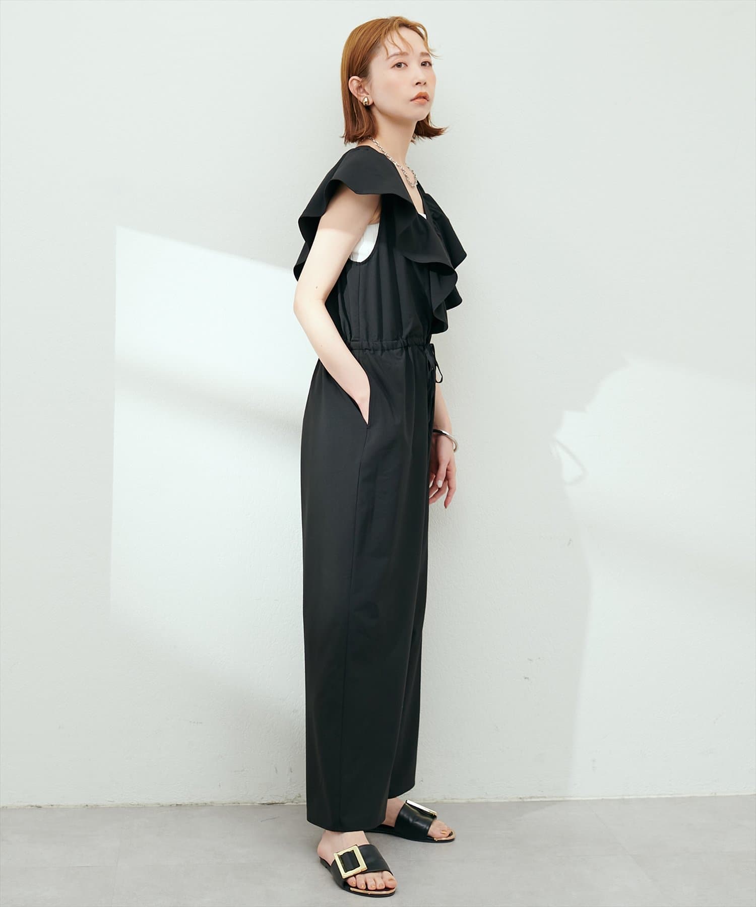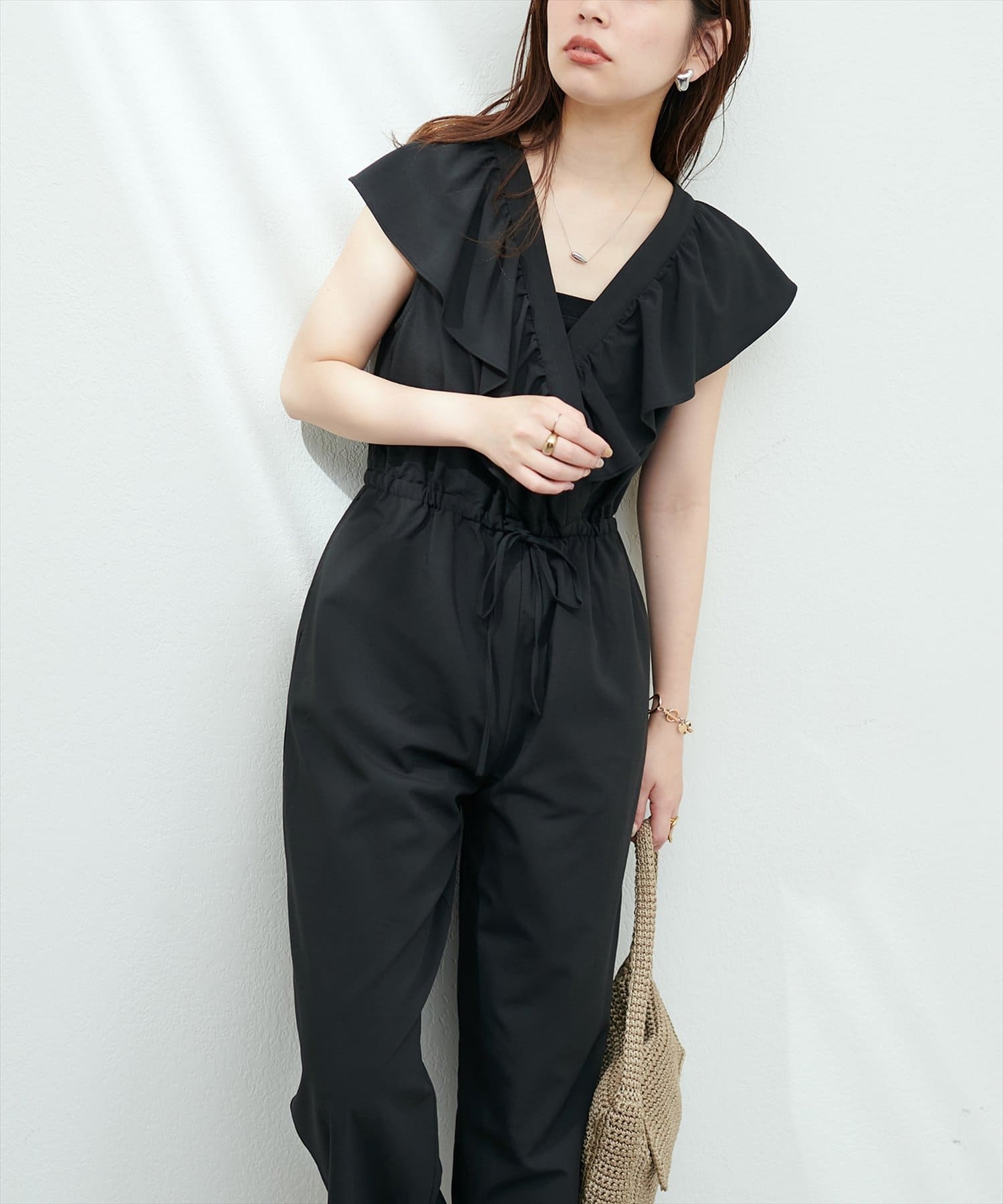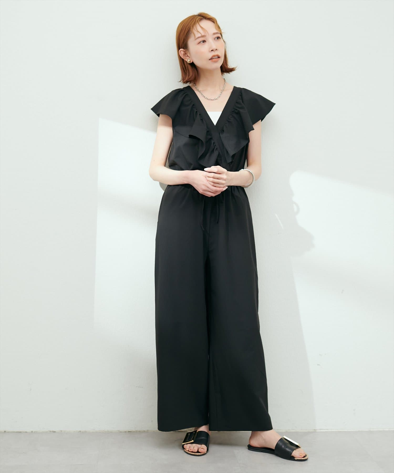 カシュクールデザインに大胆なフリルを施したフェミニンなサロペット。