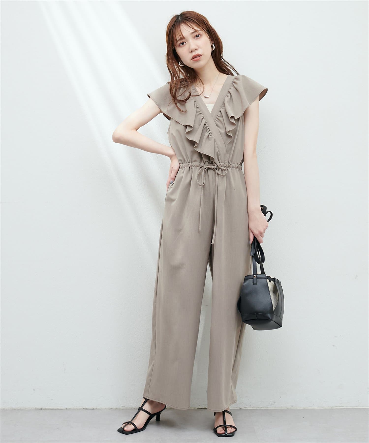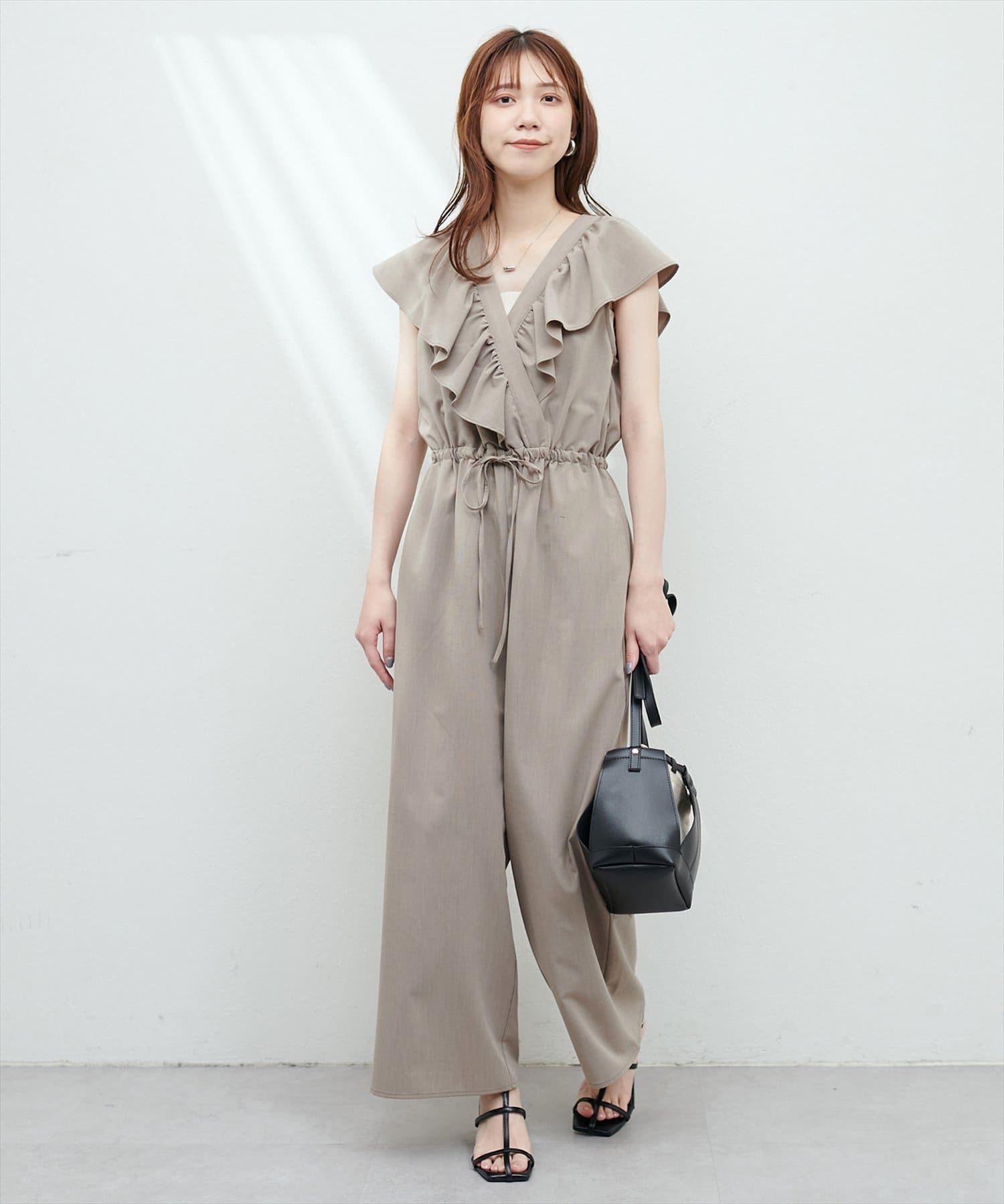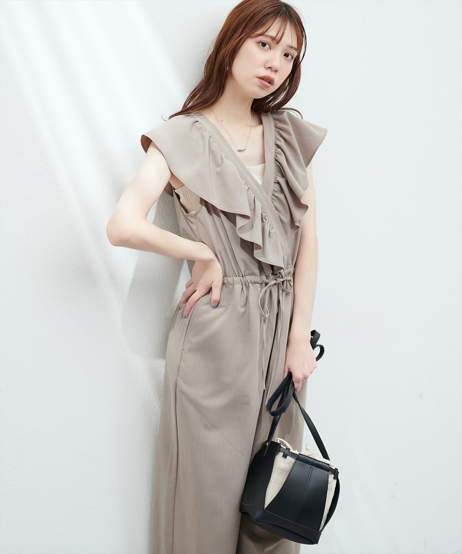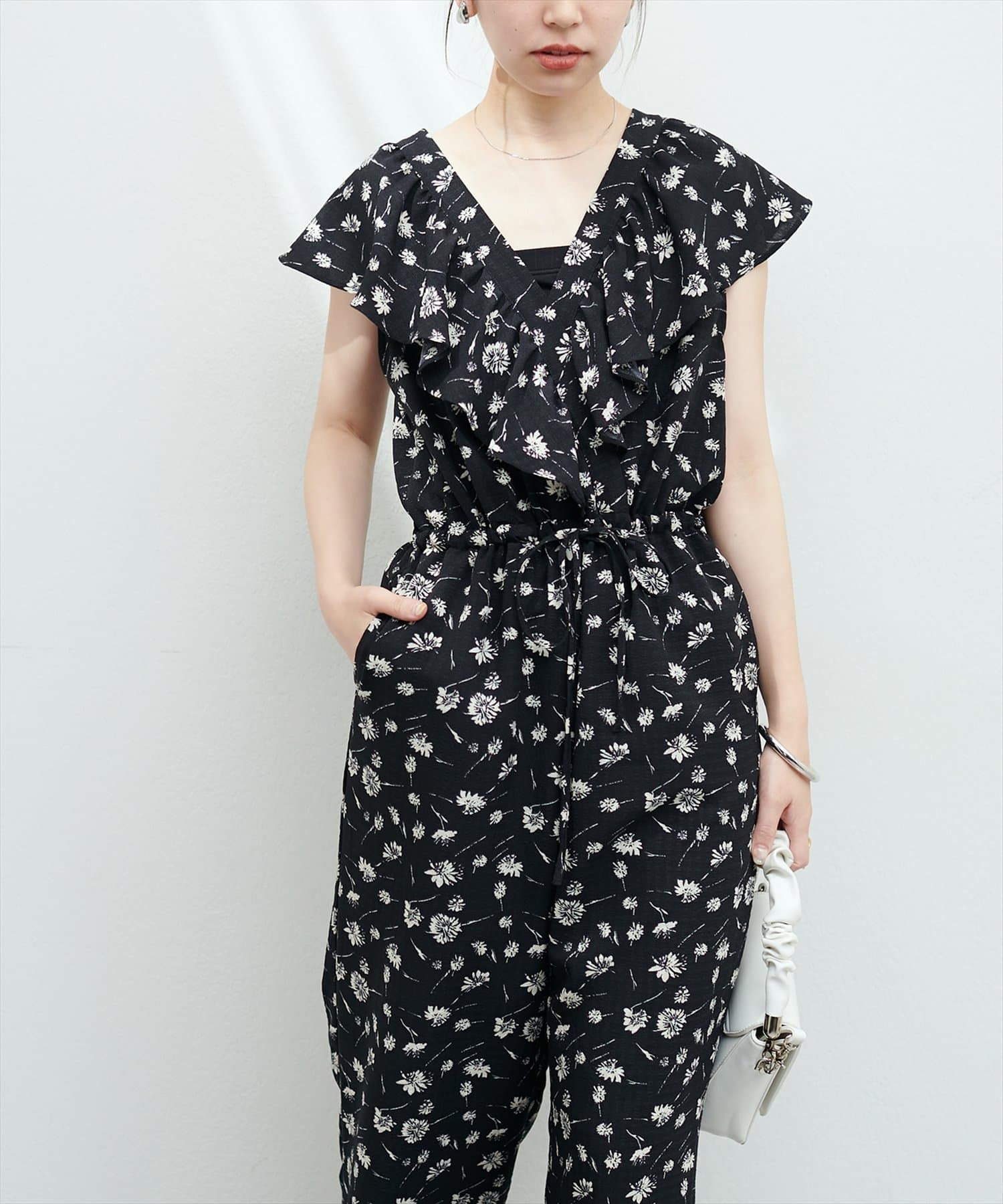 カシュクールデザインに大胆なフリルを施したフェミニンなサロペット。