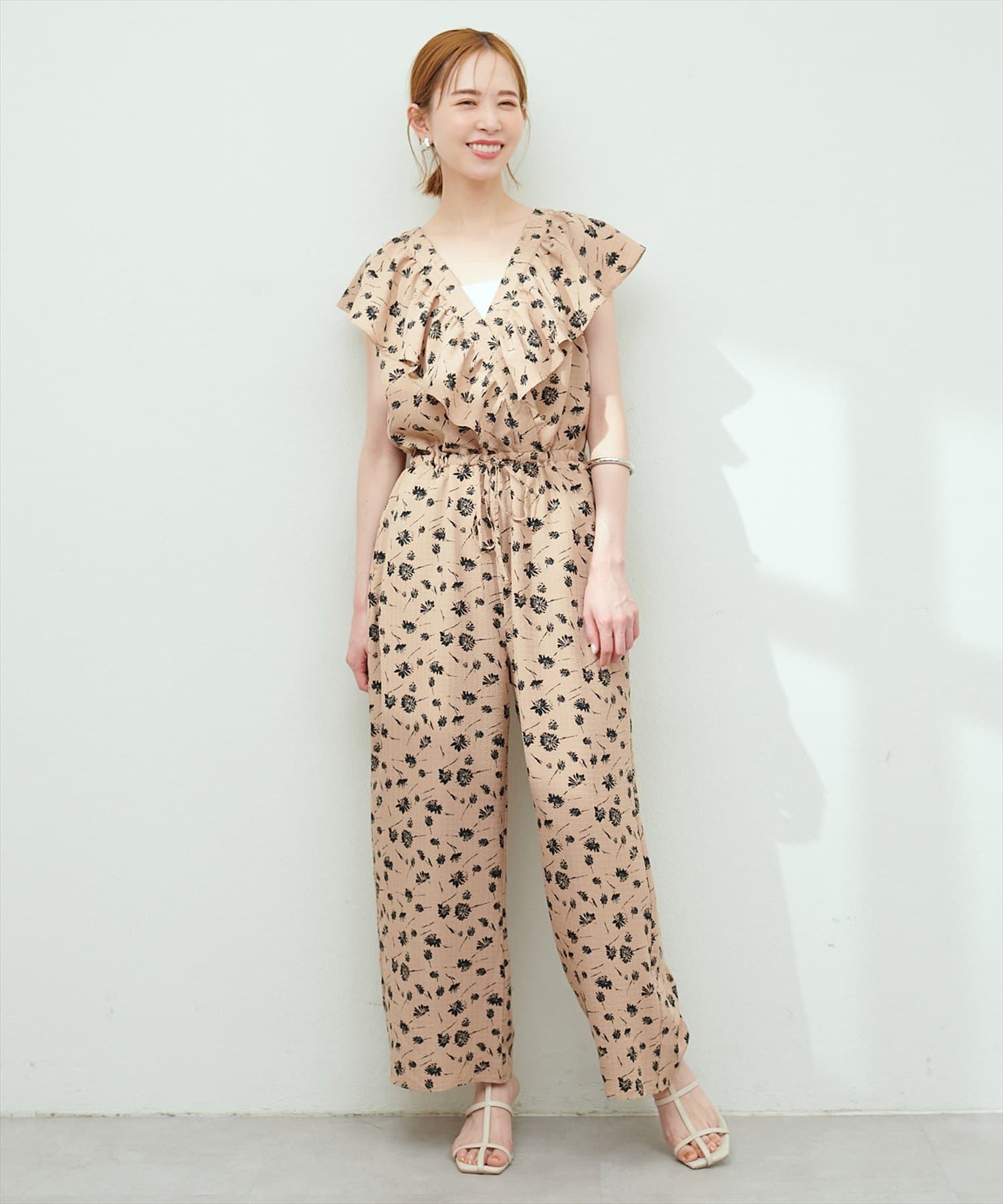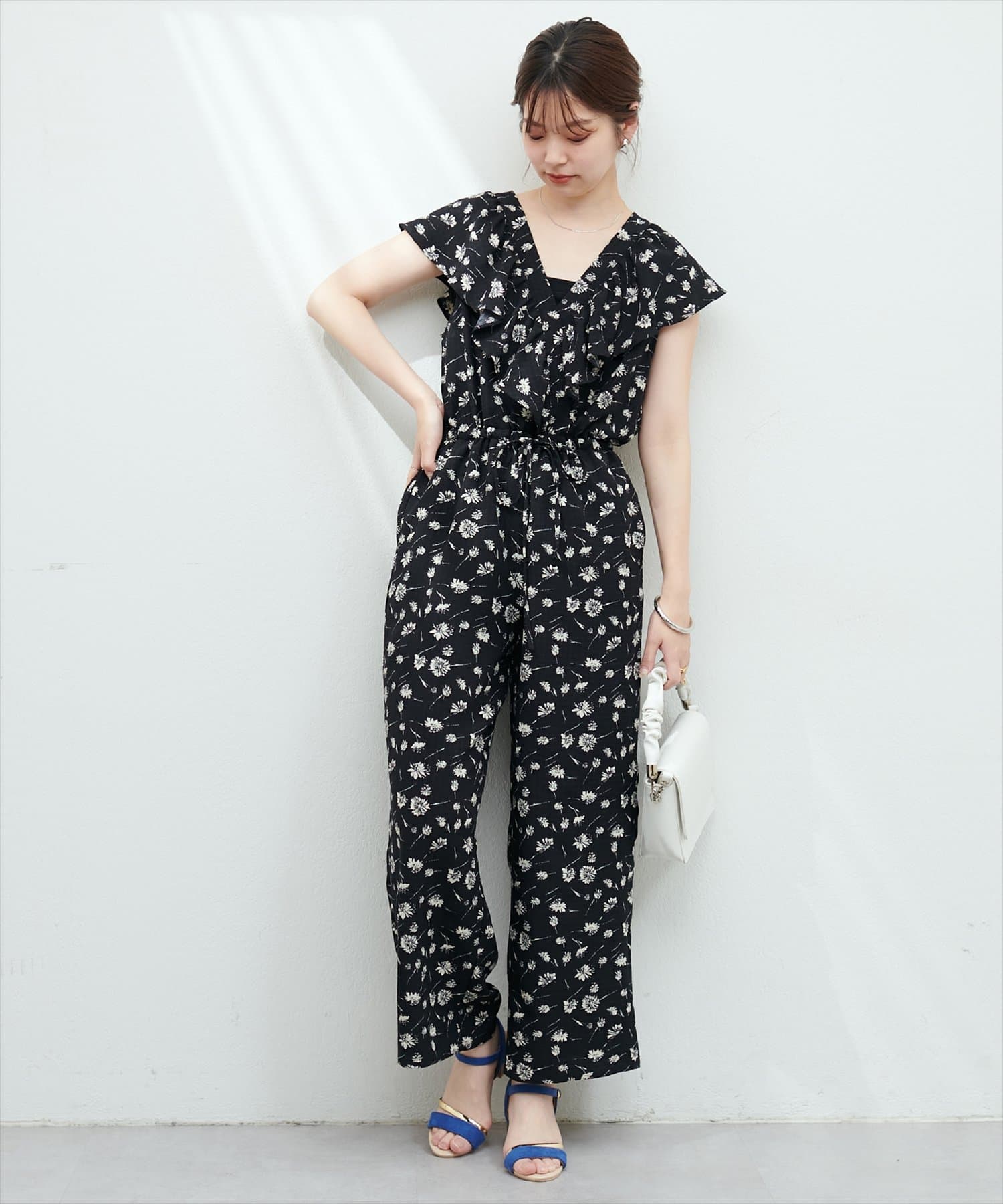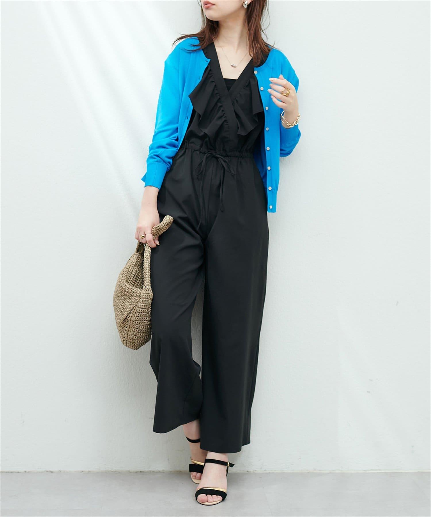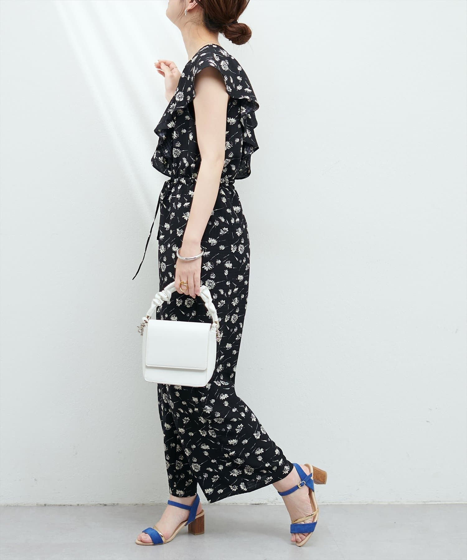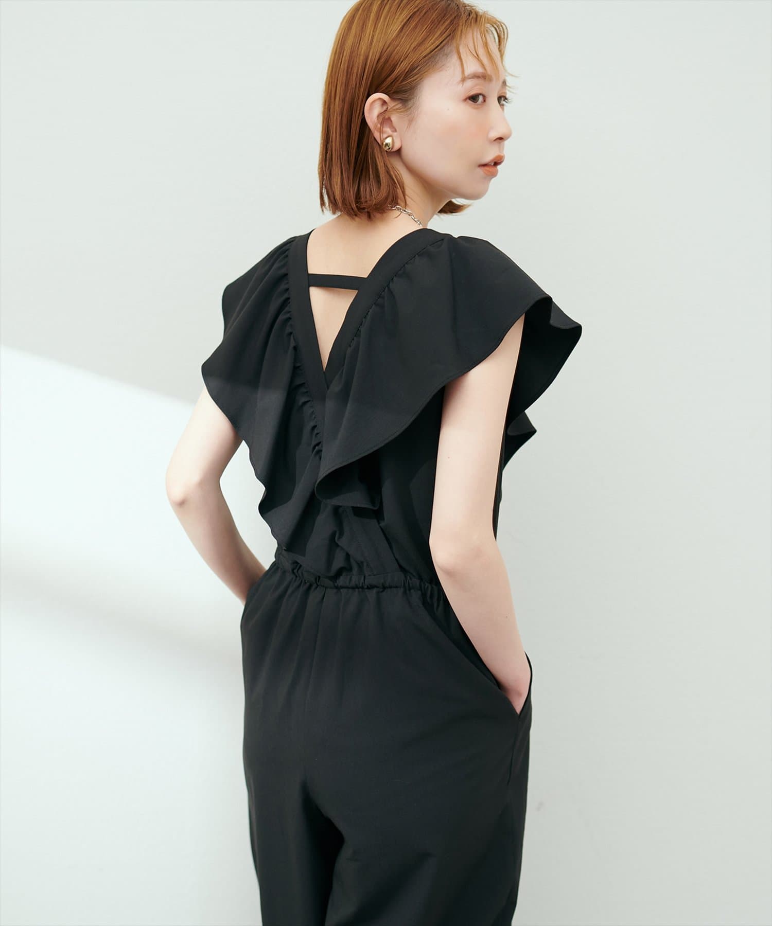 カシュクールデザインに大胆なフリルを施したフェミニンなサロペット。