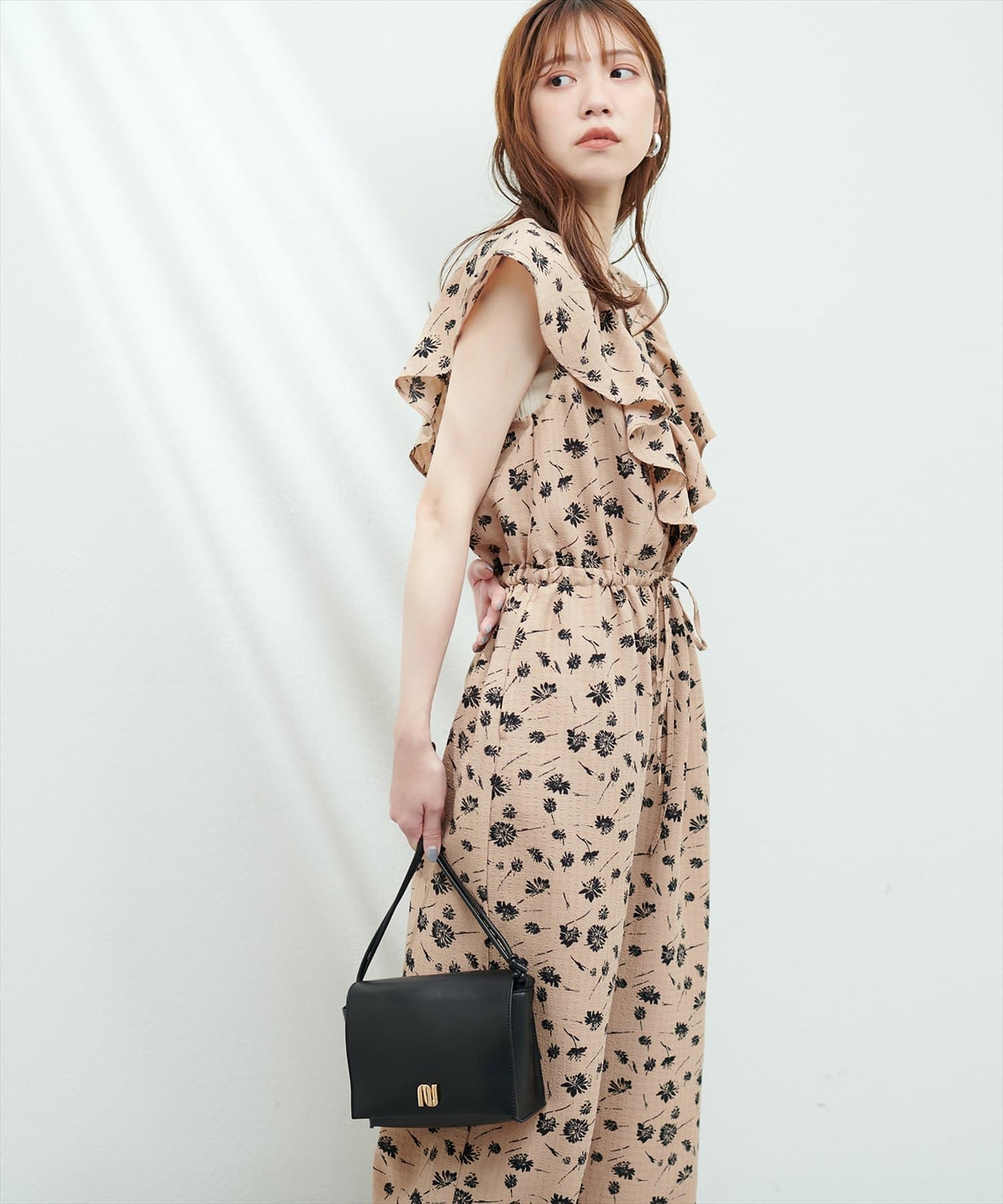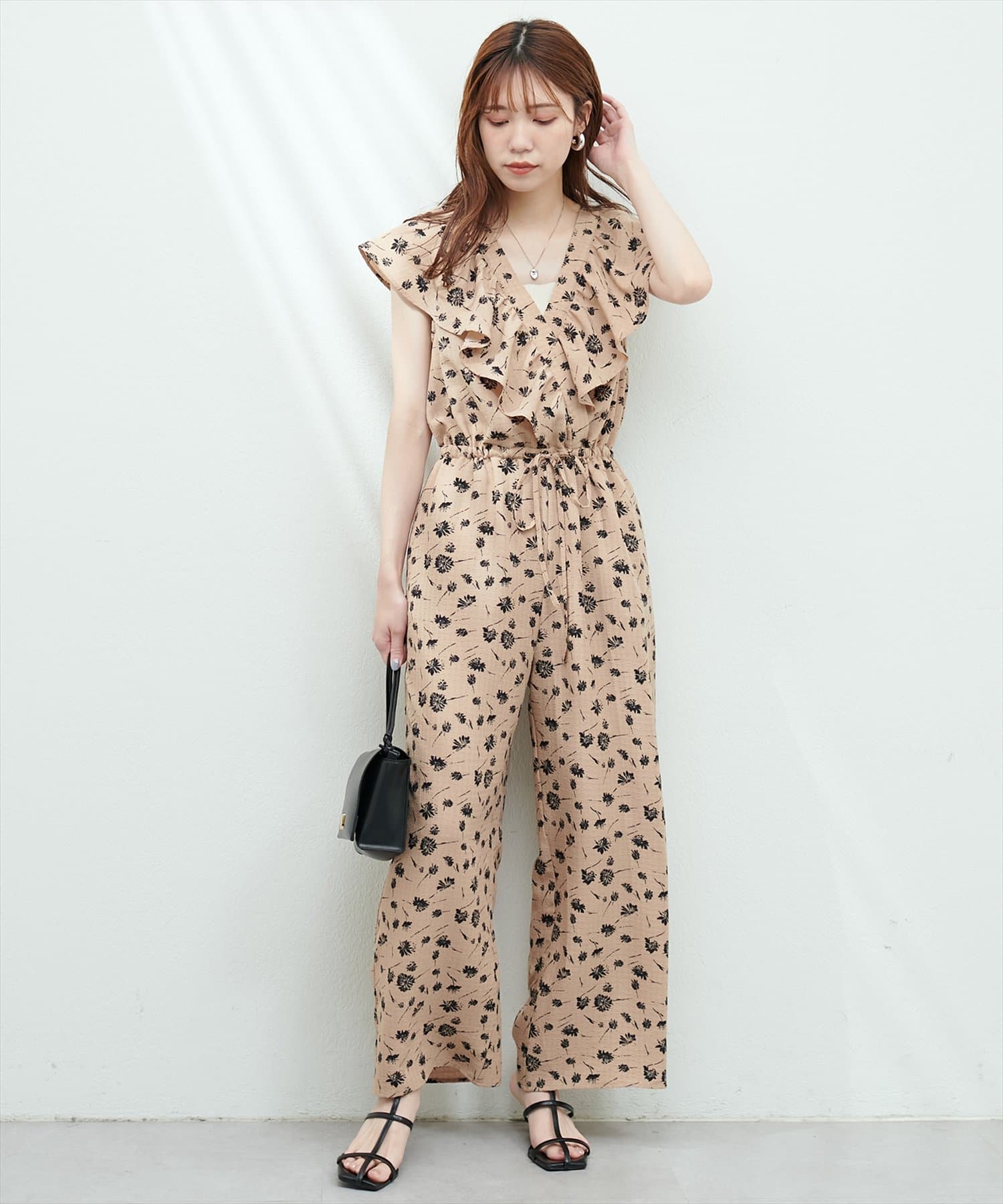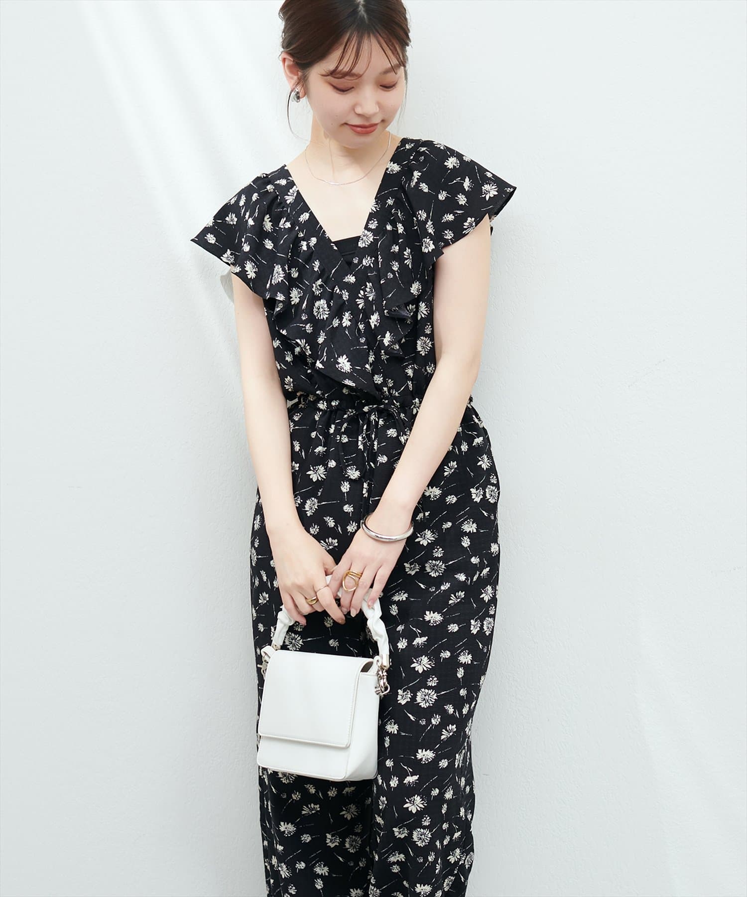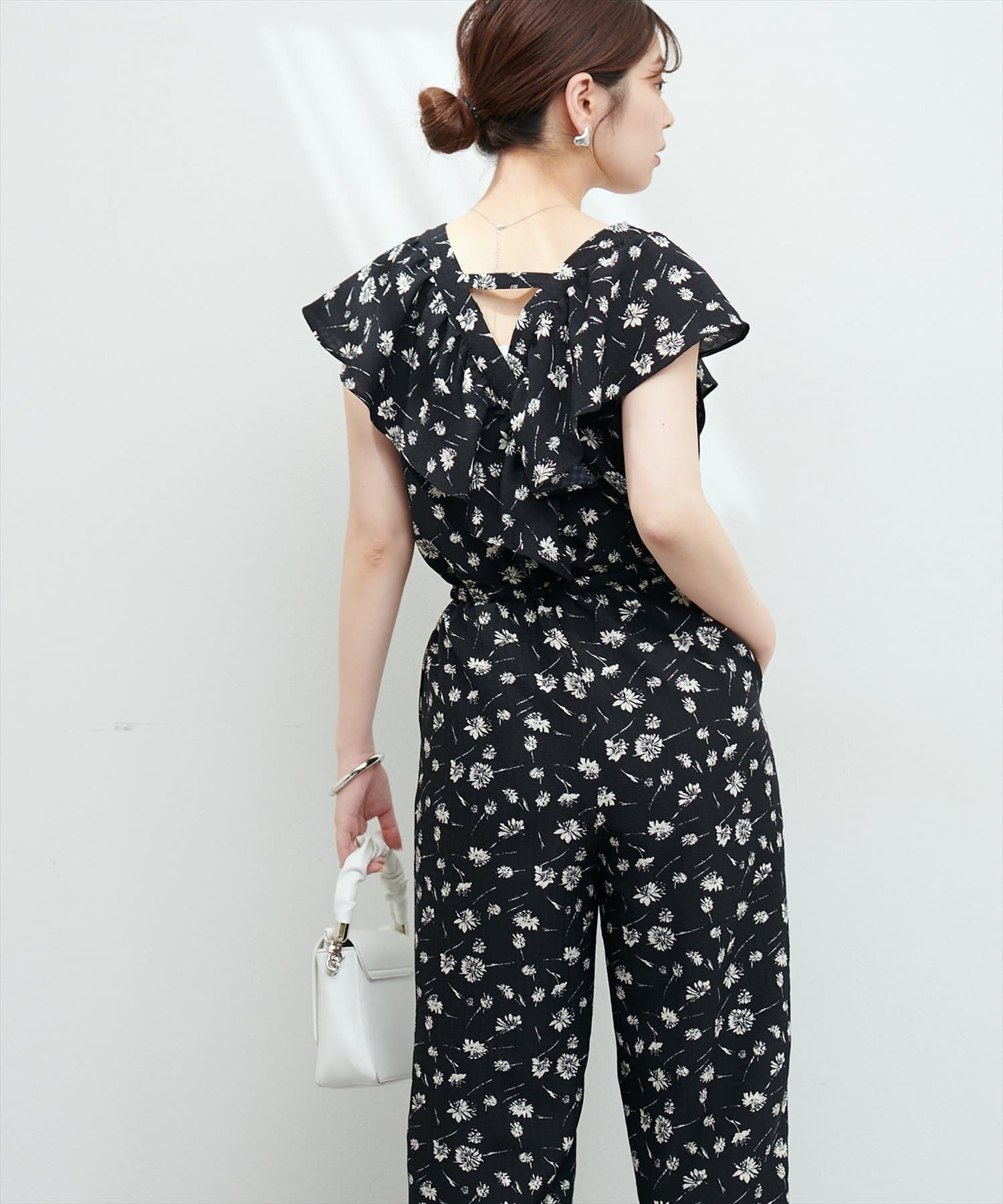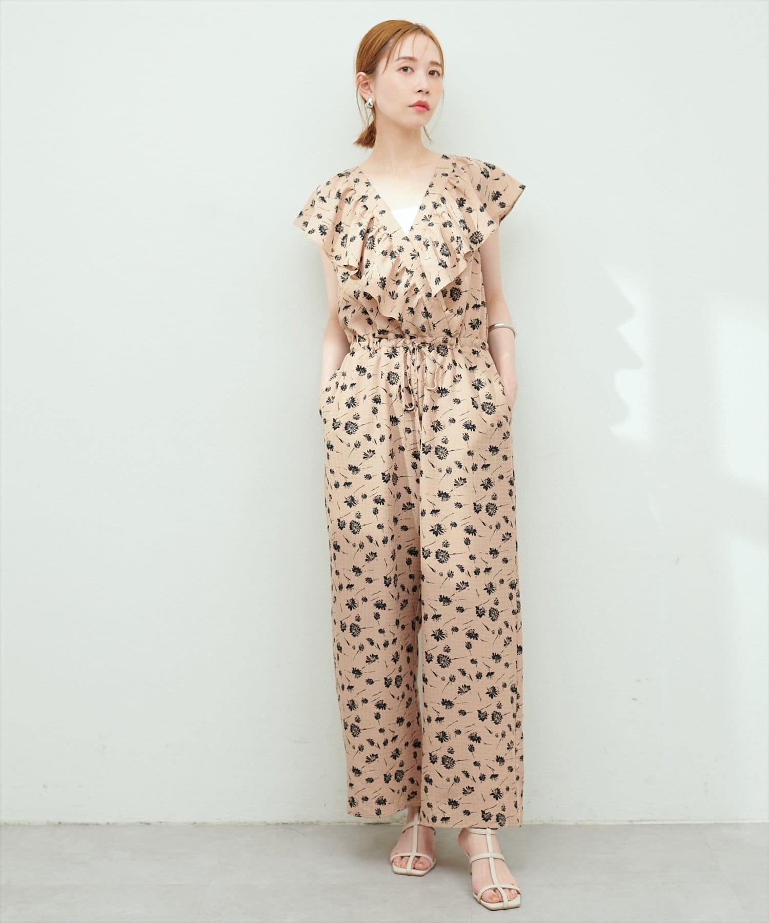 カシュクールデザインに大胆なフリルを施したフェミニンなサロペット。