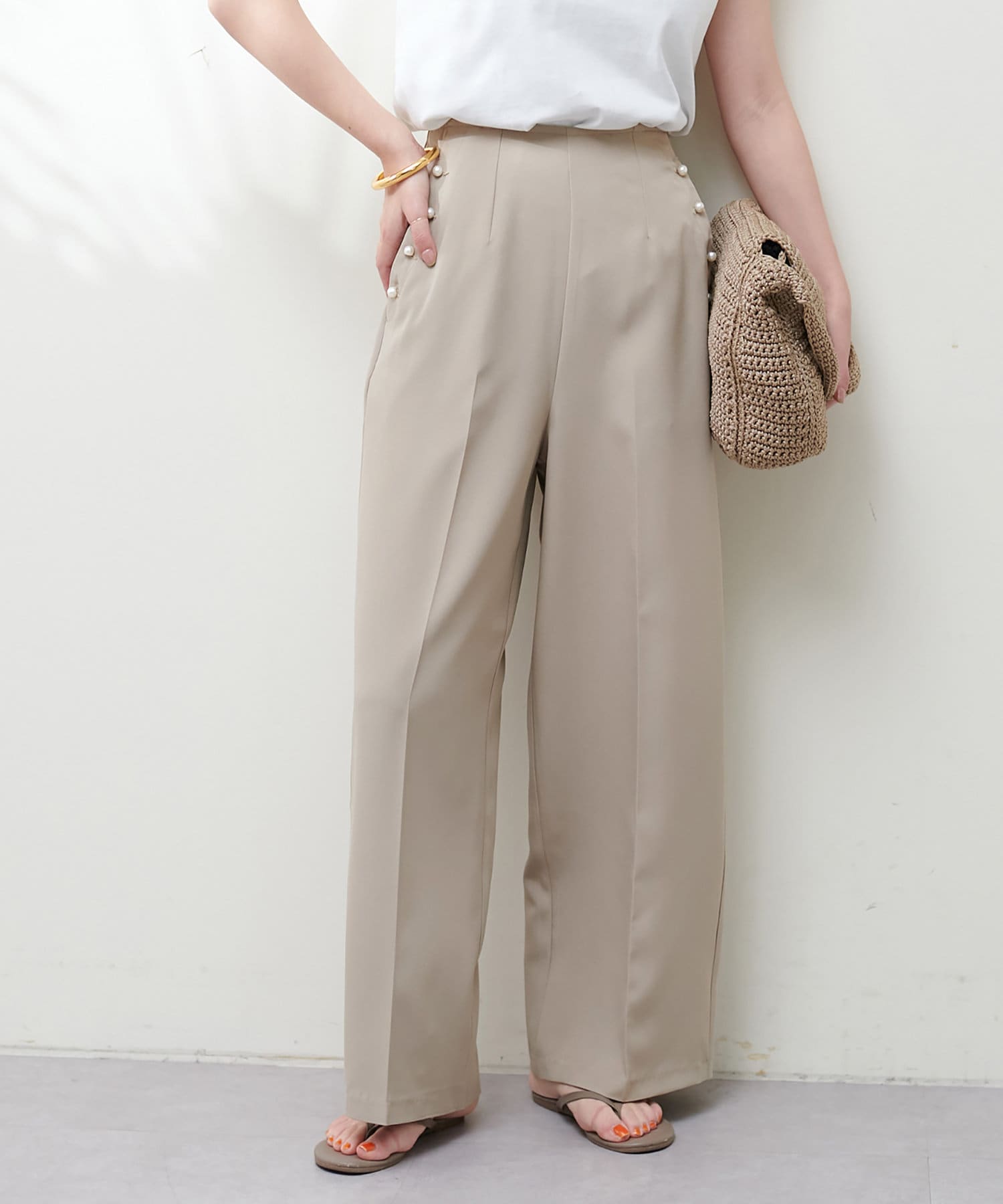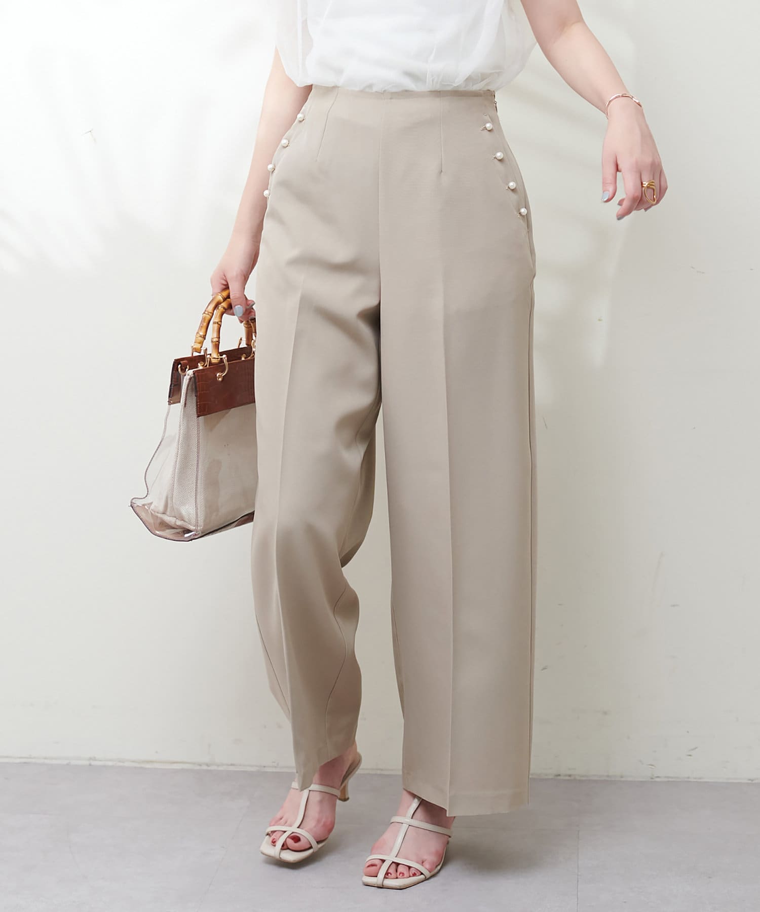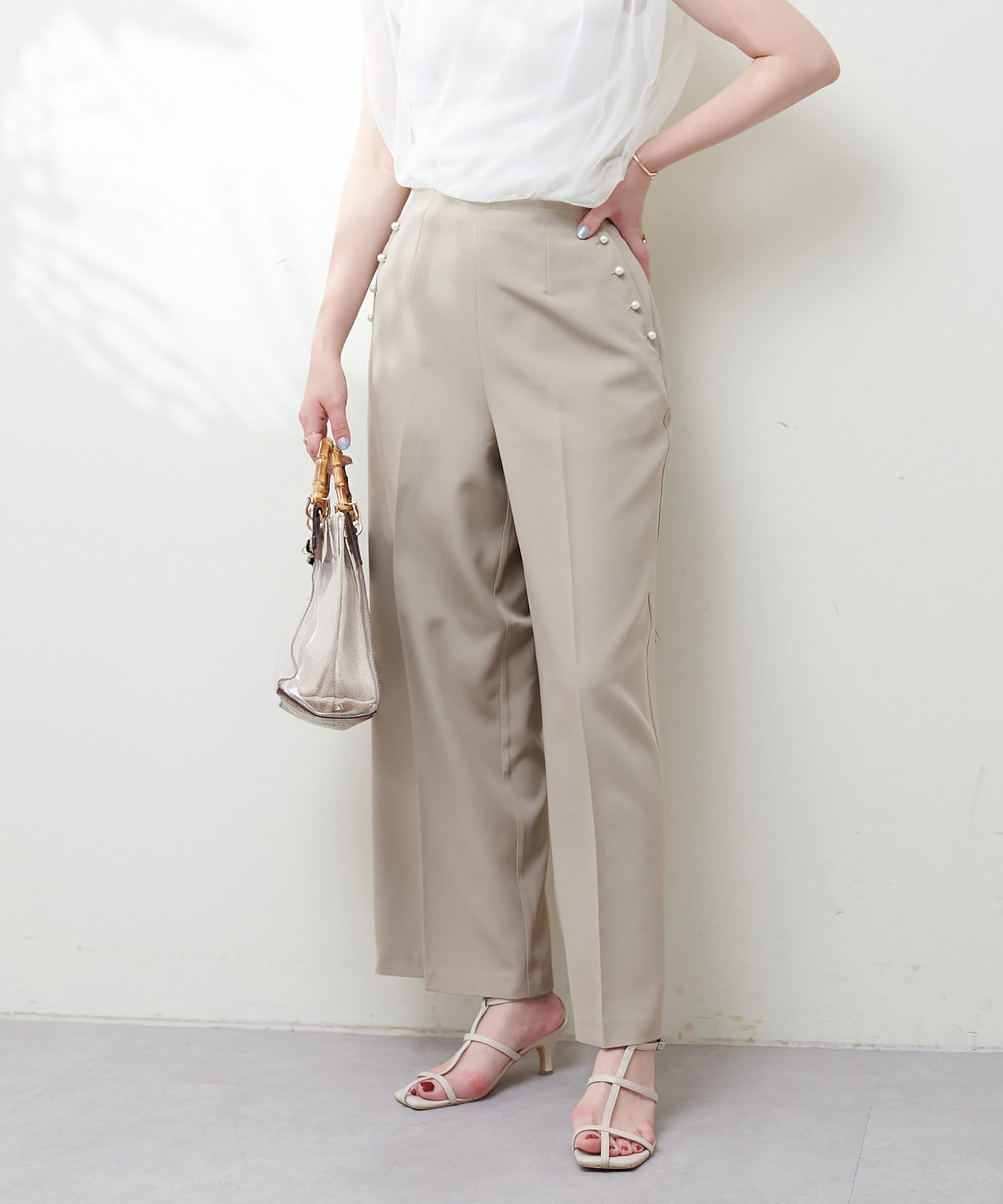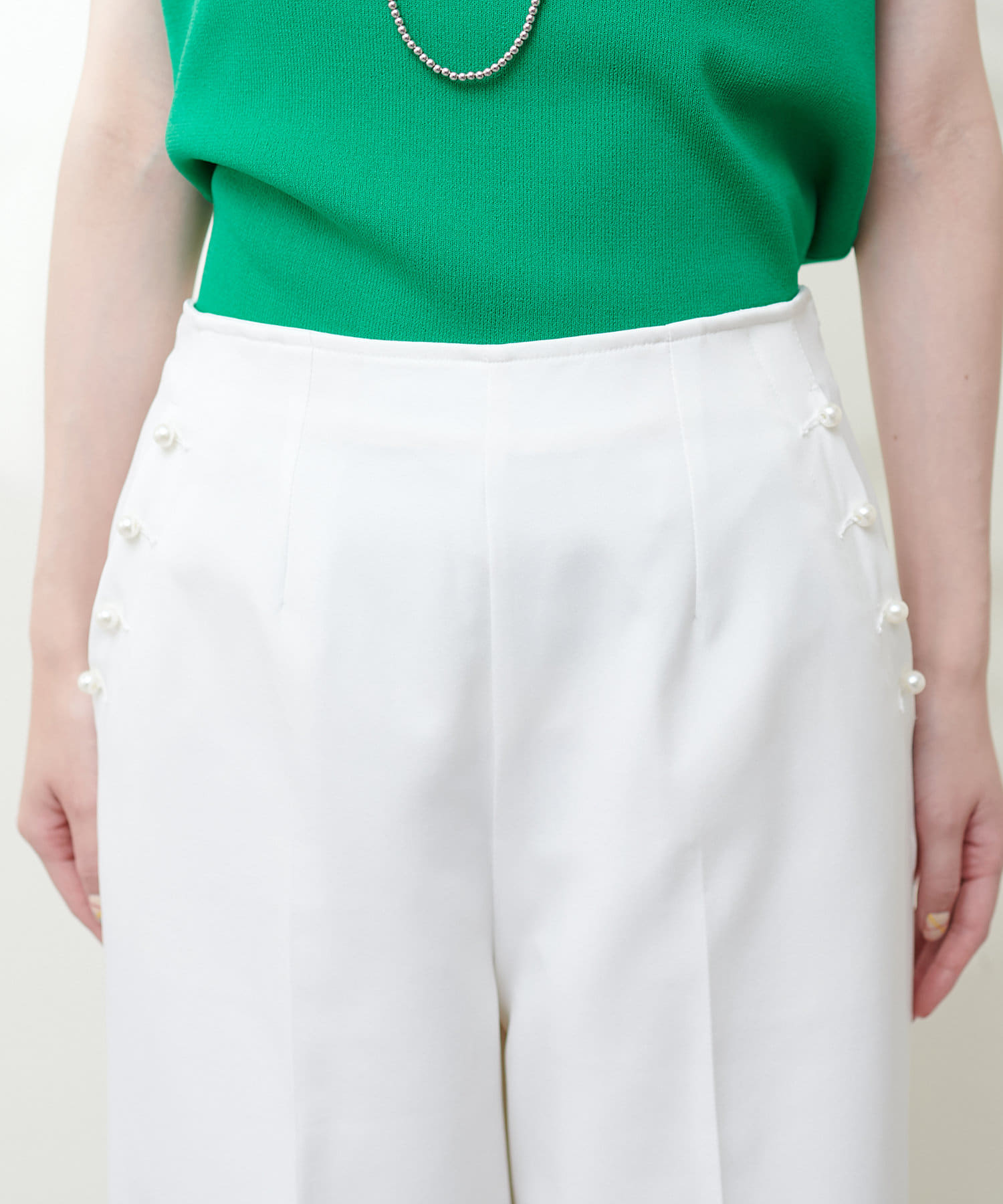 フロントのポケットに沿って施したパールがスタイリングに華やかさをプラスしてくれるストレートパンツ。