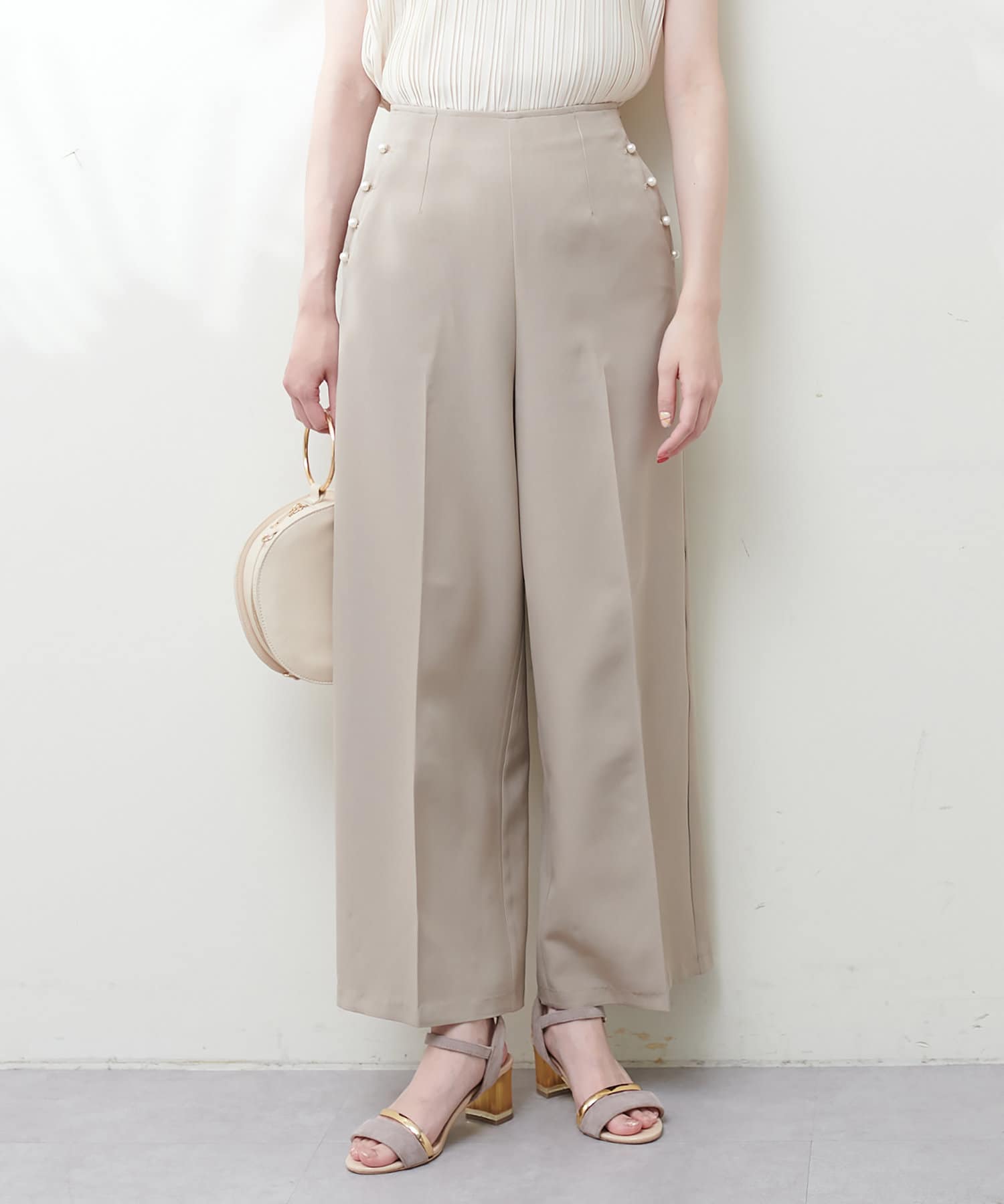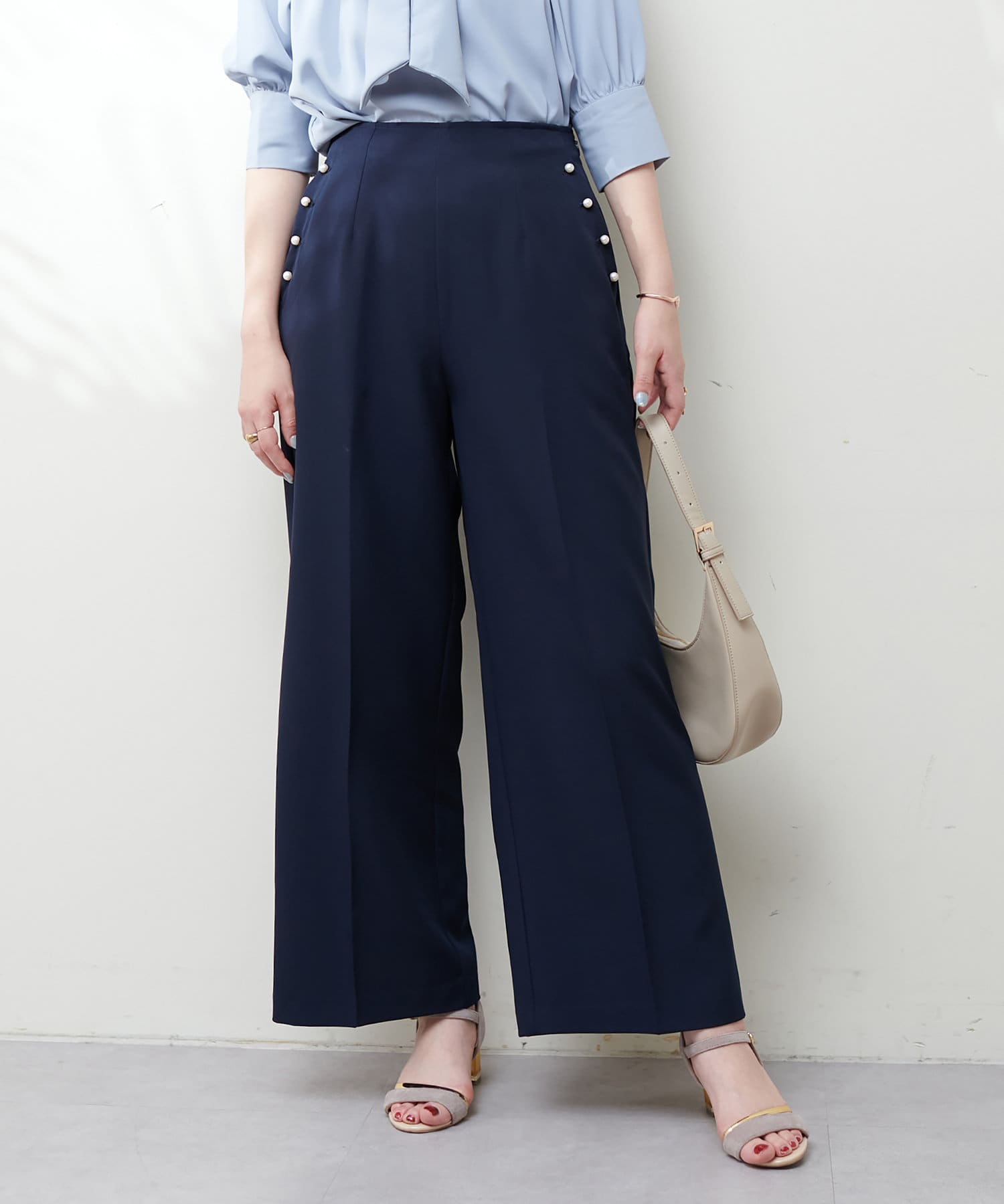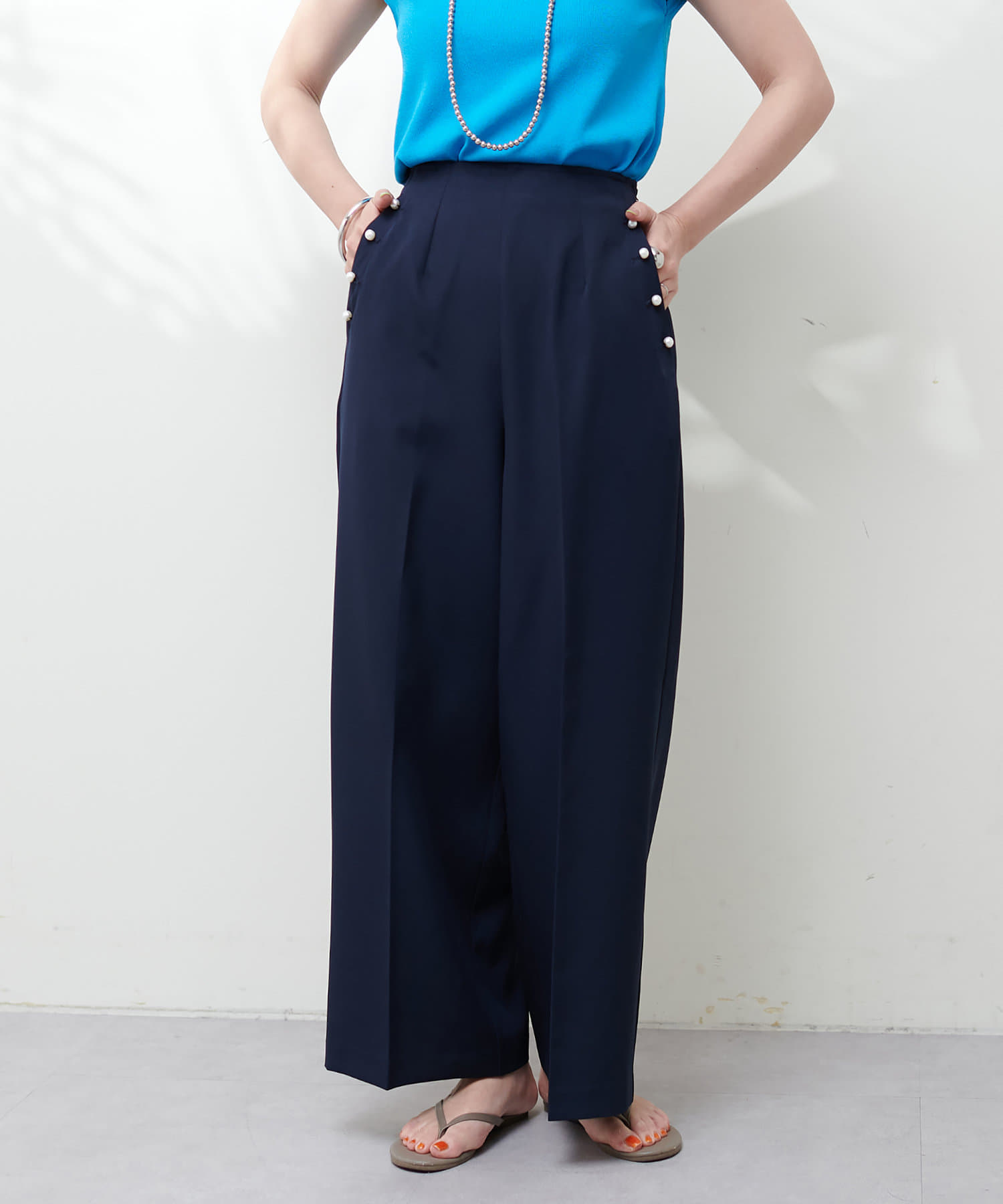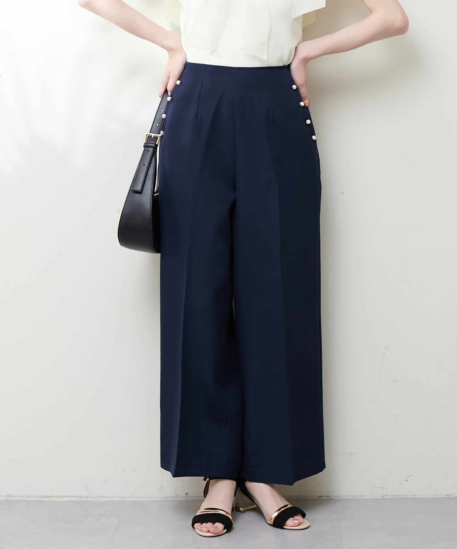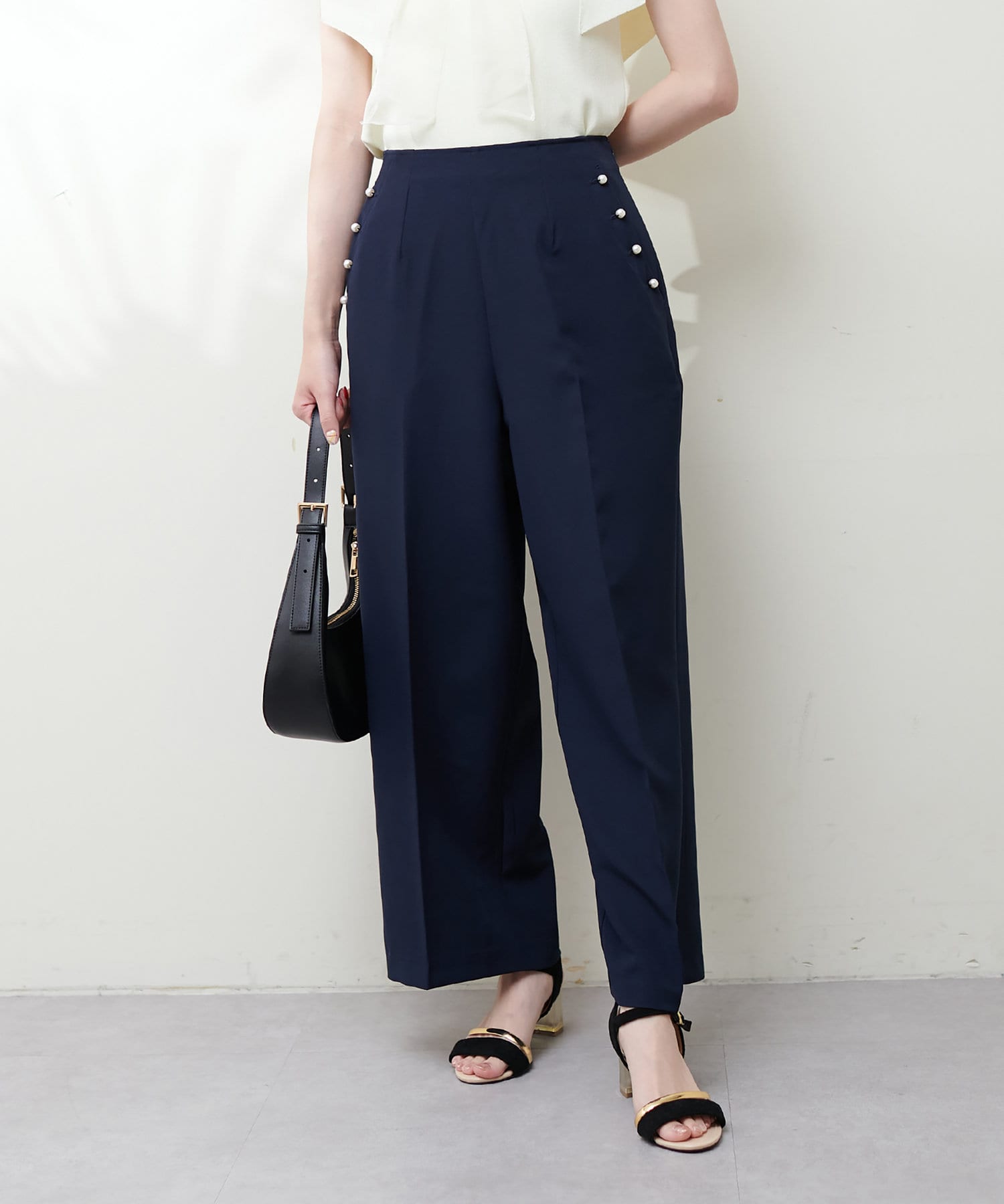 フロントのポケットに沿って施したパールがスタイリングに華やかさをプラスしてくれるストレートパンツ。